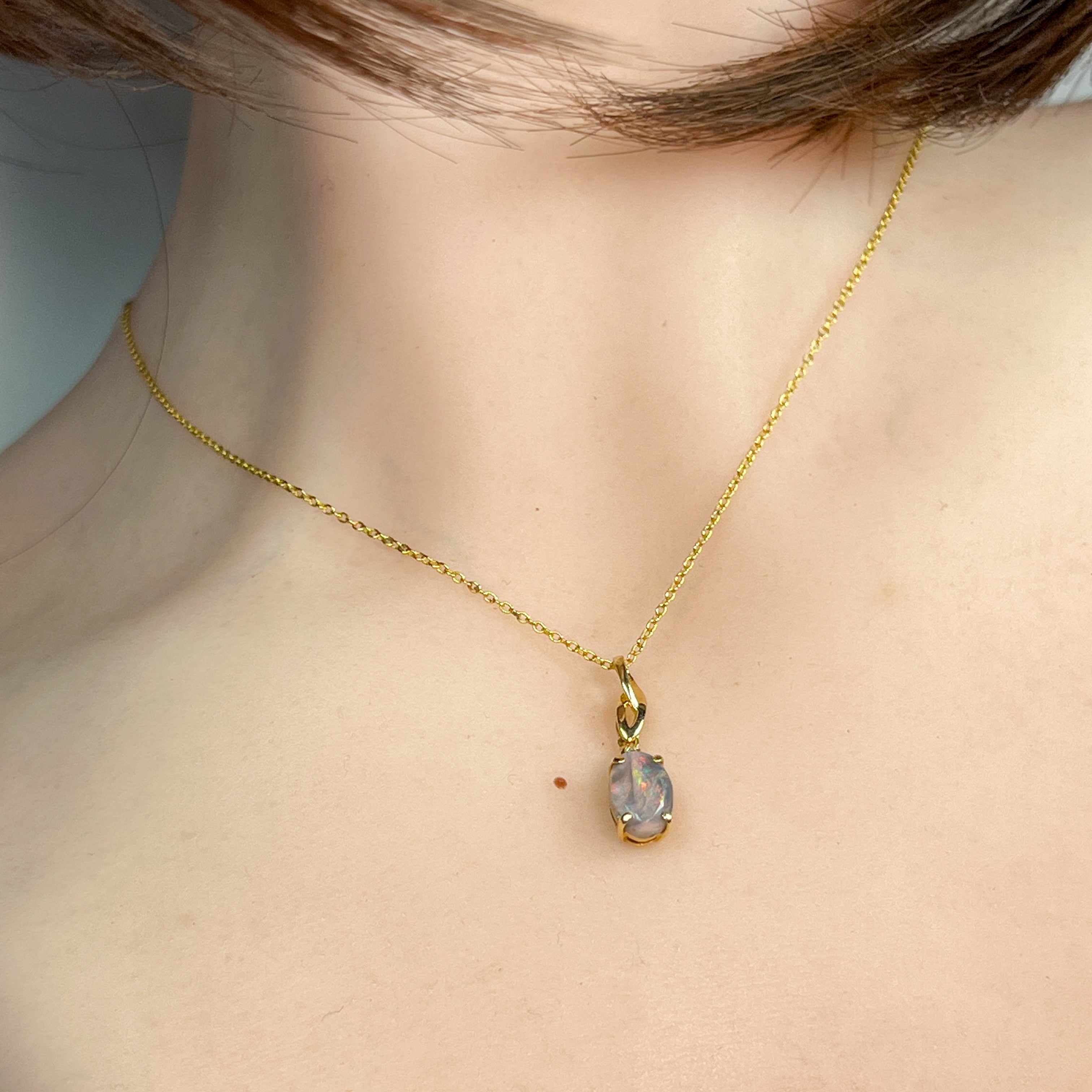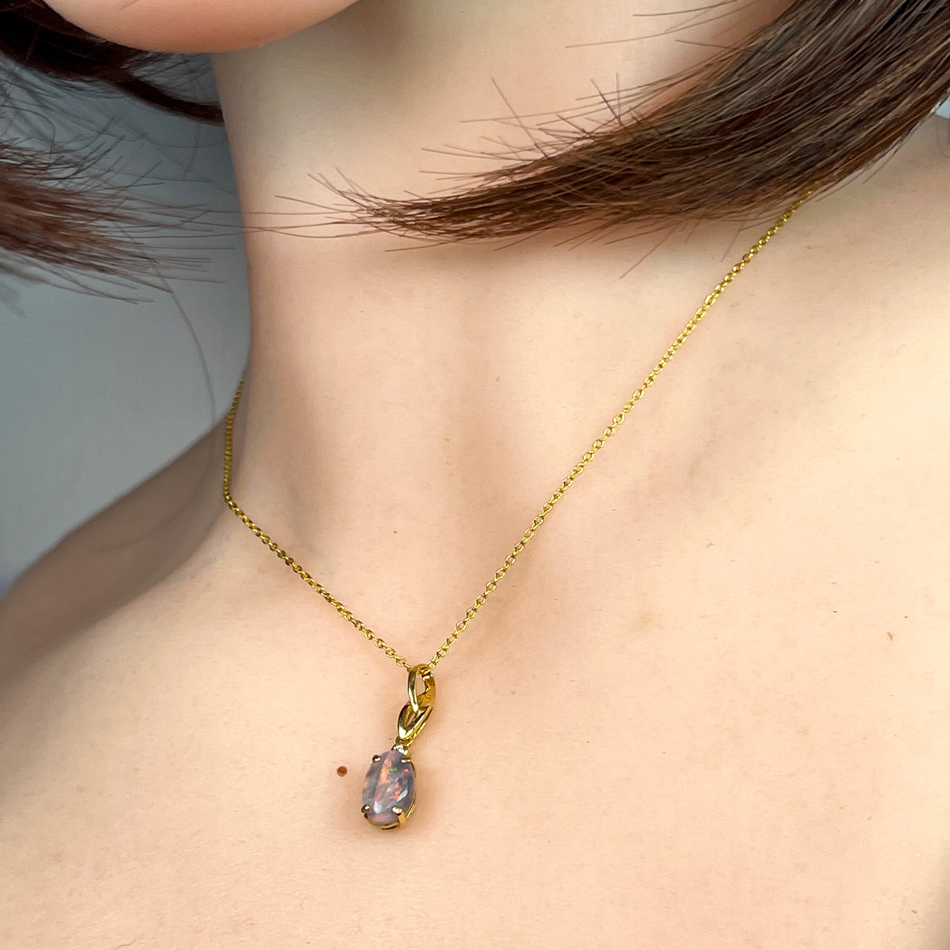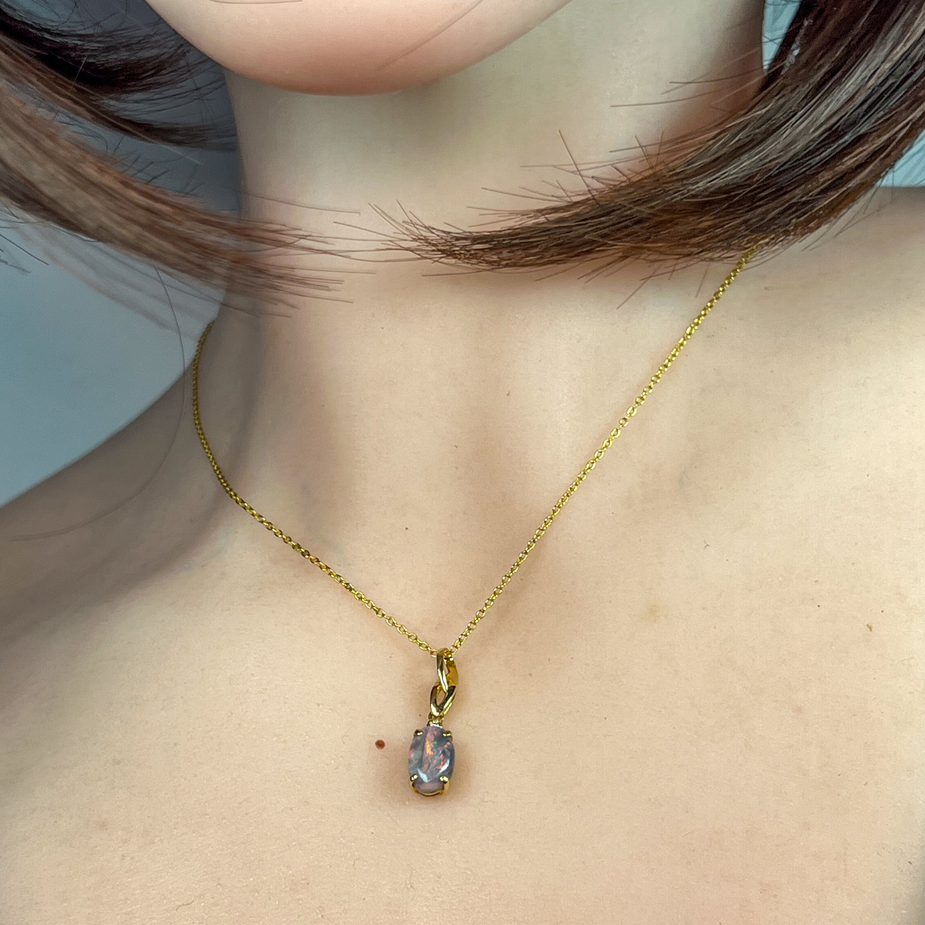 This elegant pendant features a striking 1.10ct black opal set in 18kt yellow gold, combining timeless style with a bold flash of color. Its minimalist design ensures versatile wear, making it an essential addition for those seeking understated luxury with a unique touch.