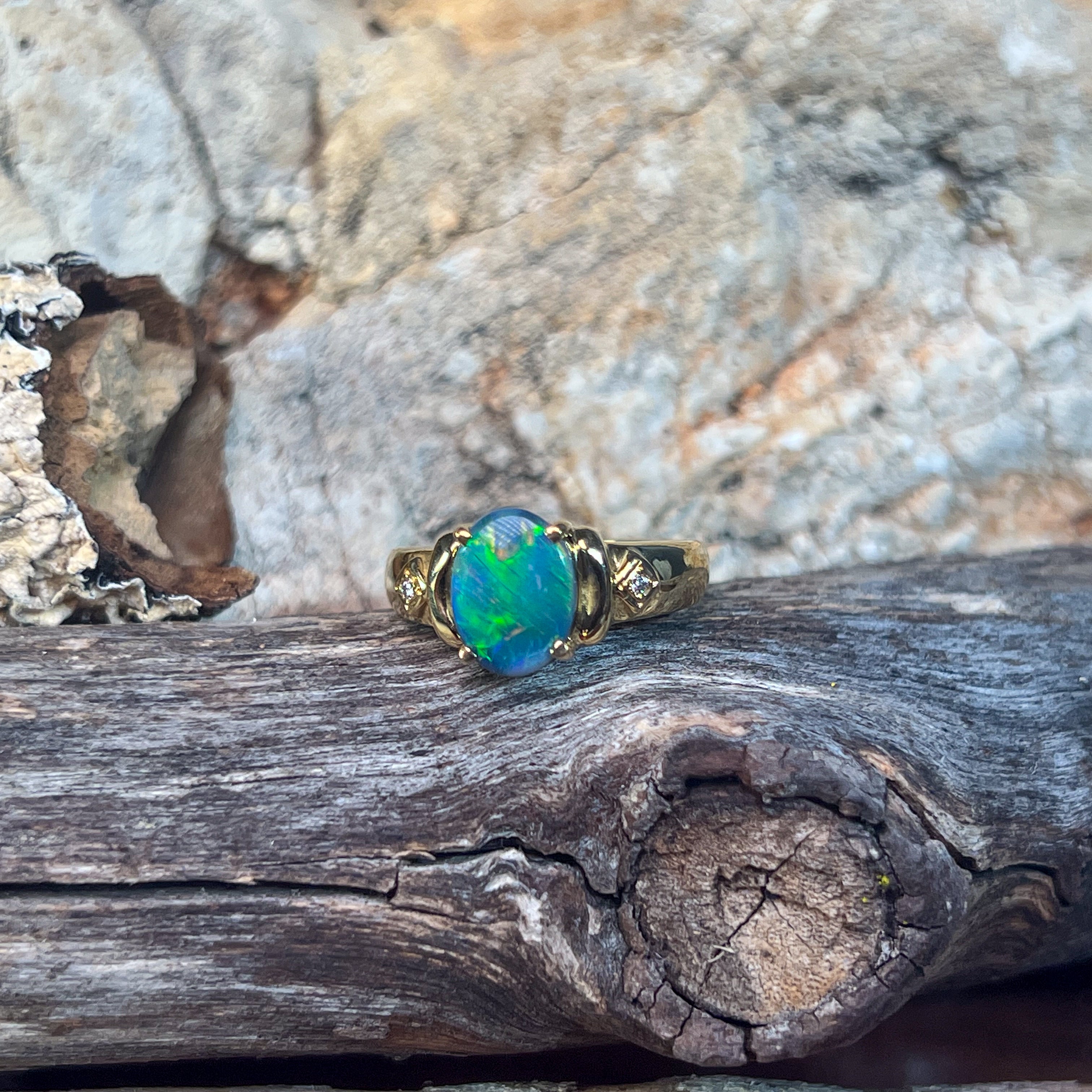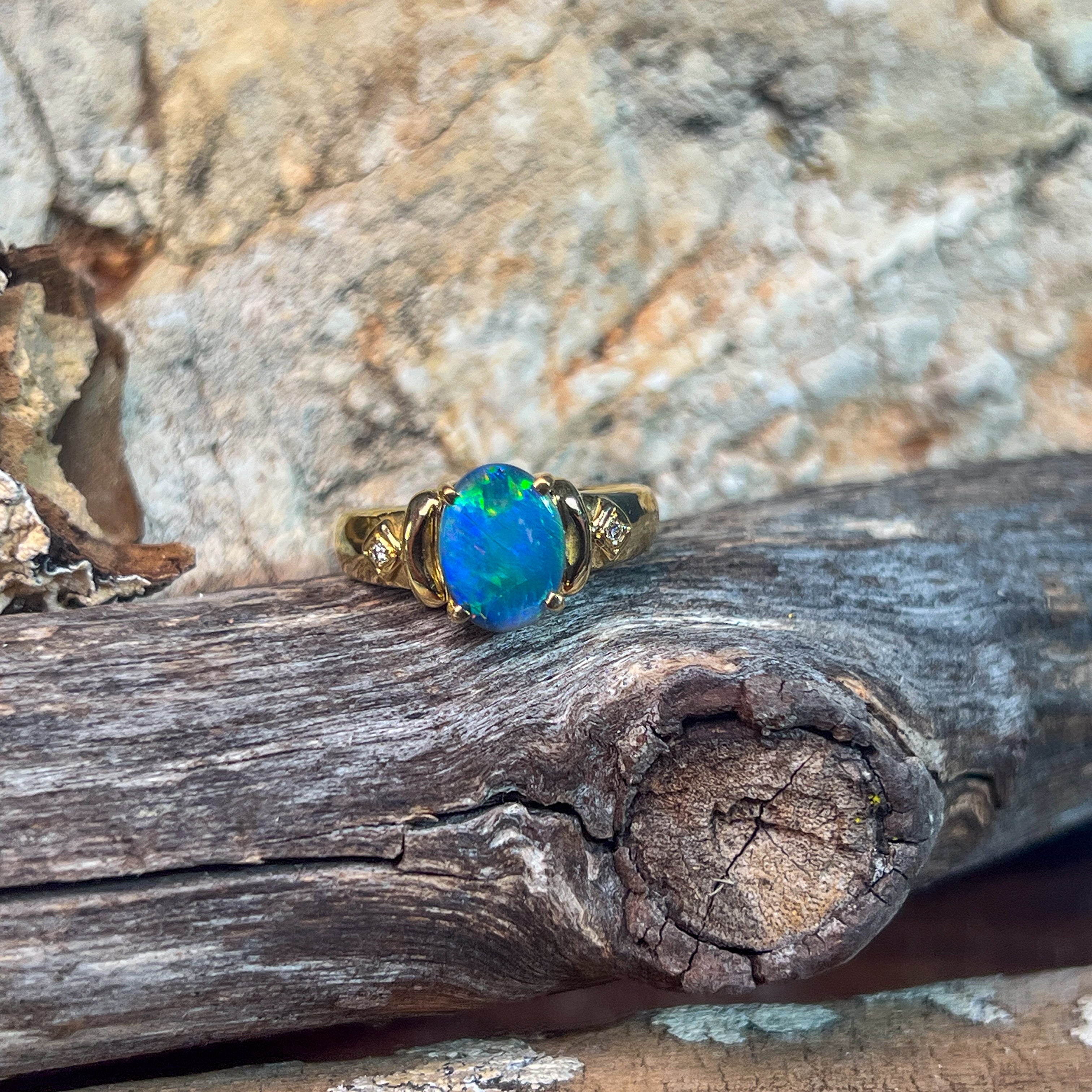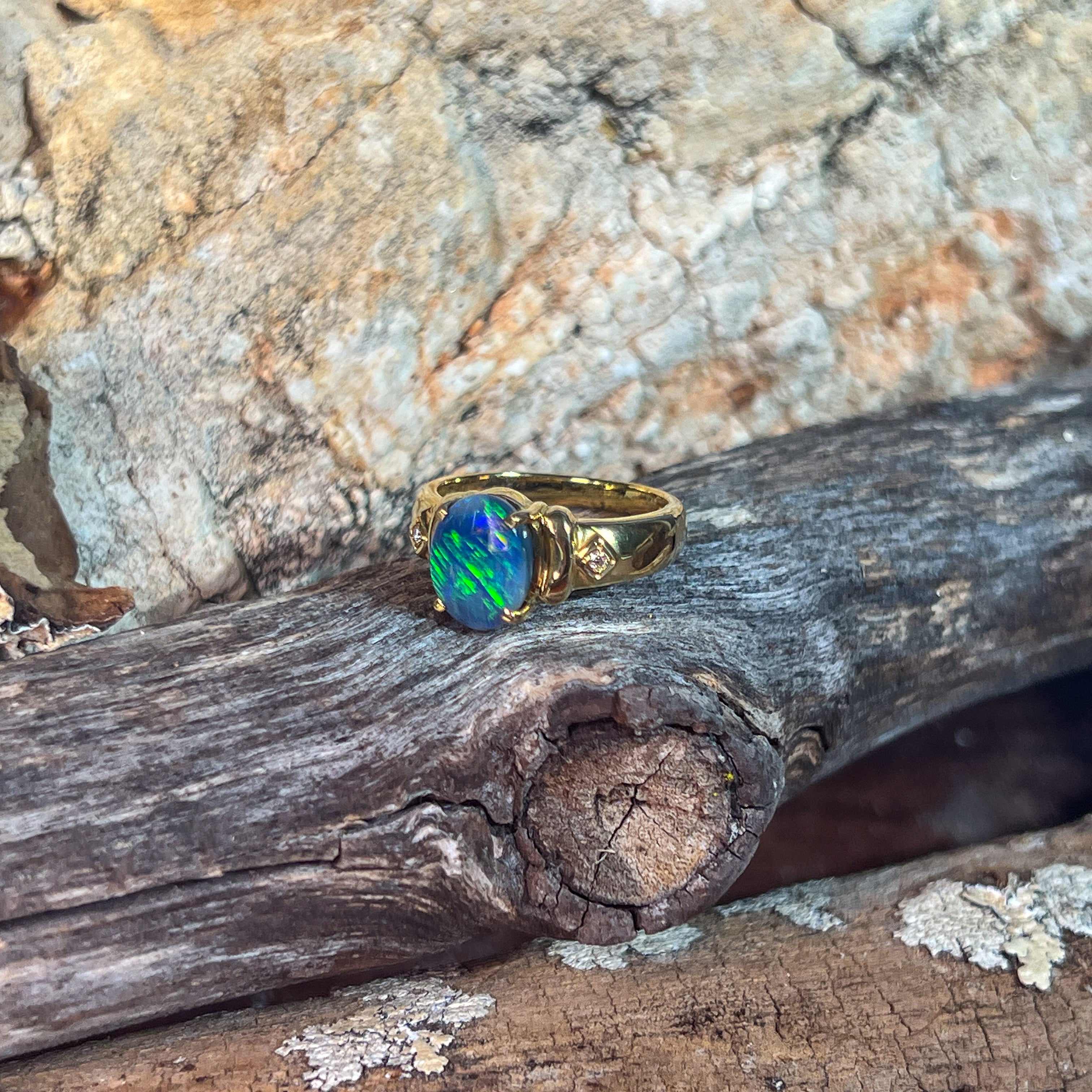 Get ready to mesmerize with this 18kt yellow gold ring featuring a beautiful 1.52ct black opal with a striking green stripe pattern. Two dazzling diamonds add the perfect touch of sparkle. Whether it's an engagement or an everyday accessory, this ring is sure to make a statement.