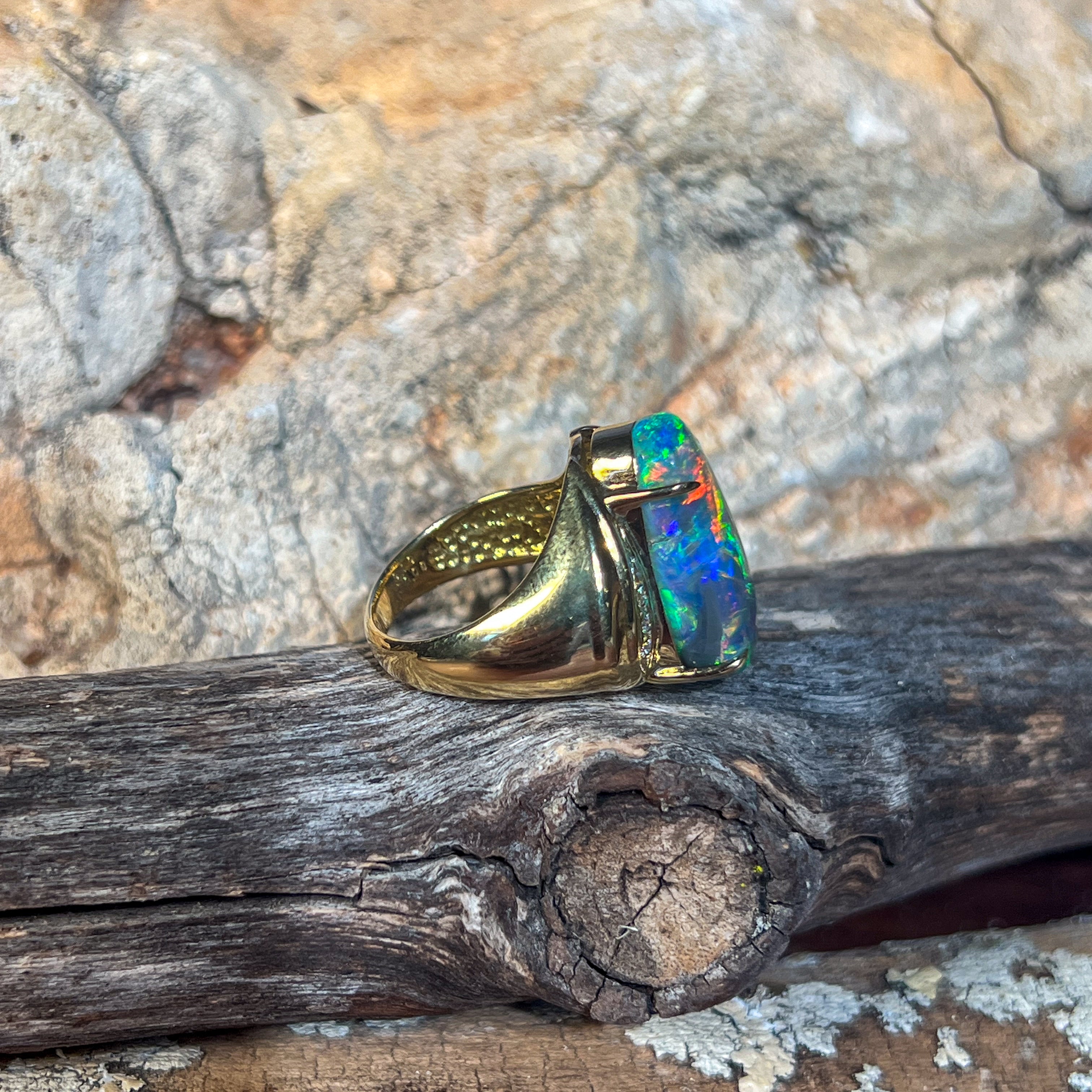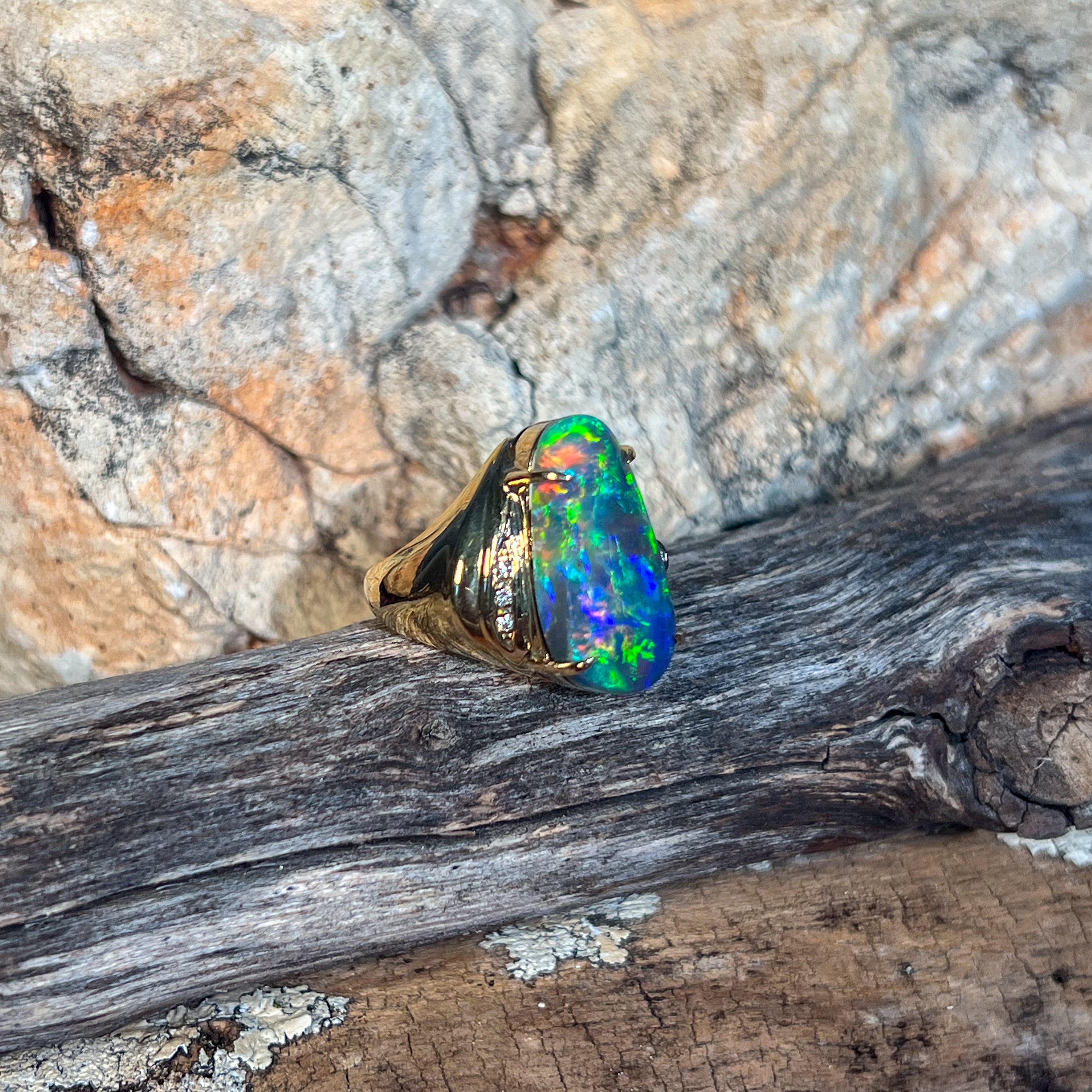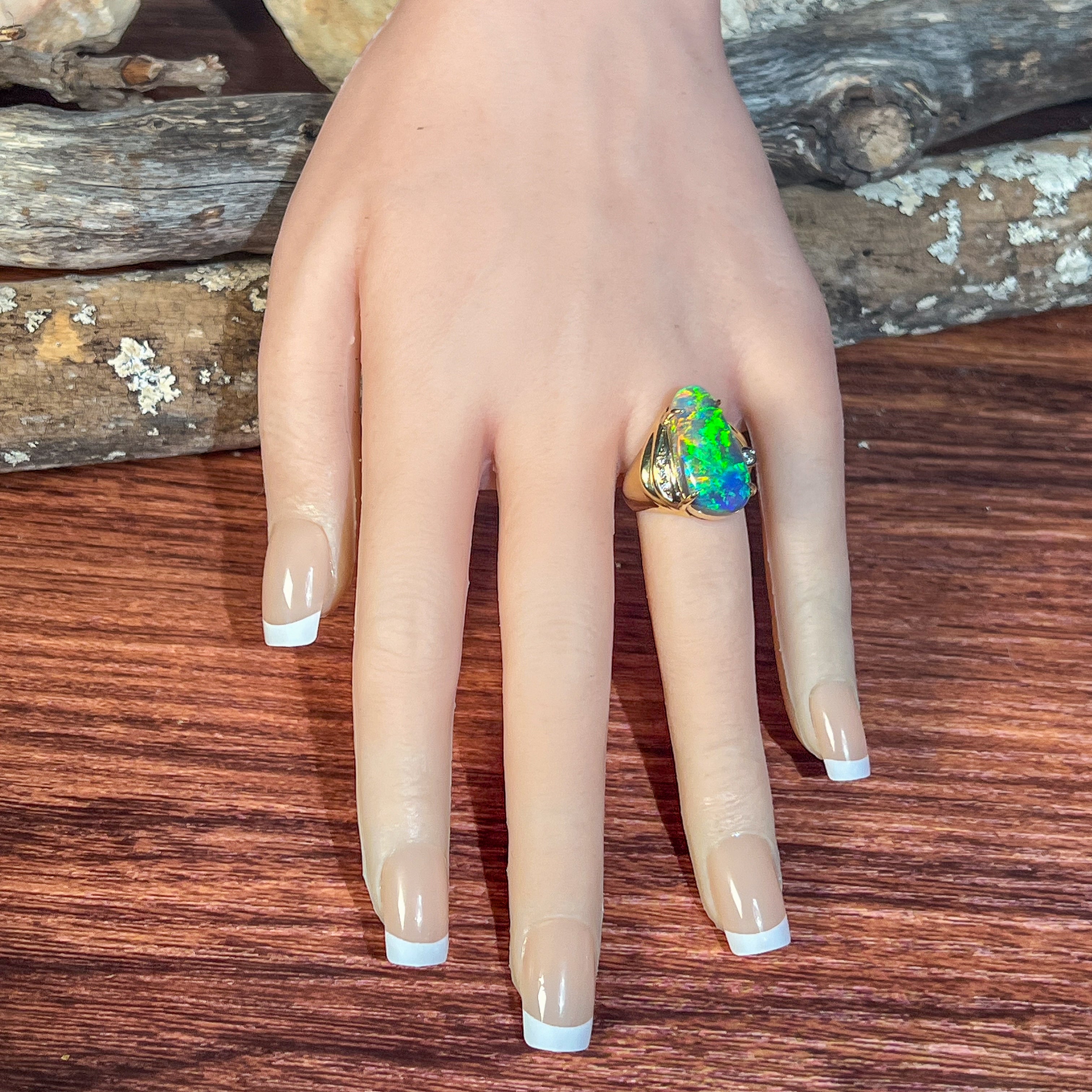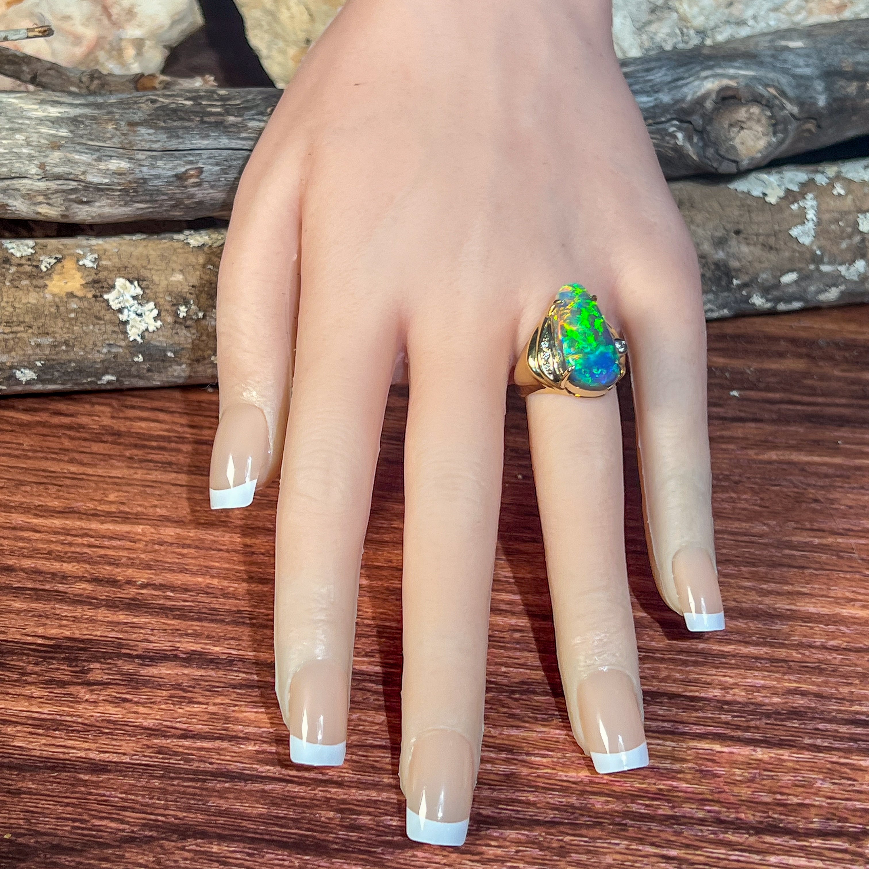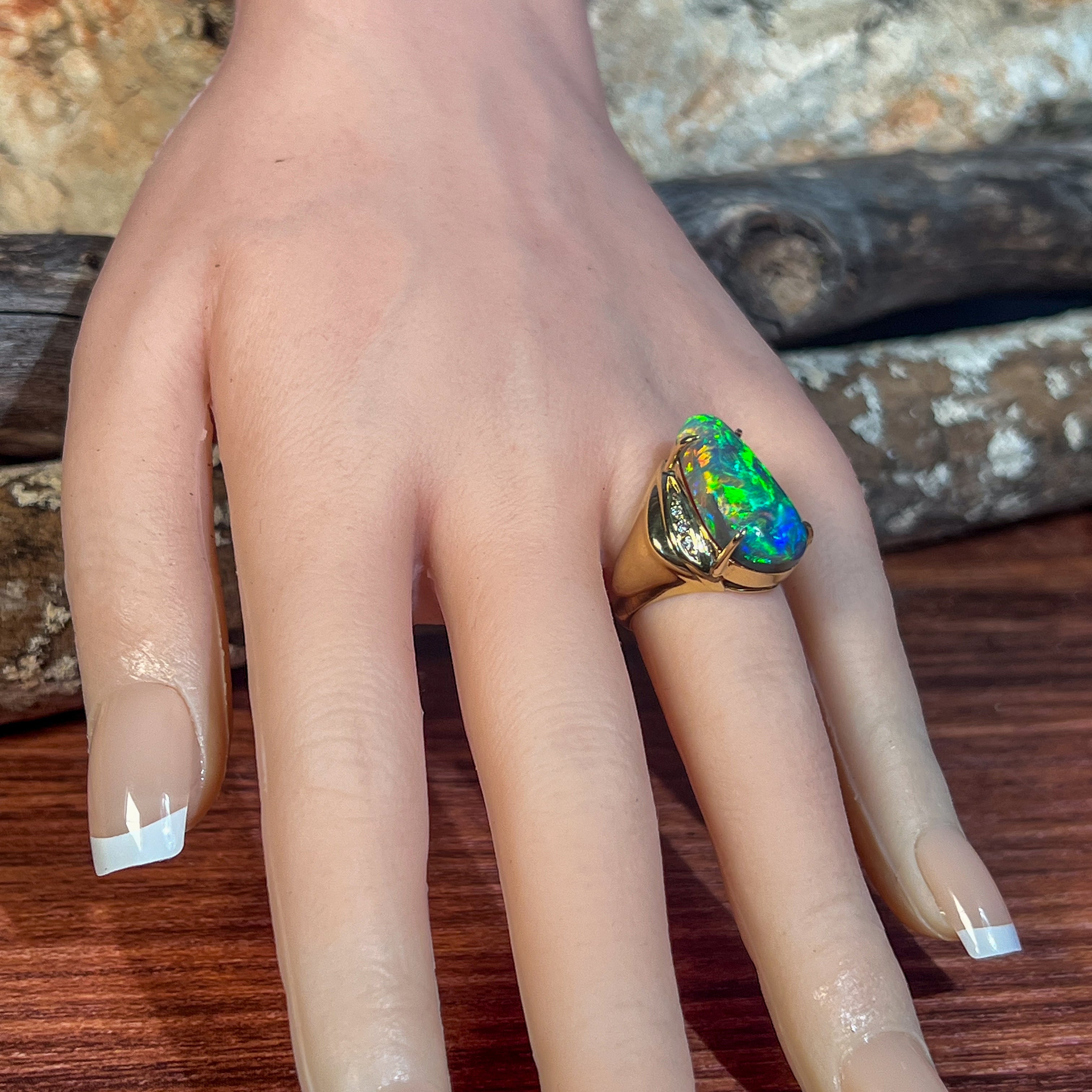 Experience bold elegance with this 18kt yellow gold designer ring featuring a stunning 9.19ct black opal. Its deep, multi-dimensional 3D colours shimmer vividly, creating a captivating play of light that commands attention. Accented with sparkling diamonds, this ring is a daring statement piece that elevates any look with its unique, luxurious allure. Perfect for those who embrace bold sophistication.