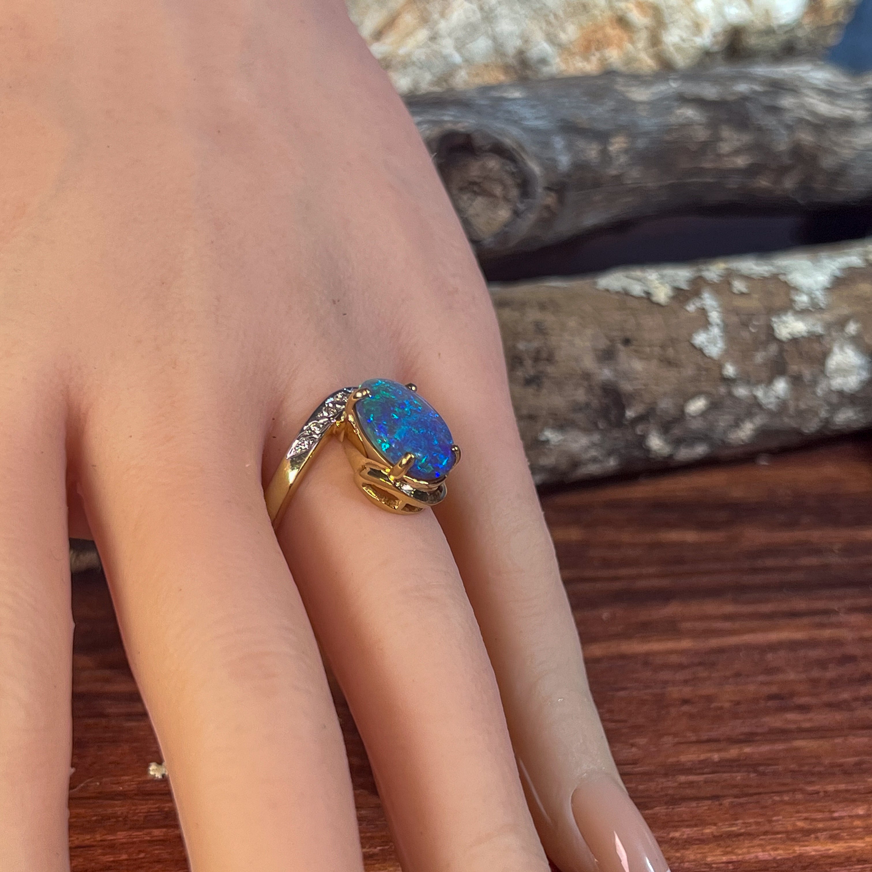 Experience the captivating beauty of our 18kt Yellow Gold cross over style Black Opal ring. Adorned with a striking 3.98ct blue-green 3D Opal, accented by sparkling diamonds, this ring is a true showstopper. Add a touch of elegance and sophistication to any outfit with this stunning piece.