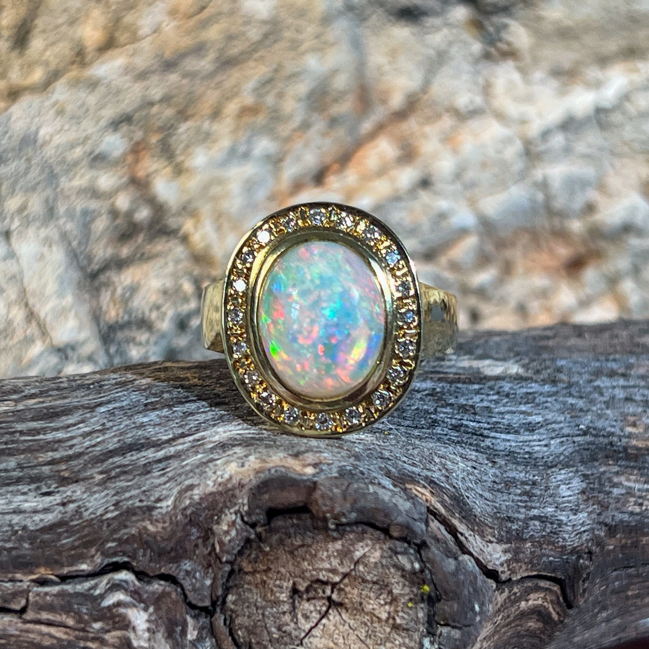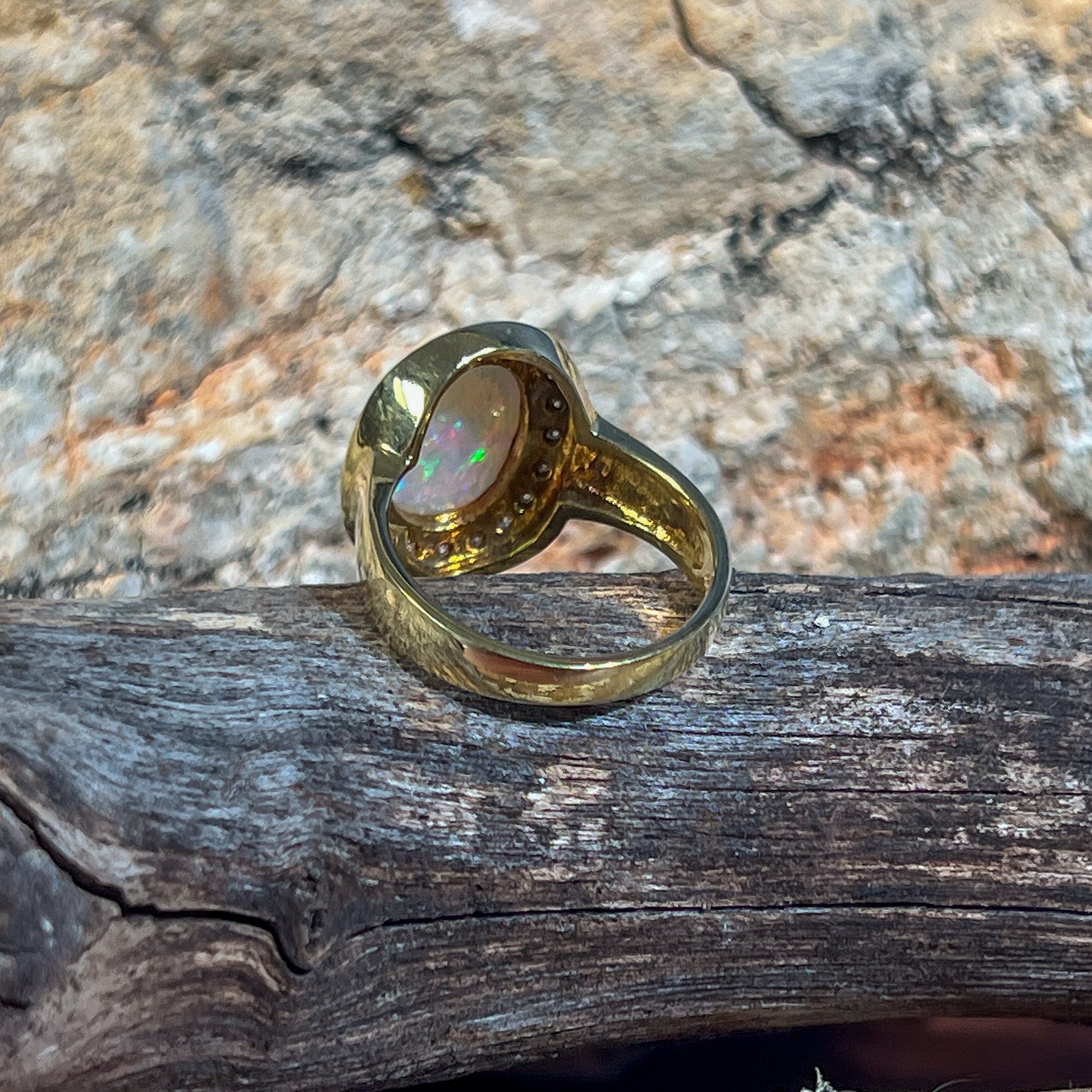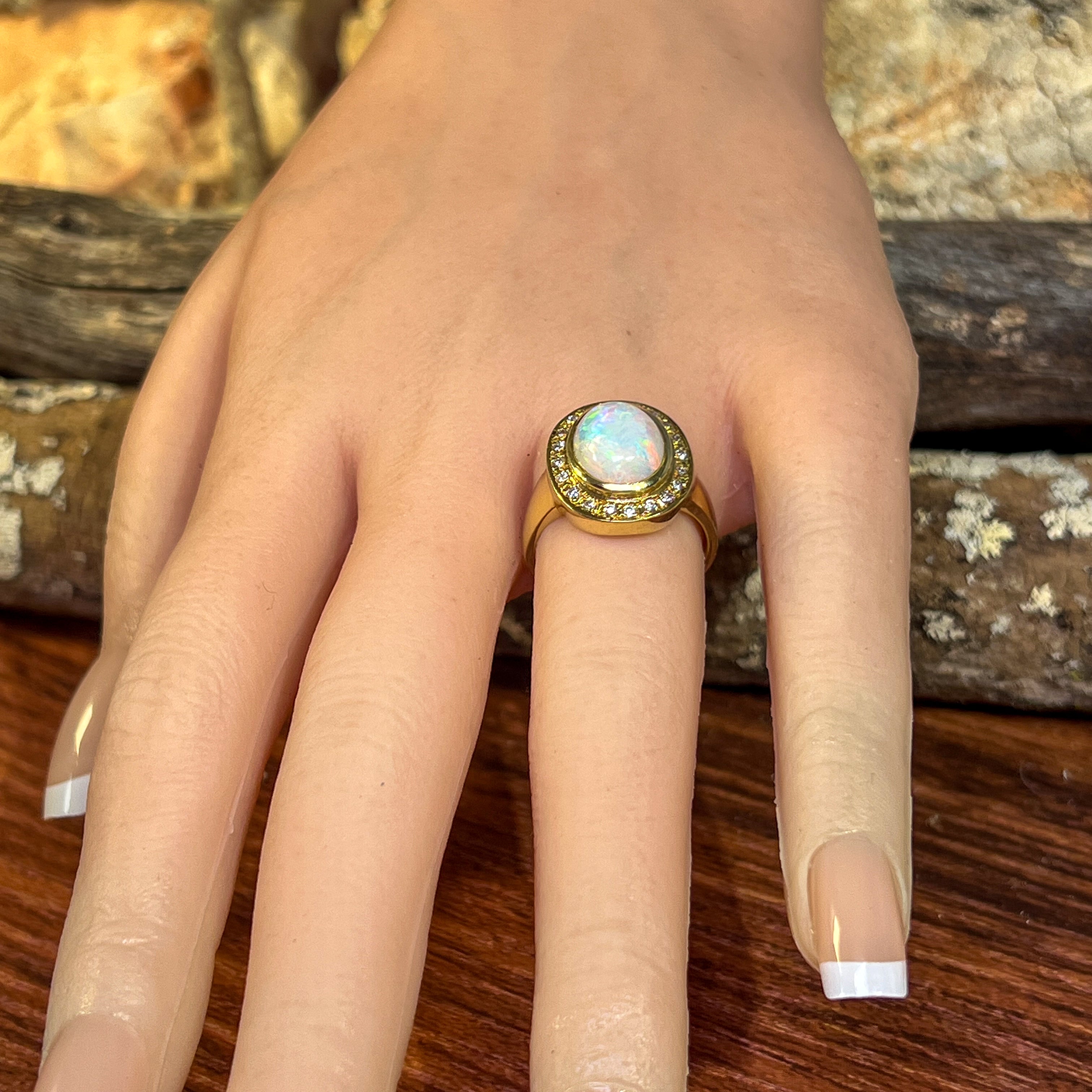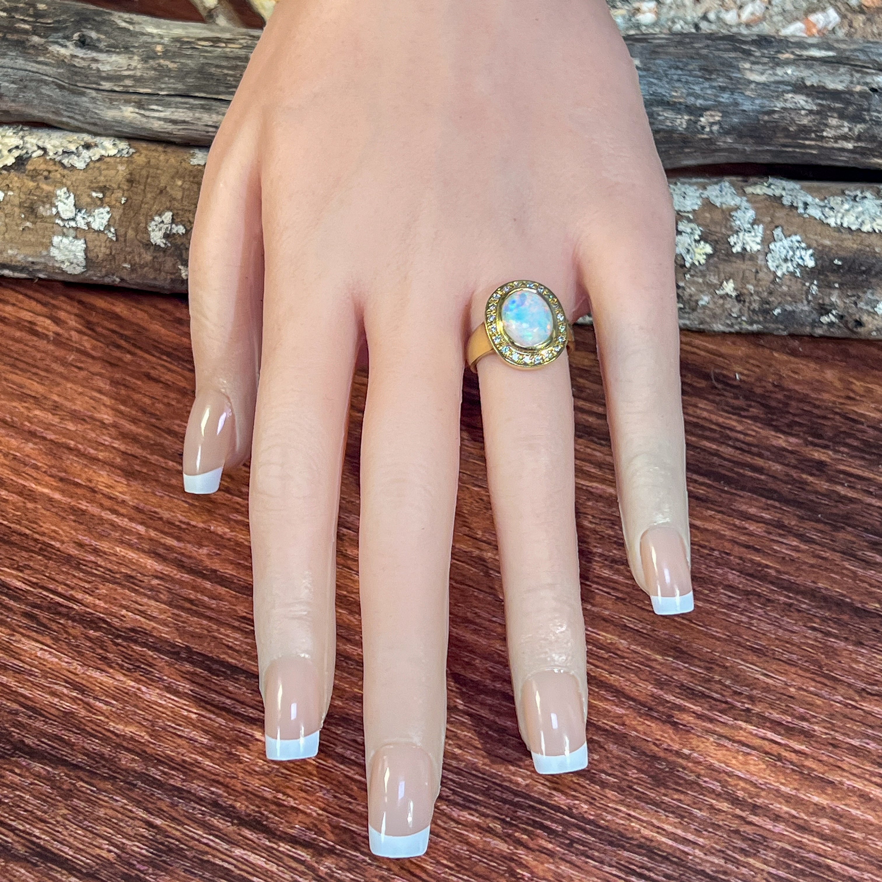 Take the plunge with this stunning 18kt Yellow Gold Crystal Opal 2.3ct and diamond Halo ring. Perfect for an engagement or as a bold statement piece, the large opal stone dazzles with its colorful play of light, while the diamond halo adds a touch of sophistication. Dare to stand out and make a bold statement with this unique ring.