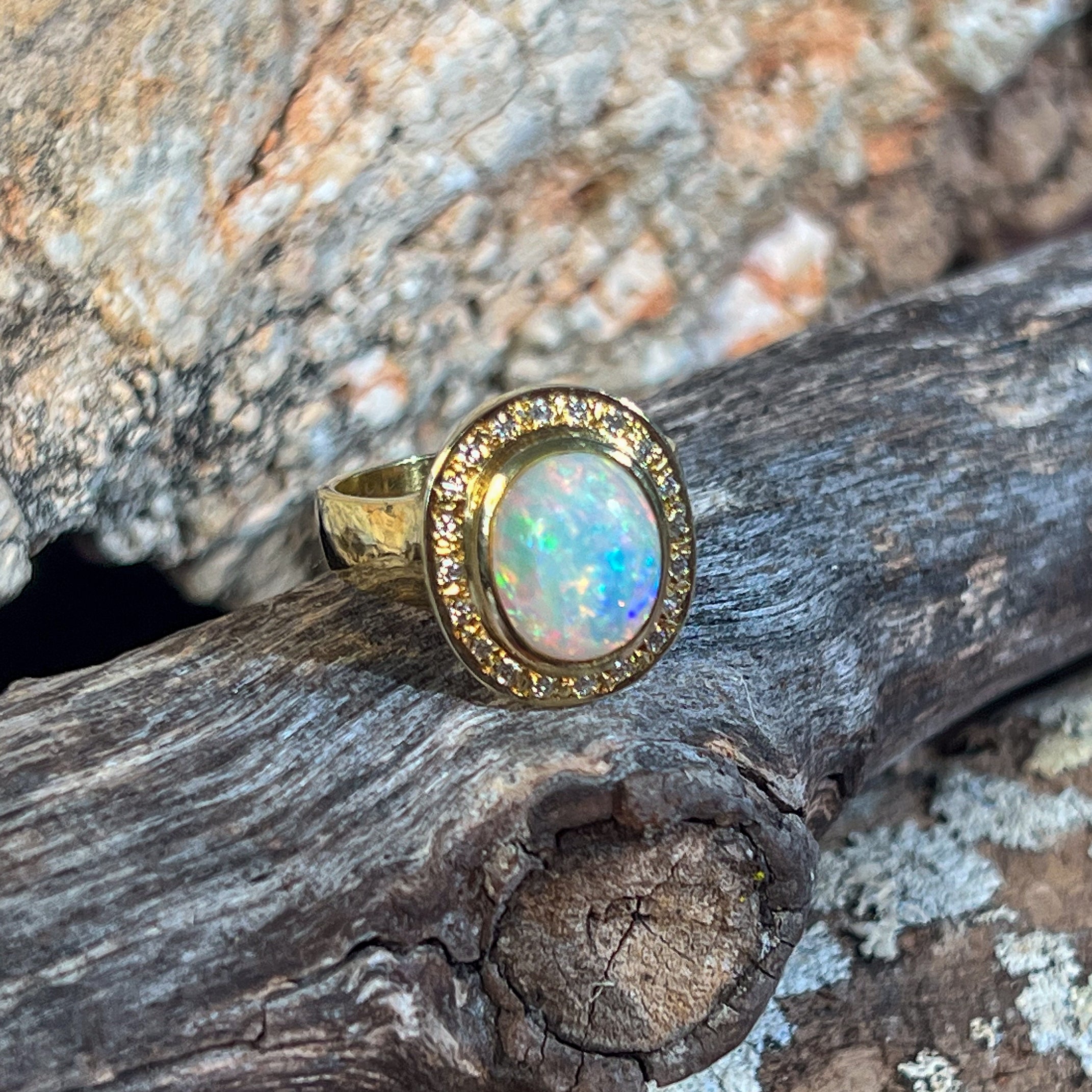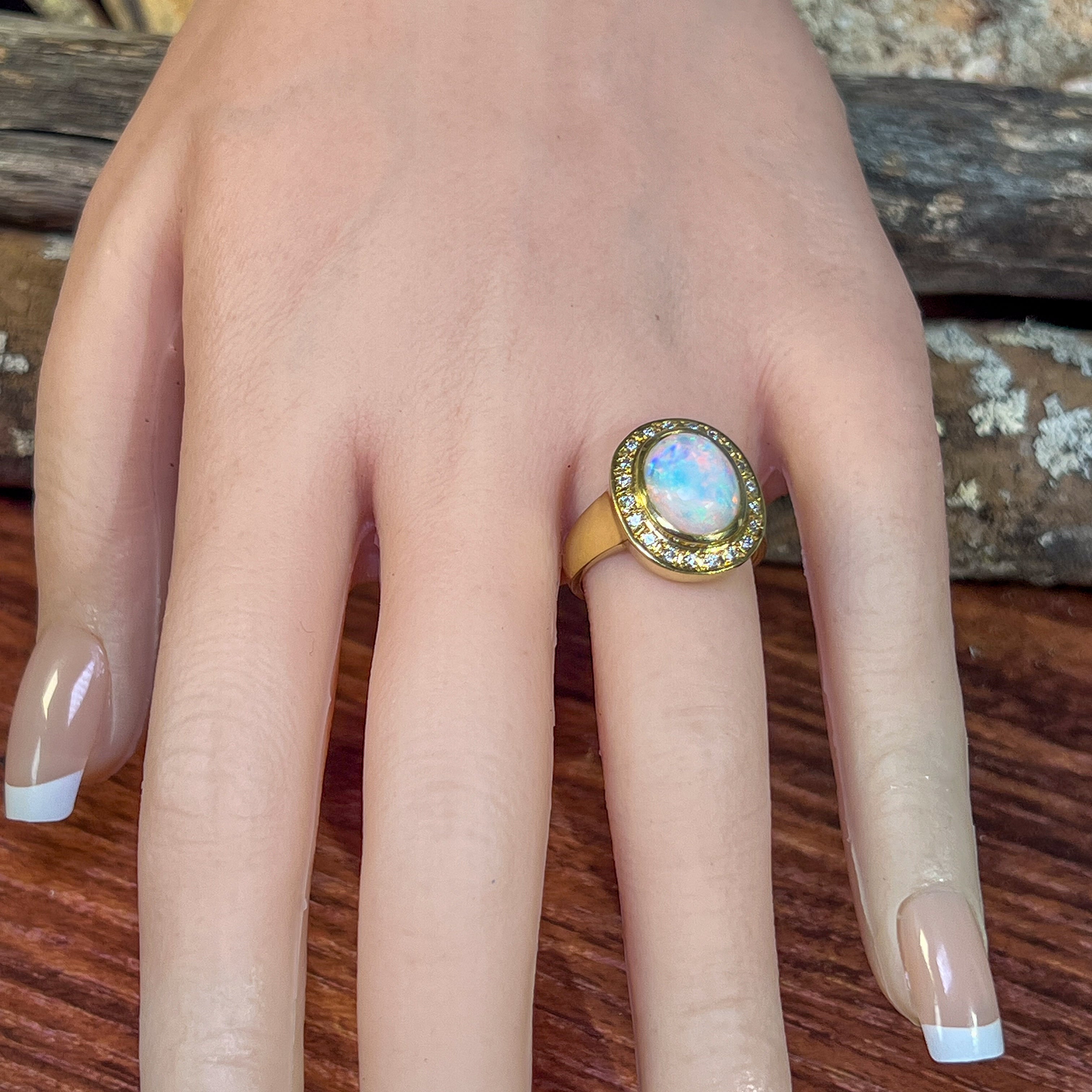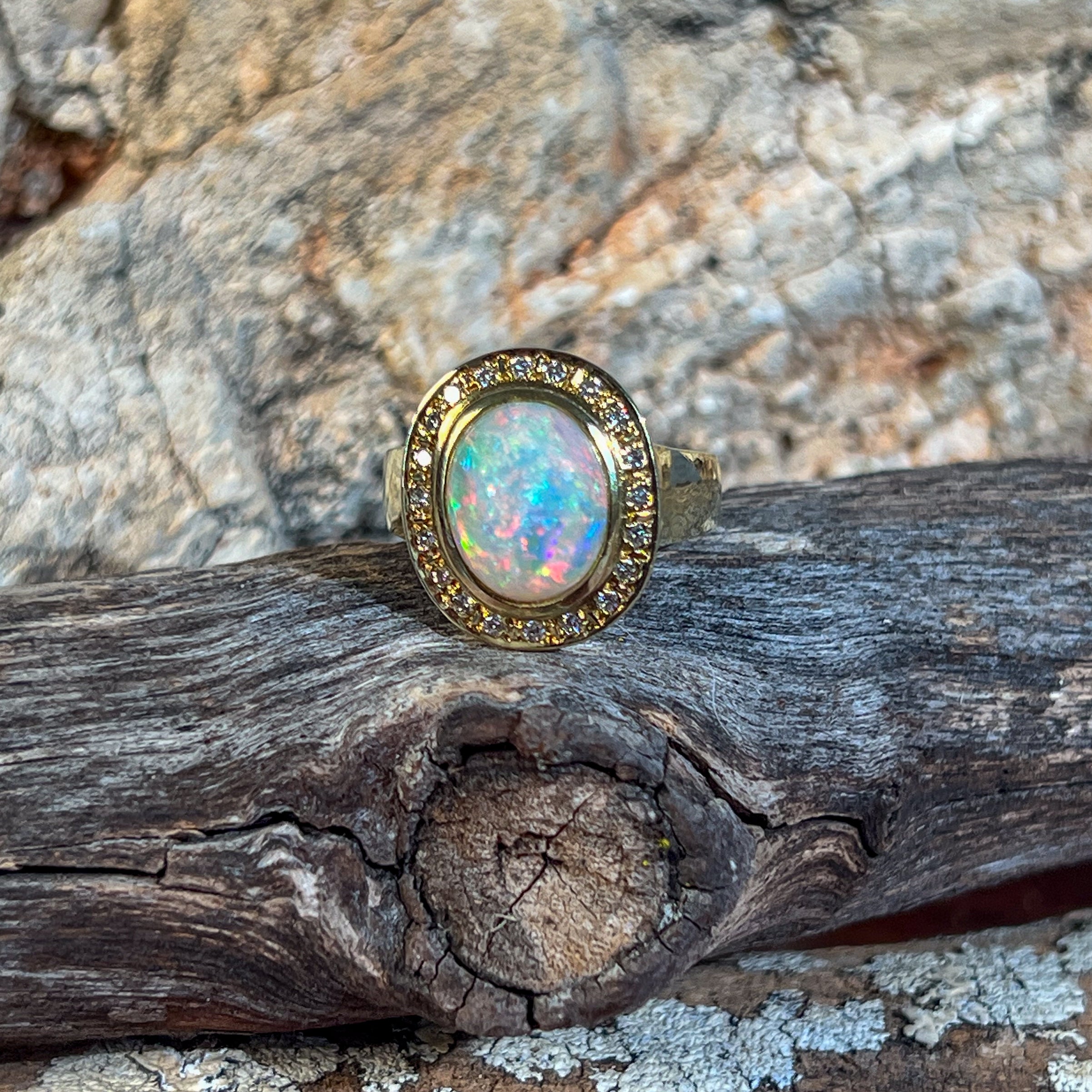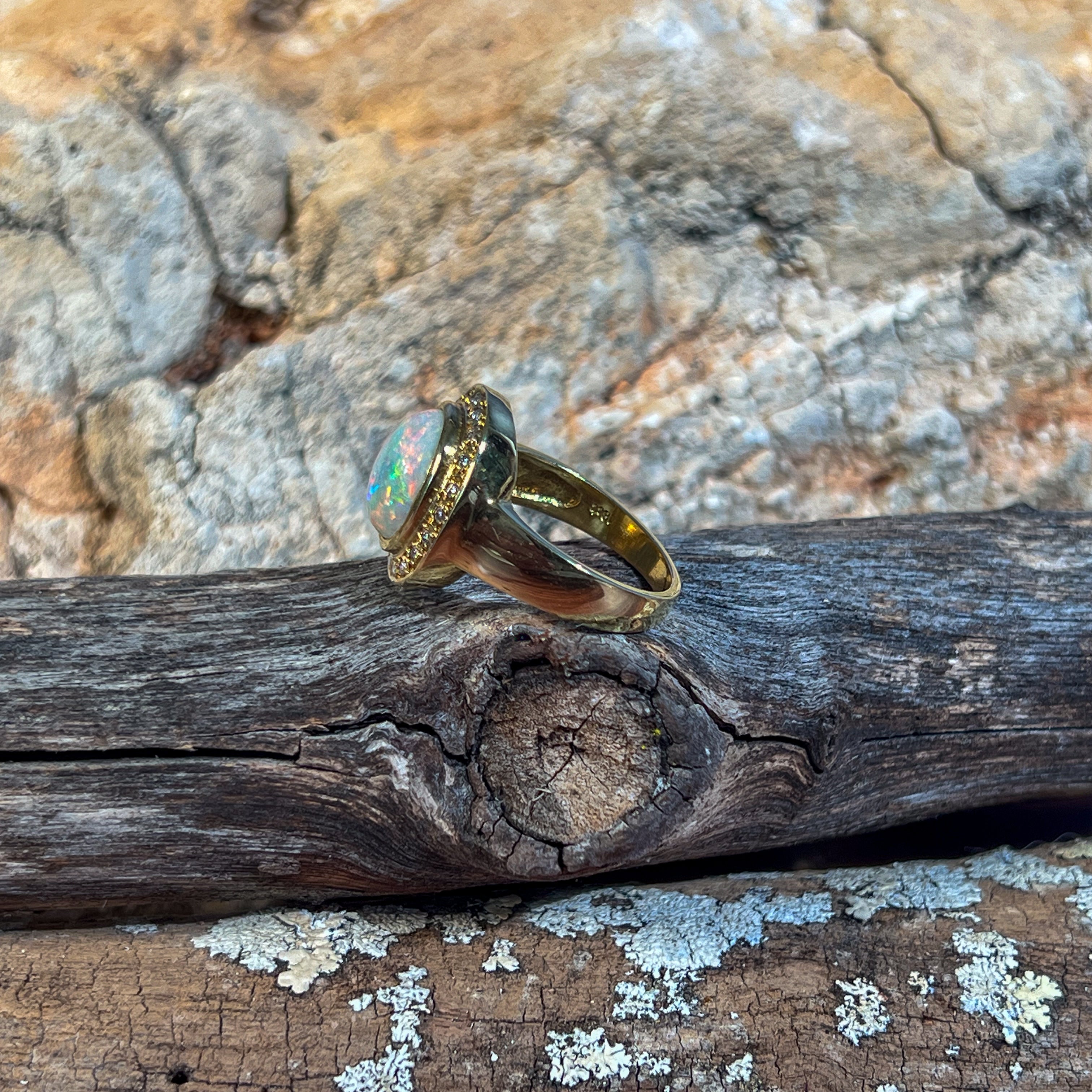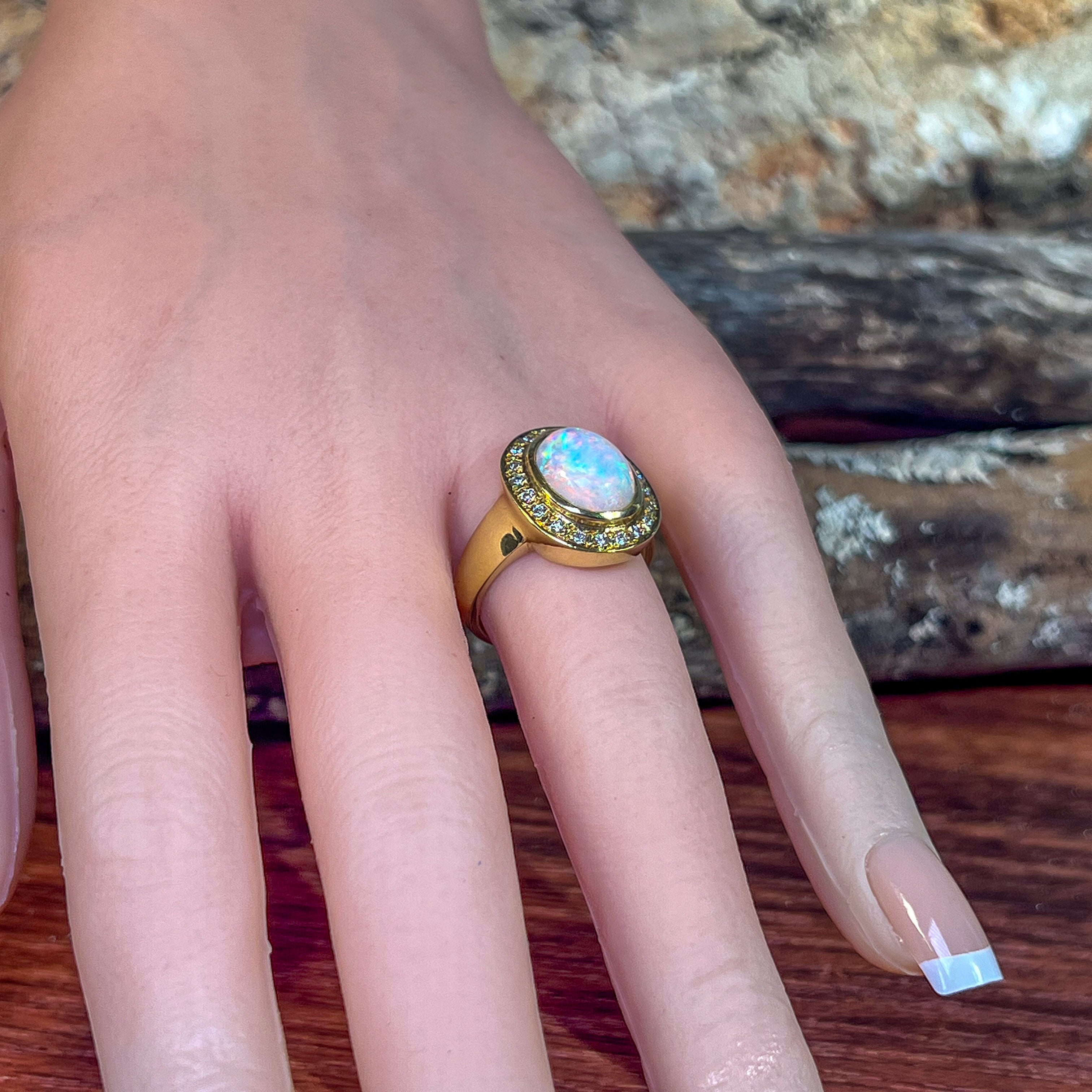 Take the plunge with this stunning 18kt Yellow Gold Crystal Opal 2.3ct and diamond Halo ring. Perfect for an engagement or as a bold statement piece, the large opal stone dazzles with its colorful play of light, while the diamond halo adds a touch of sophistication. Dare to stand out and make a bold statement with this unique ring.