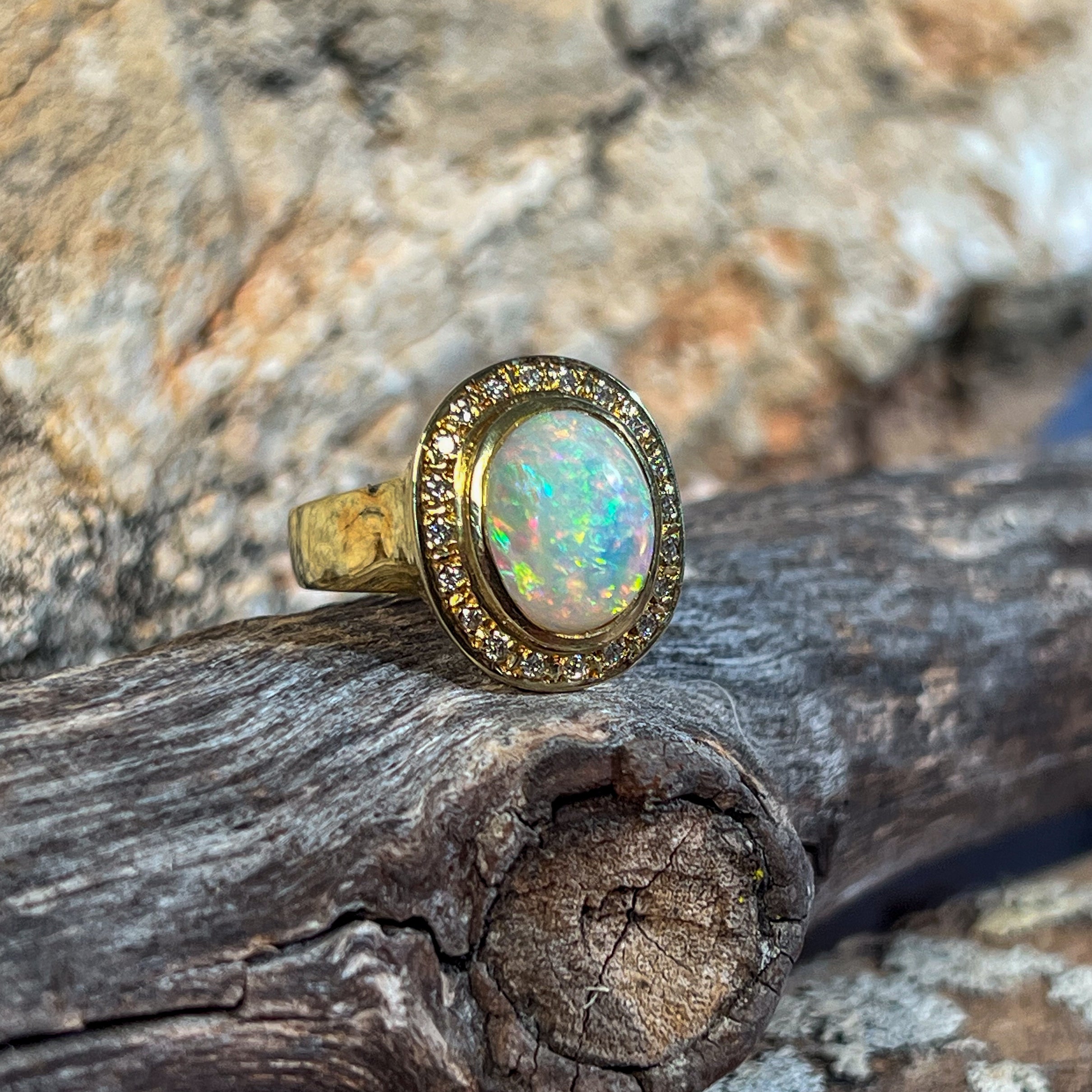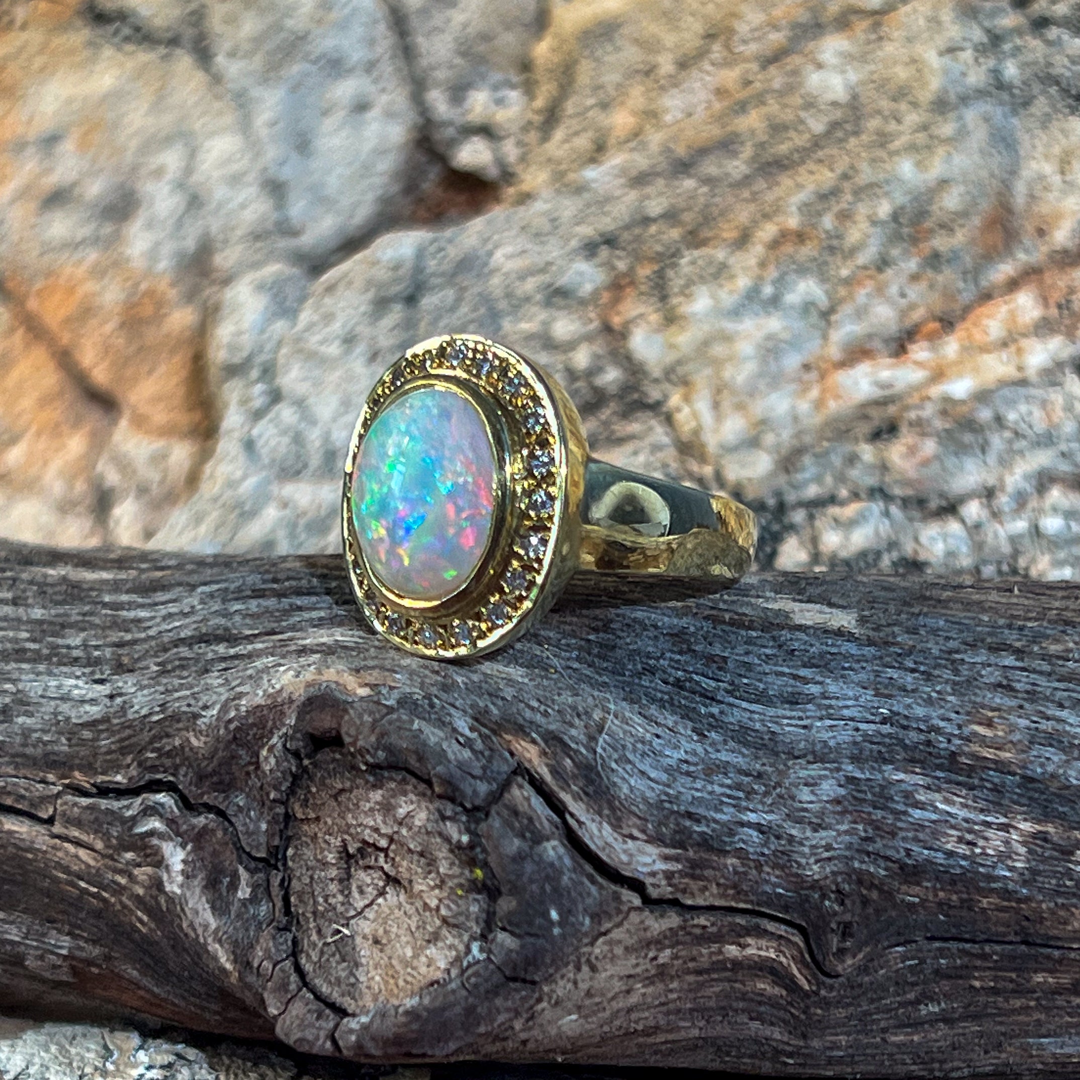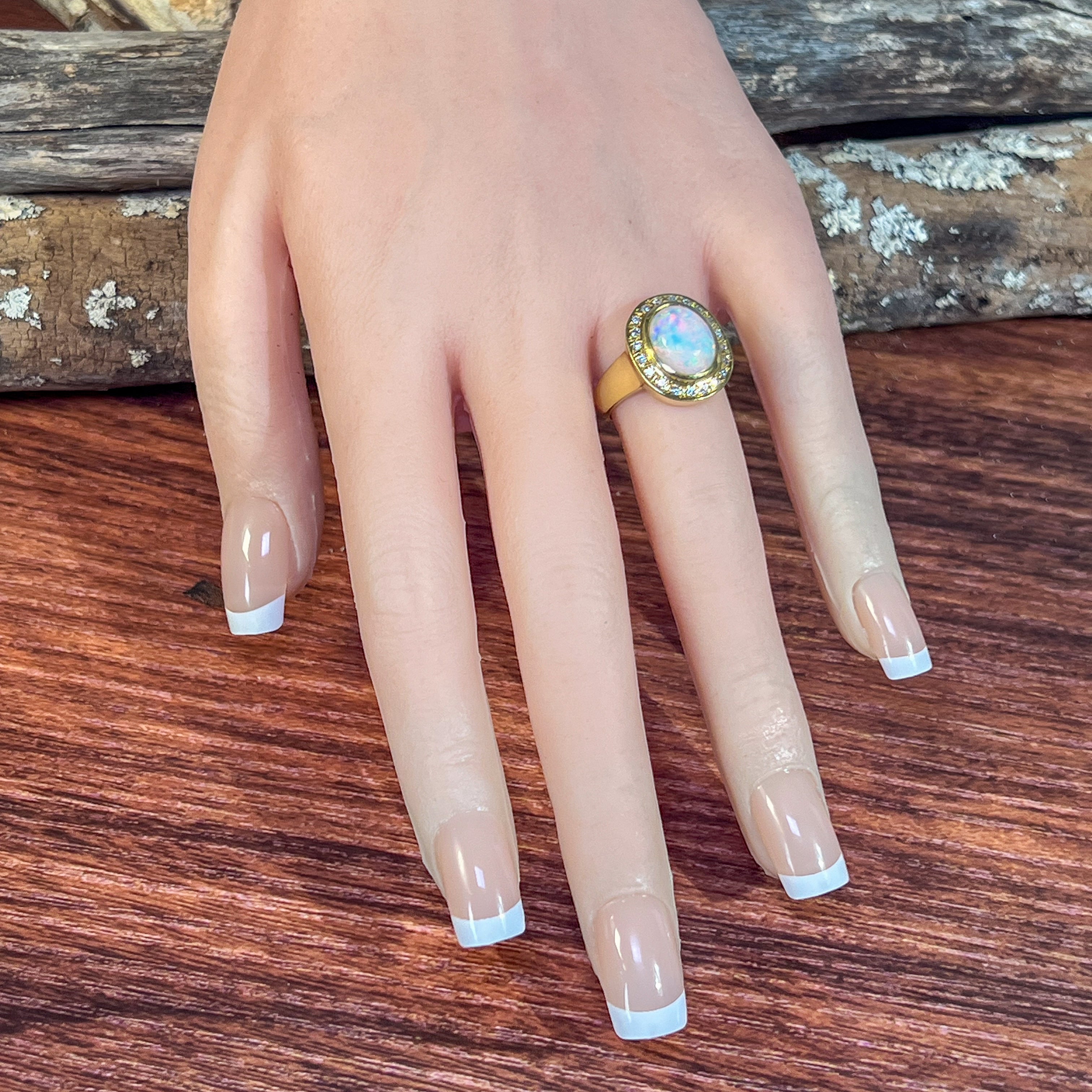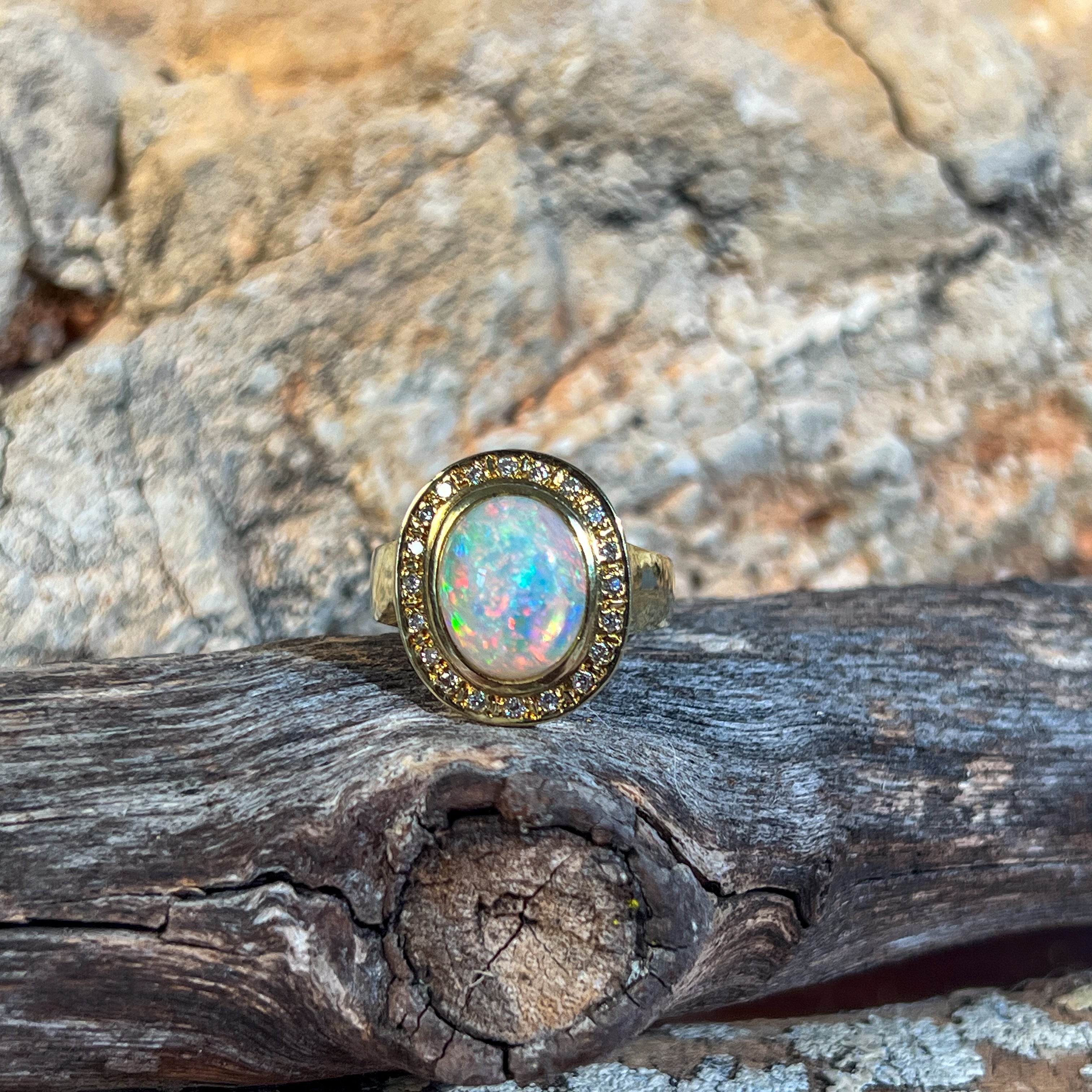 Take the plunge with this stunning 18kt Yellow Gold Crystal Opal 2.3ct and diamond Halo ring. Perfect for an engagement or as a bold statement piece, the large opal stone dazzles with its colorful play of light, while the diamond halo adds a touch of sophistication. Dare to stand out and make a bold statement with this unique ring.
