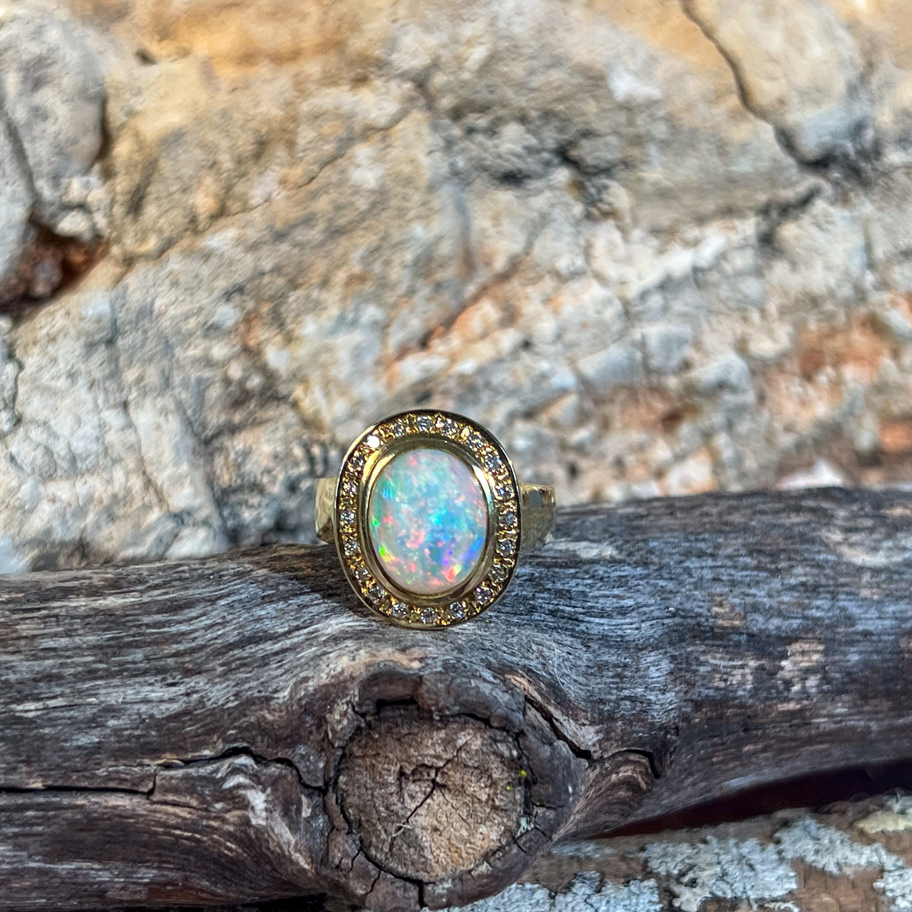 18kt Yellow Gold Crystal Opal 2.3ct and diamond Halo ring