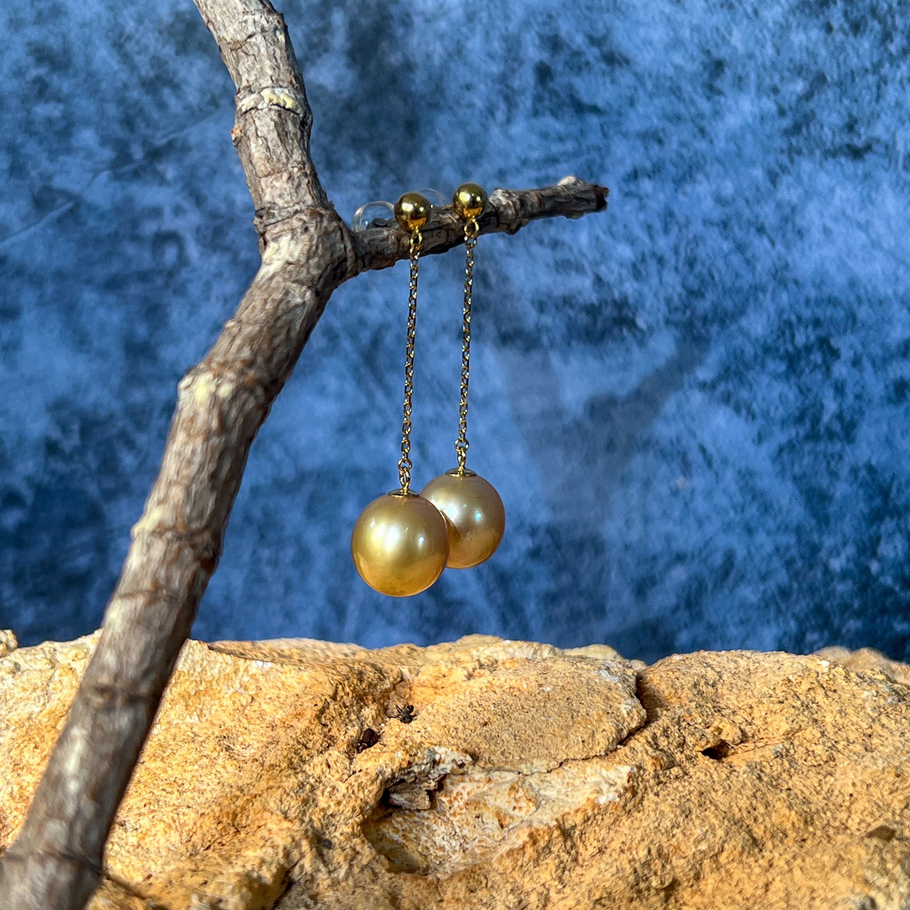 18kt Yellow gold dangling Golden South Sea Pearl 9-10mm earrings