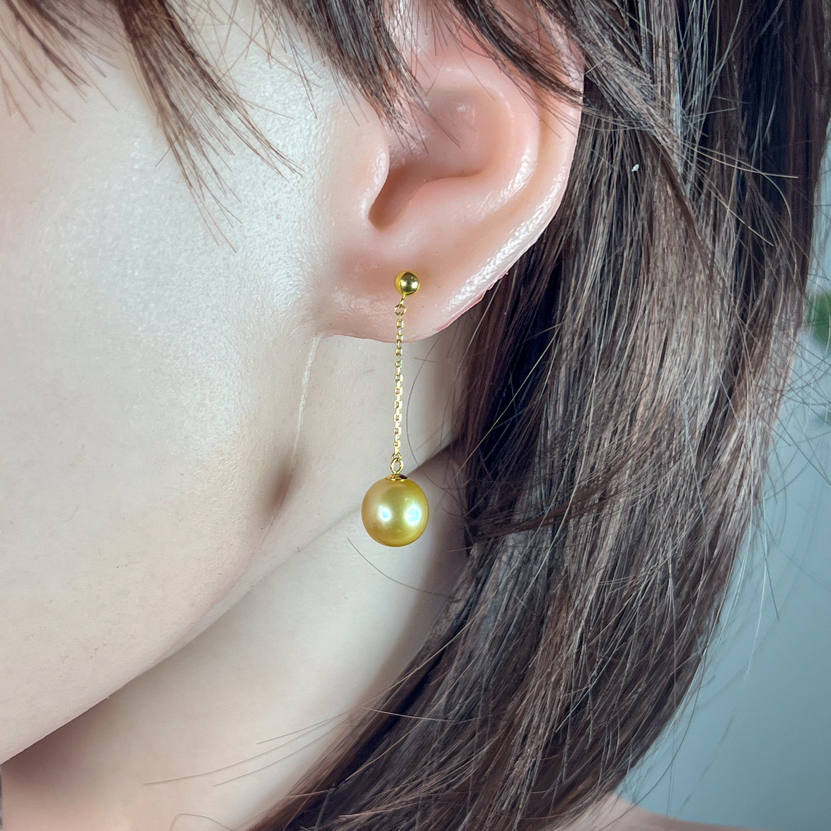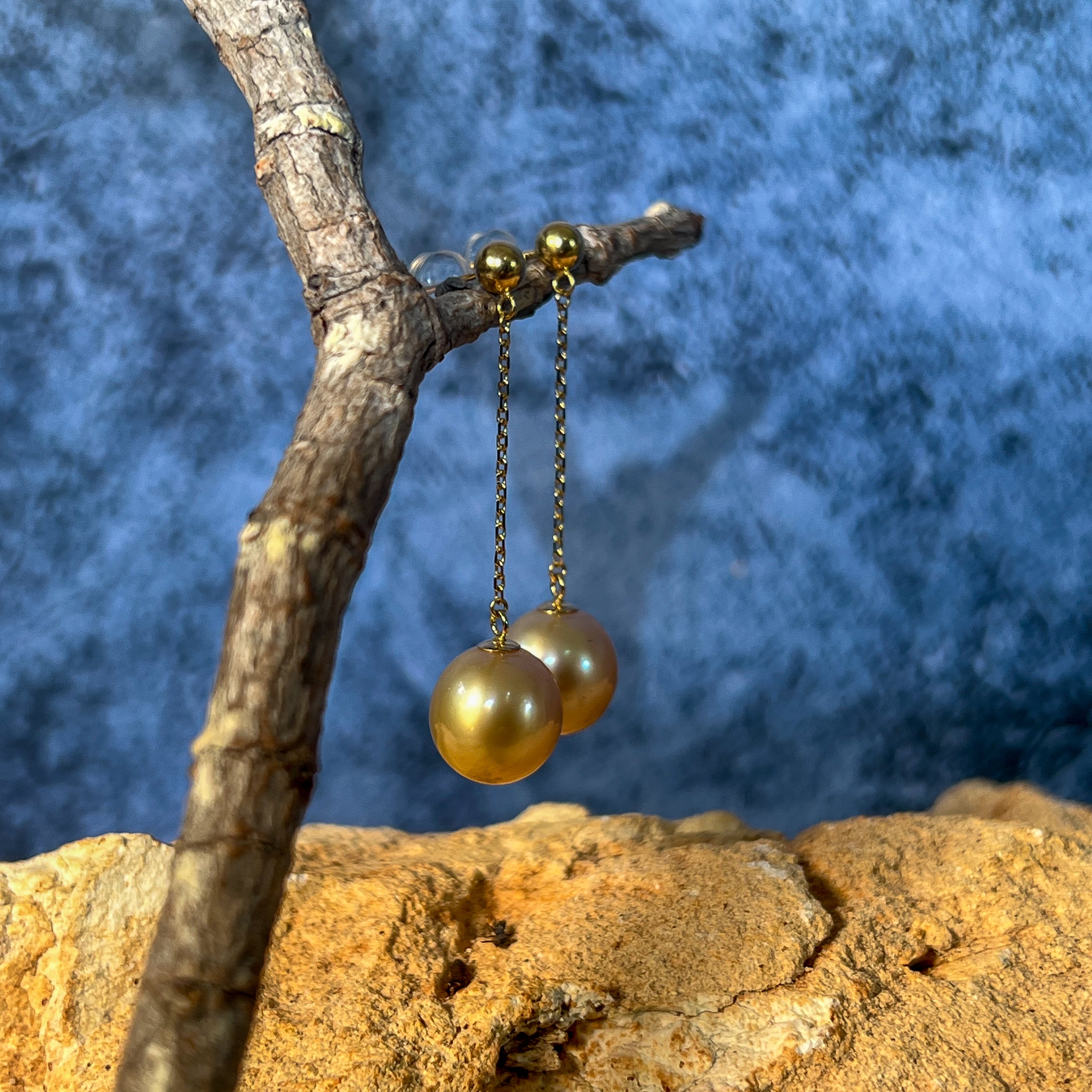 Elevate your elegance with these 18kt yellow gold earrings featuring lustrous Golden South Sea pearls measuring 9-10mm. Their long, graceful dangle design enhances movement and light reflection, adding a refined touch to any ensemble. Perfect for sophisticated occasions, these earrings combine timeless luxury with exquisite craftsmanship.