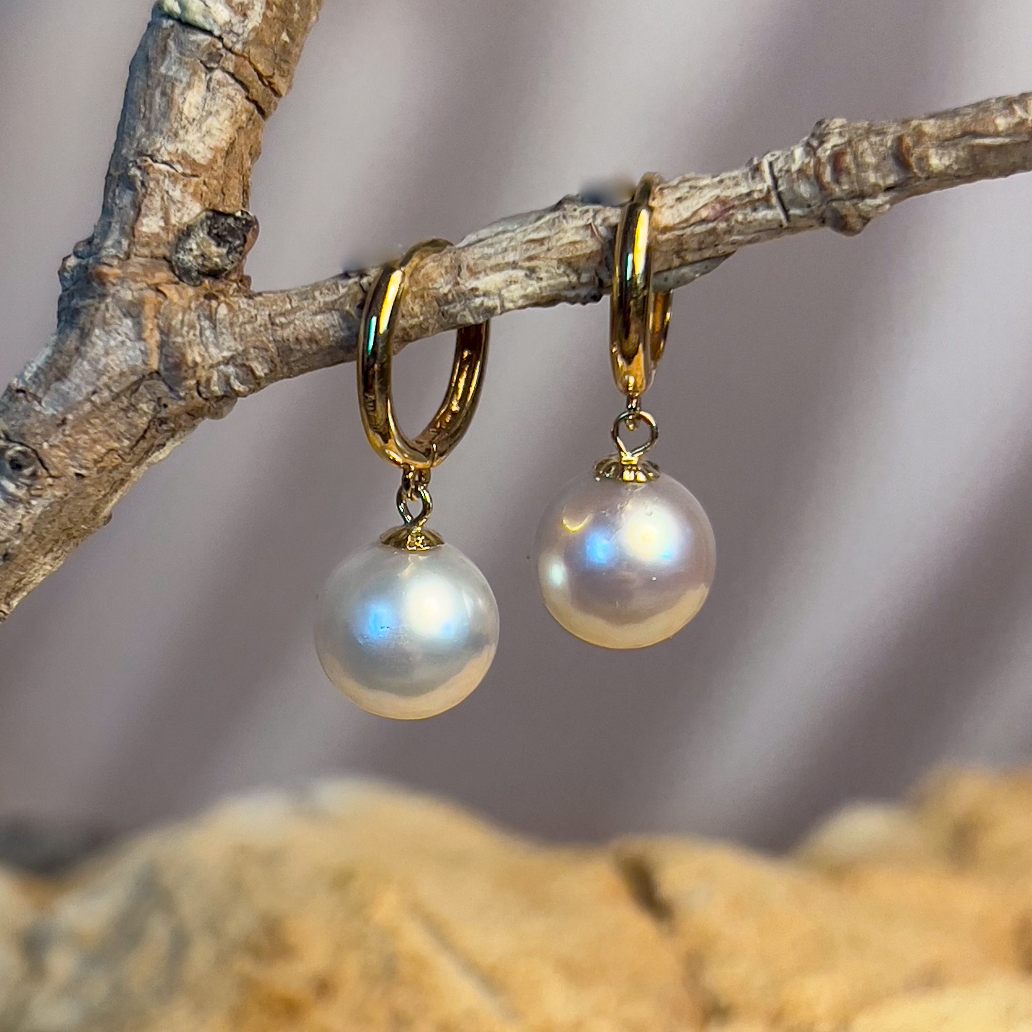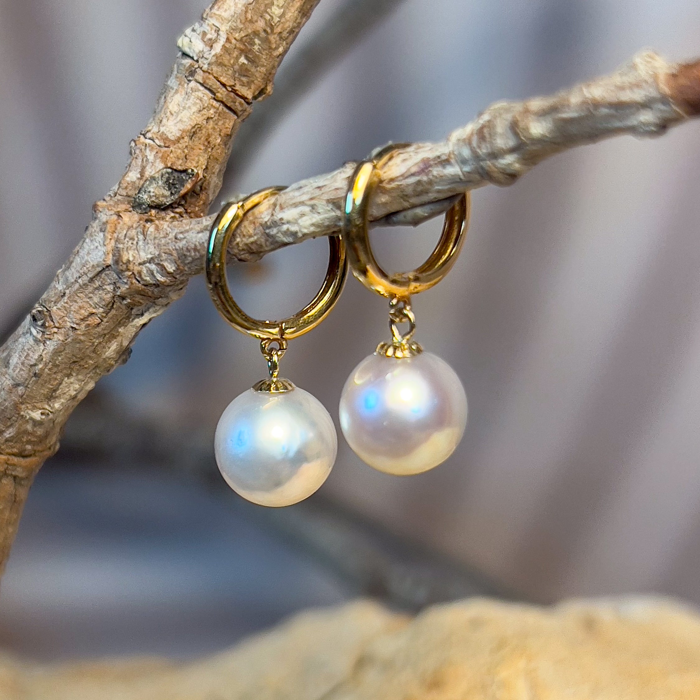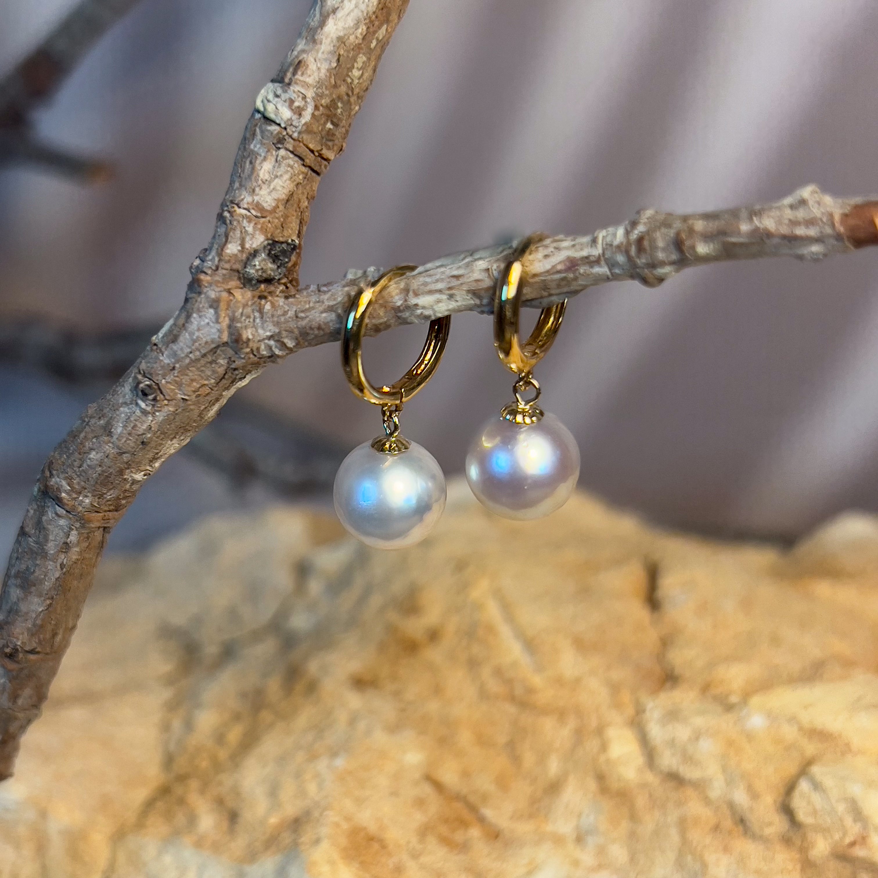 18kt Yellow Gold Huggie round dangling earrings 8-8.5mm South Sea White Pearls