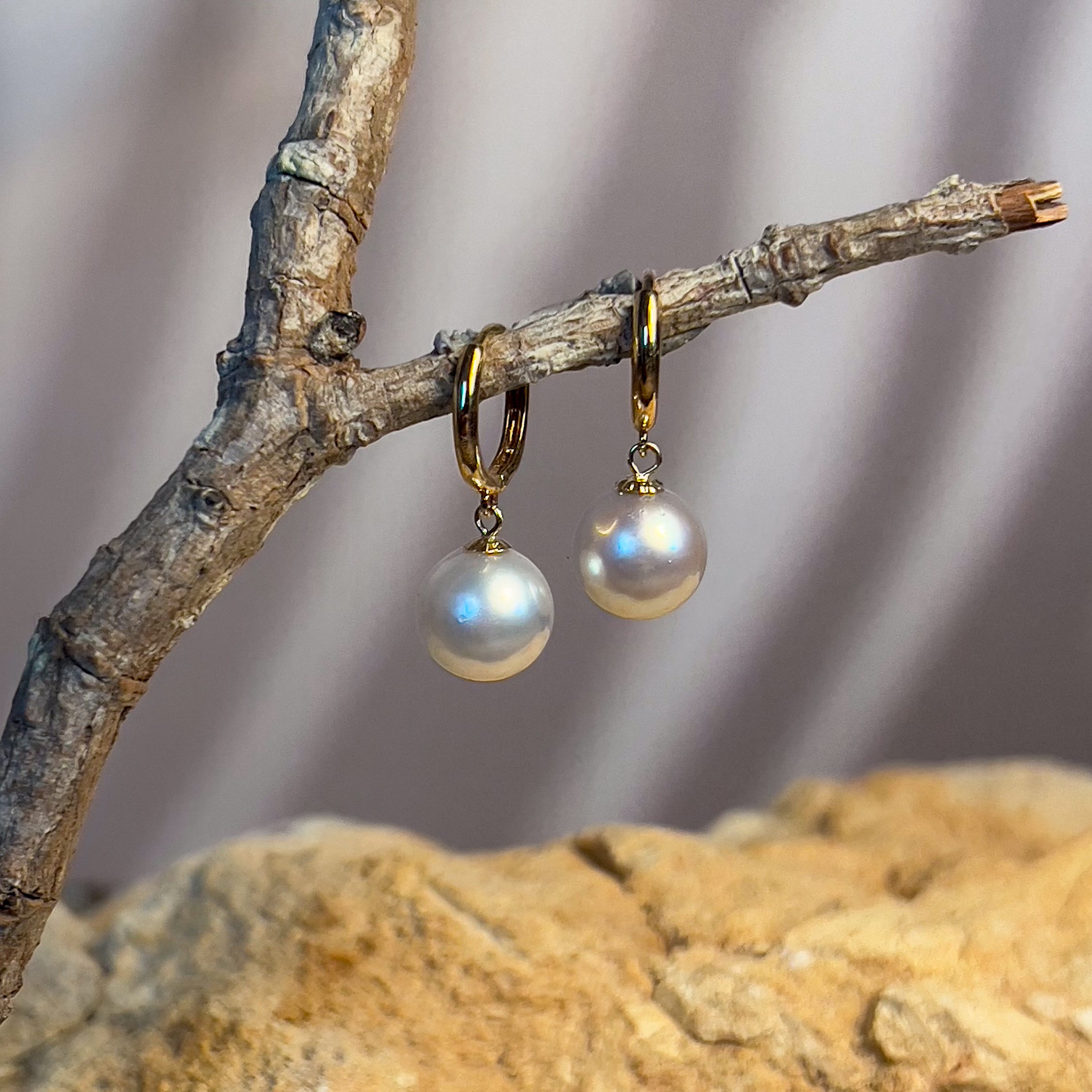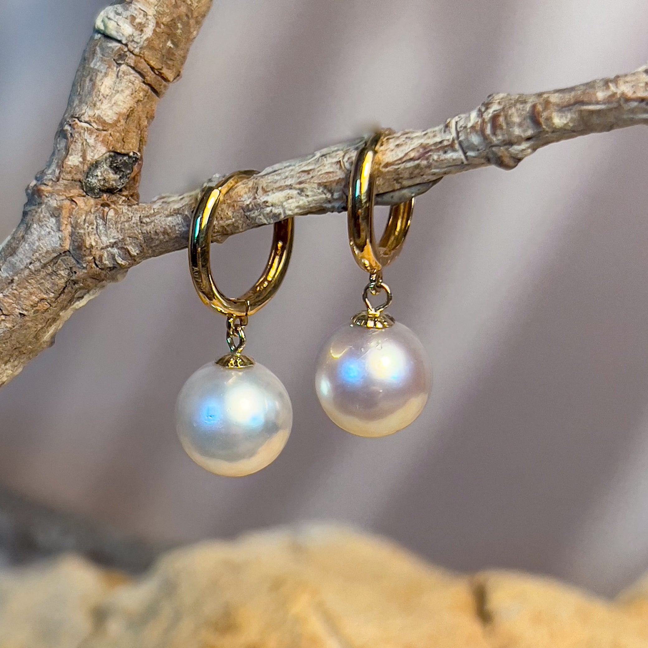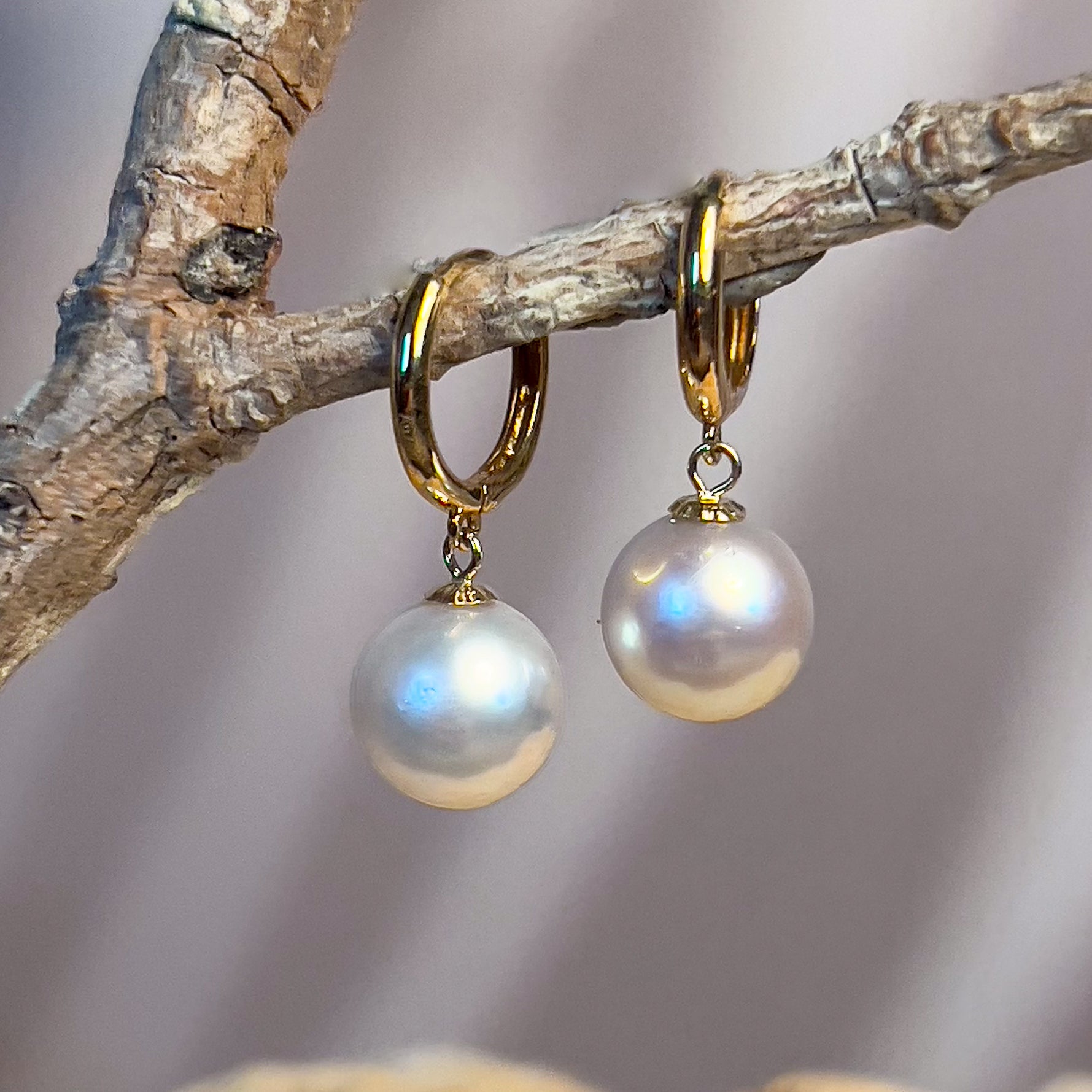 18kt Yellow Gold Huggie round dangling earrings 8-8.5mm South Sea White Pearls