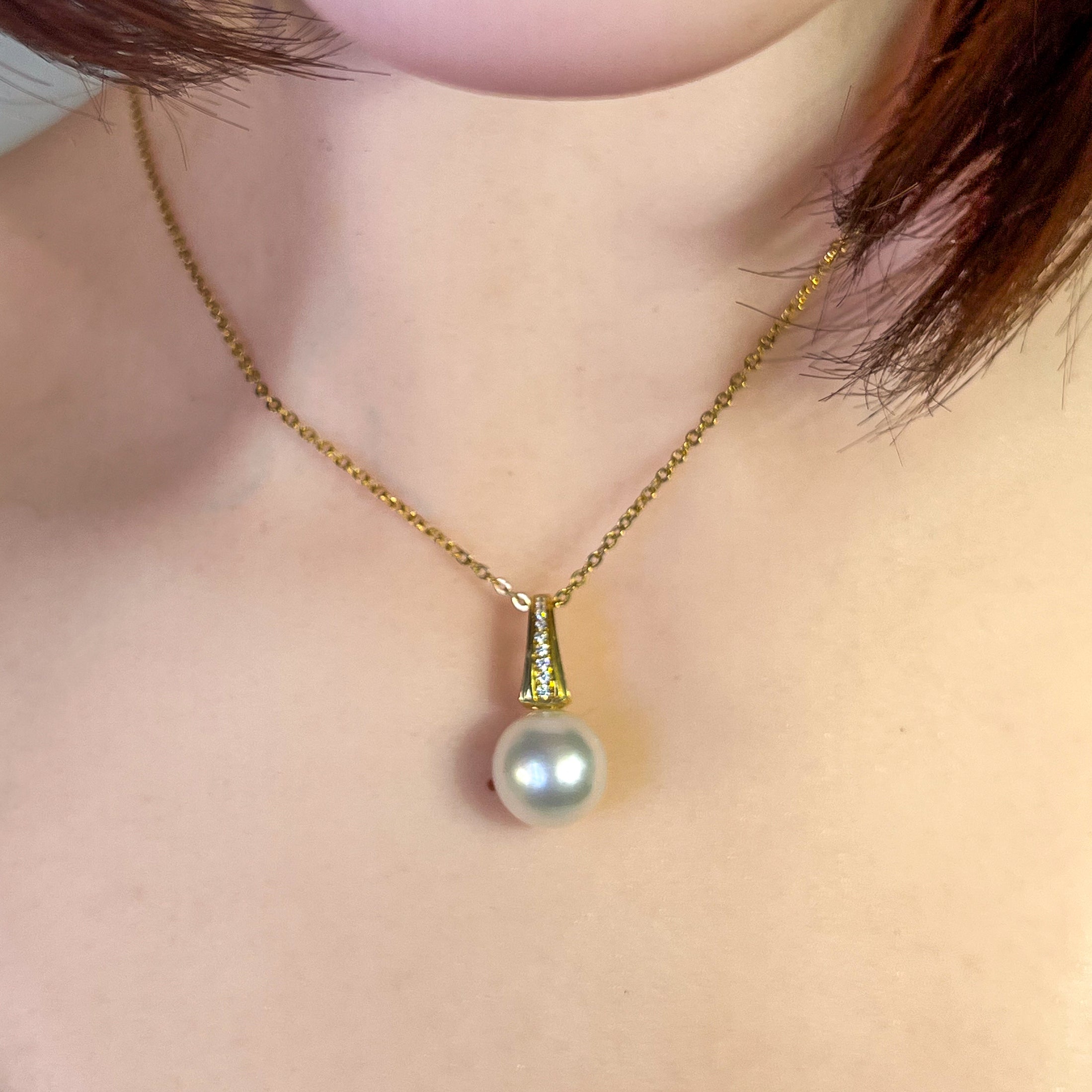Elevate your look with our modern 18kt Yellow Gold South Sea Pearl and Diamond pendant! Dazzle with confidence, as the sleek design of this pendant exudes elegance and sophistication. Perfect for any occasion, let the shimmering diamonds and timeless pearl add a touch of luxury to your style.