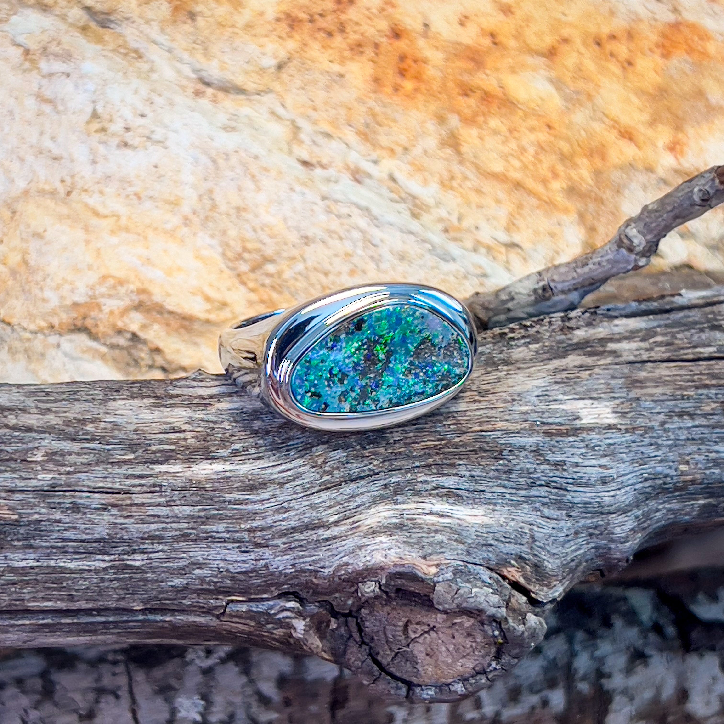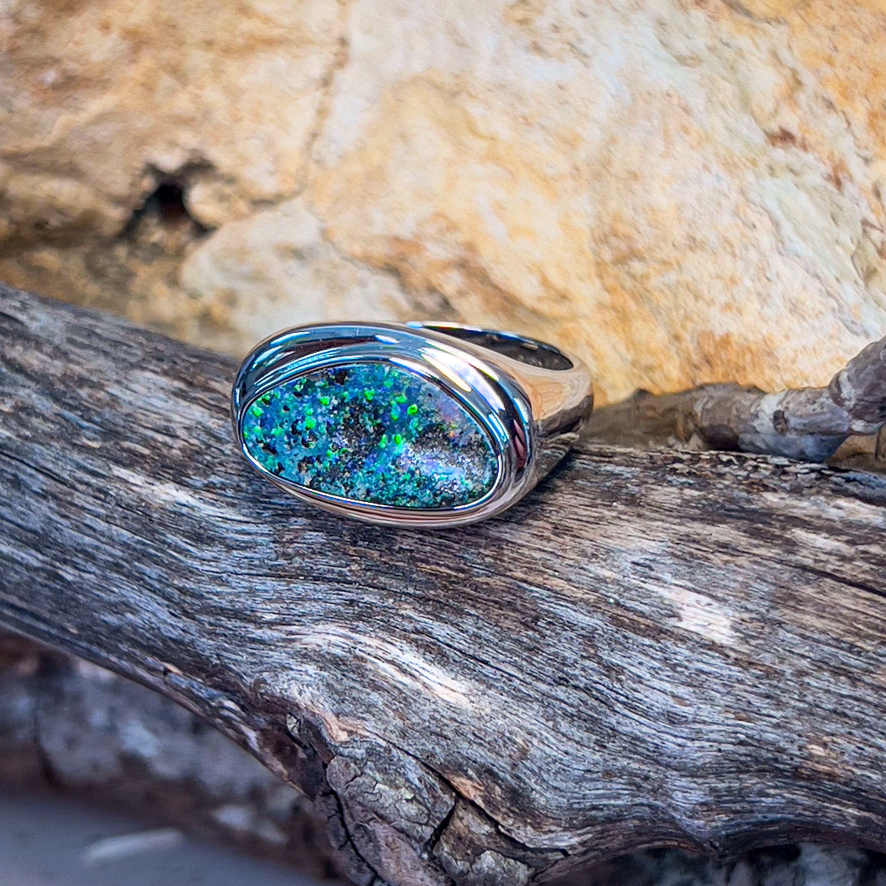Expertly crafted with 9kt white gold, this gents ring features a stunning 5.52ct boulder opal stone. The perfect gift for any man who appreciates fine jewellery. Unique, elegant, and timeless, this ring is sure to impress.