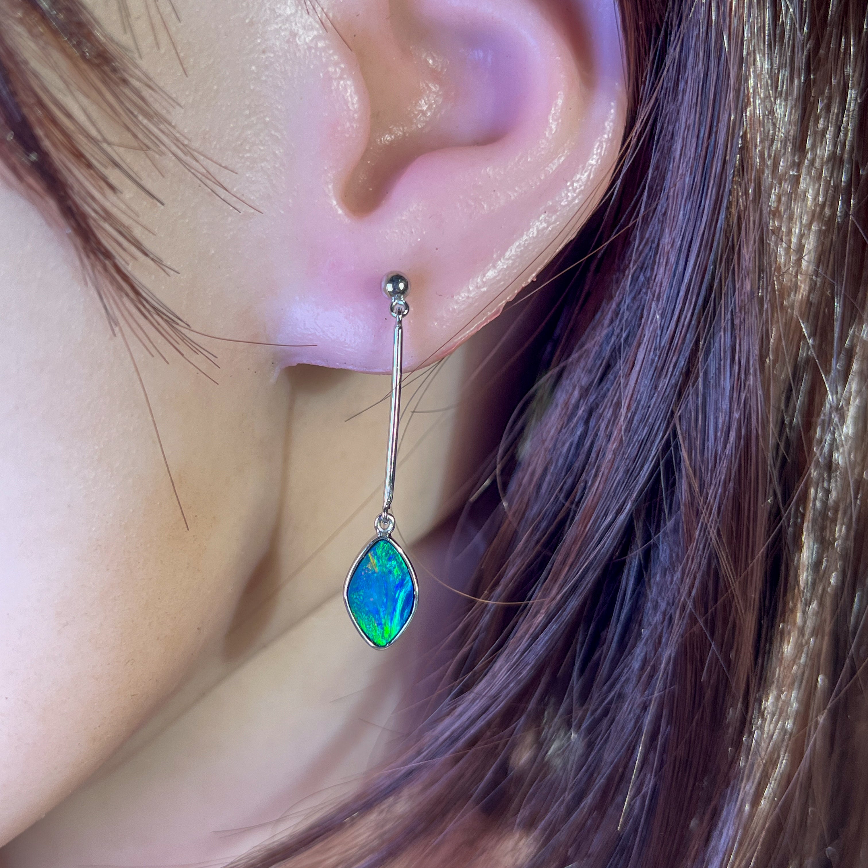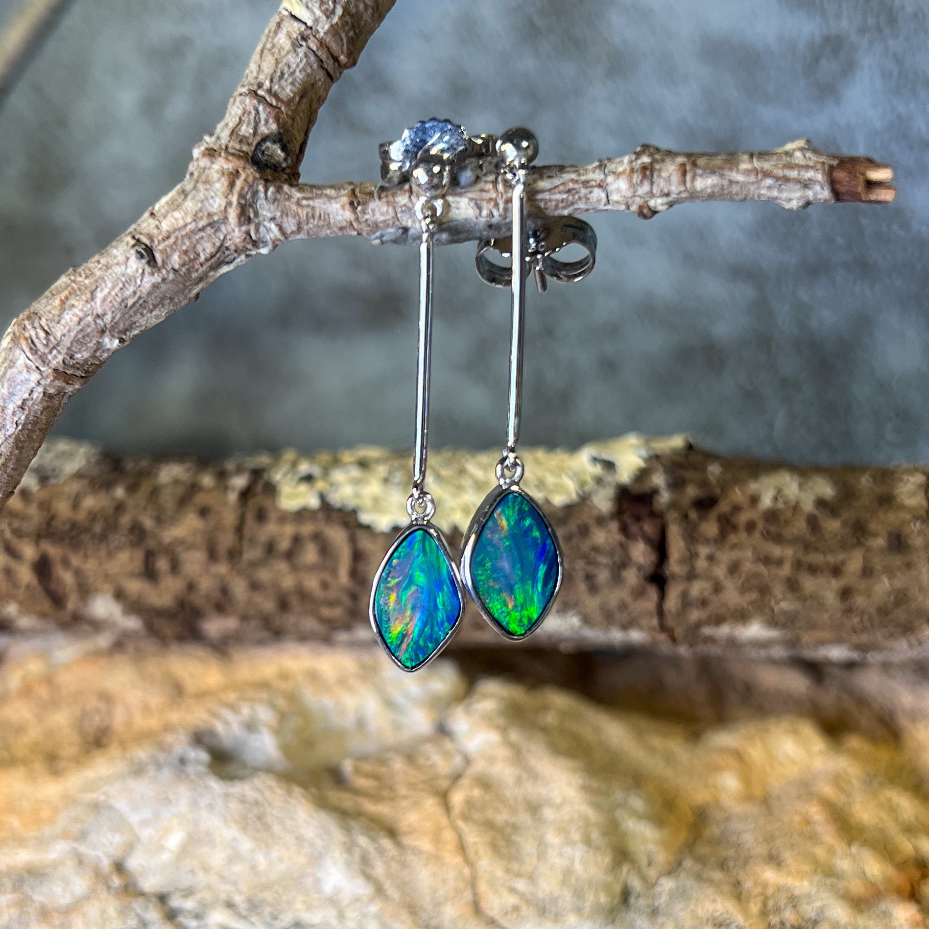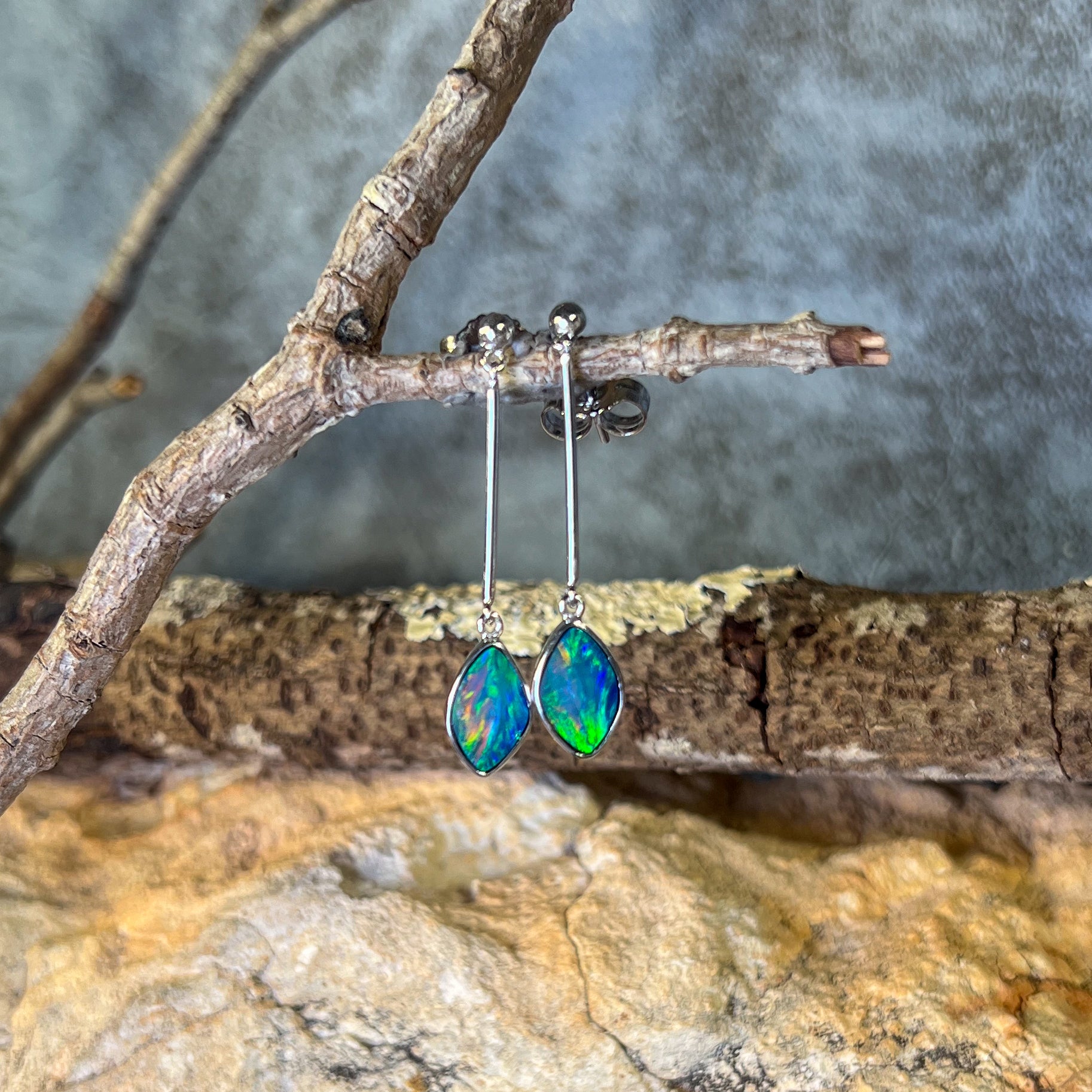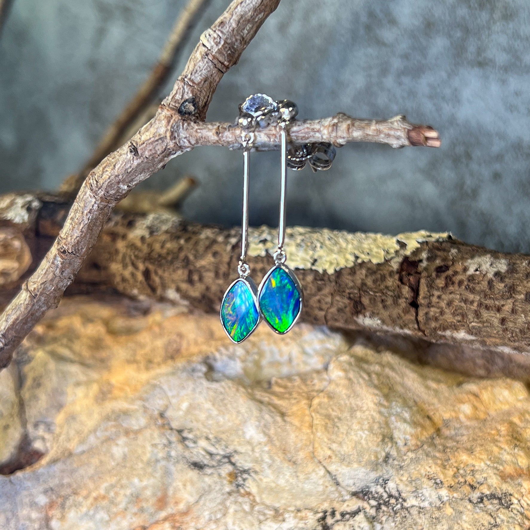 9kt White gold long Bar style dangling Opal doublet bezel set earrings