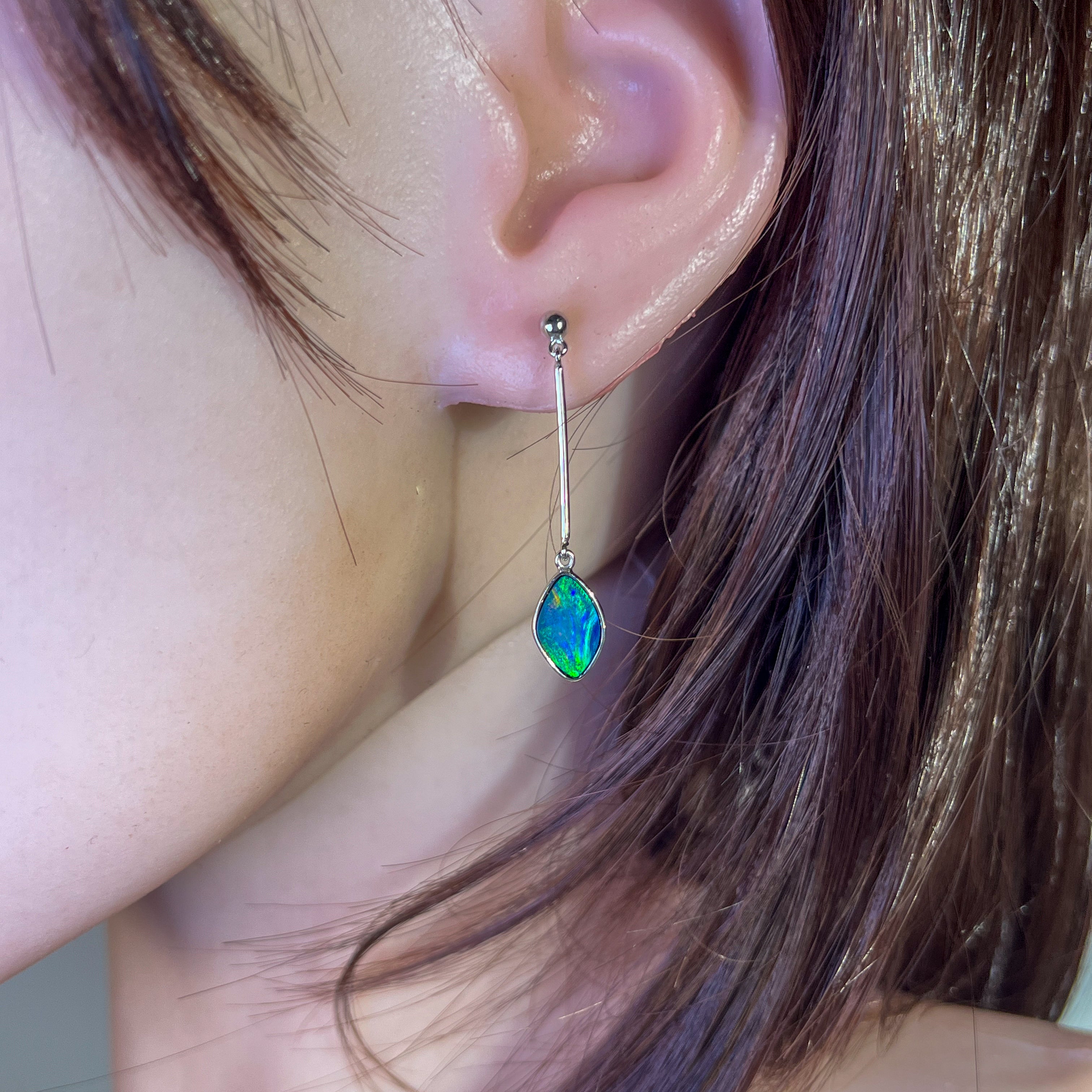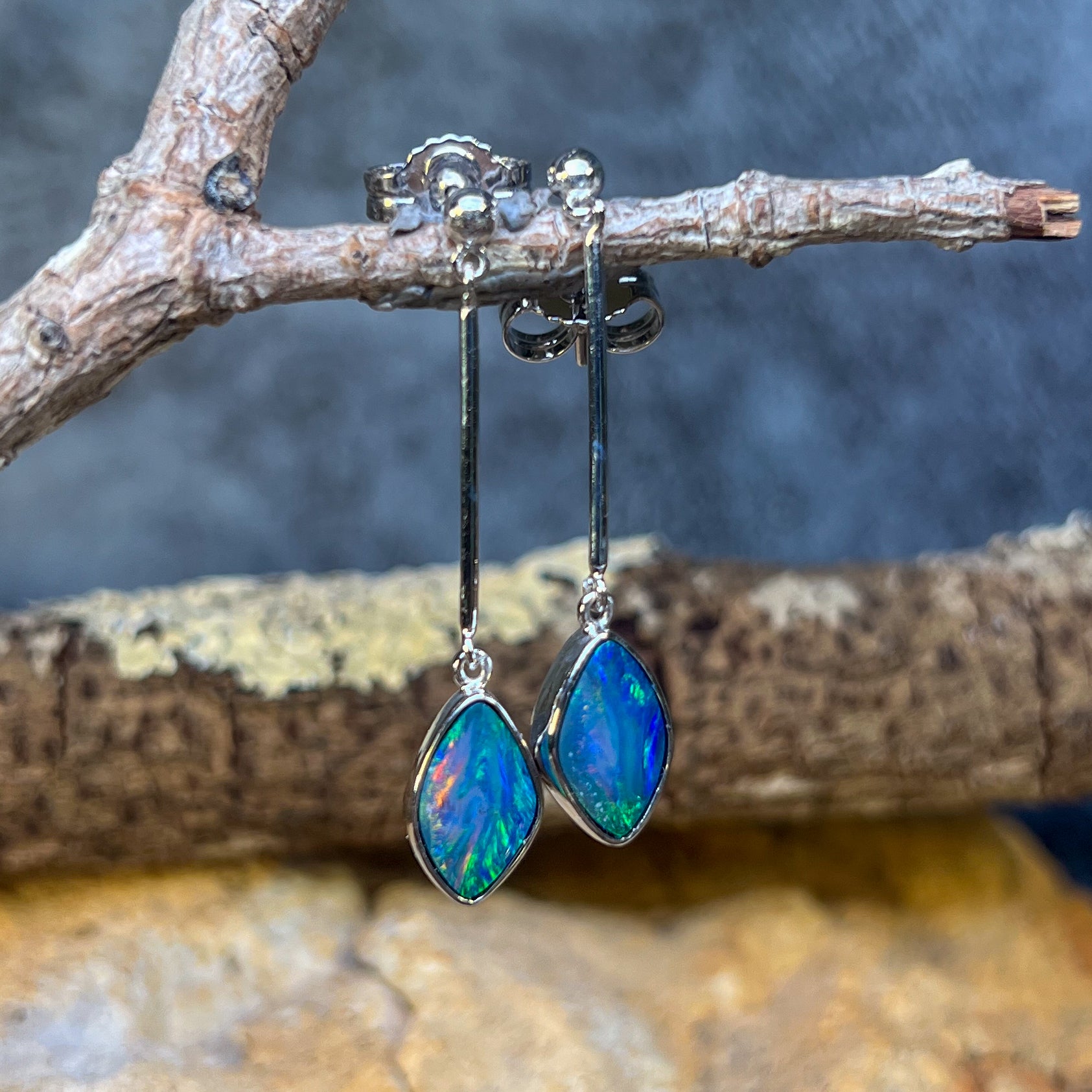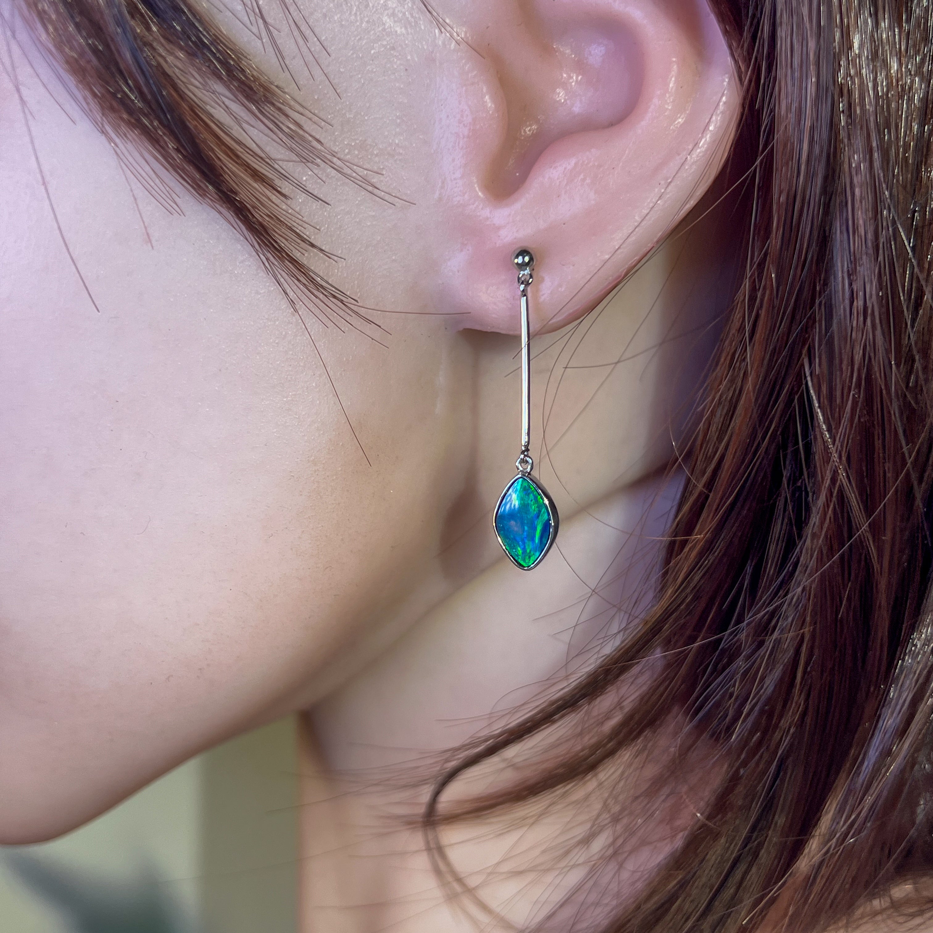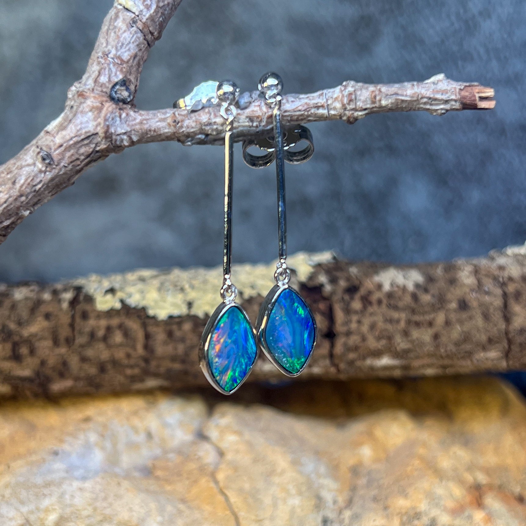 9kt White gold long Bar style dangling Opal doublet bezel set earrings