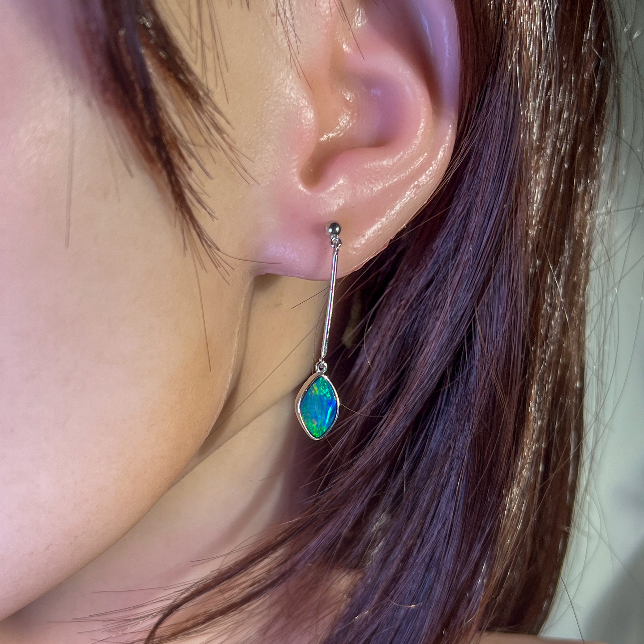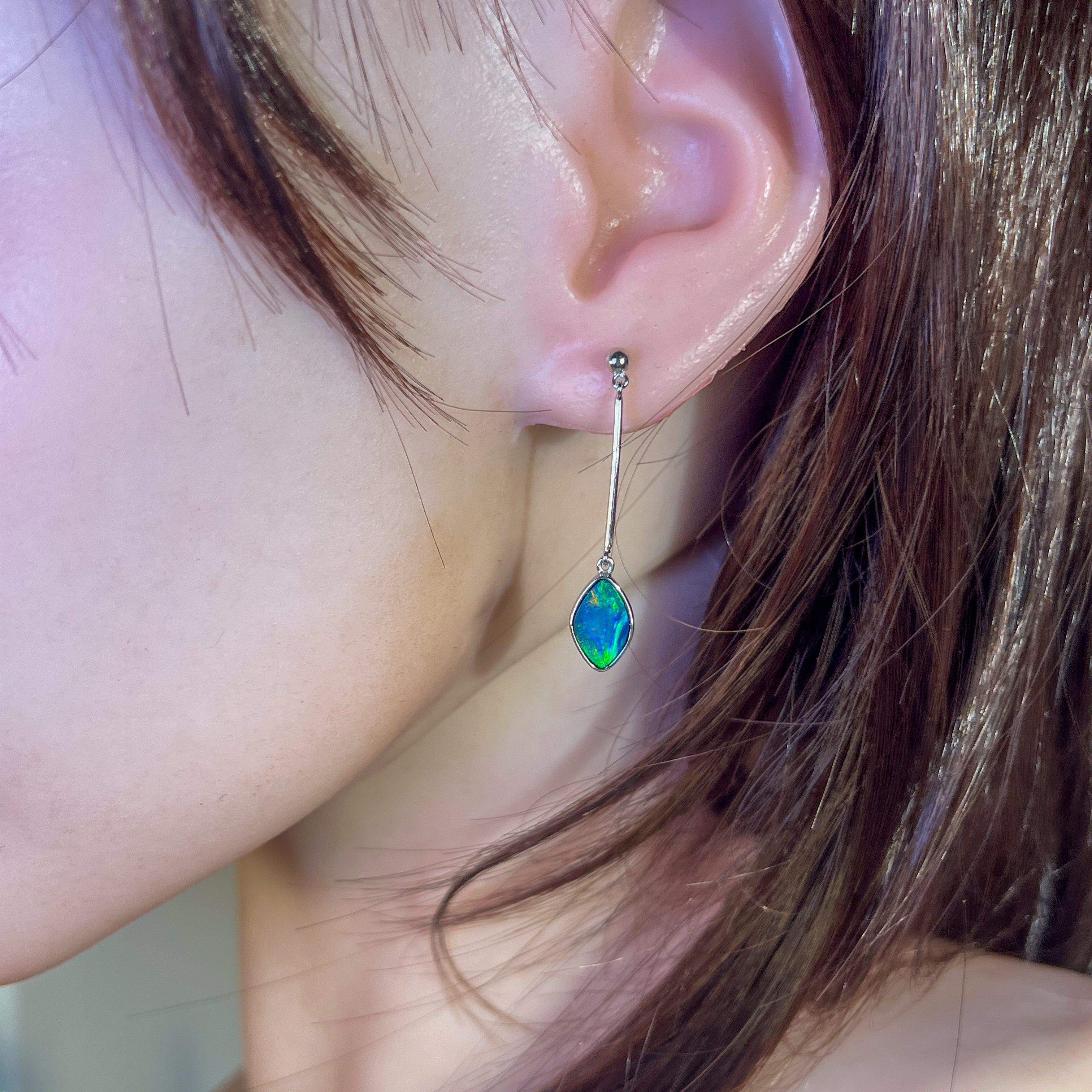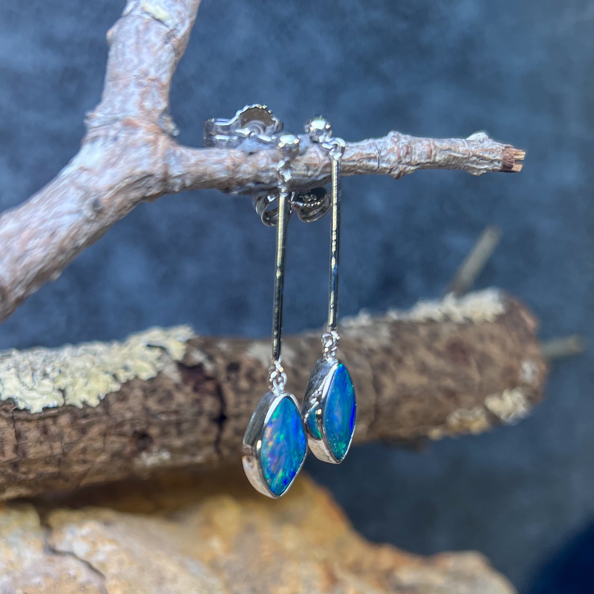 Elevate your style with these 9kt white gold earrings featuring modern long drop design. The bezel set opal doublet stones add a touch of luxury and elegance to any outfit. Perfect for special occasions or everyday wear. Stand out with these striking and sophisticated earrings.