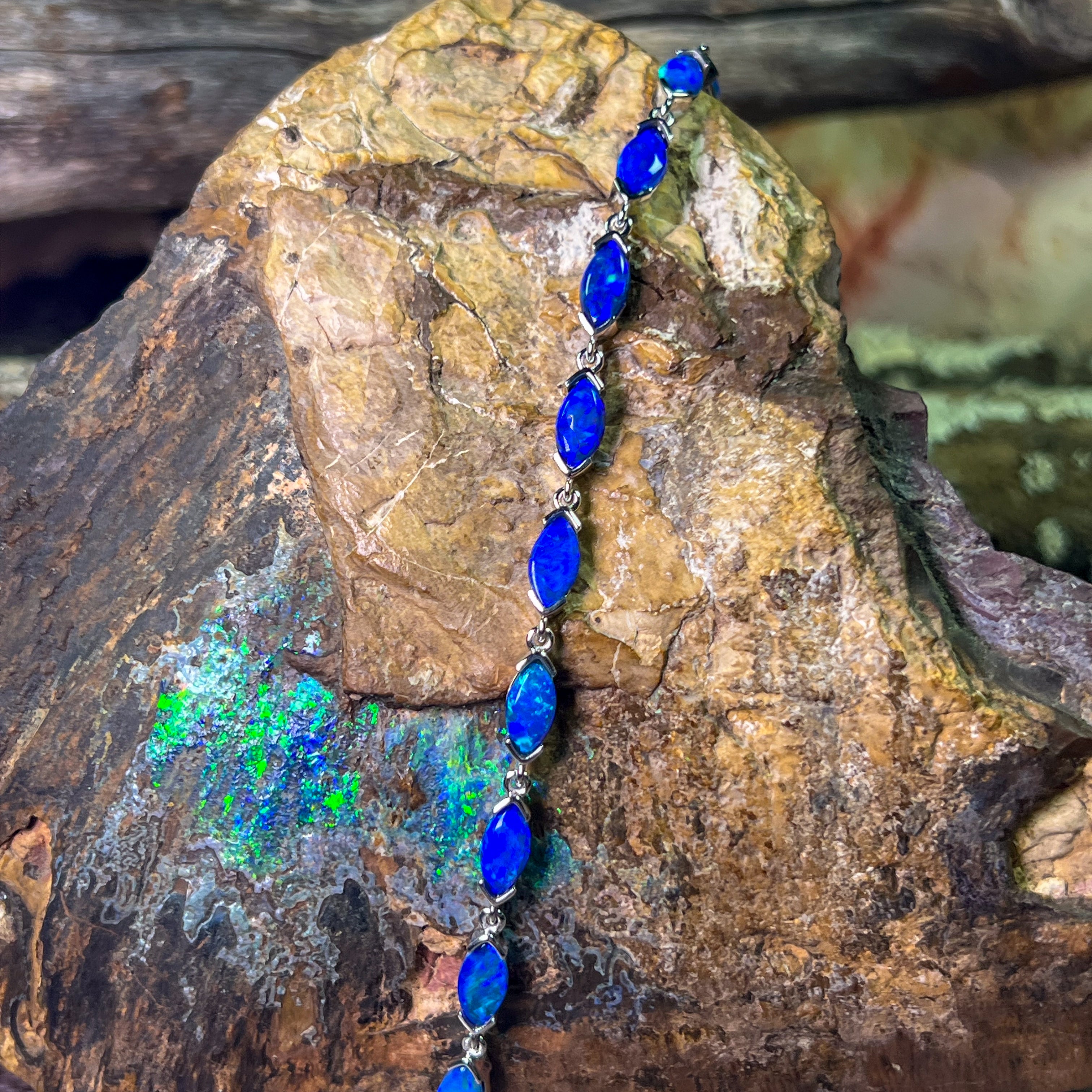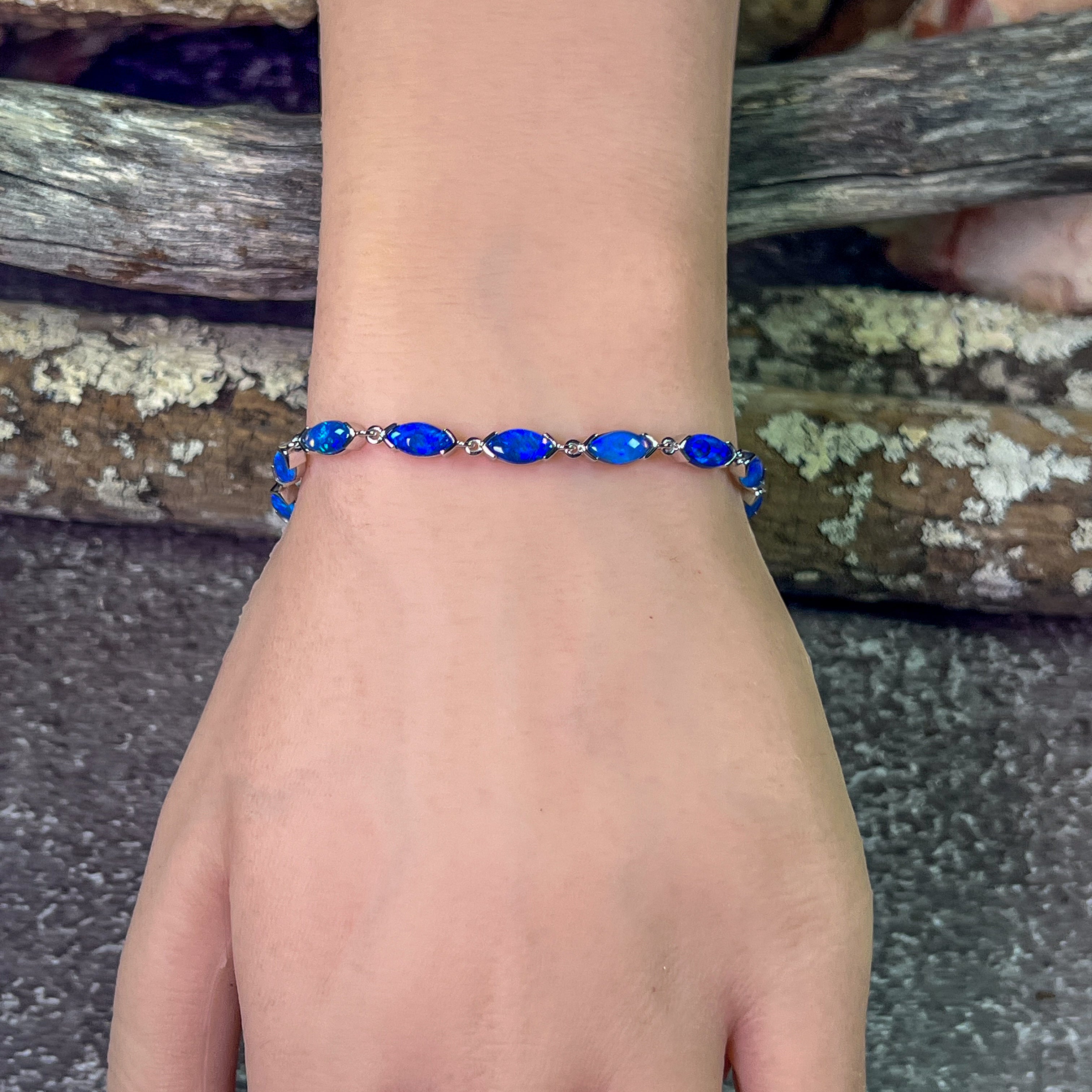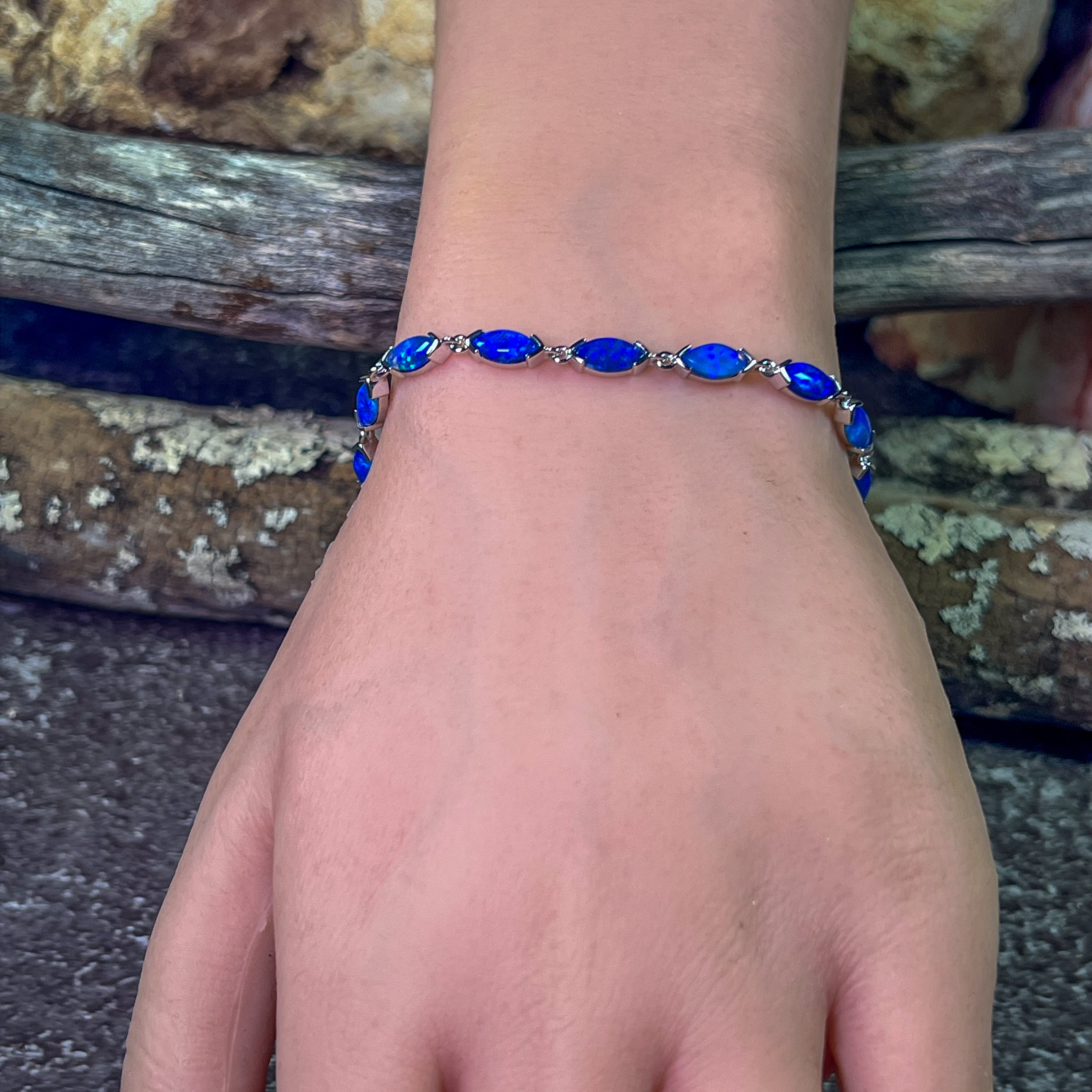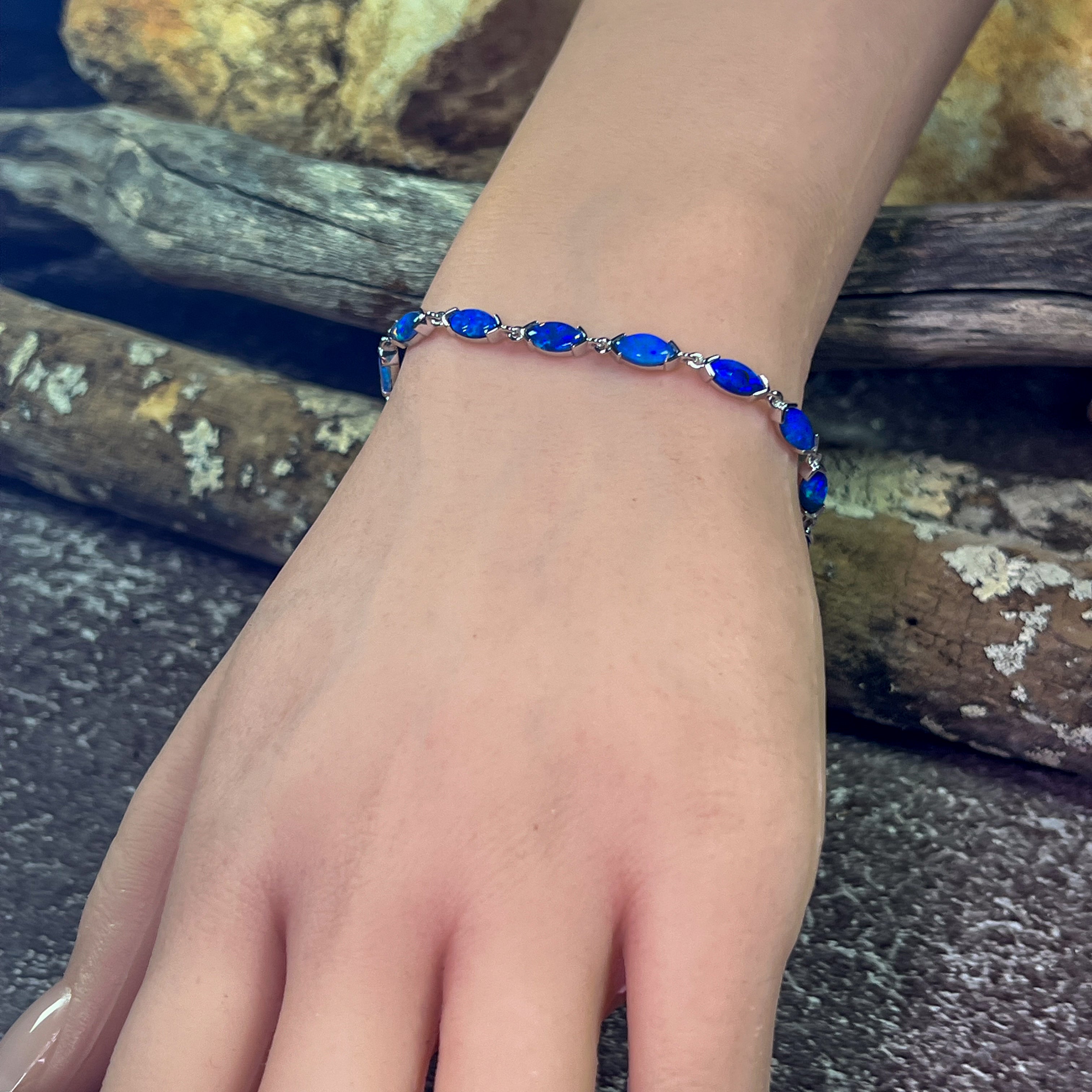 Expertly crafted with 9kt white gold, this delicate bracelet features marquise-shaped light opals with a striking blue hue. The closed backing ensures secure wearing, while the v-claw setting adds a touch of elegance. Adorn your wrist with fine opal jewelry that exudes sophistication and timeless beauty.