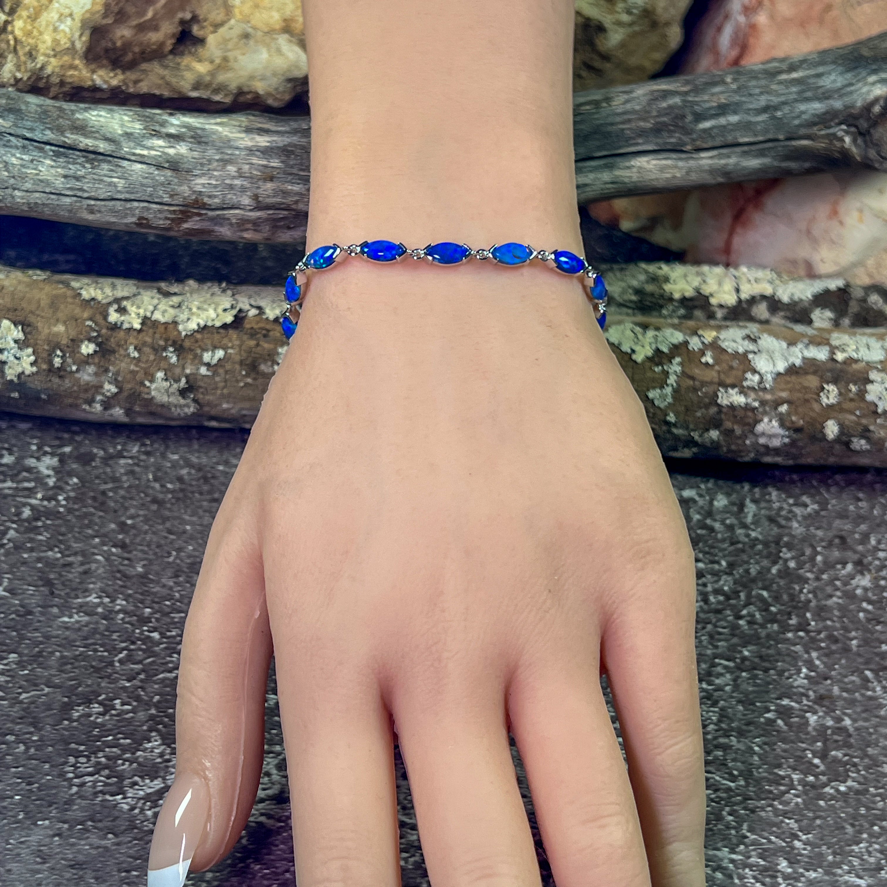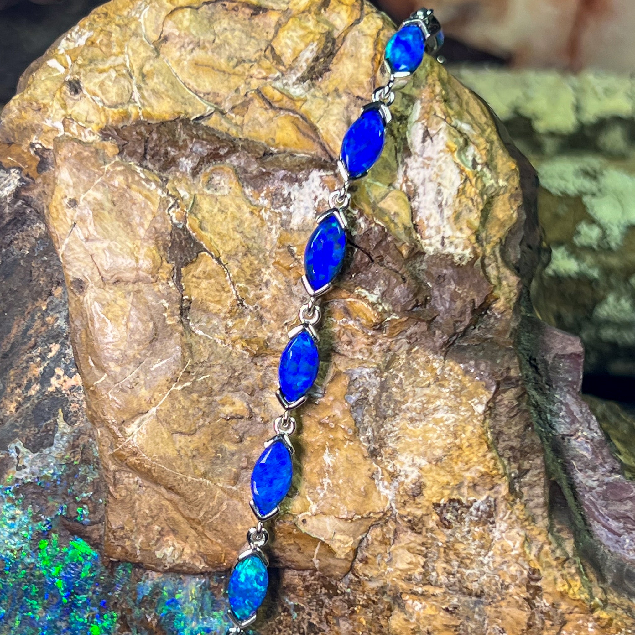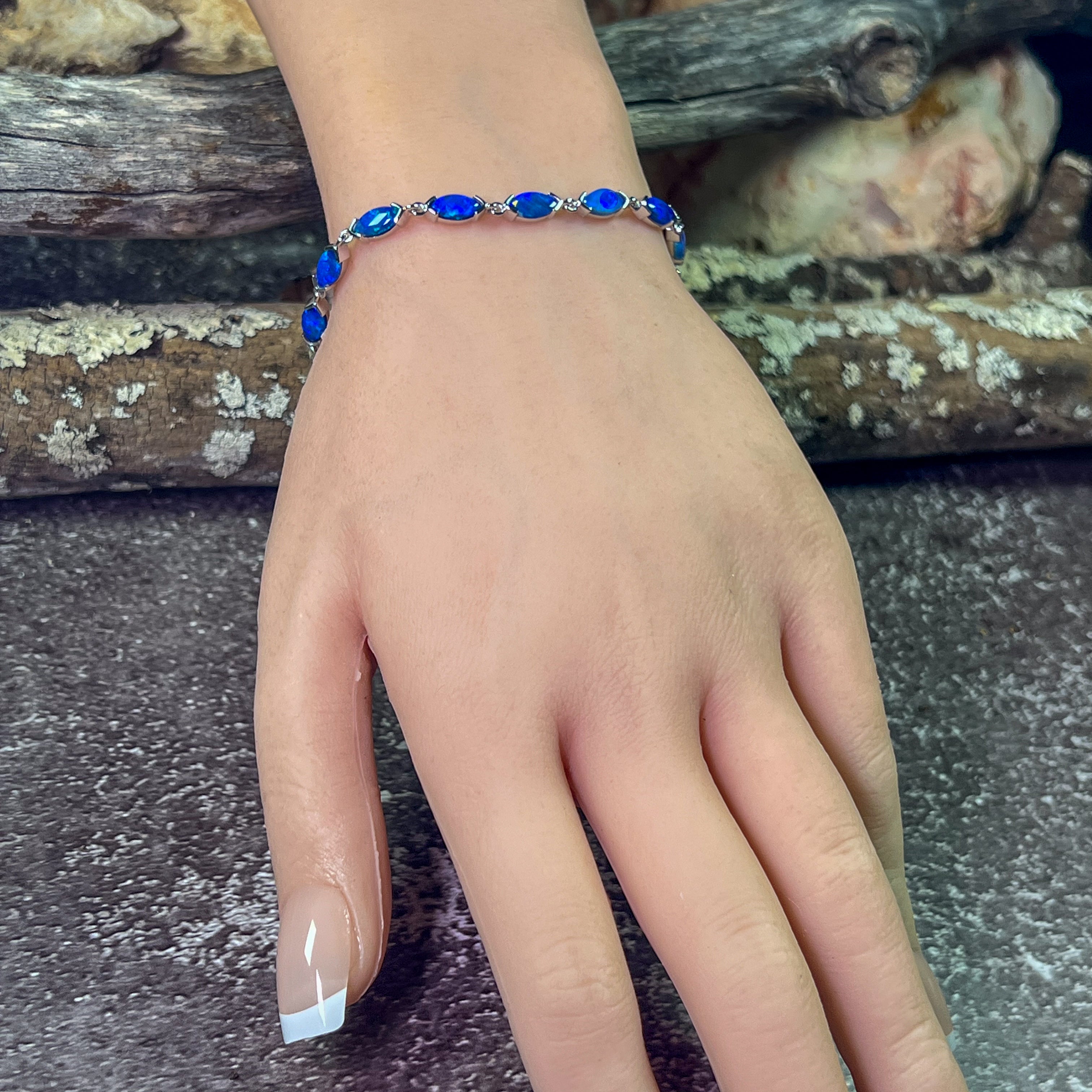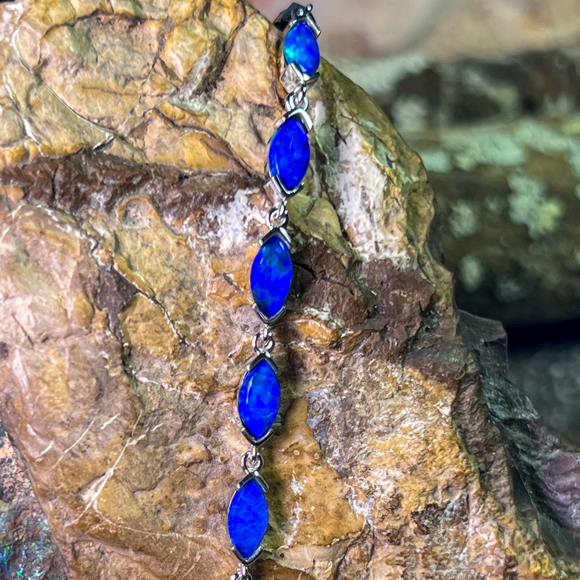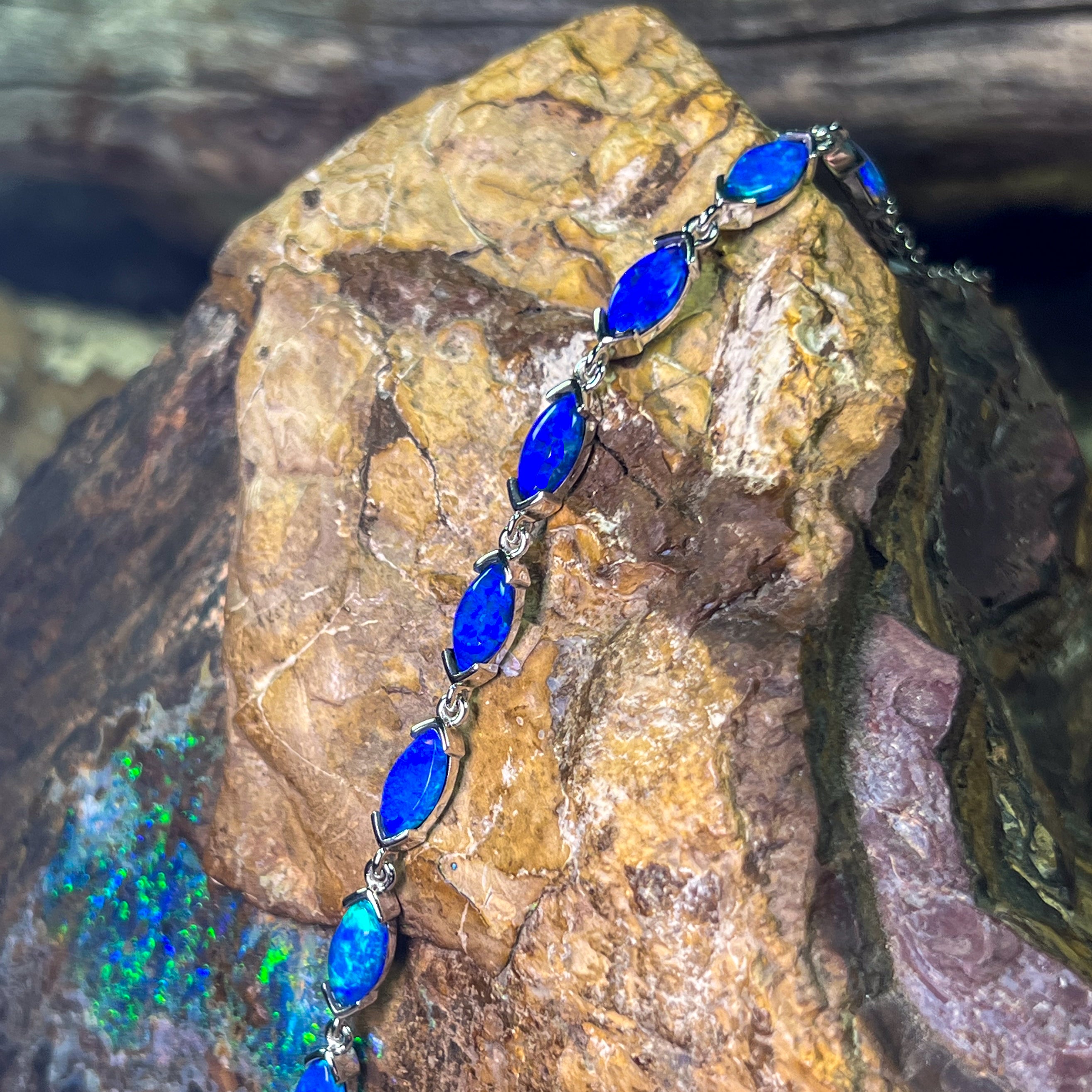 Expertly crafted with 9kt white gold, this delicate bracelet features marquise-shaped light opals with a striking blue hue. The closed backing ensures secure wearing, while the v-claw setting adds a touch of elegance. Adorn your wrist with fine opal jewelry that exudes sophistication and timeless beauty.