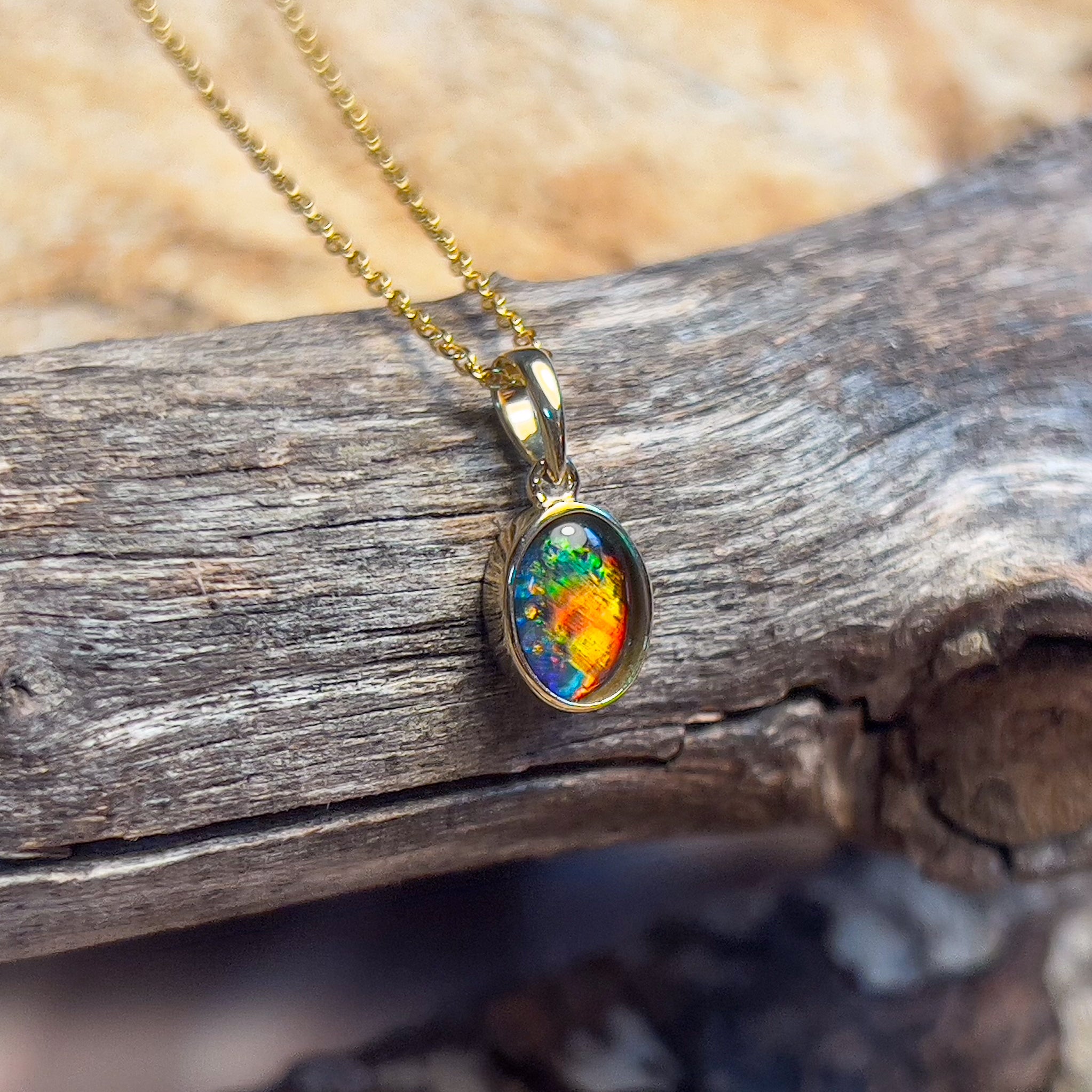 Add a touch of elegance to your jewelry collection with our 9kt Yellow Gold Opal Triplet Pendant. The 9x7mm bezel set opal triplet adds a pop of color and the gold chain creates a classic and timeless look. Hand-crafted with care and sophistication, this necklace is perfect for any occasion.