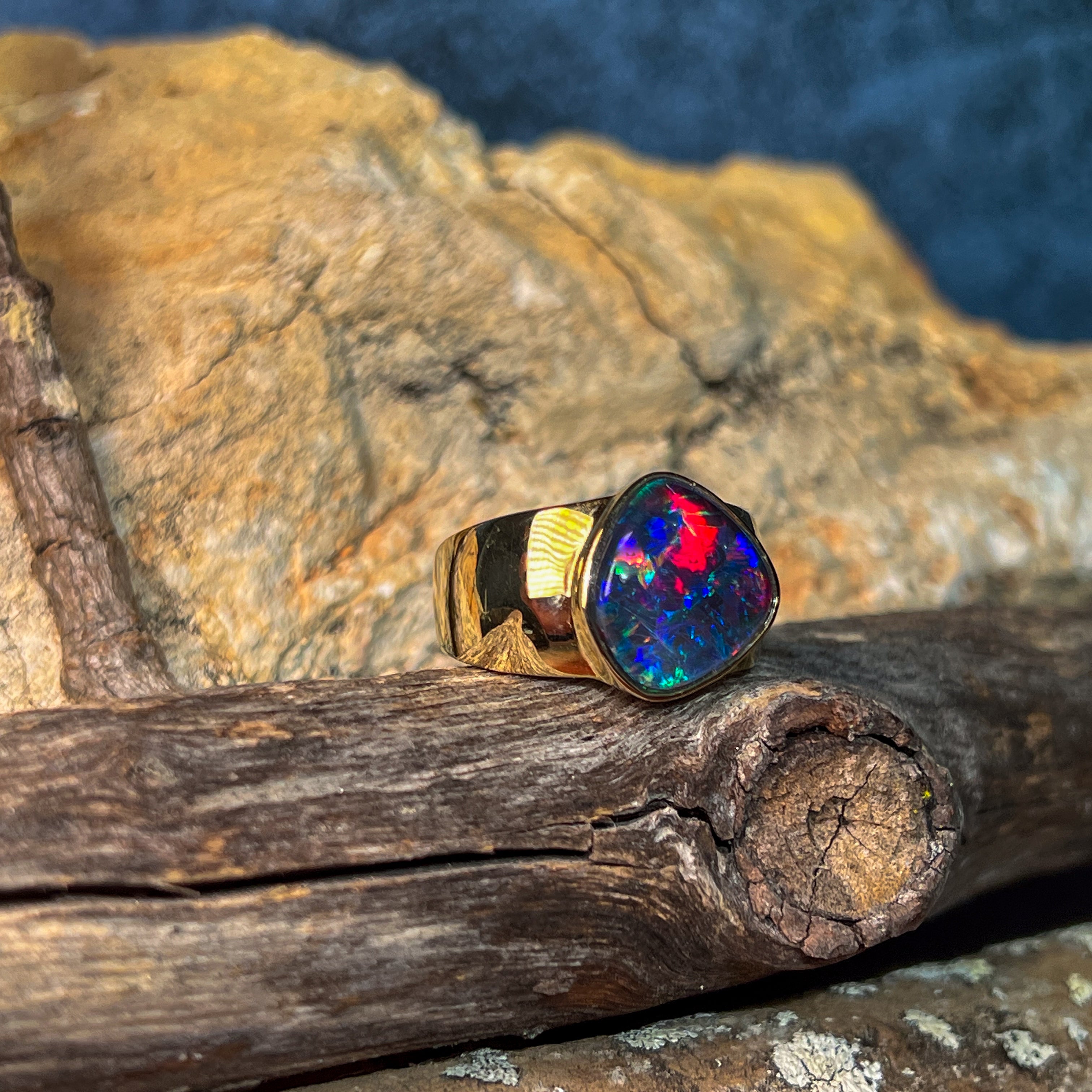 Elevate your style with this 9kt Yellow Gold Freeform Opal Triplet men's ring, designed in a classic signet style. Its bold yet timeless silhouette makes a confident statement, while the unique freeform opal triplet adds vibrant color and depth. Crafted to complement any look, this ring offers lasting elegance and a distinctive edge for the modern gentleman.