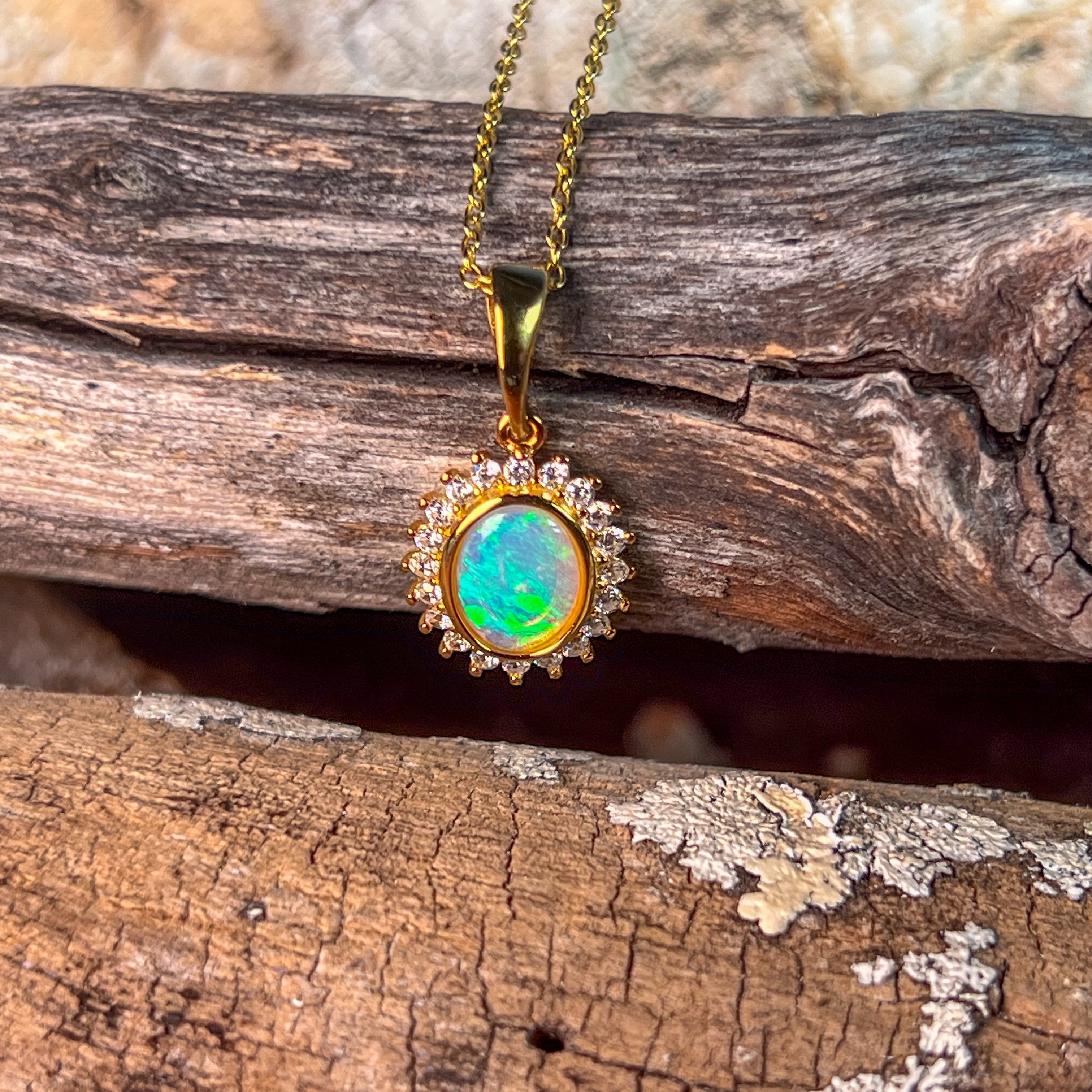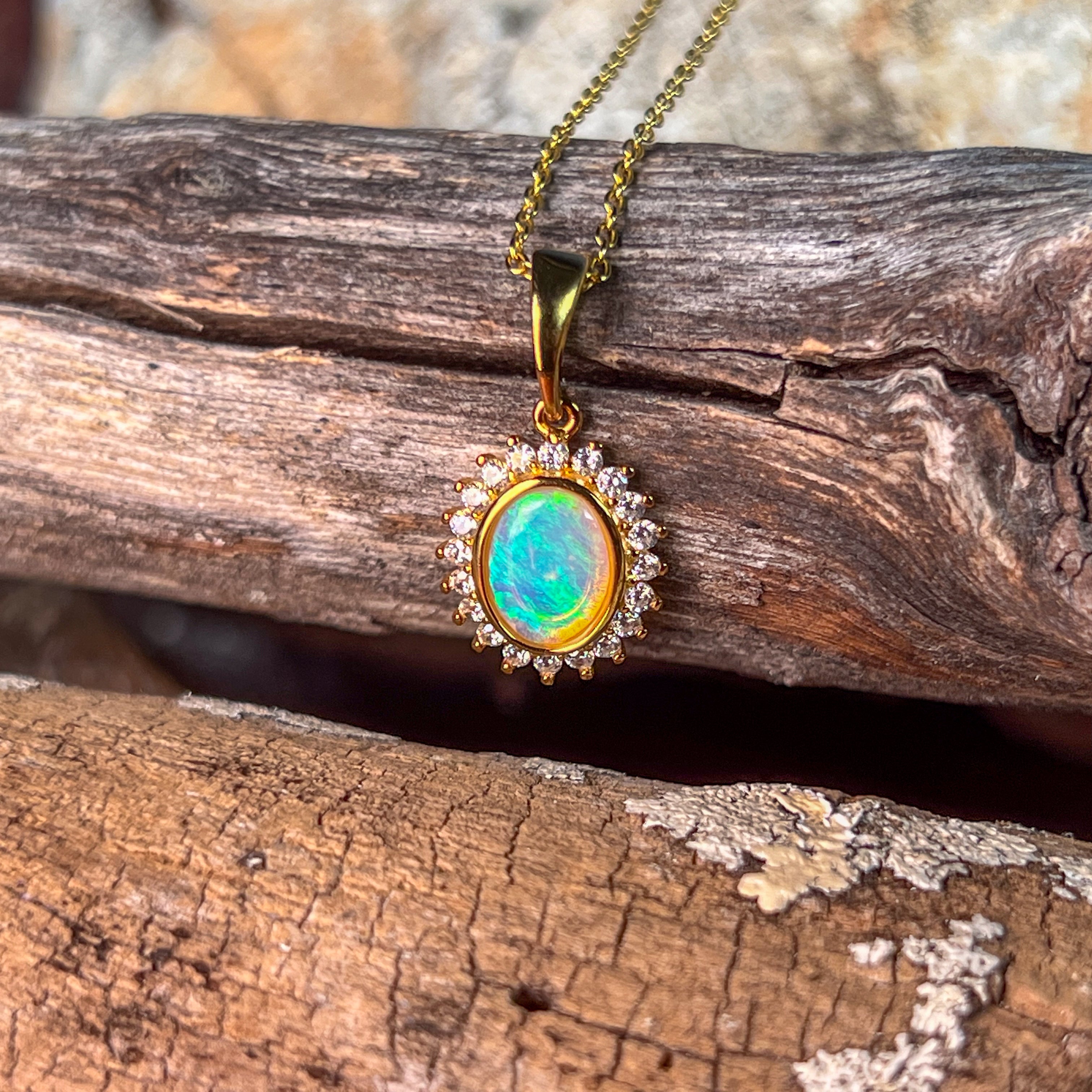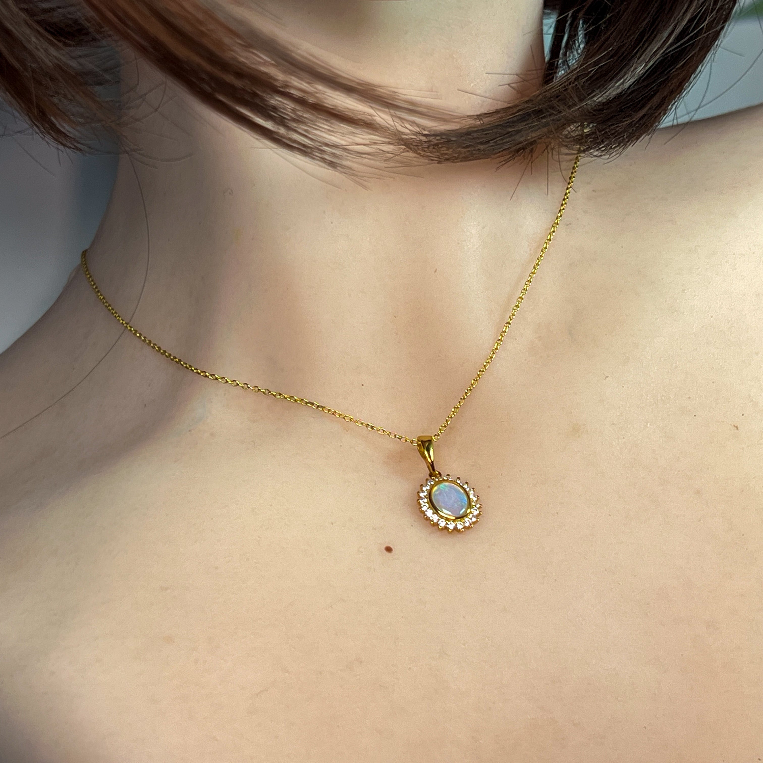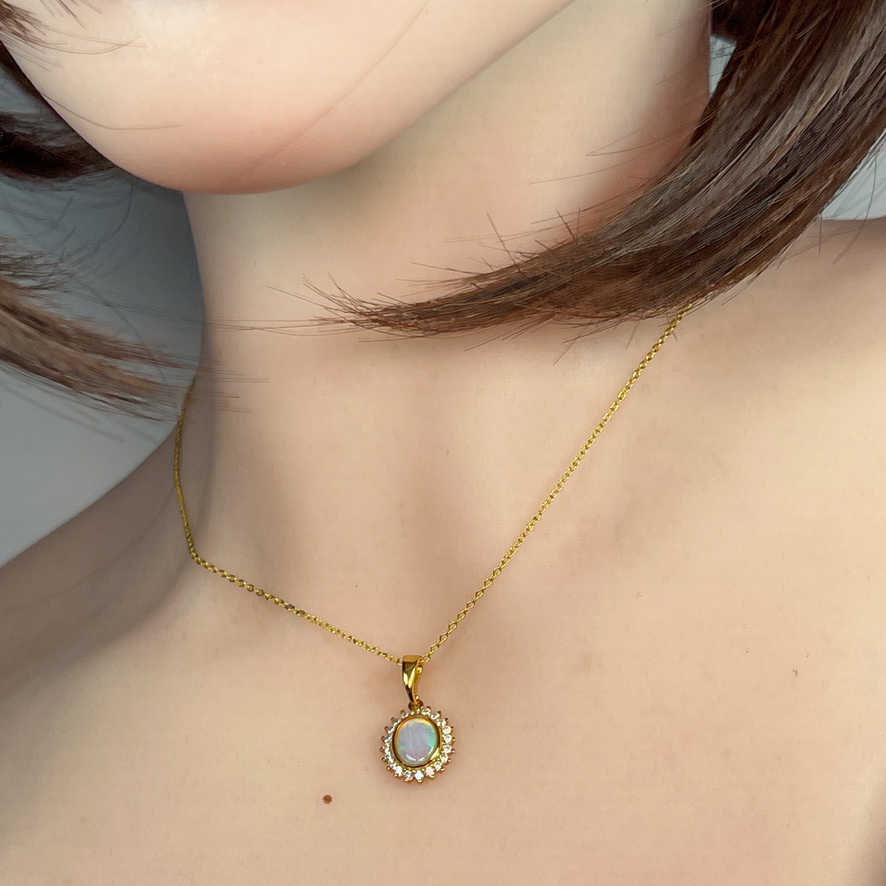 This delicate gold-plated sterling silver pendant features a charming 8x6mm oval opal surrounded by a subtle cluster design. Its dainty size and elegant shimmer make it perfect for adding a touch of refined color and sparkle to any outfit, effortlessly enhancing your everyday look or special occasion ensemble.