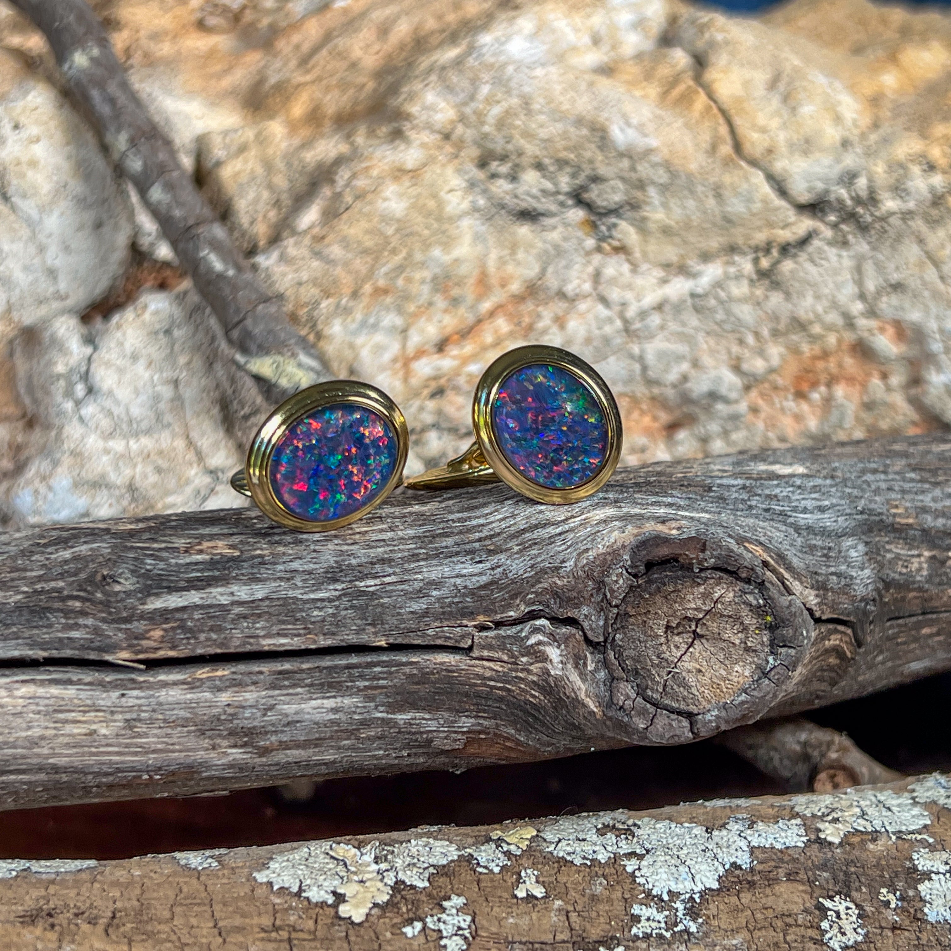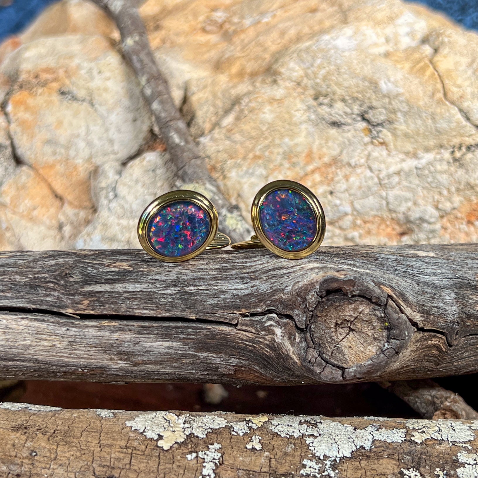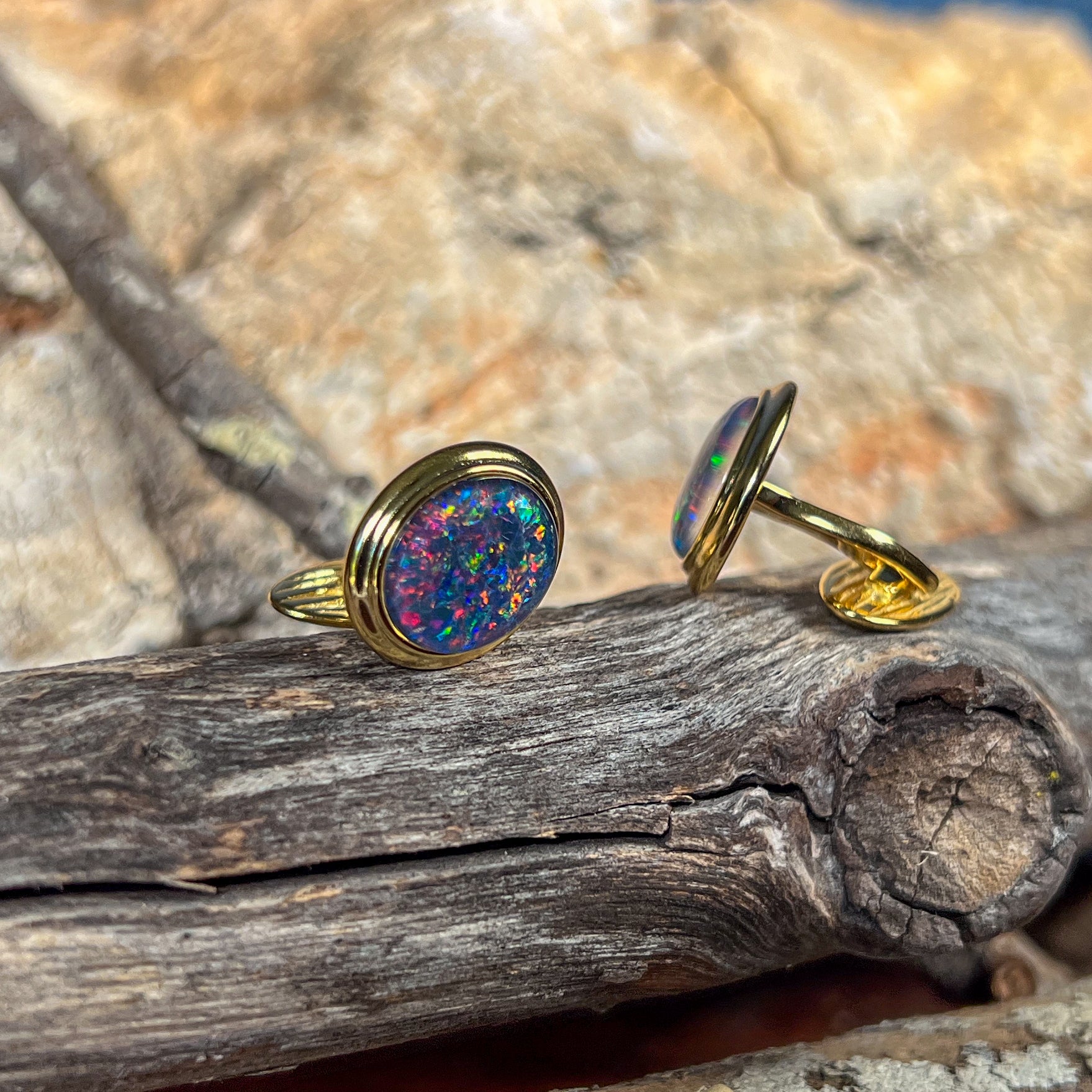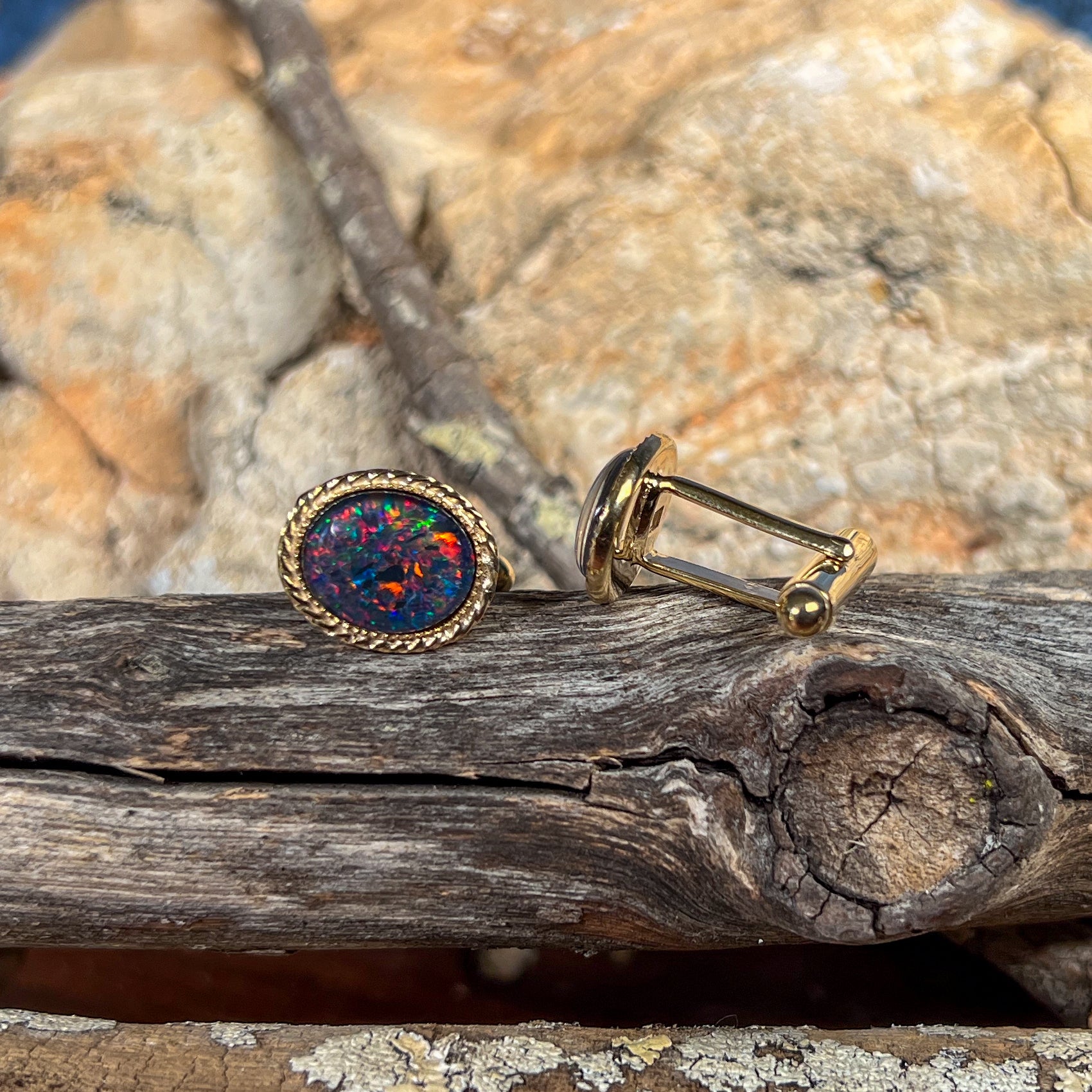 Elevate your style with these Gold Plated Silver cufflinks featuring 12x10mm opal triplets set in a secure bezel. Their timeless design combines classic elegance with vibrant opal hues, making them the perfect accessory to enhance any formal outfit with a refined touch. Durable and eye-catching, these cufflinks offer lasting sophistication for special occasions or daily wear.