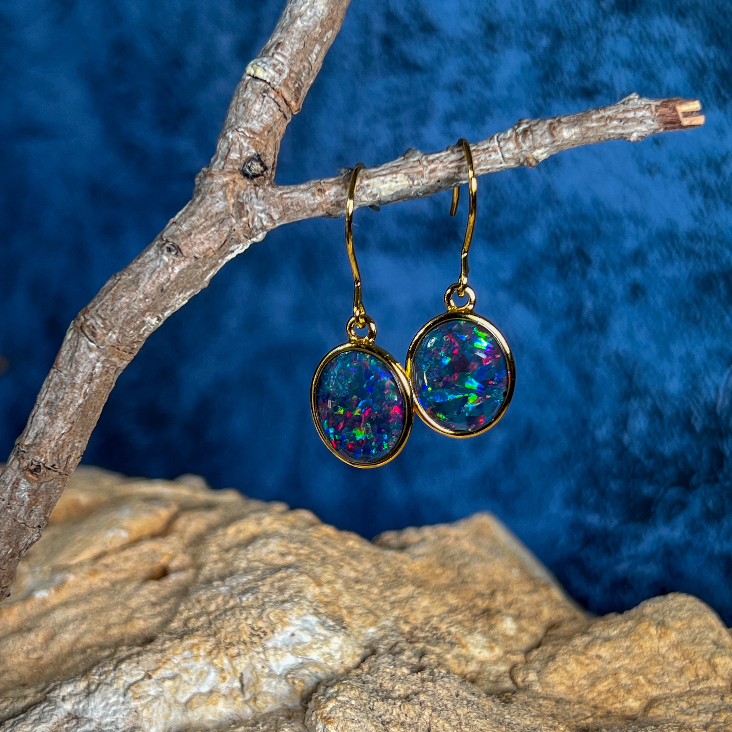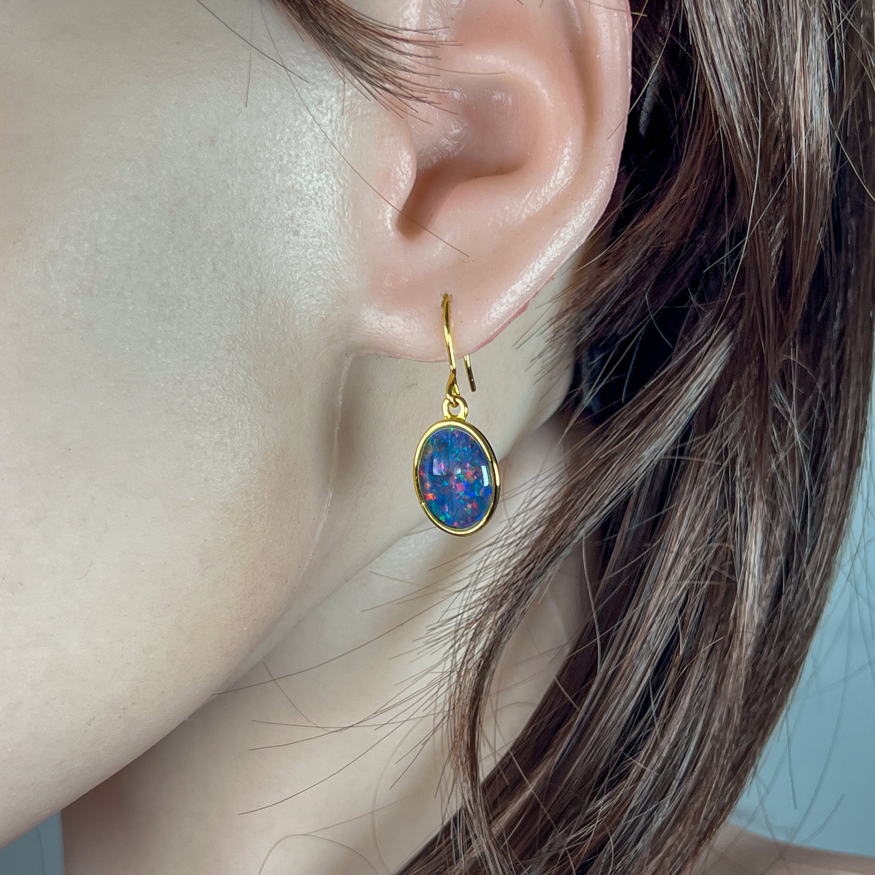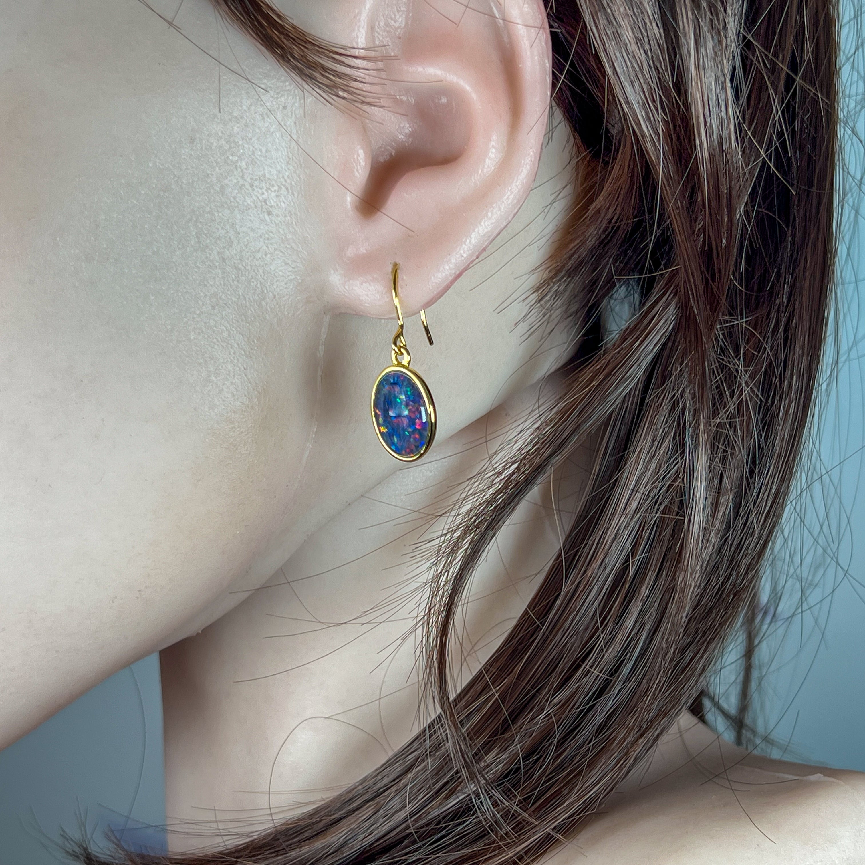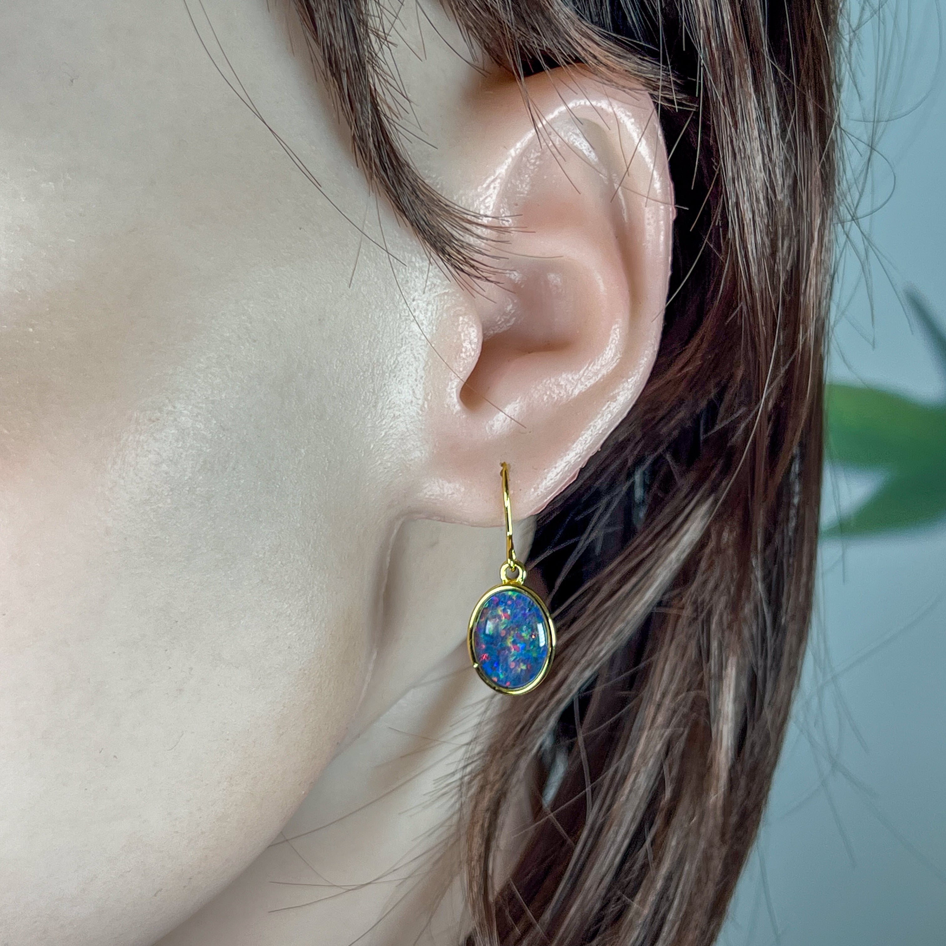 Elevate your style with these Gold Plated Silver 14x10mm Opal Triplet bezel dangling hook earrings. Featuring large, captivating opal drops set in a secure bezel, they offer both elegance and durability. Perfect for adding a touch of sophisticated color and shimmer to any outfit, these earrings combine timeless design with eye-catching sparkle. Ideal for special occasions or daily wear, they effortlessly enhance your look with graceful motion and radiant charm.