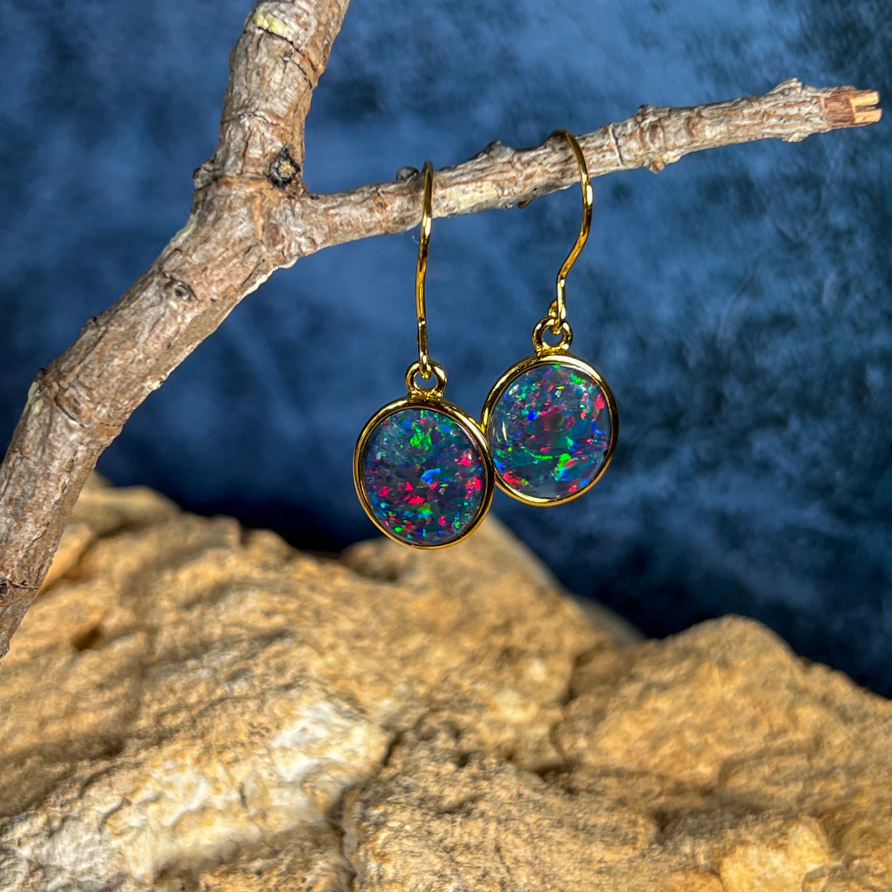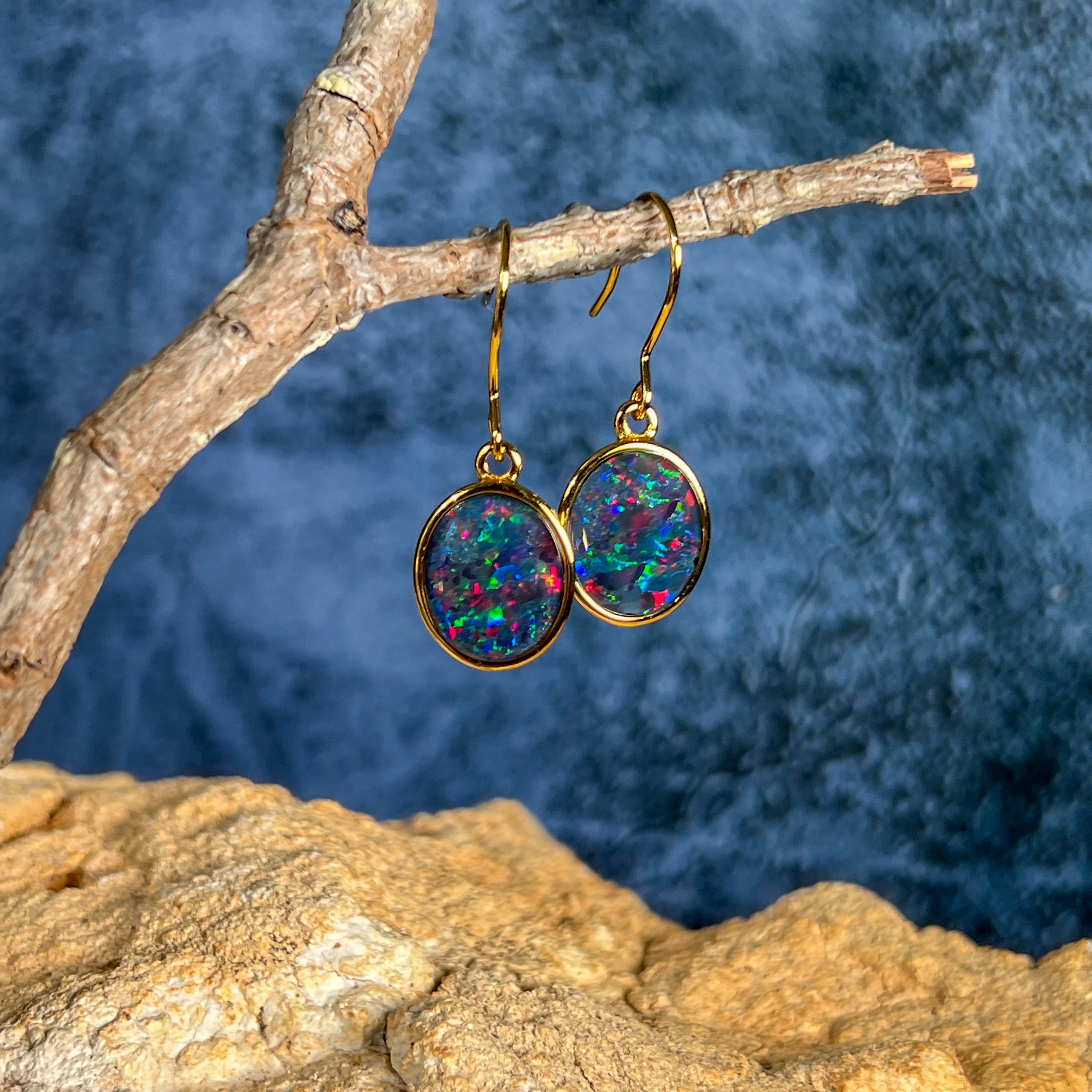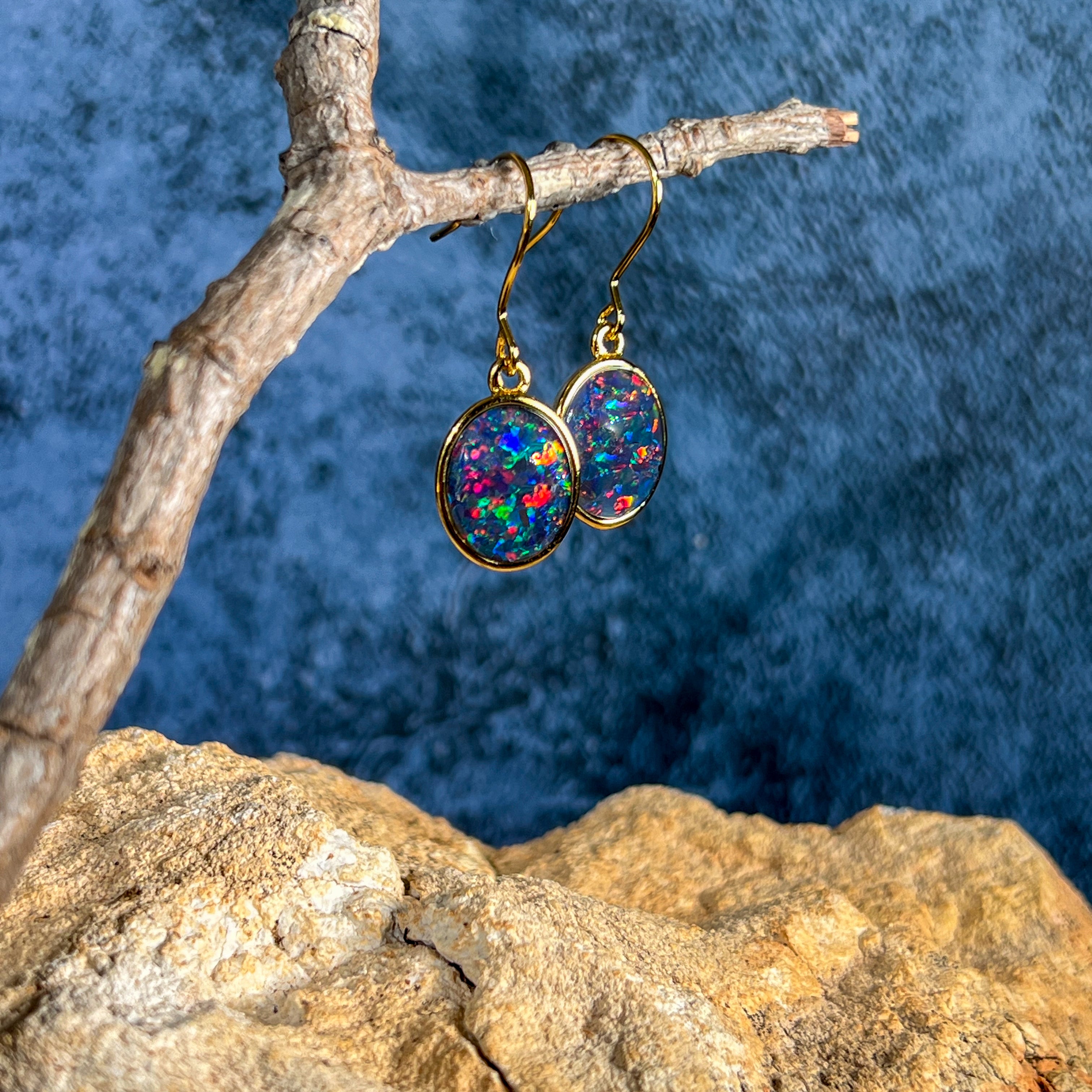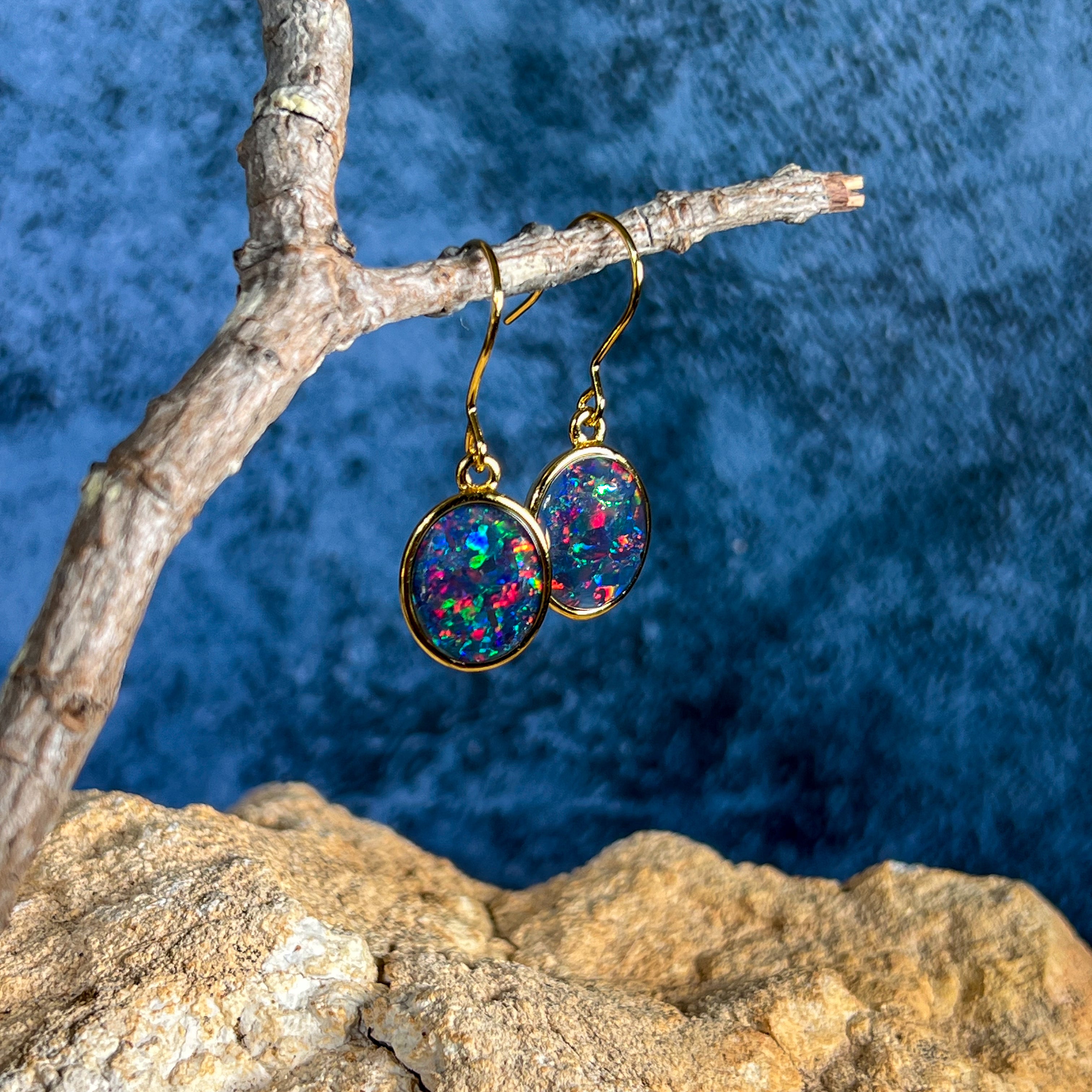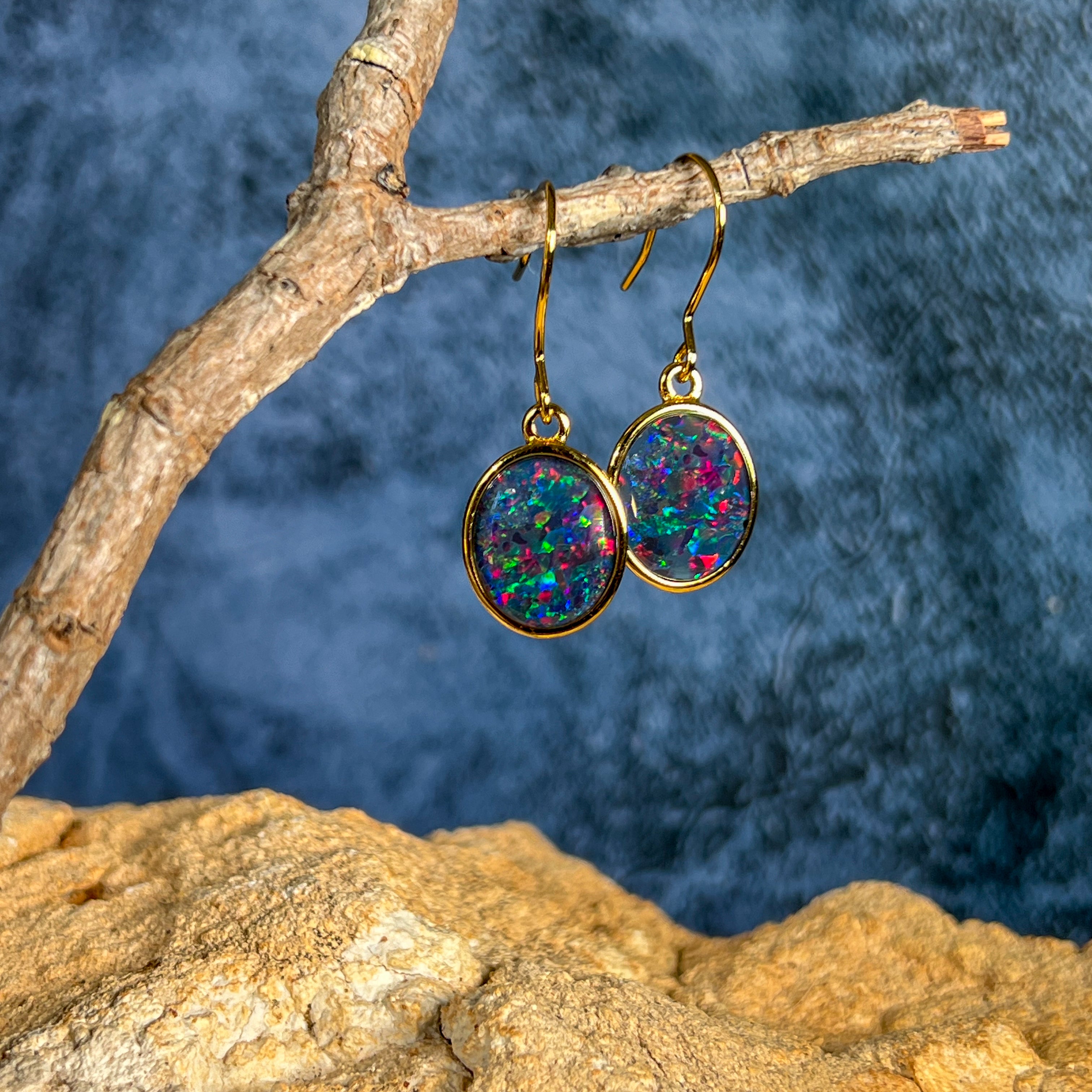 Elevate your style with these Gold Plated Silver 14x10mm Opal Triplet bezel dangling hook earrings. Featuring large, captivating opal drops set in a secure bezel, they offer both elegance and durability. Perfect for adding a touch of sophisticated color and shimmer to any outfit, these earrings combine timeless design with eye-catching sparkle. Ideal for special occasions or daily wear, they effortlessly enhance your look with graceful motion and radiant charm.