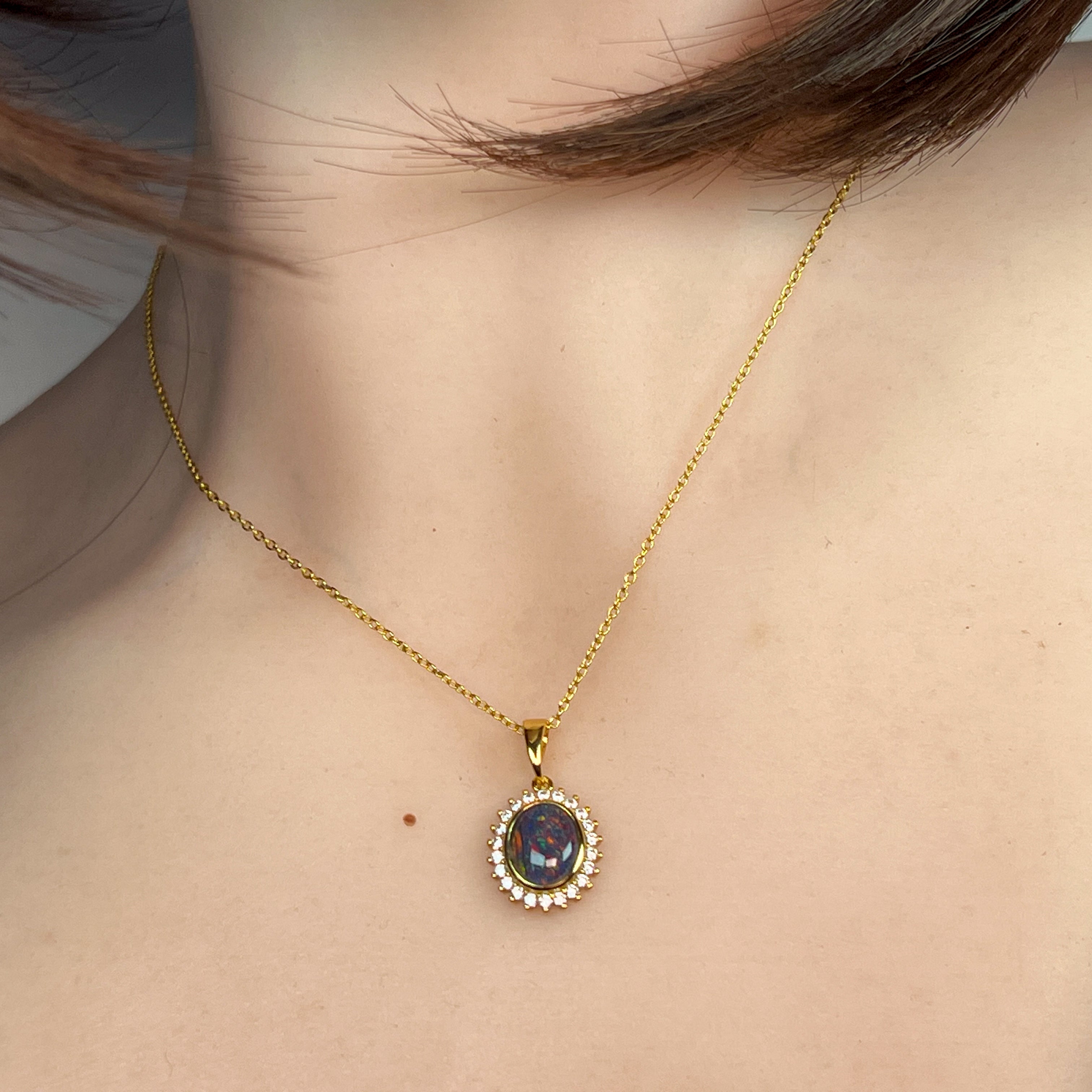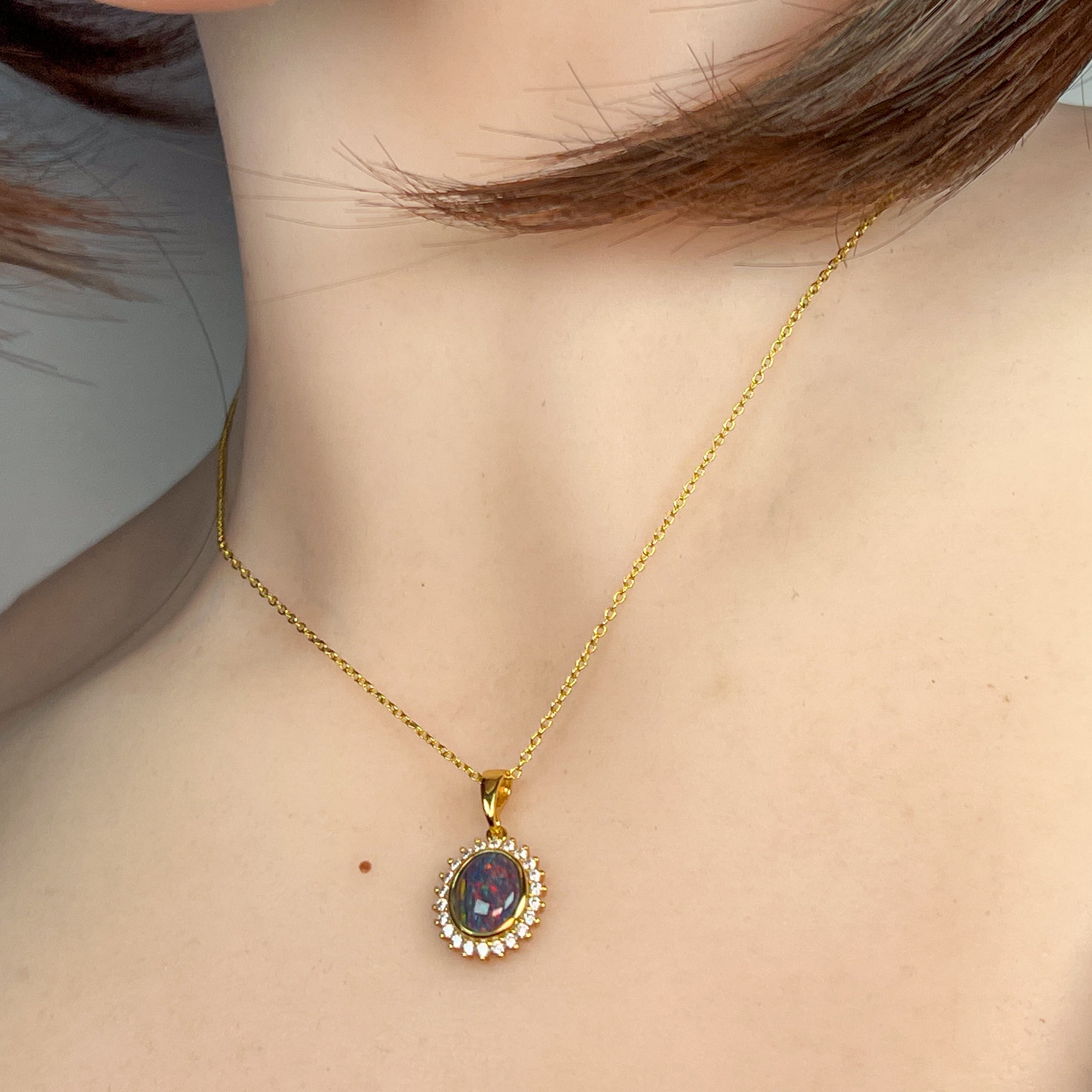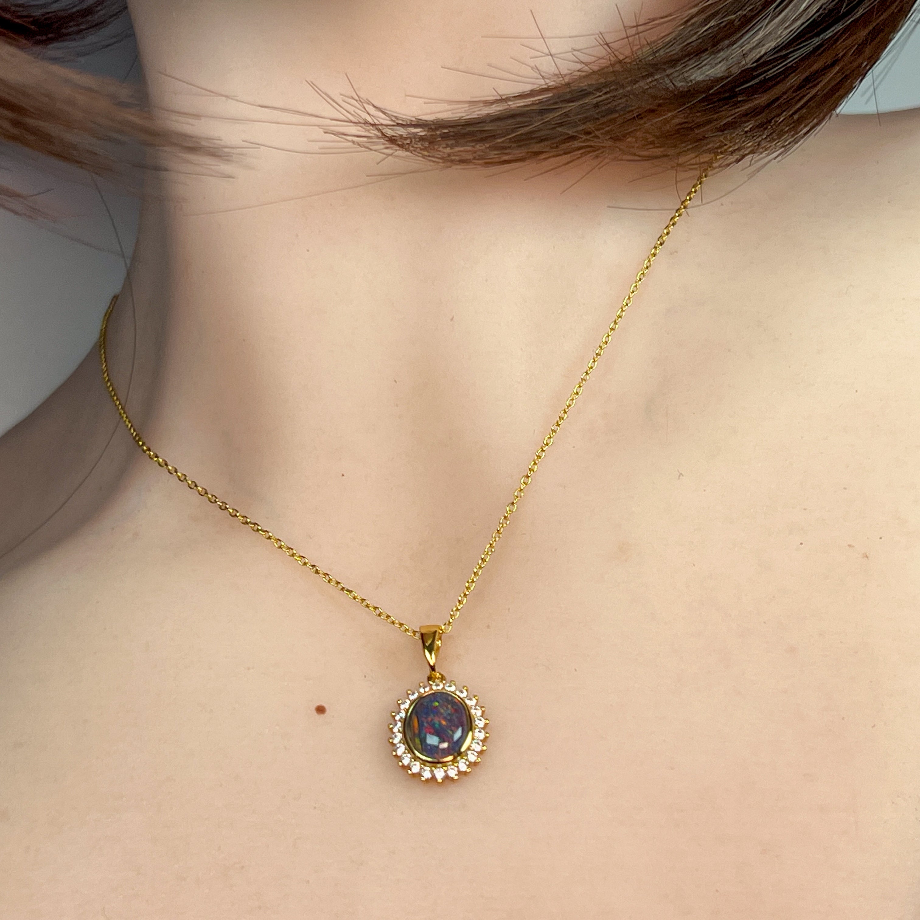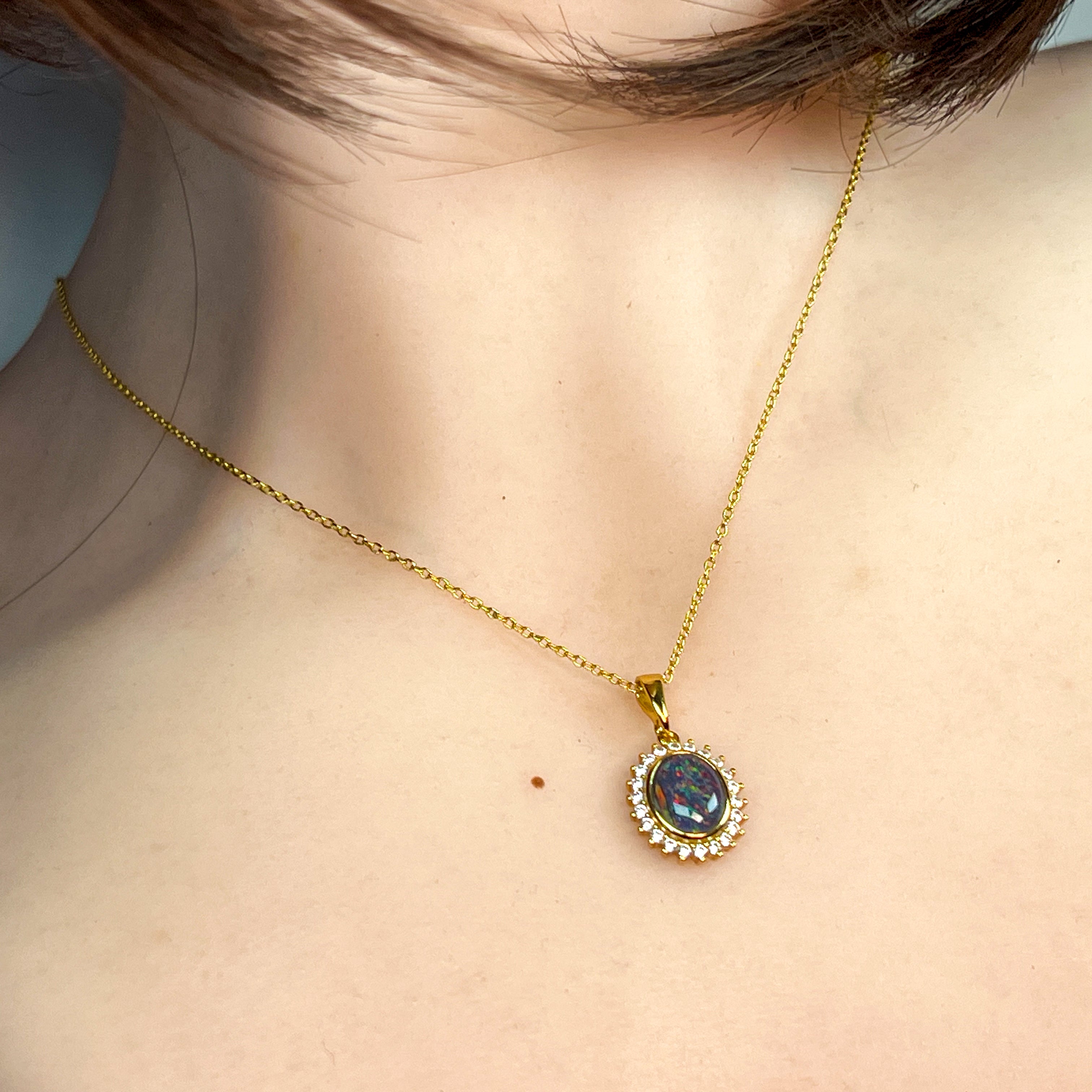 Elevate your elegance with this Gold Plated Silver bezel cluster pendant featuring a vibrant 9x7mm Opal triplet. Its classic design pairs timeless beauty with durability, making it perfect for everyday wear or special occasions. The bezel setting protects the opal while highlighting its fiery play of colors, ensuring you always shine with subtle sophistication.