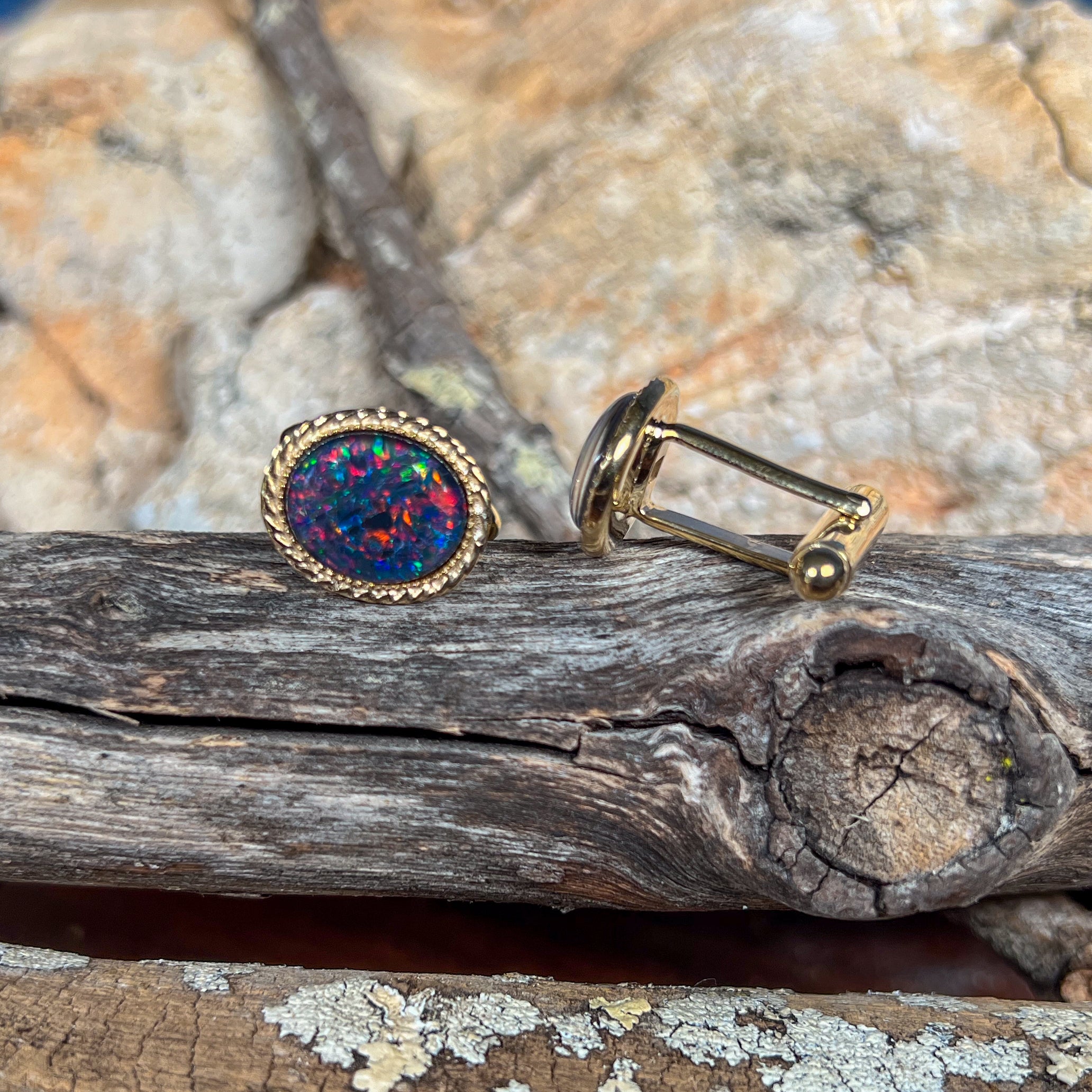 Elevate your style with these gold-plated silver cufflinks, featuring striking 12x10mm opal triplets. Their classic design combines timeless elegance with vibrant opal hues, perfect for adding a refined touch to any formal outfit. Durable silver craftsmanship with a rich gold finish ensures lasting sophistication and appeal. Ideal for special occasions or as a thoughtful gift, these cufflinks bring subtle luxury to your wardrobe.