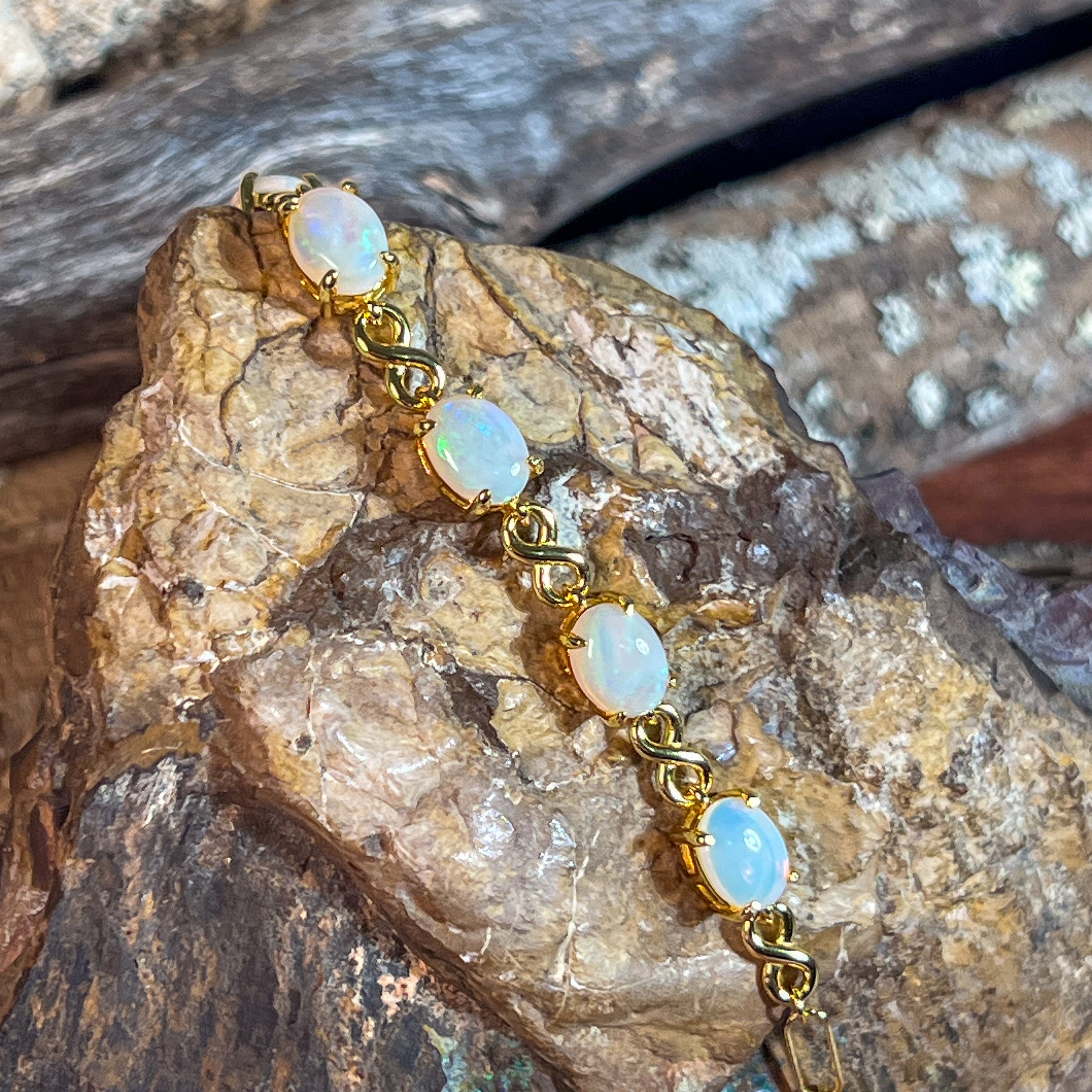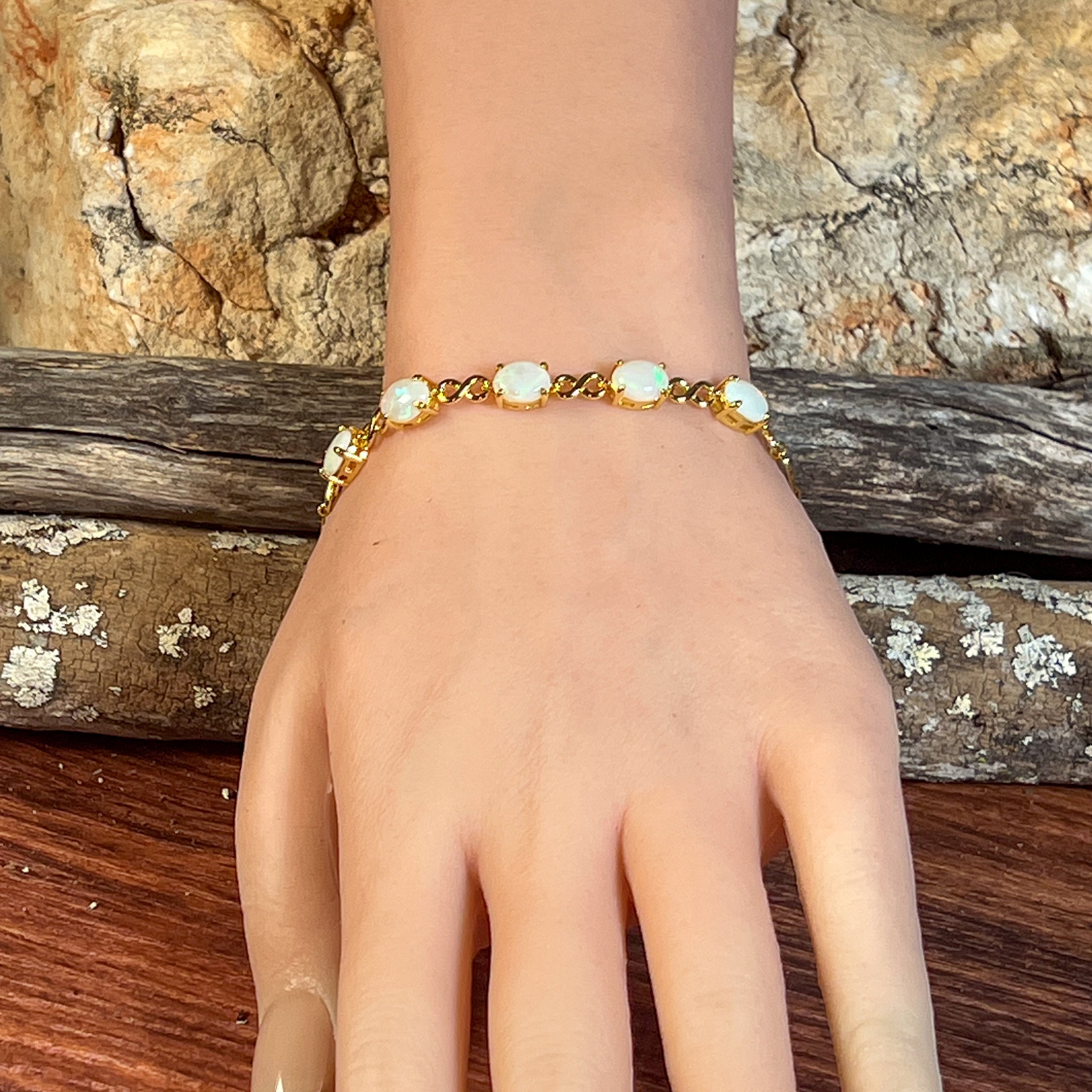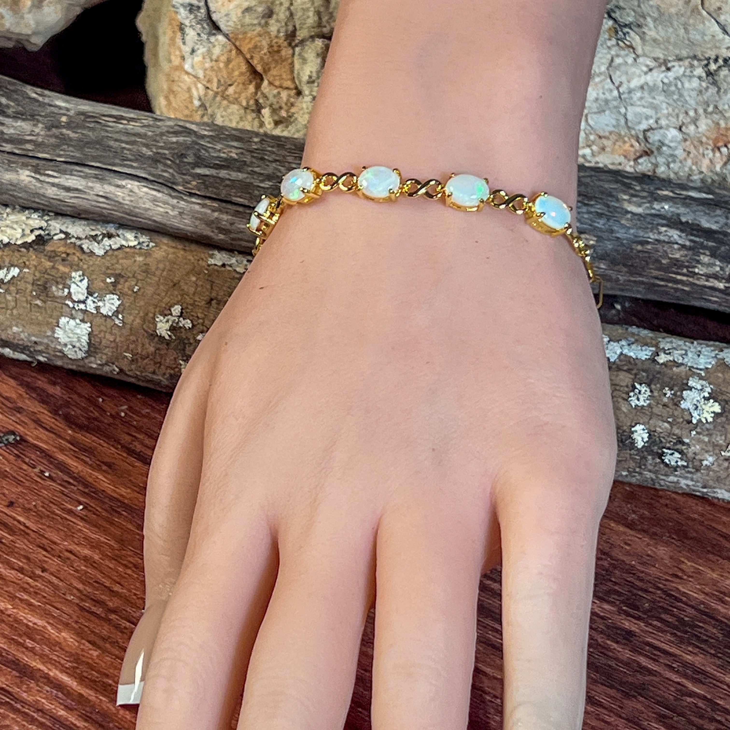 Elevate your style with this gold-plated silver bracelet featuring a sleek infinity design and a delicate 8x6mm light opal. Its modern elegance makes it perfect for everyday wear or special occasions, adding a subtle yet captivating shimmer to your wrist. Durable and timeless, this piece effortlessly complements any outfit while symbolizing endless possibilities.
