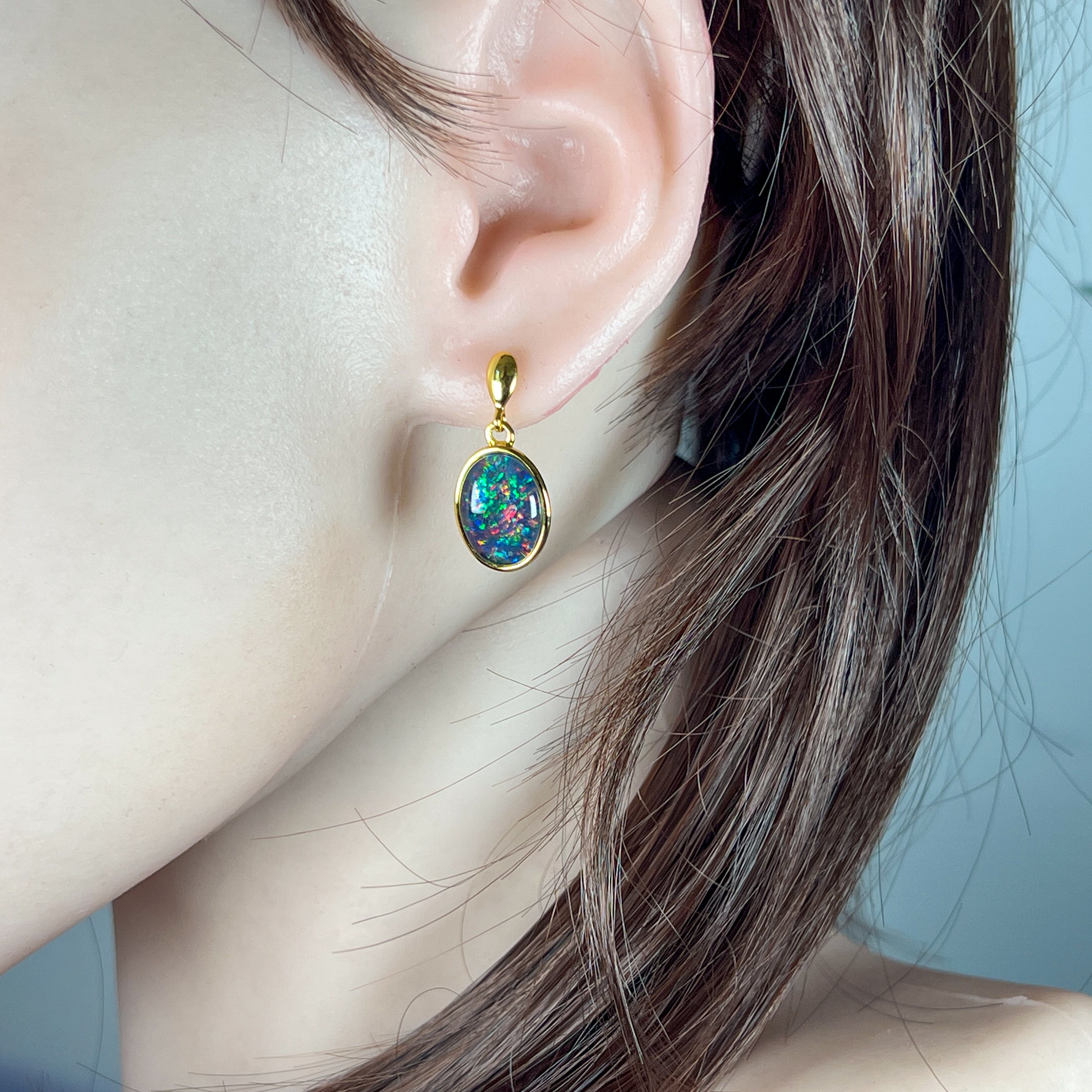 These gold-plated silver earrings feature a striking short drop design, showcasing 14x10mm opal triplets set securely in elegant bezels. Their vibrant play of colors adds sophisticated charm, perfect for elevating any outfit with a touch of refined beauty and timeless elegance.