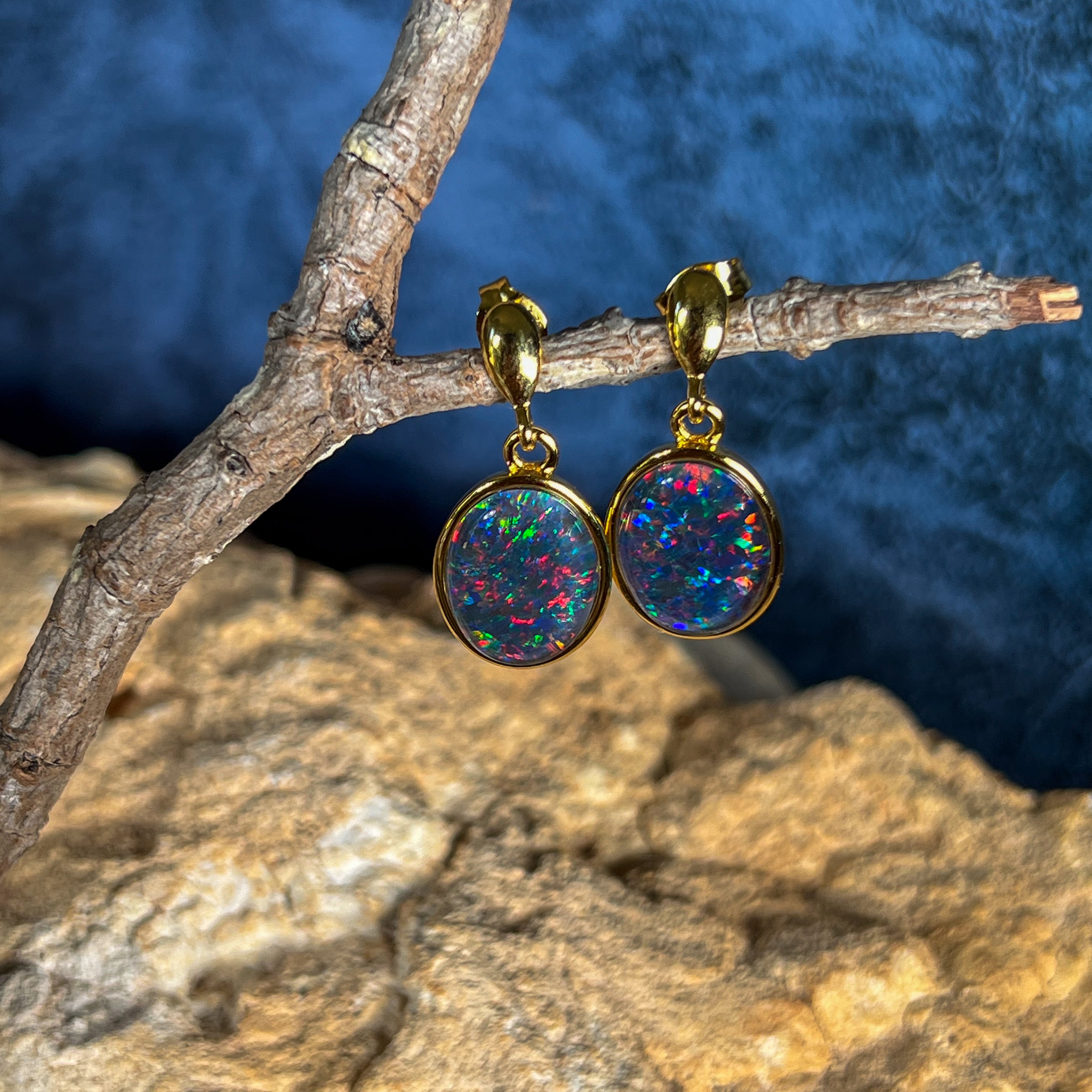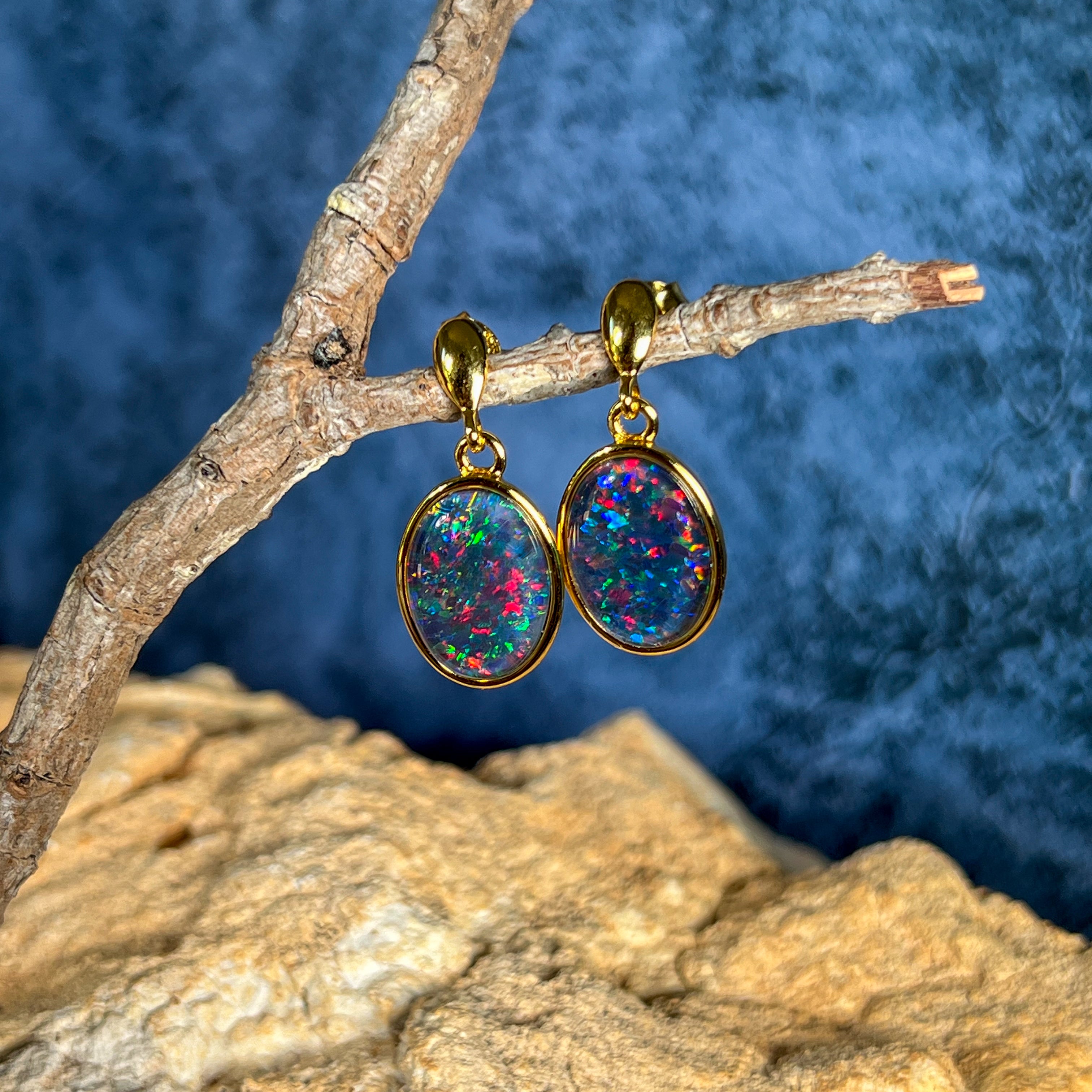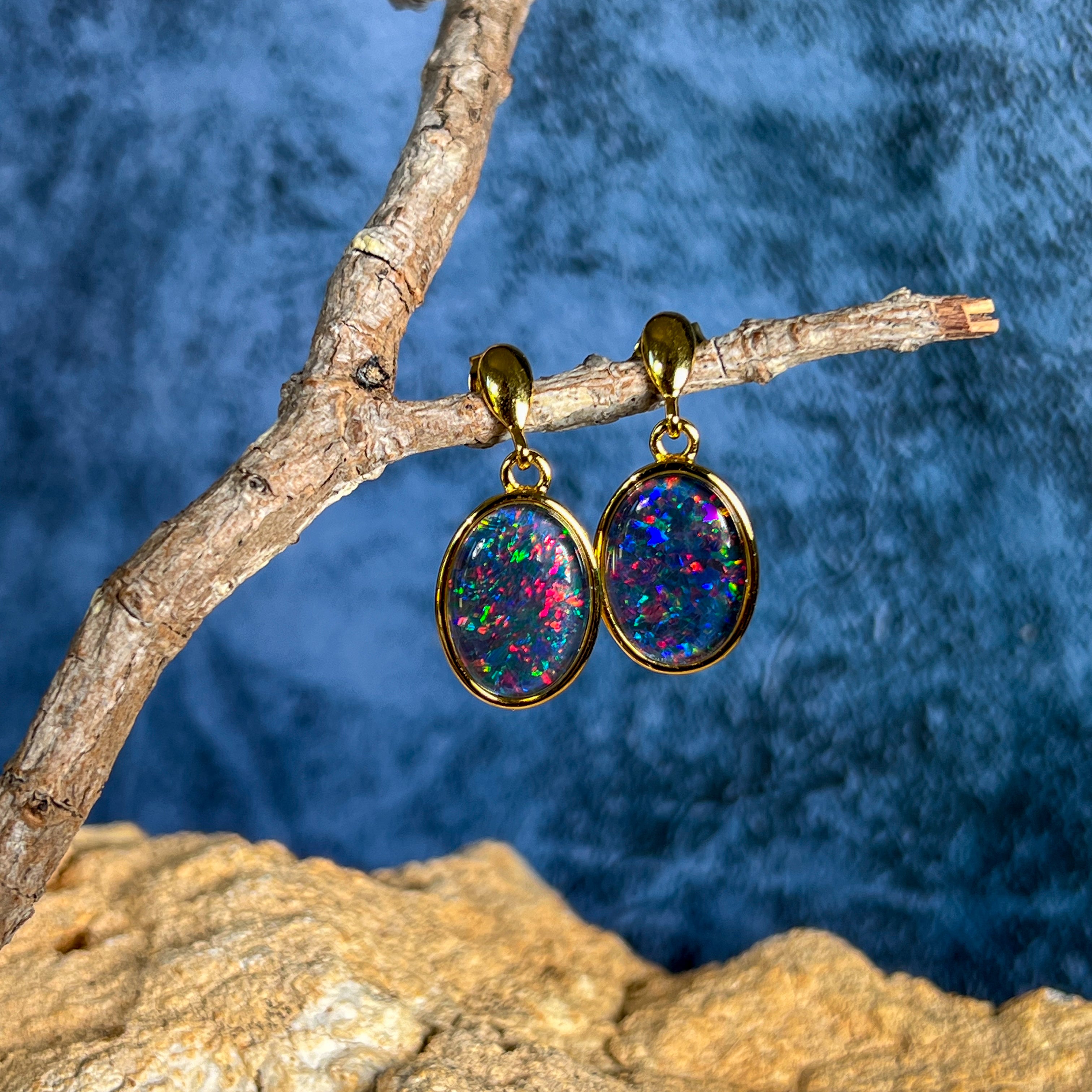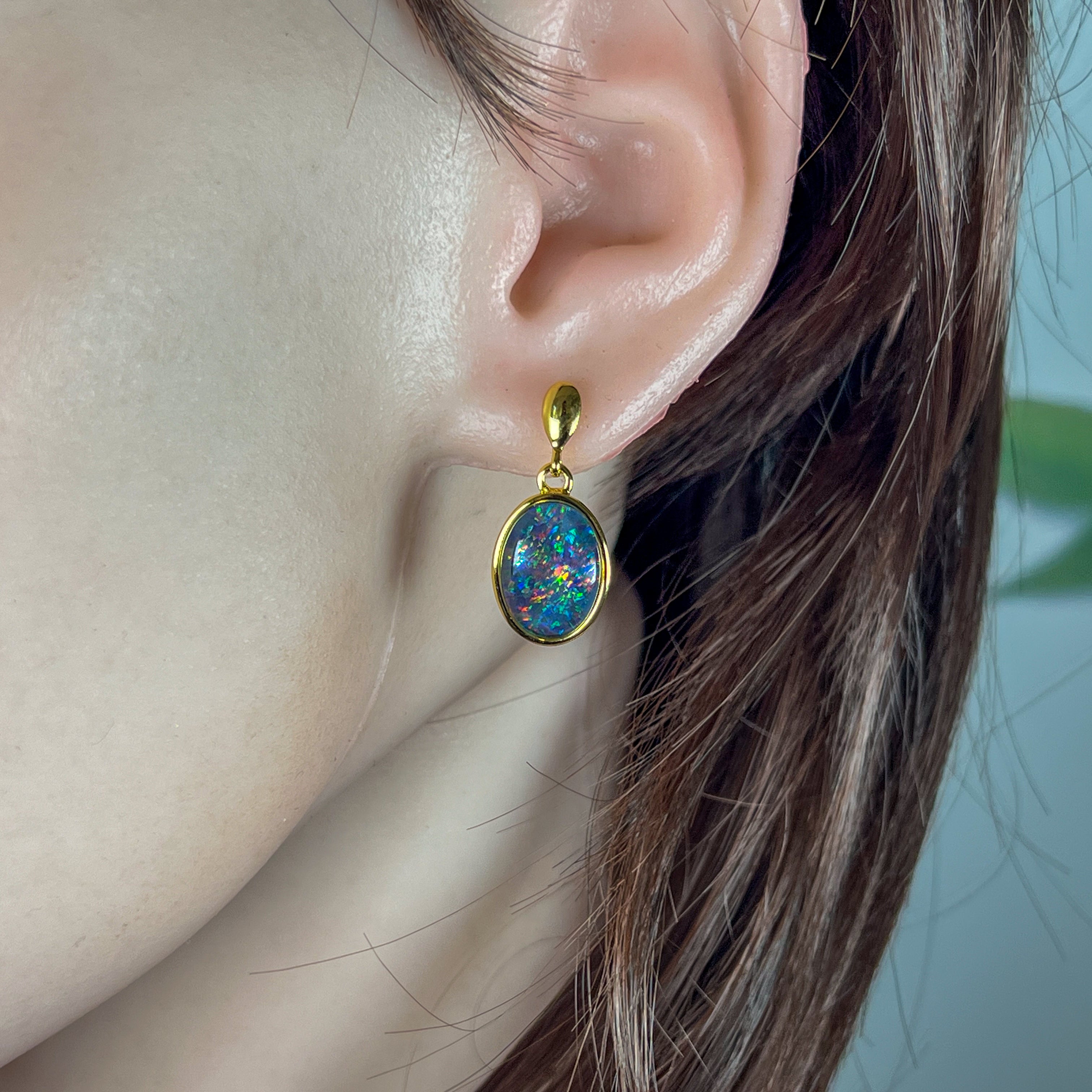 Gold Plated Silver short drop 14x10mm Opal triplet earrings bezel set