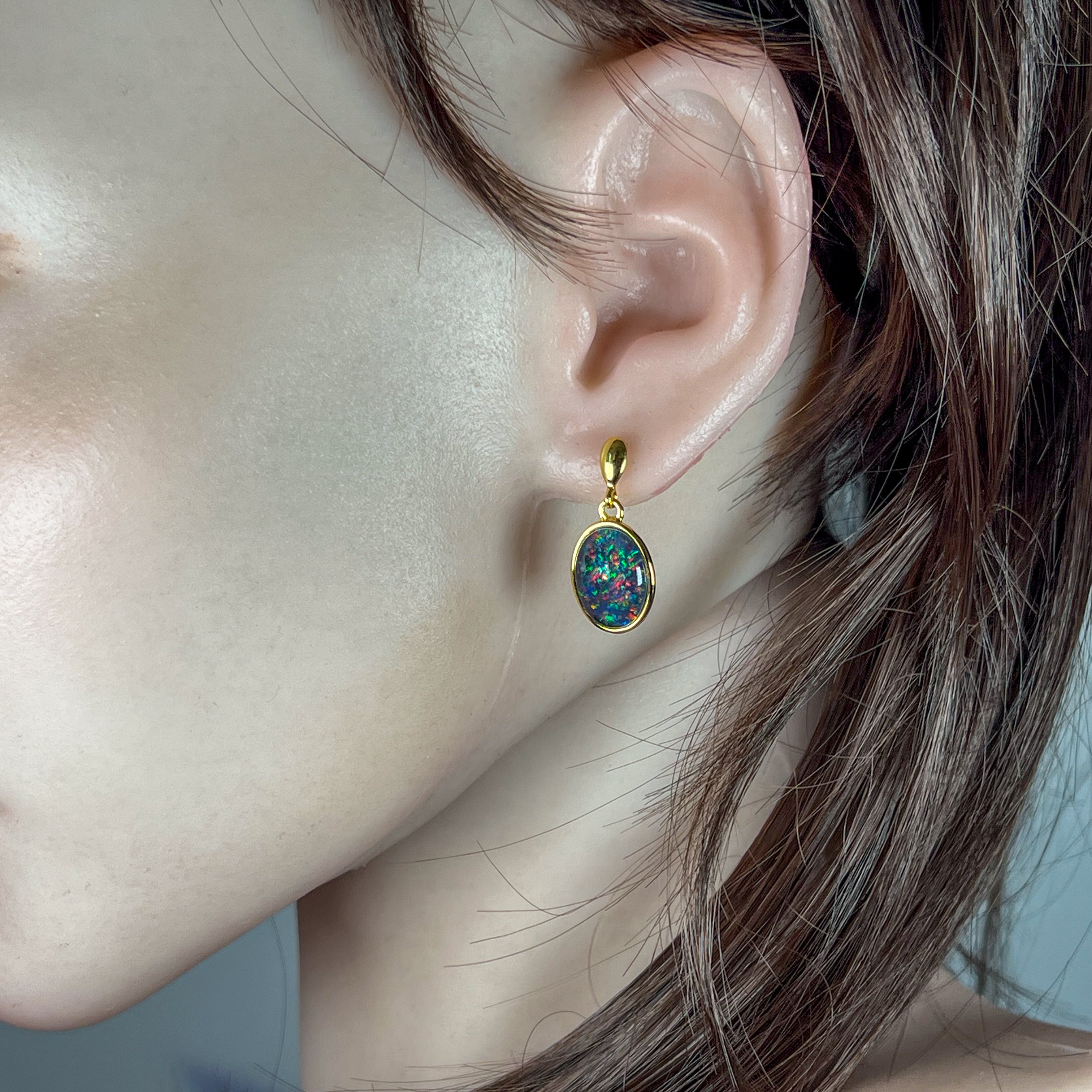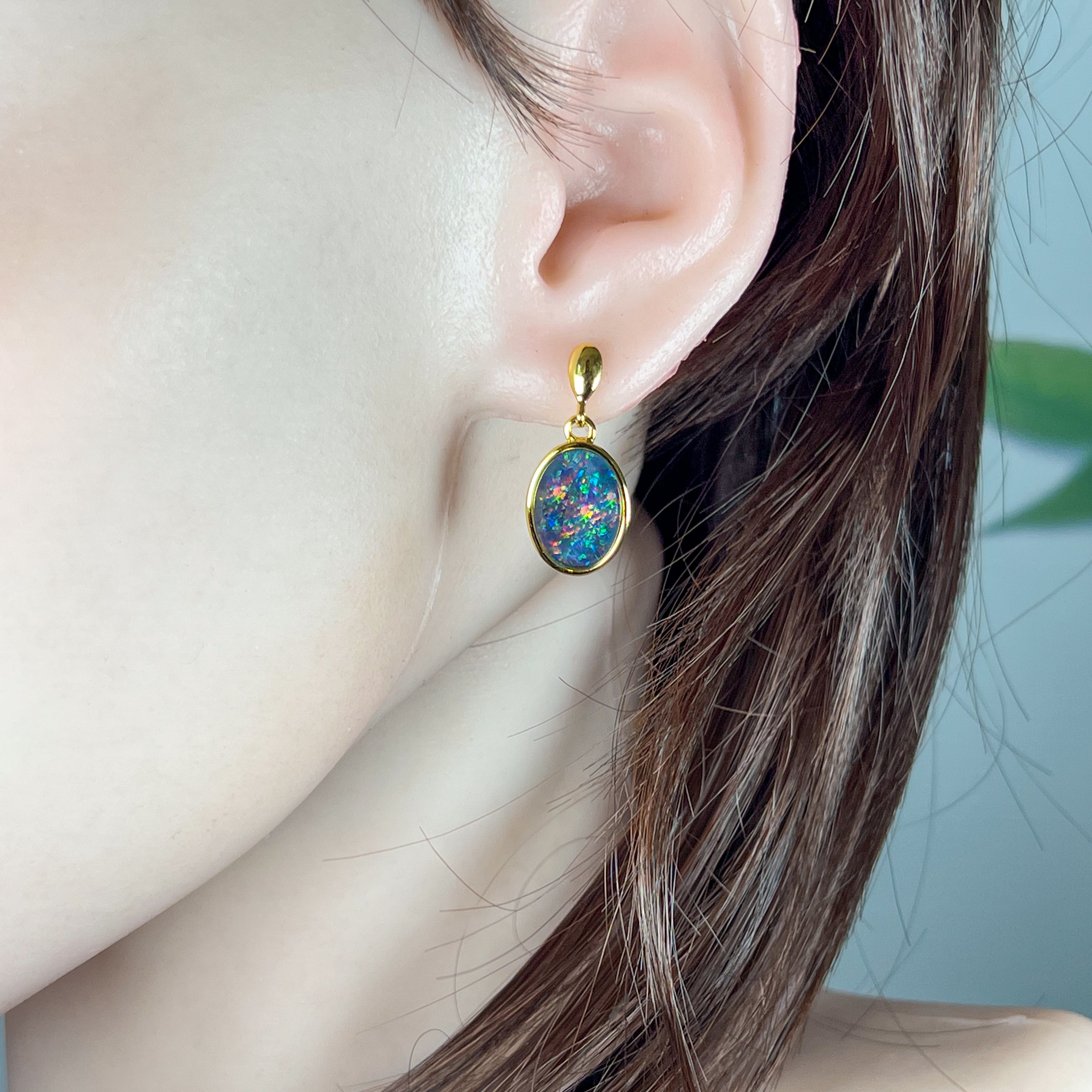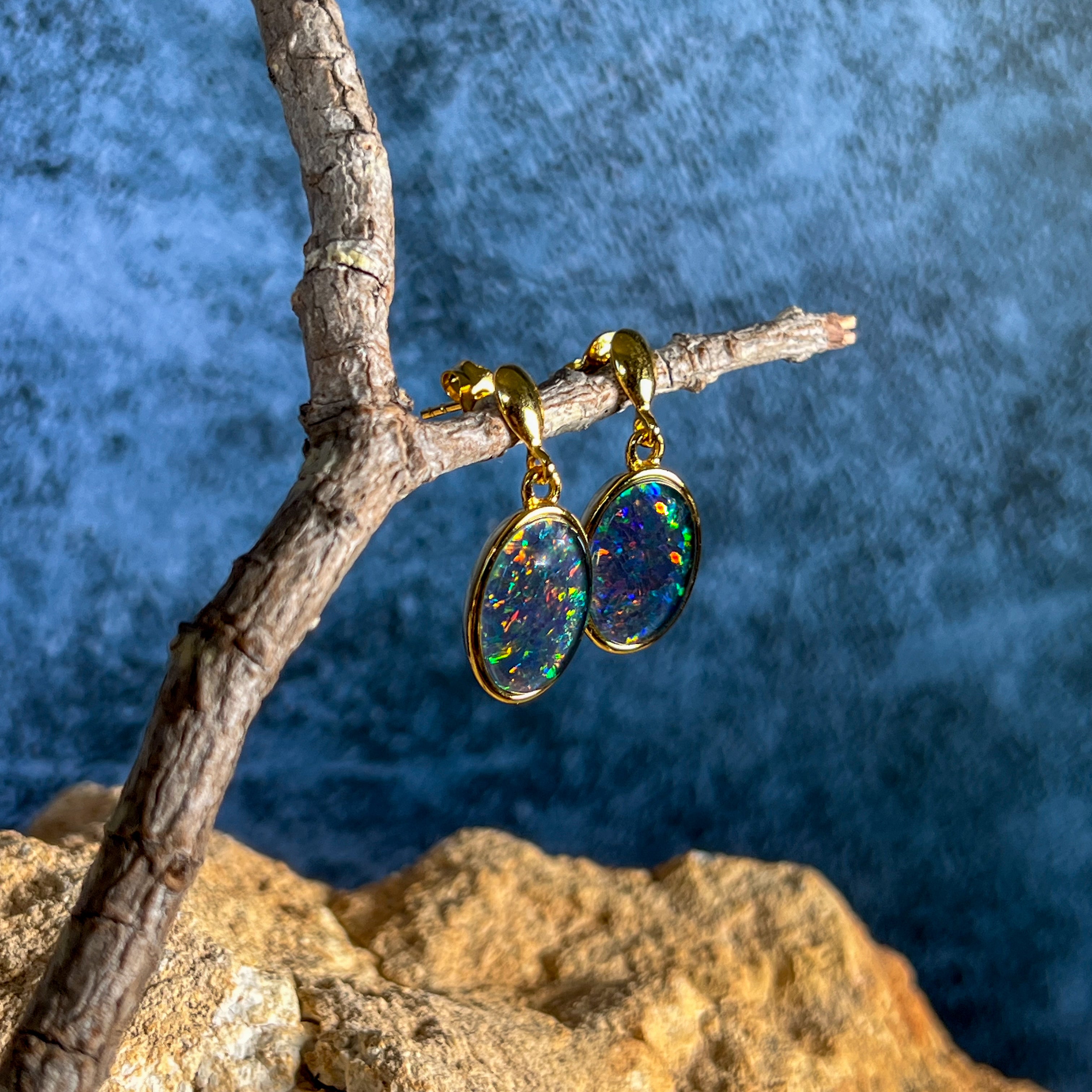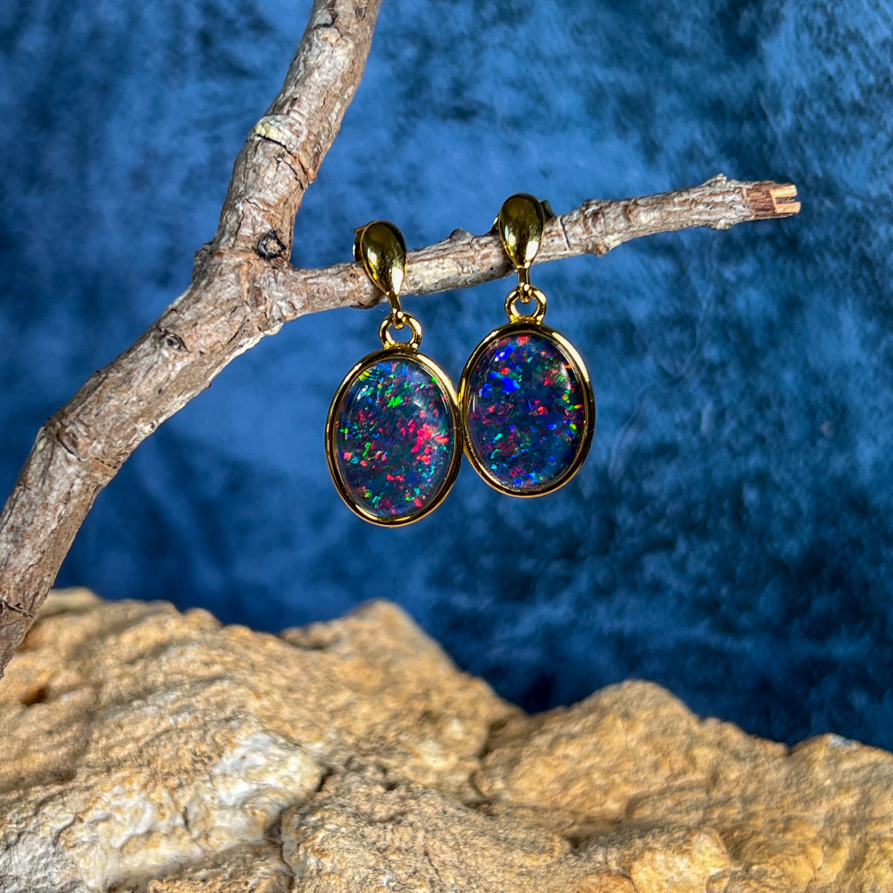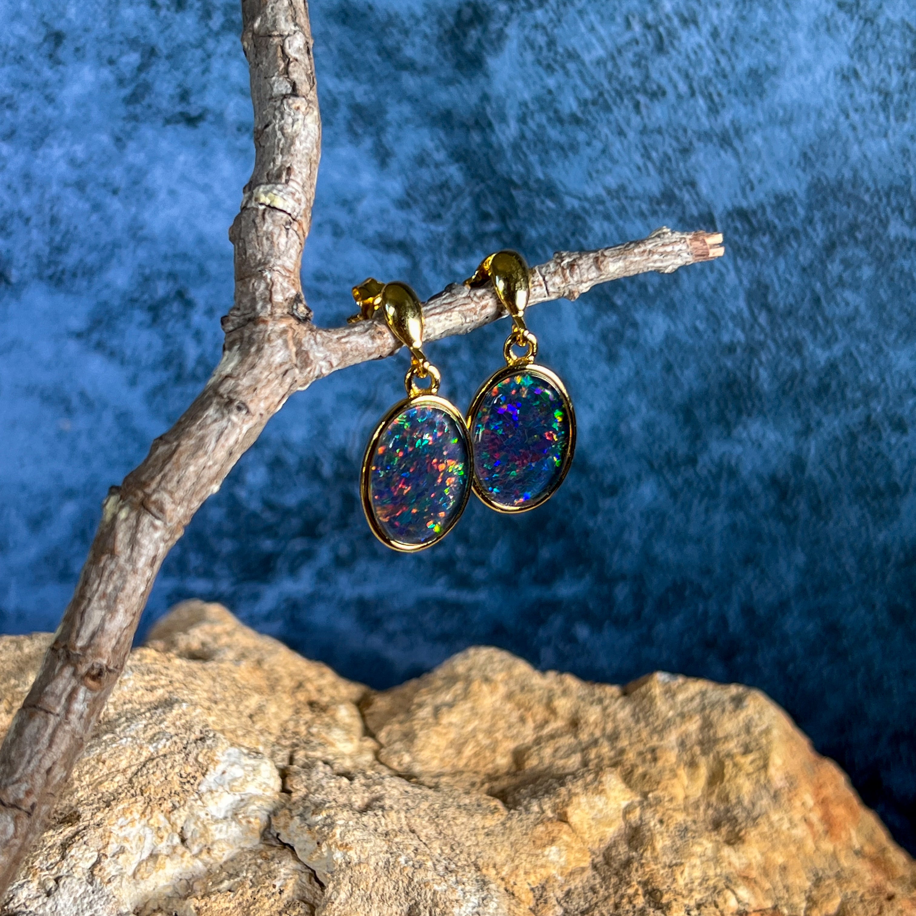 Gold Plated Silver short drop 14x10mm Opal triplet earrings bezel set