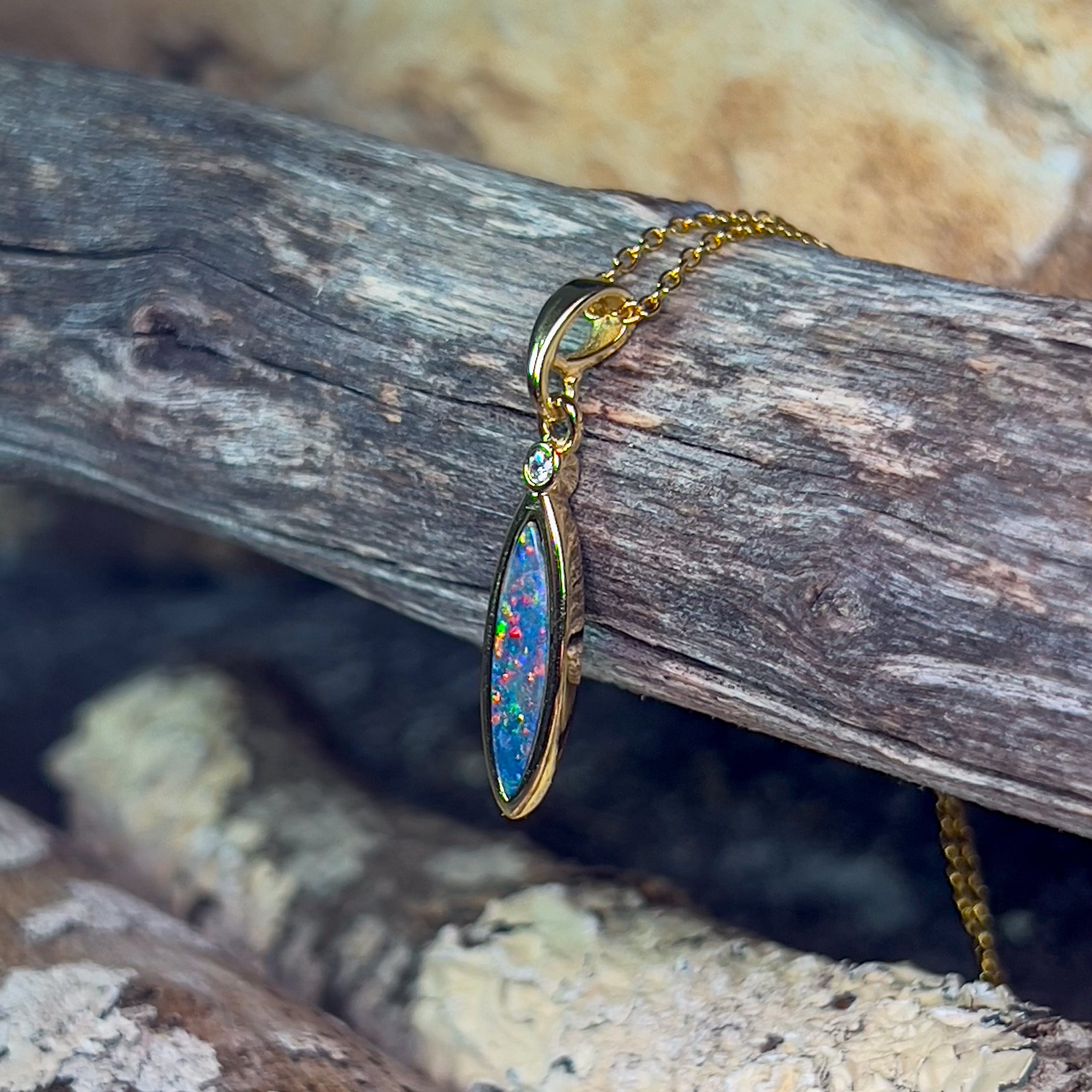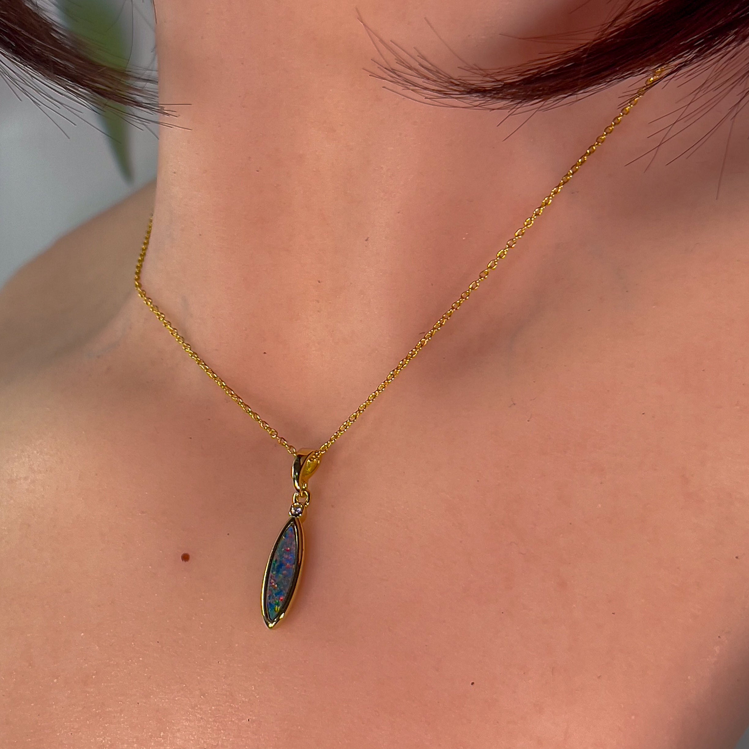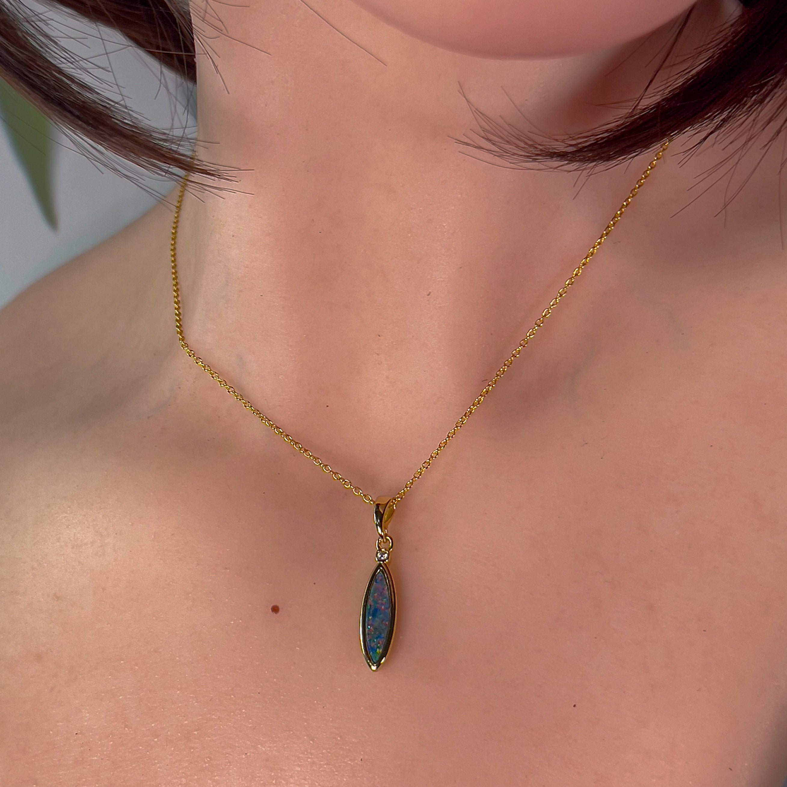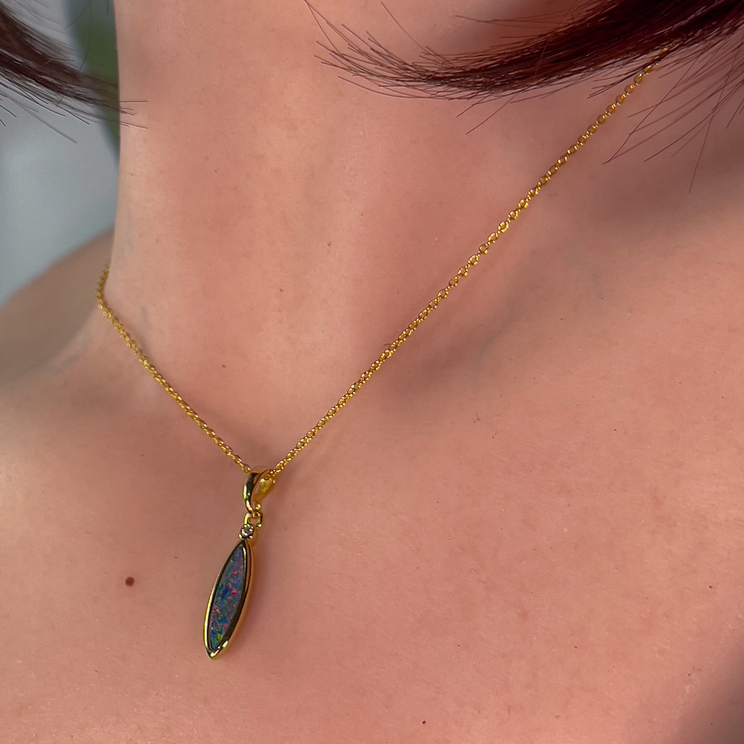 Experience luxury and elegance with our Gold Plated Sterling Silver Marquise shape Opal doublet pendant. The drop design adds a touch of sophistication to any outfit. Elevate your style and make a statement with this stunning piece.