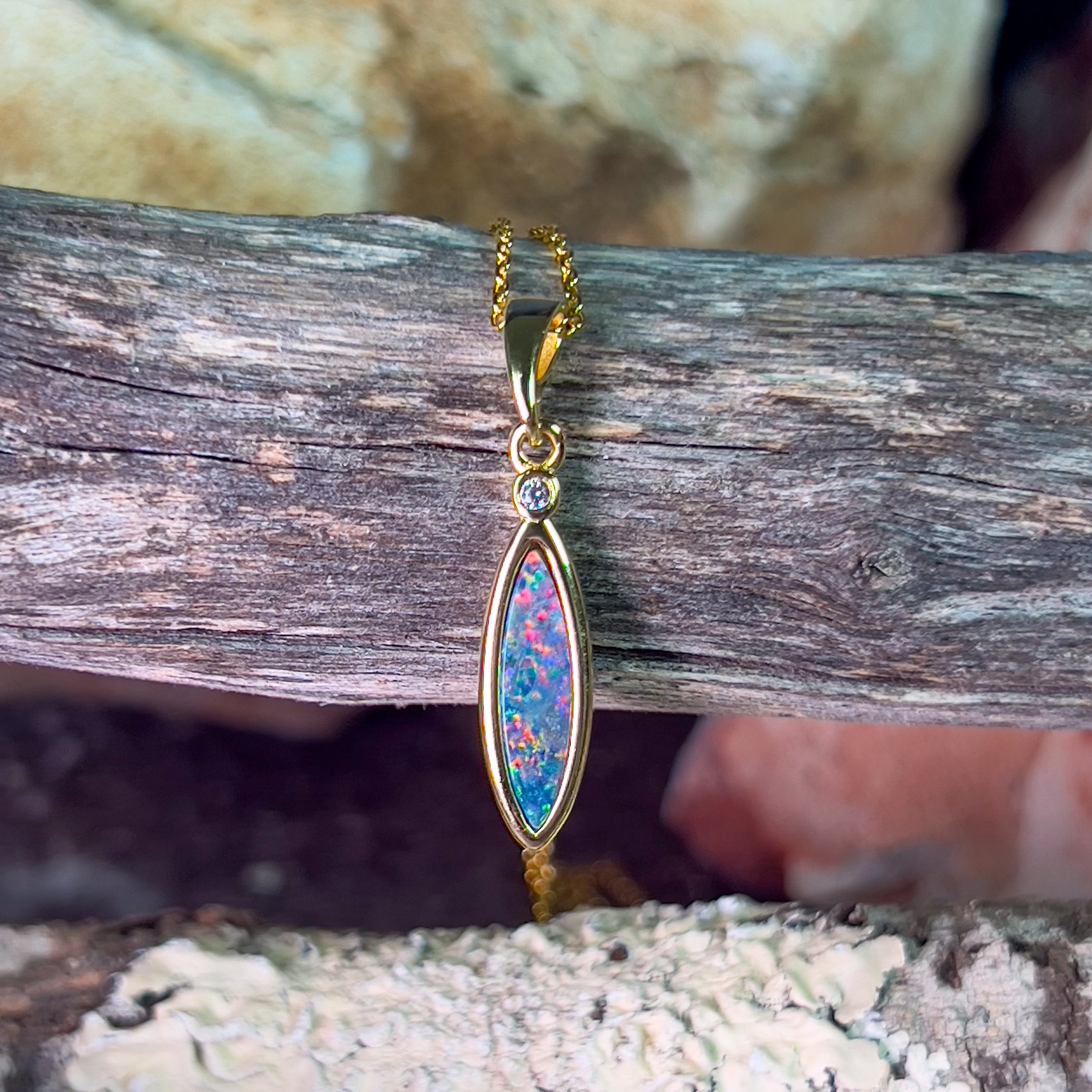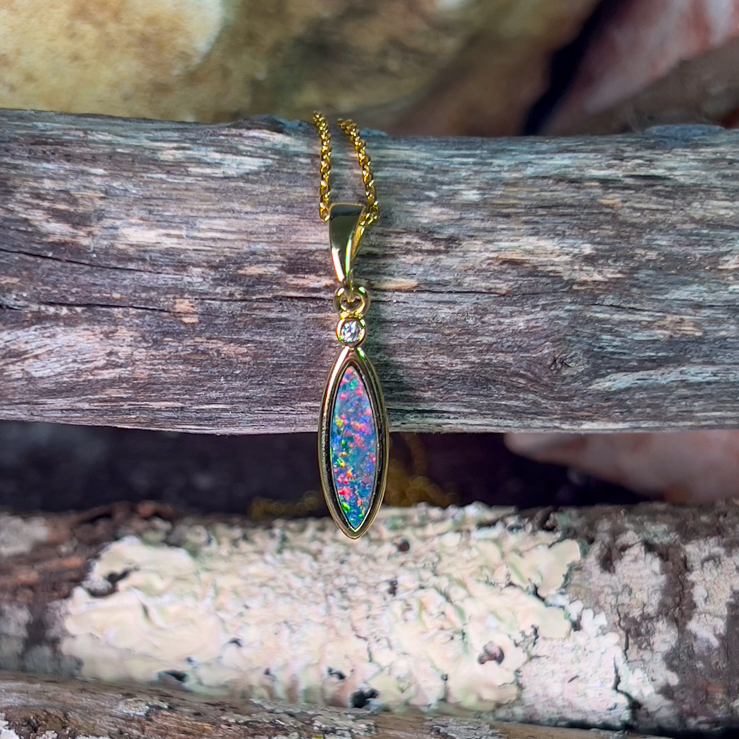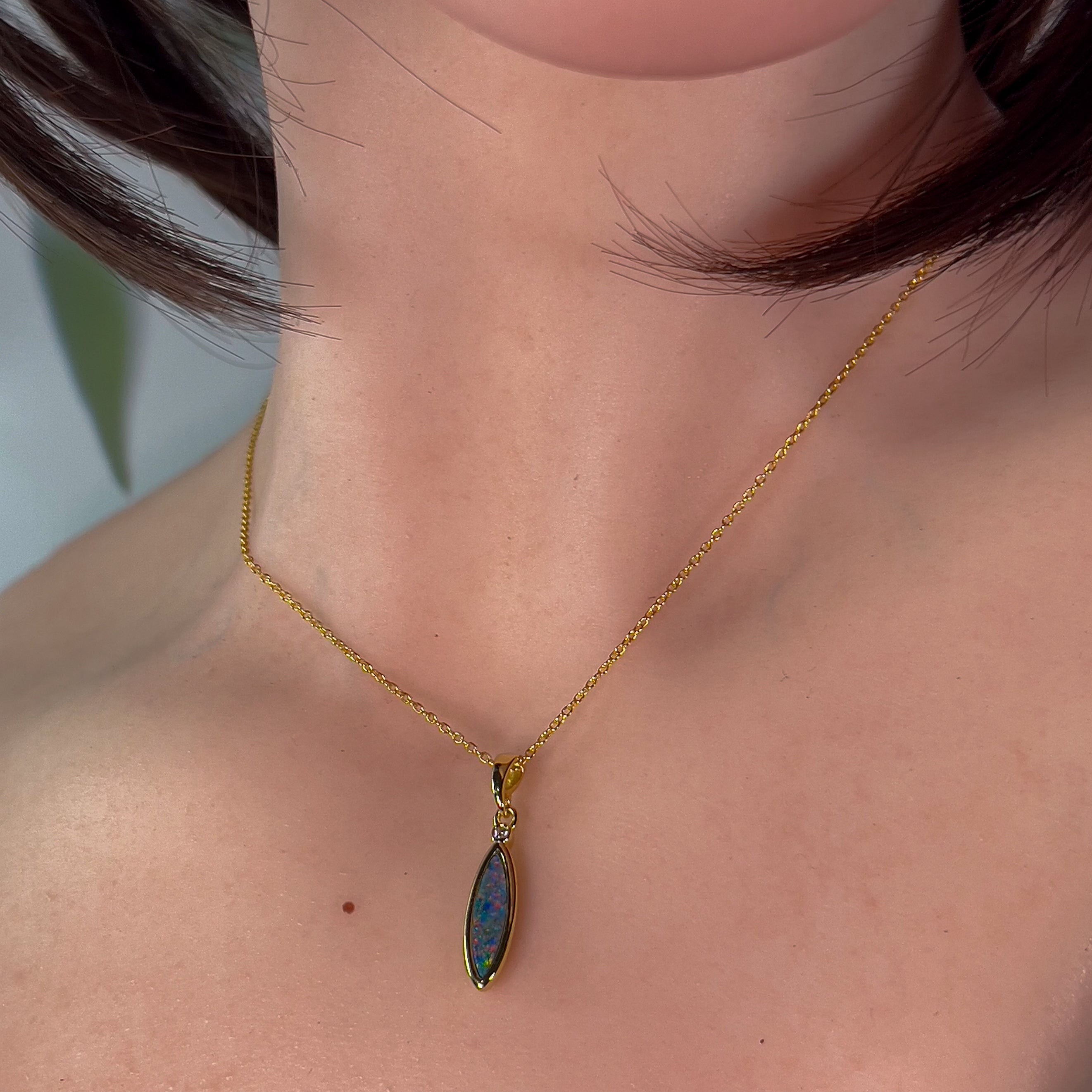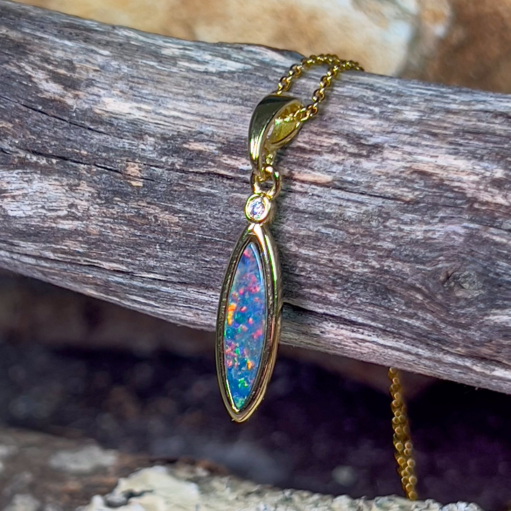 Experience luxury and elegance with our Gold Plated Sterling Silver Marquise shape Opal doublet pendant. The drop design adds a touch of sophistication to any outfit. Elevate your style and make a statement with this stunning piece.