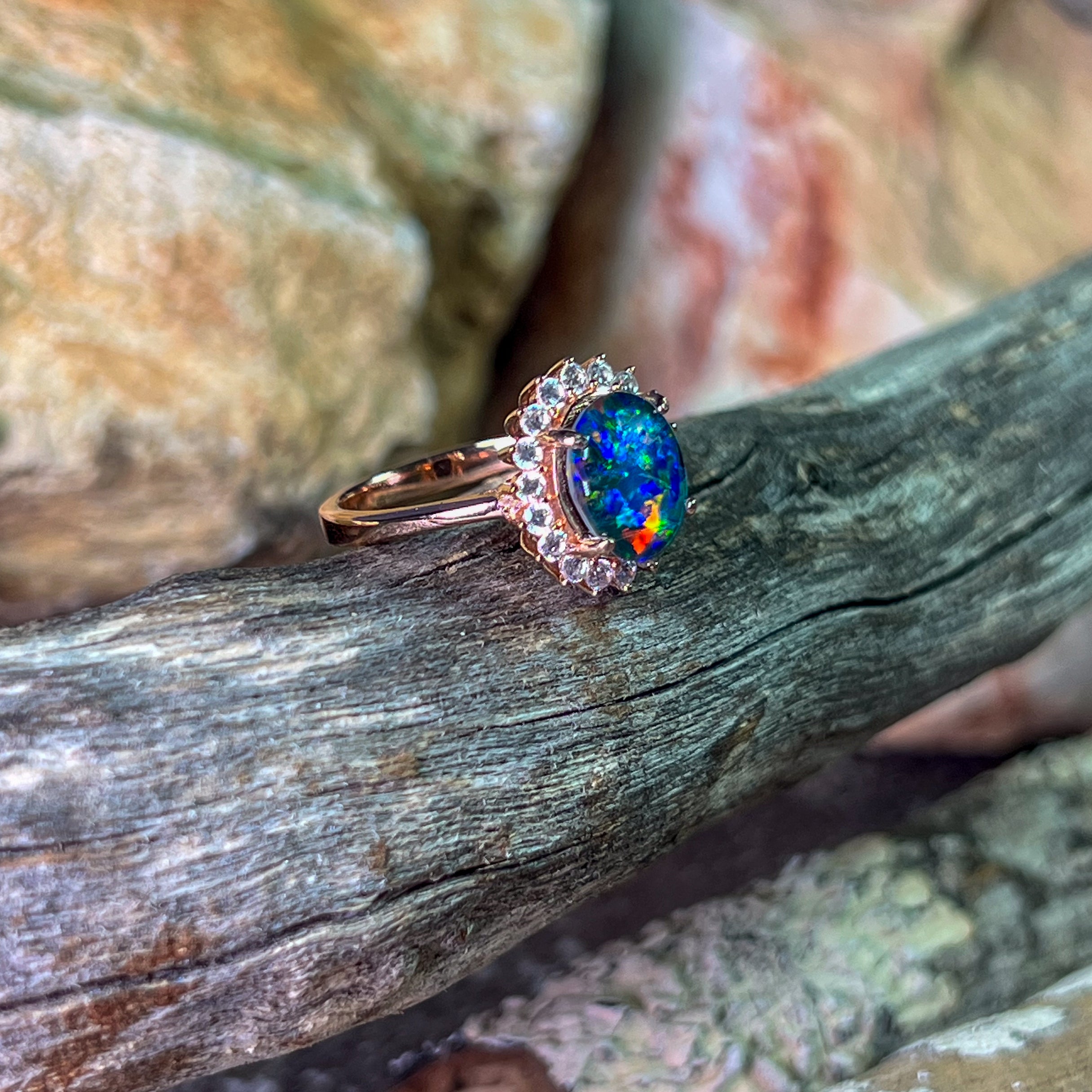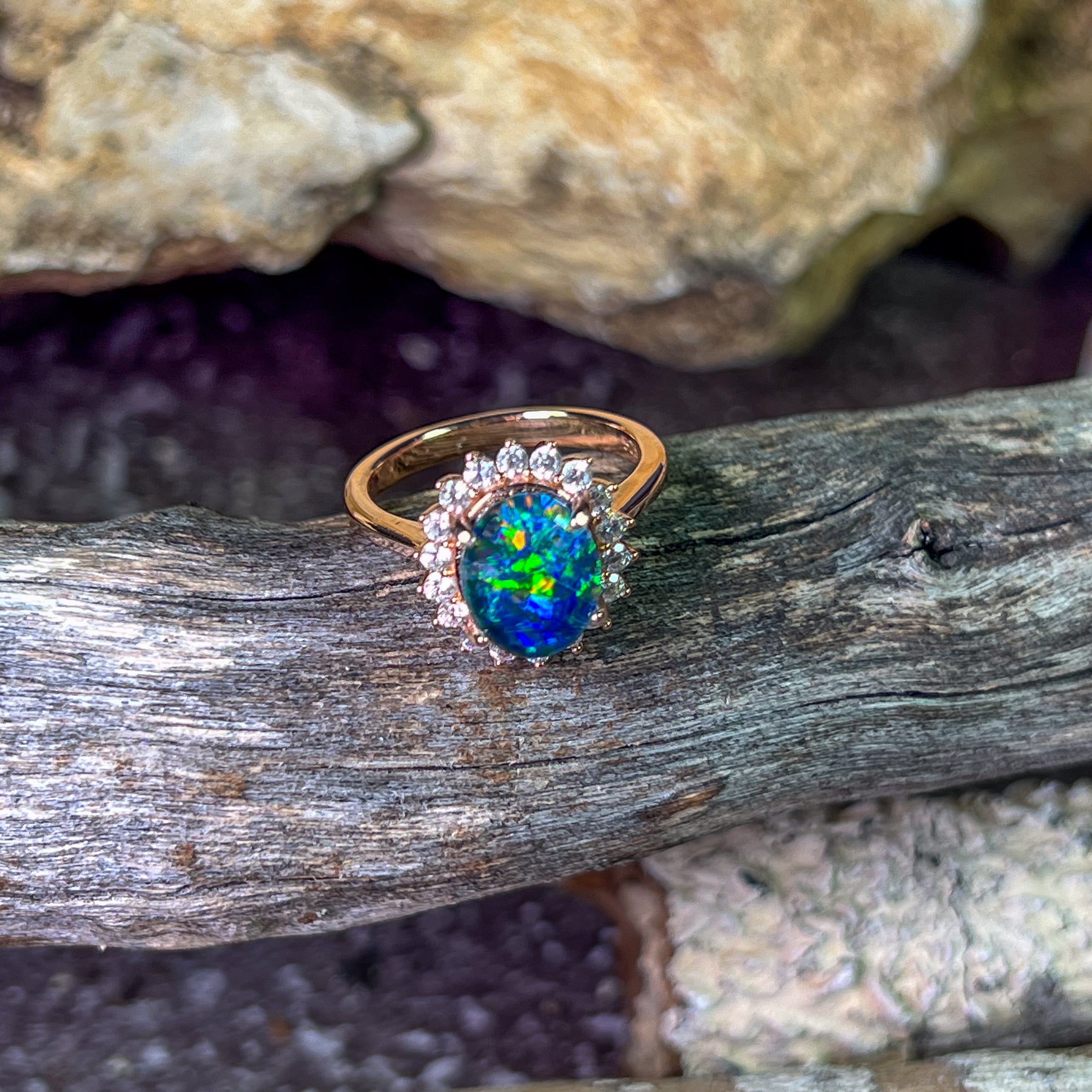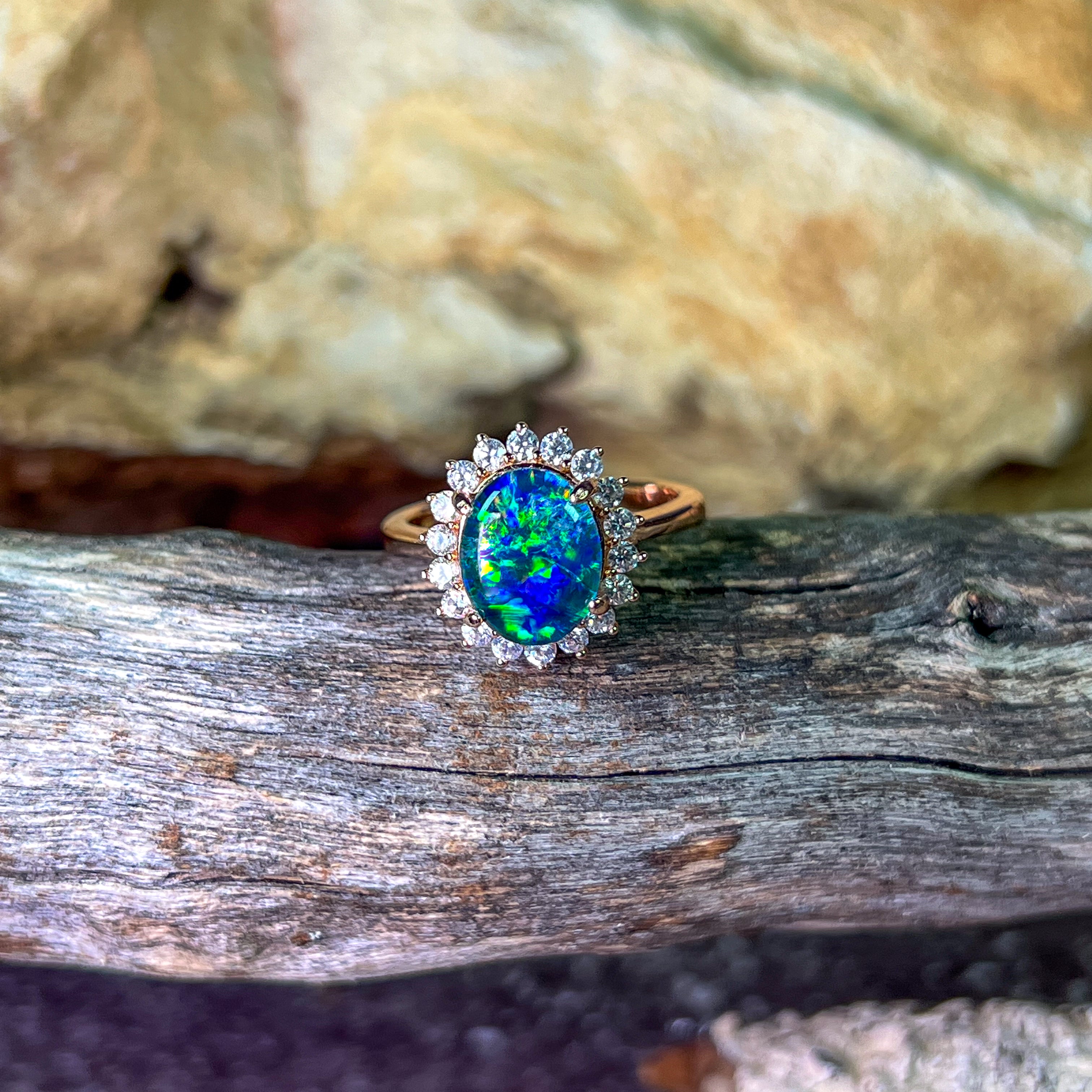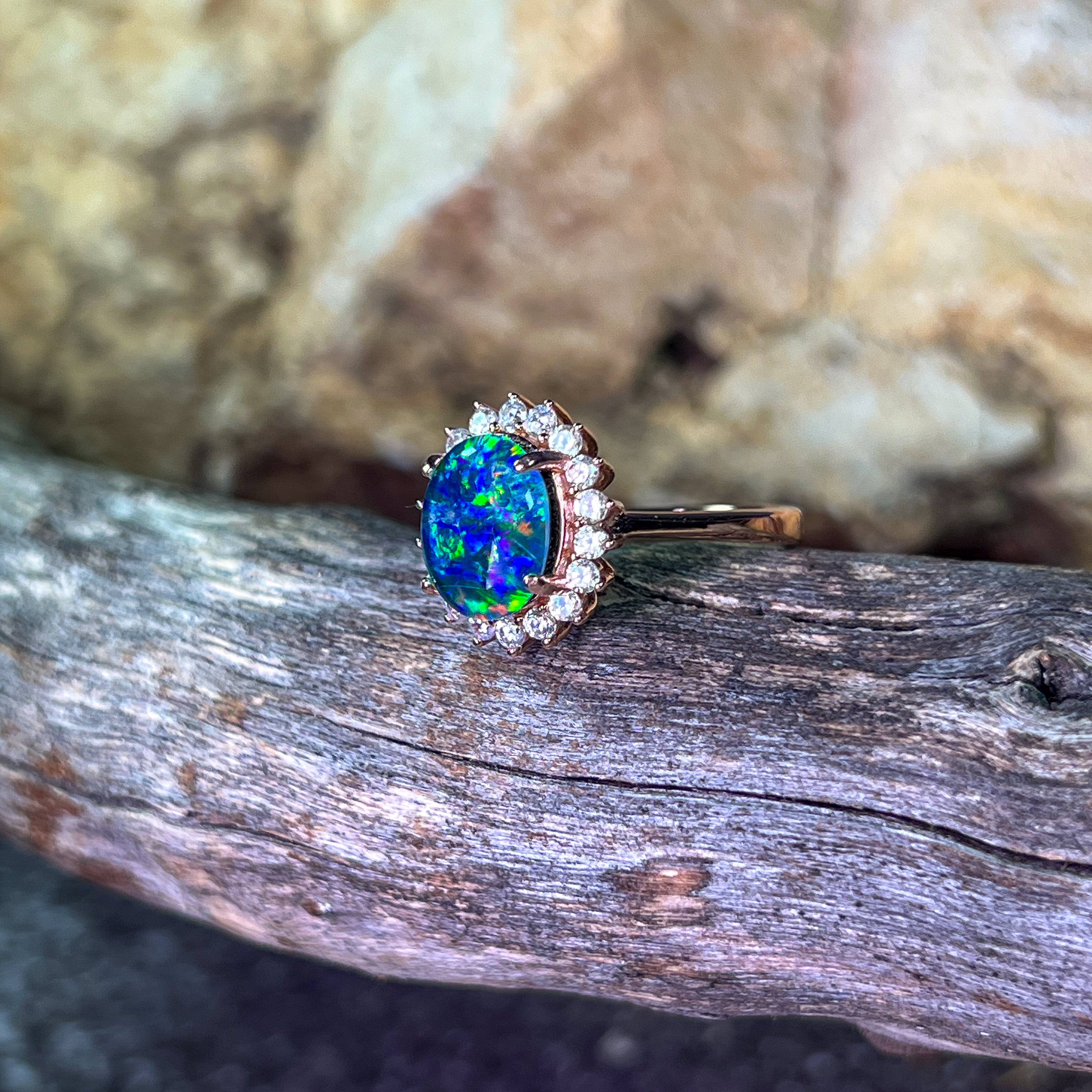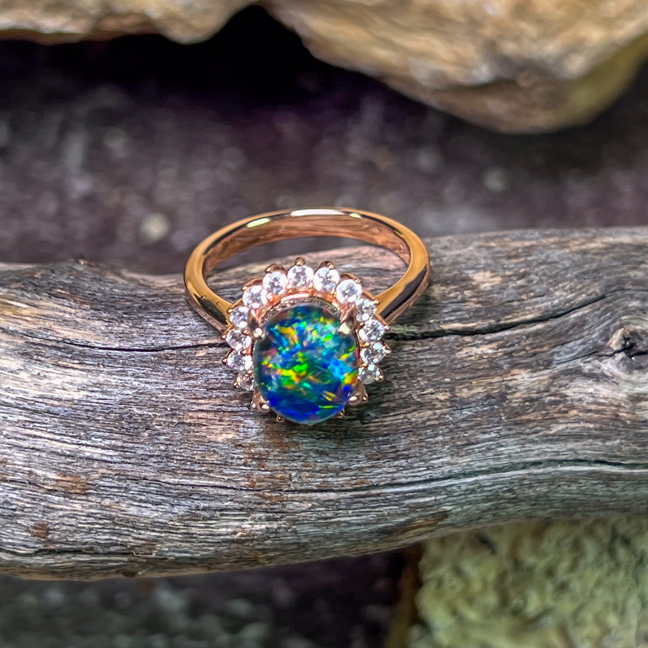 Rose gold plated Opal triplet 10x8mm cluster ring