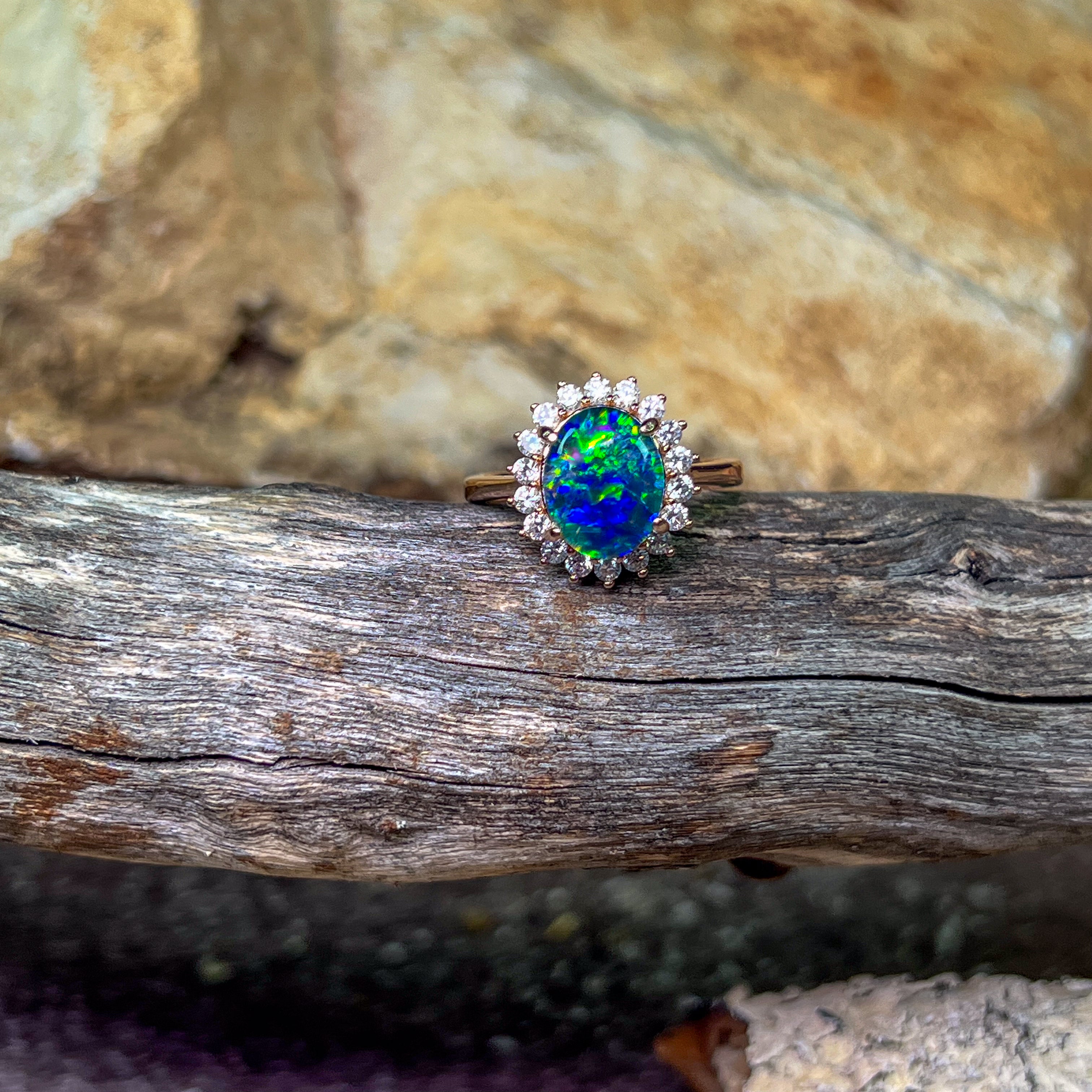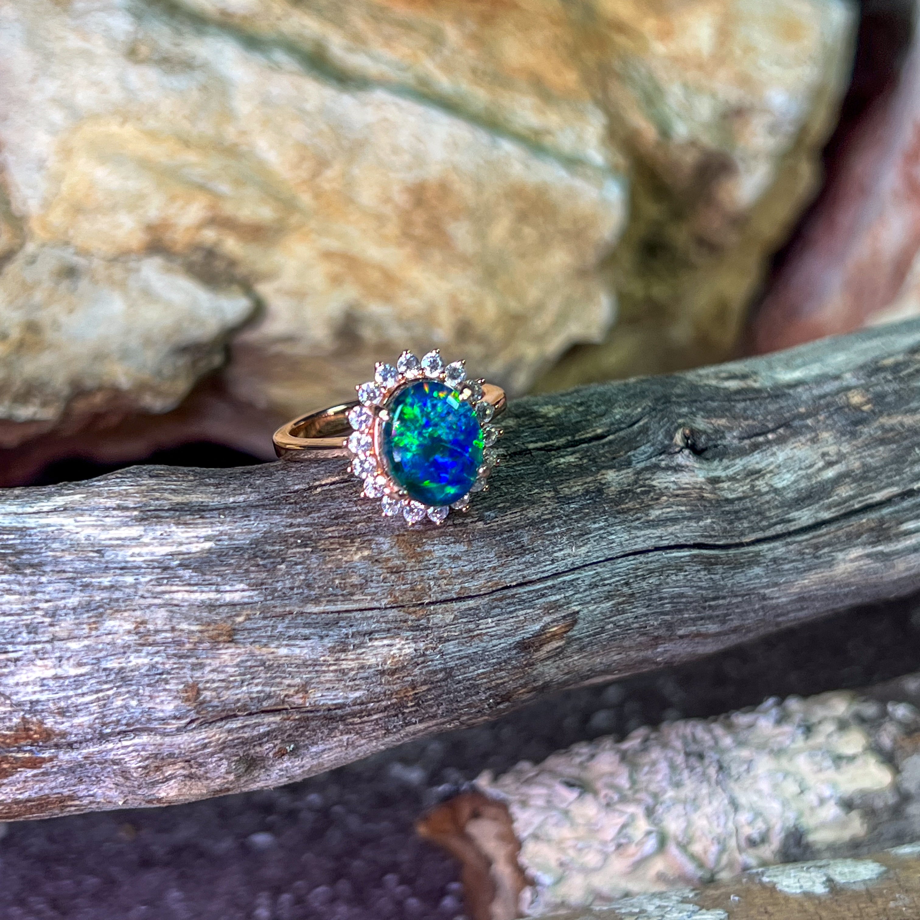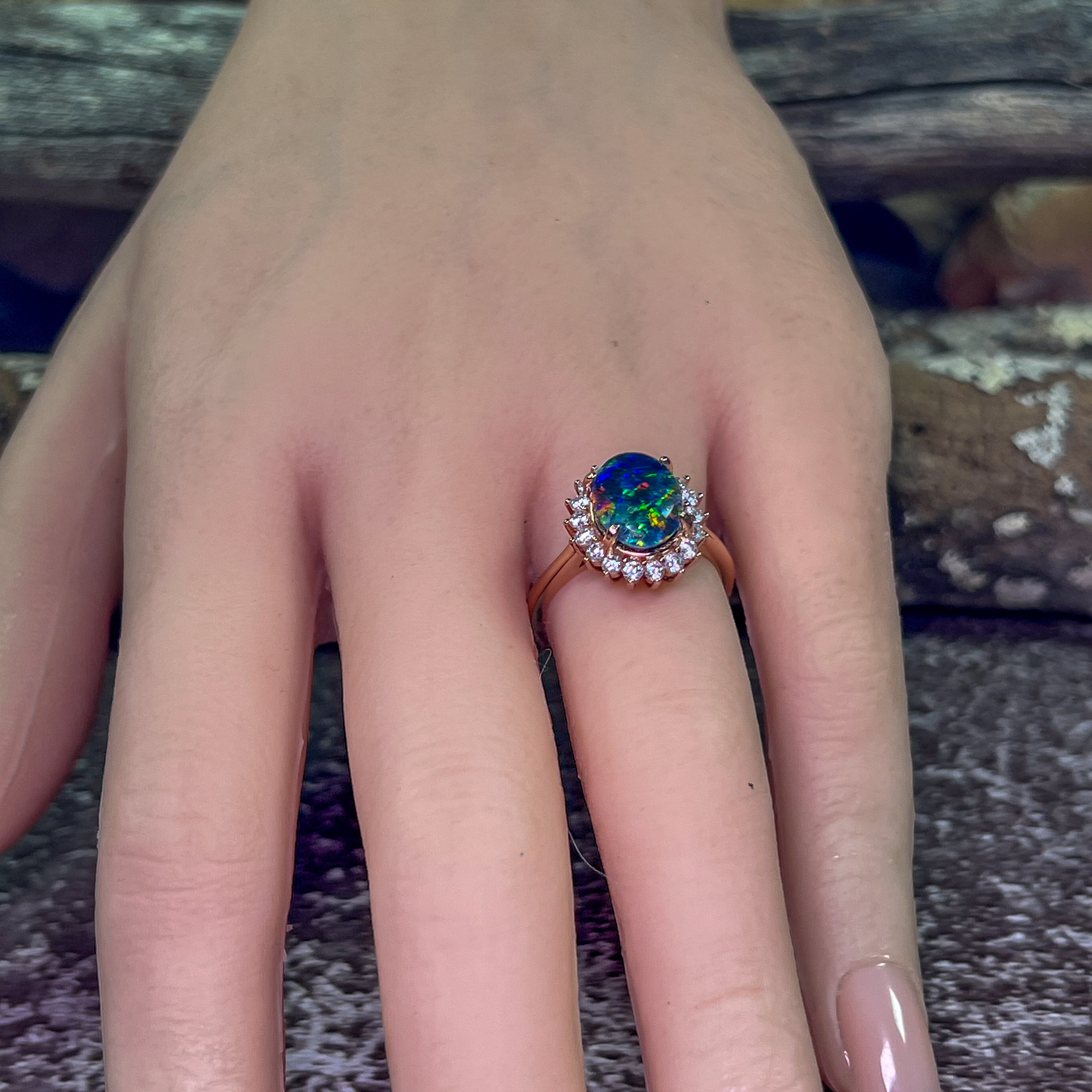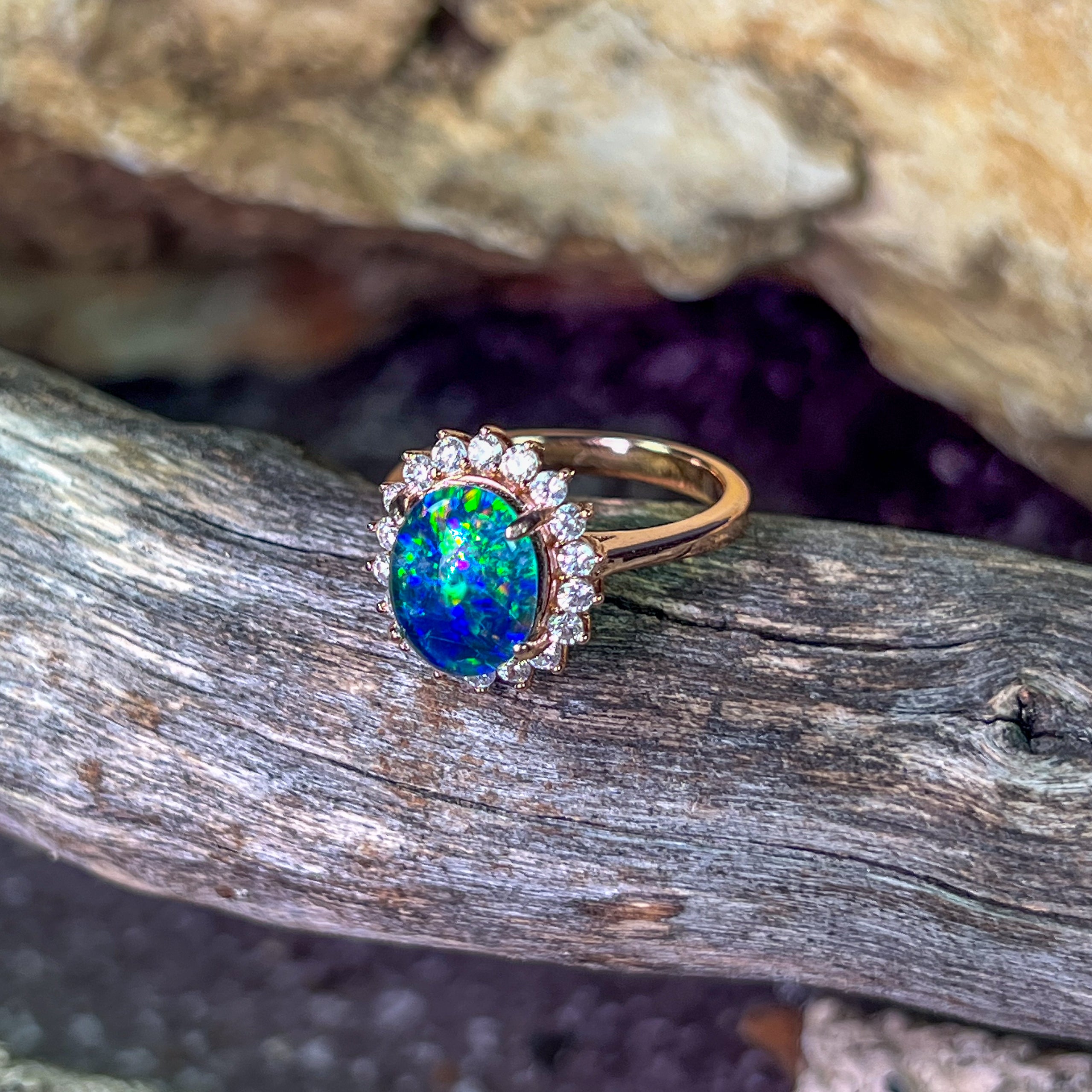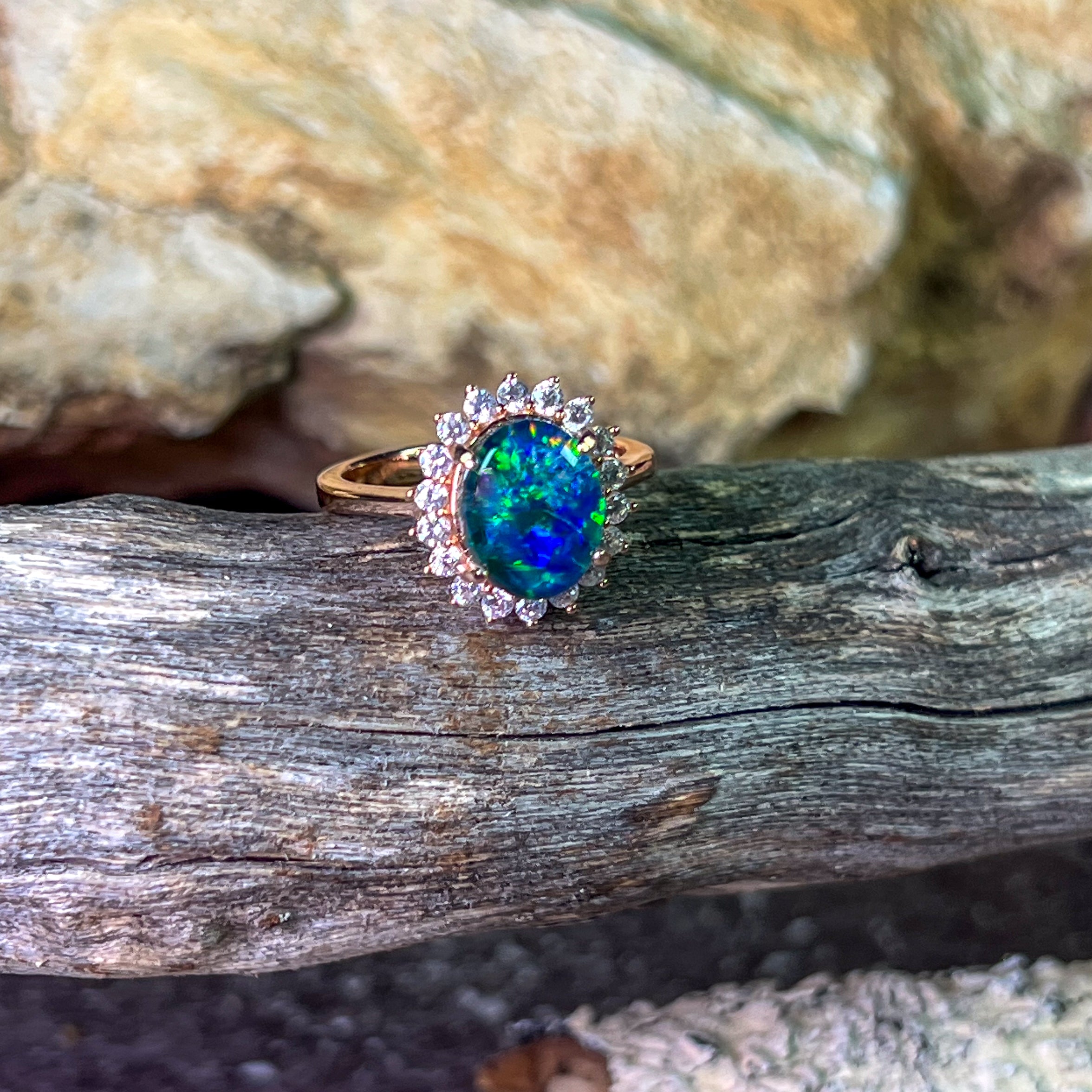 Rose gold plated Opal triplet 10x8mm cluster ring