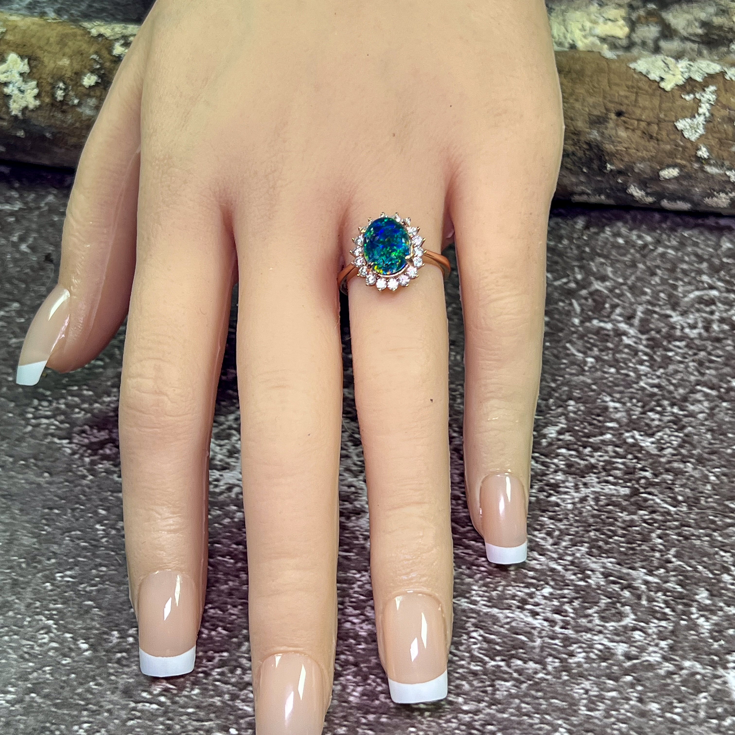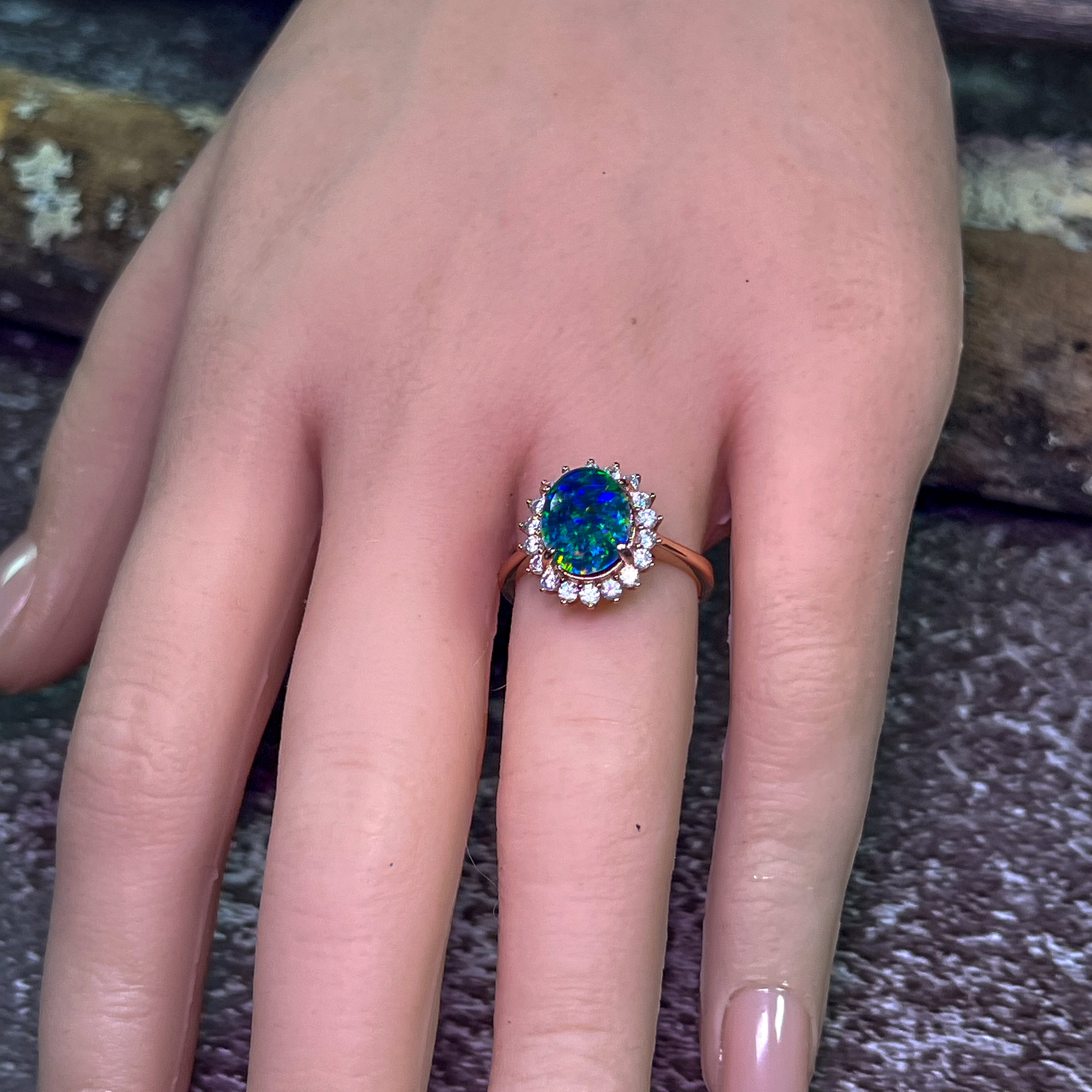 This exquisite One Rose gold plated Opal triplet 10x8mm cluster ring is perfect for engagements or special occasions. The opal stone adds a touch of elegance to the rose gold plated band. This stunning piece of opal jewelry will make a lasting impression and is sure to become a treasured addition to any jewelry collection.