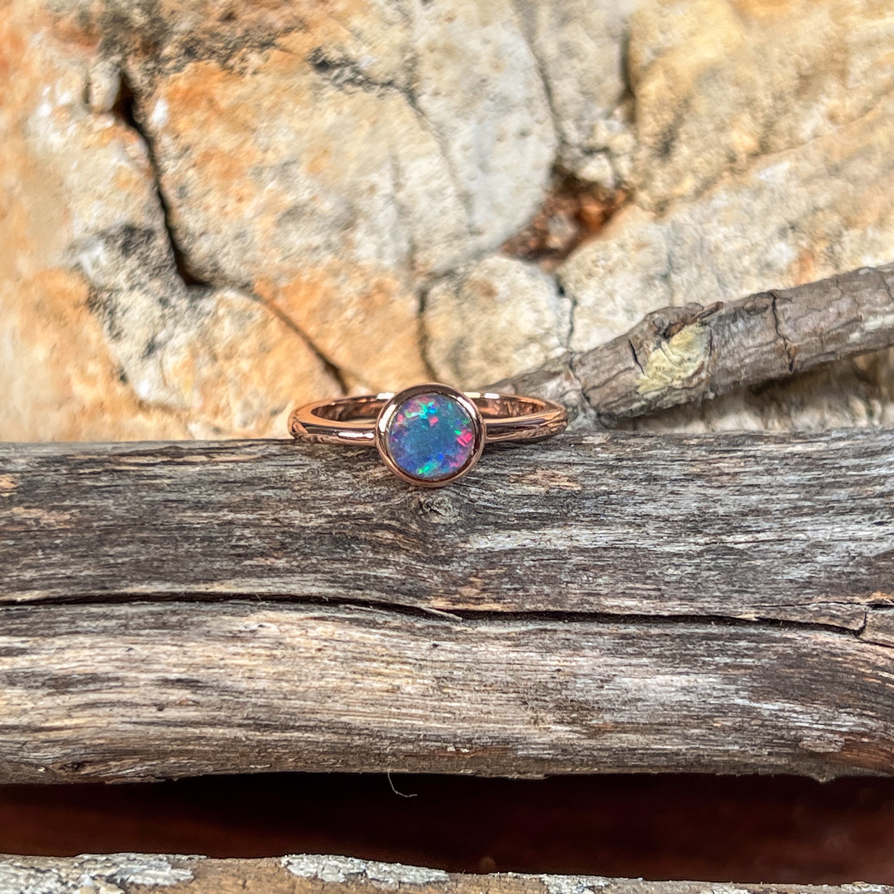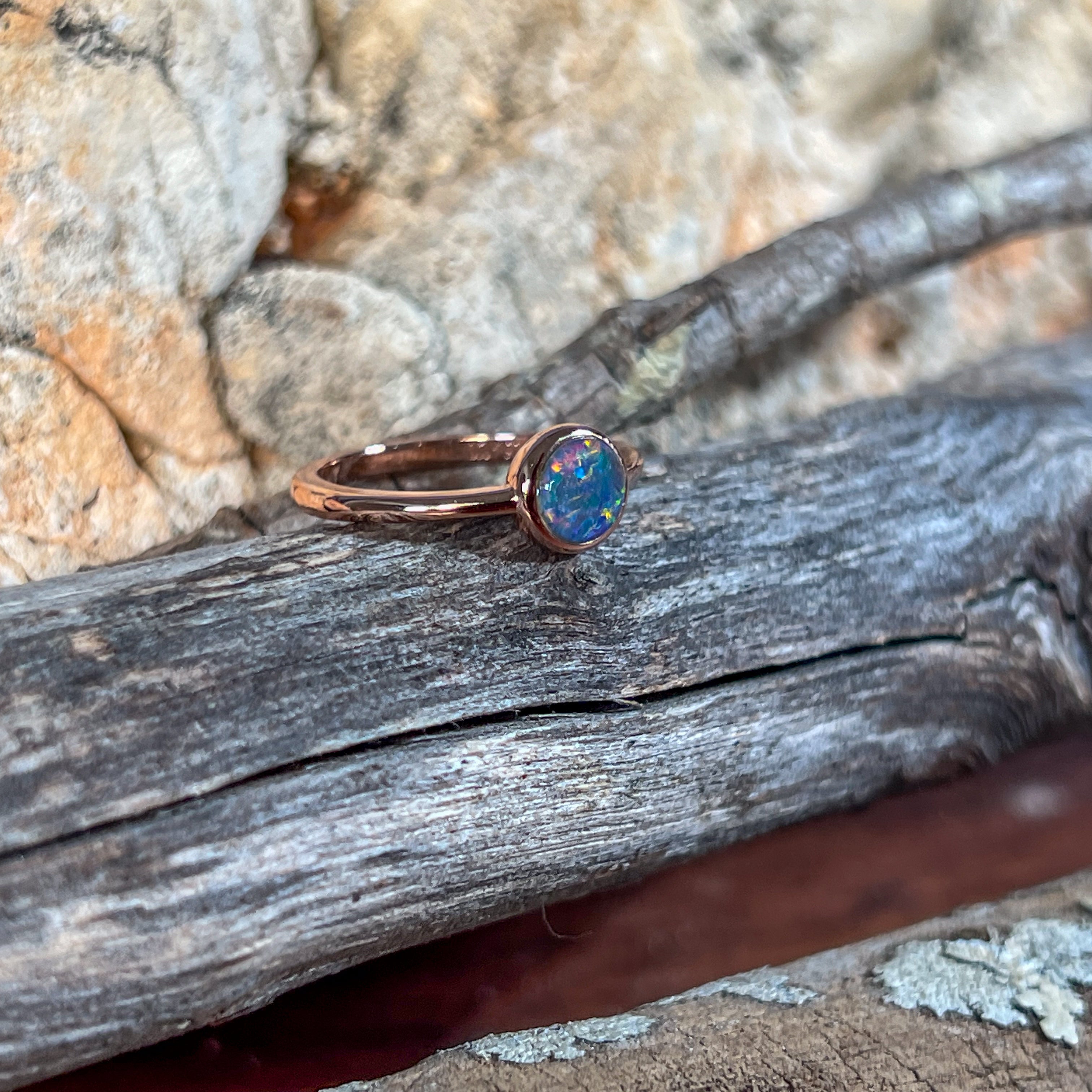 Bring a touch of elegance to any outfit with our Rose Gold plated 6mm Opal triplet solitaire band. The multi-colour stones shimmer and shine, adding a pop of color to your ensemble. Upgrade your style with this stunning piece and exude confidence and sophistication.