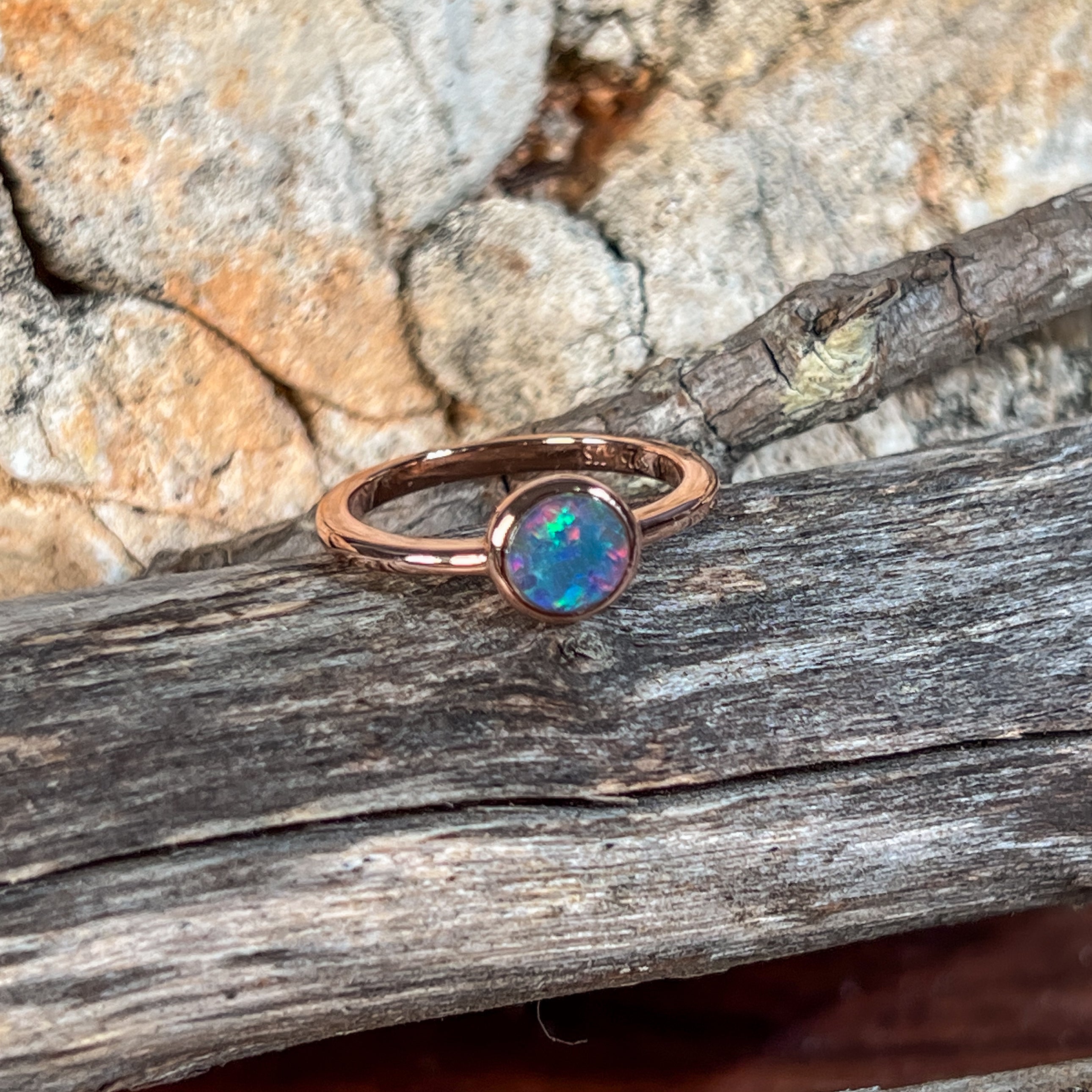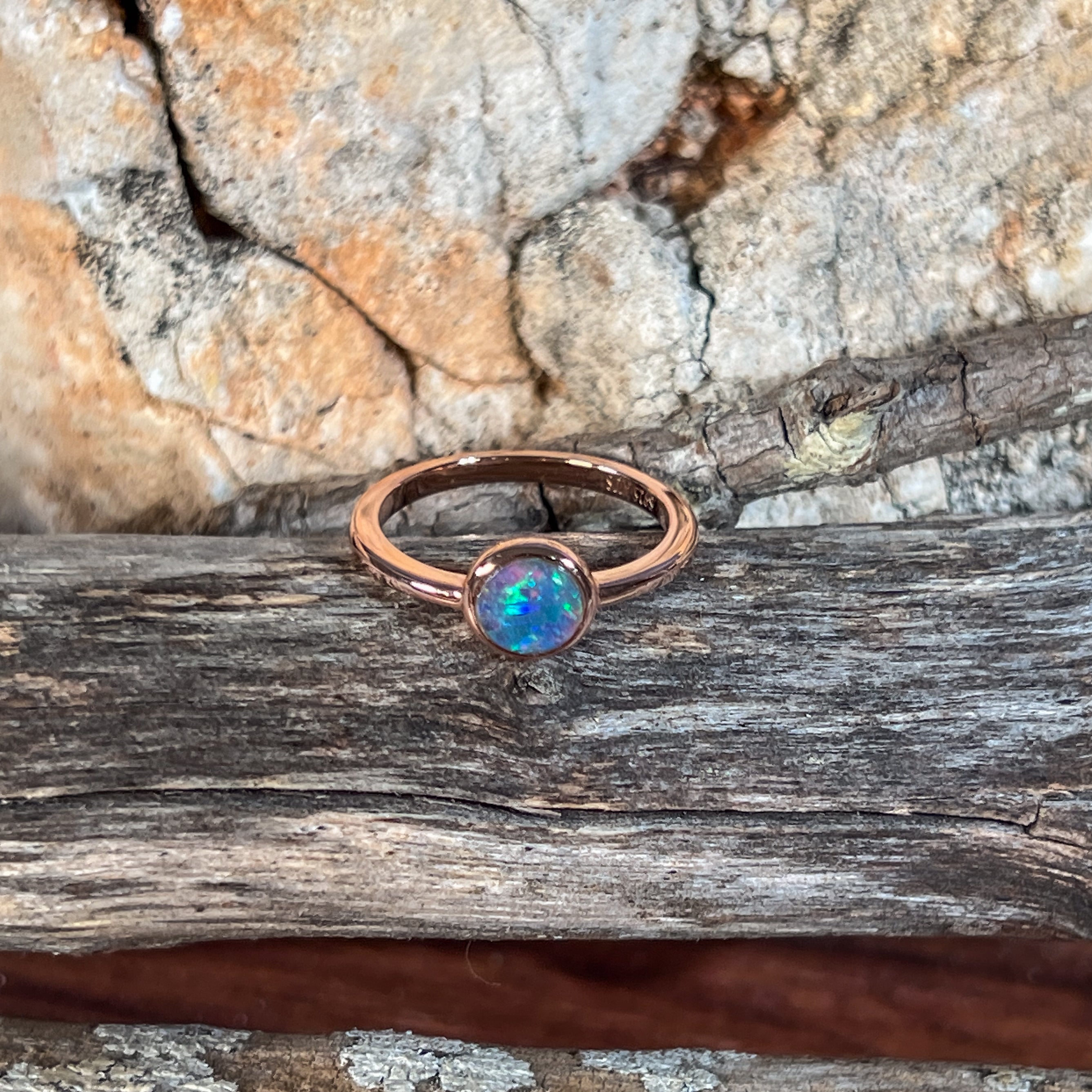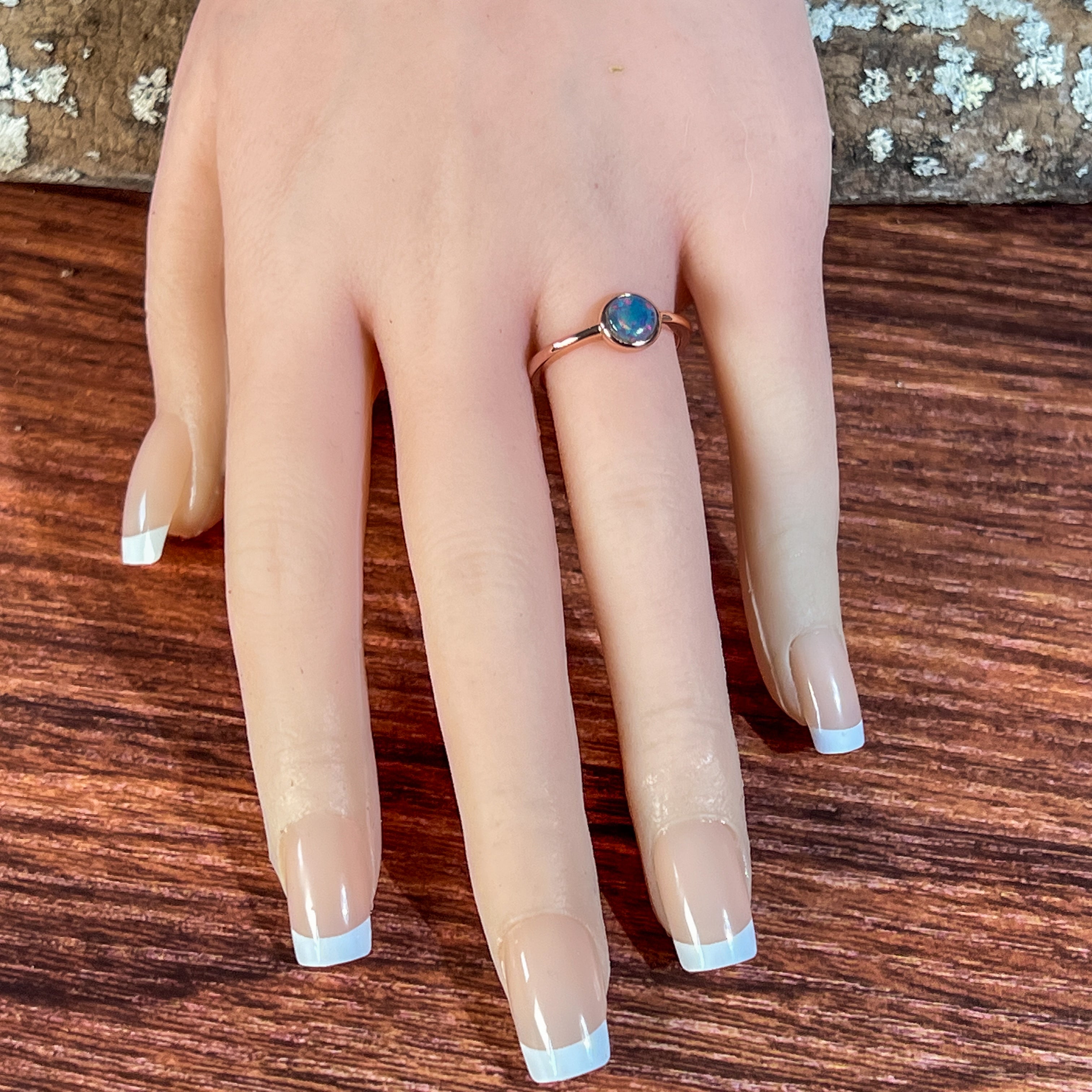 One Rose Gold Plated Sterling Silver solitaire round bezel set Opal ring