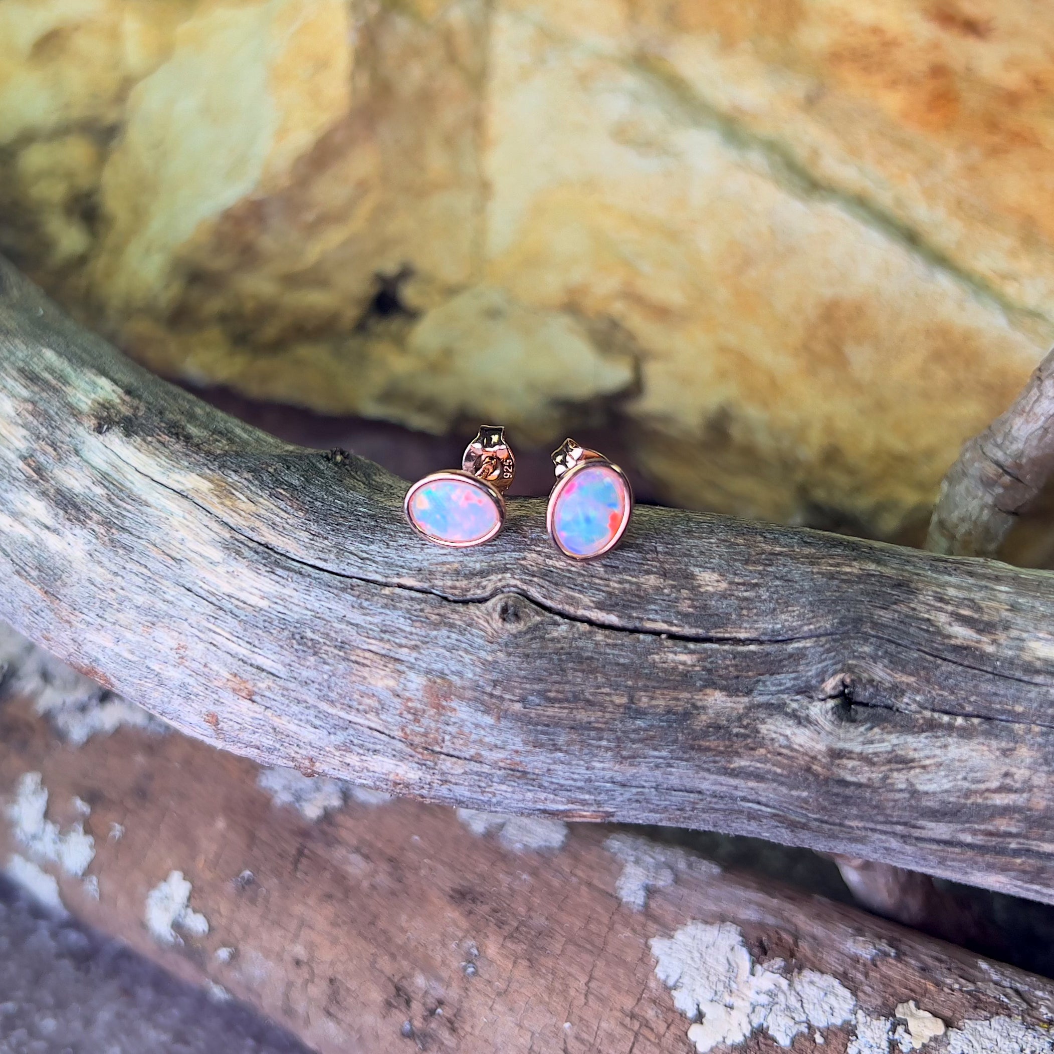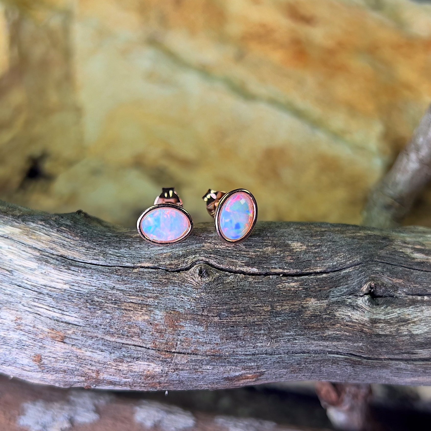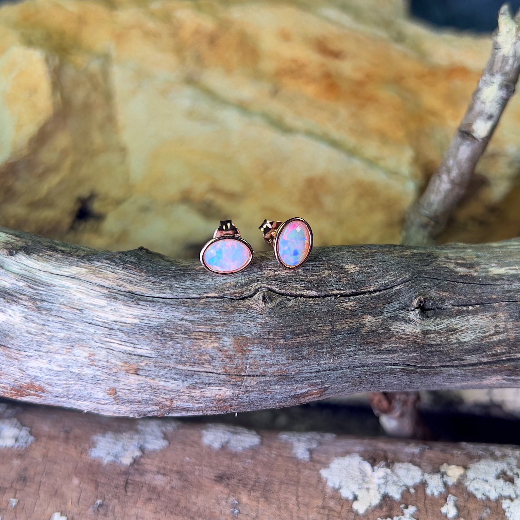 Sparkle up anyone's day with these Rose Gold plated studs adorned with dainty 7x5mm opal stones. The perfect gift for her, these earrings add a touch of elegance and shine to any outfit. You'll be the talk of the town with these stunning, one-of-a-kind earrings. (Don't worry, we won't tell anyone where you got them! 😉)