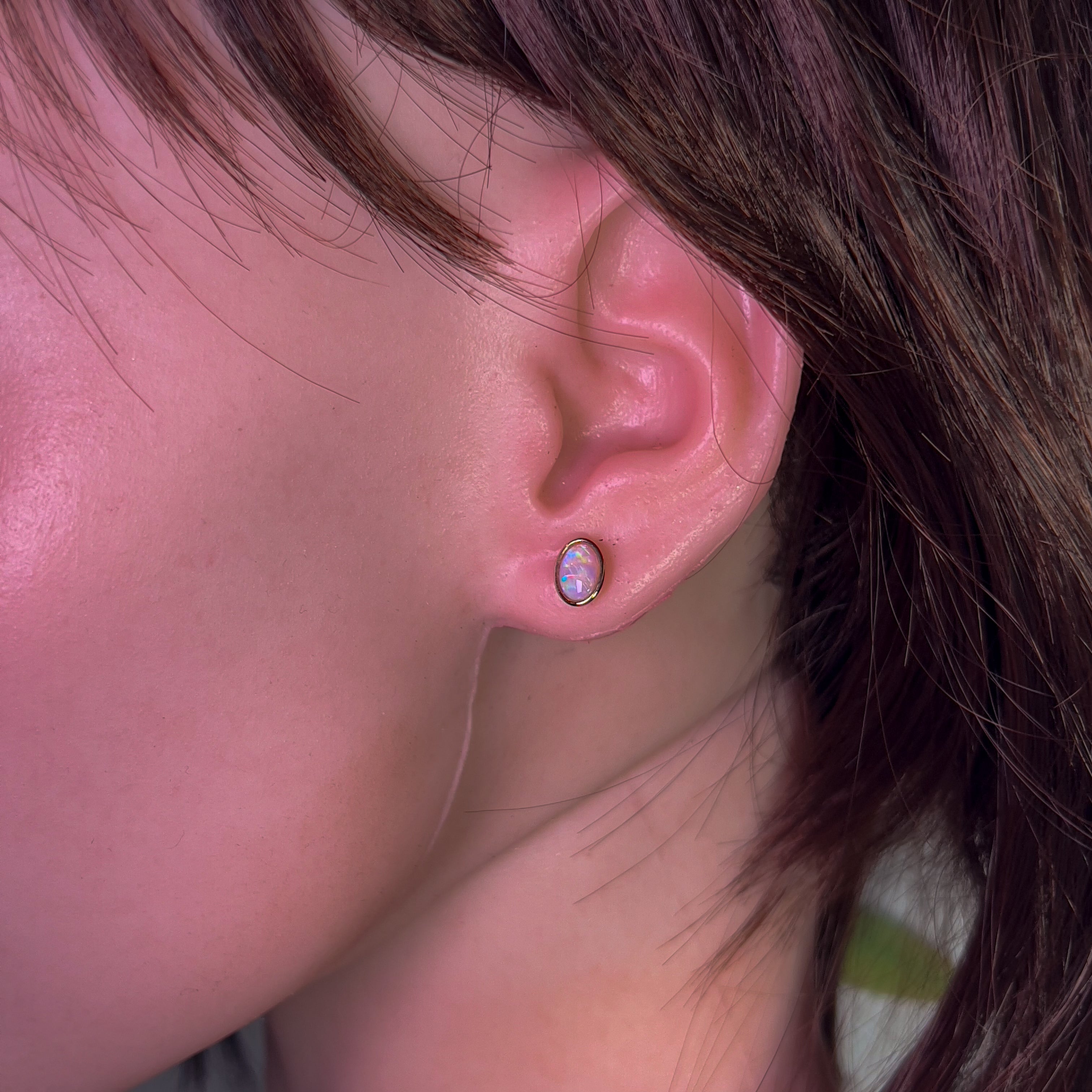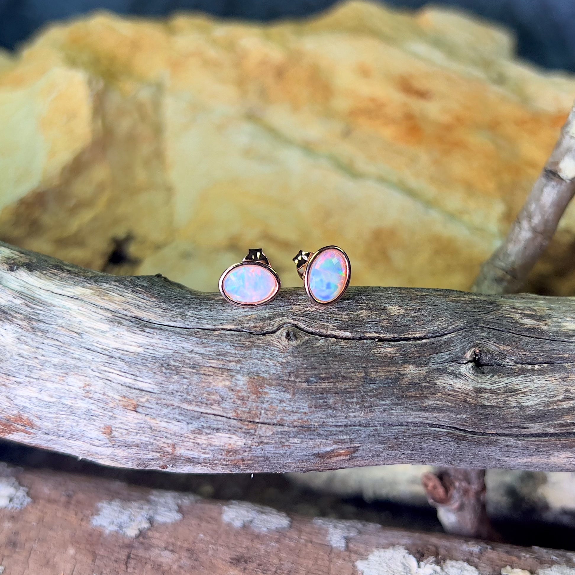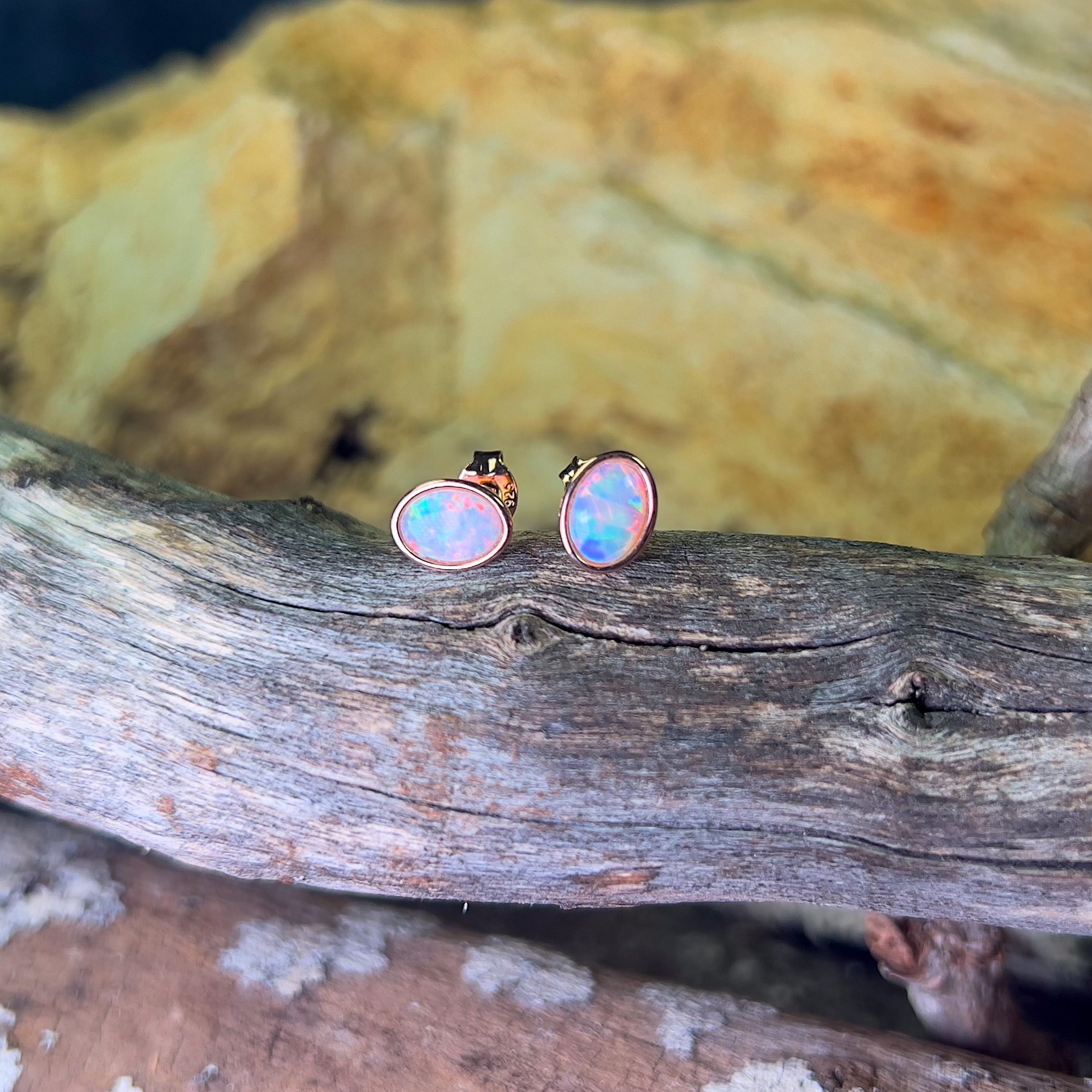 Sparkle up anyone's day with these Rose Gold plated studs adorned with dainty 7x5mm opal stones. The perfect gift for her, these earrings add a touch of elegance and shine to any outfit. You'll be the talk of the town with these stunning, one-of-a-kind earrings. (Don't worry, we won't tell anyone where you got them! 😉)
