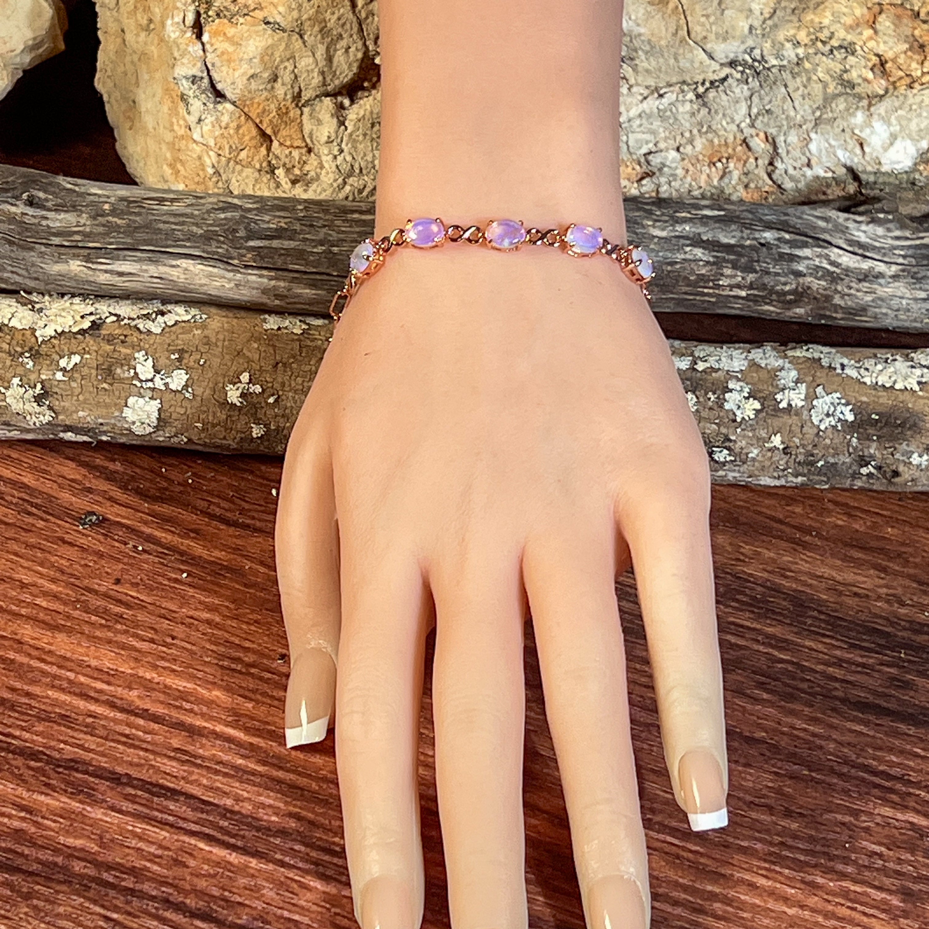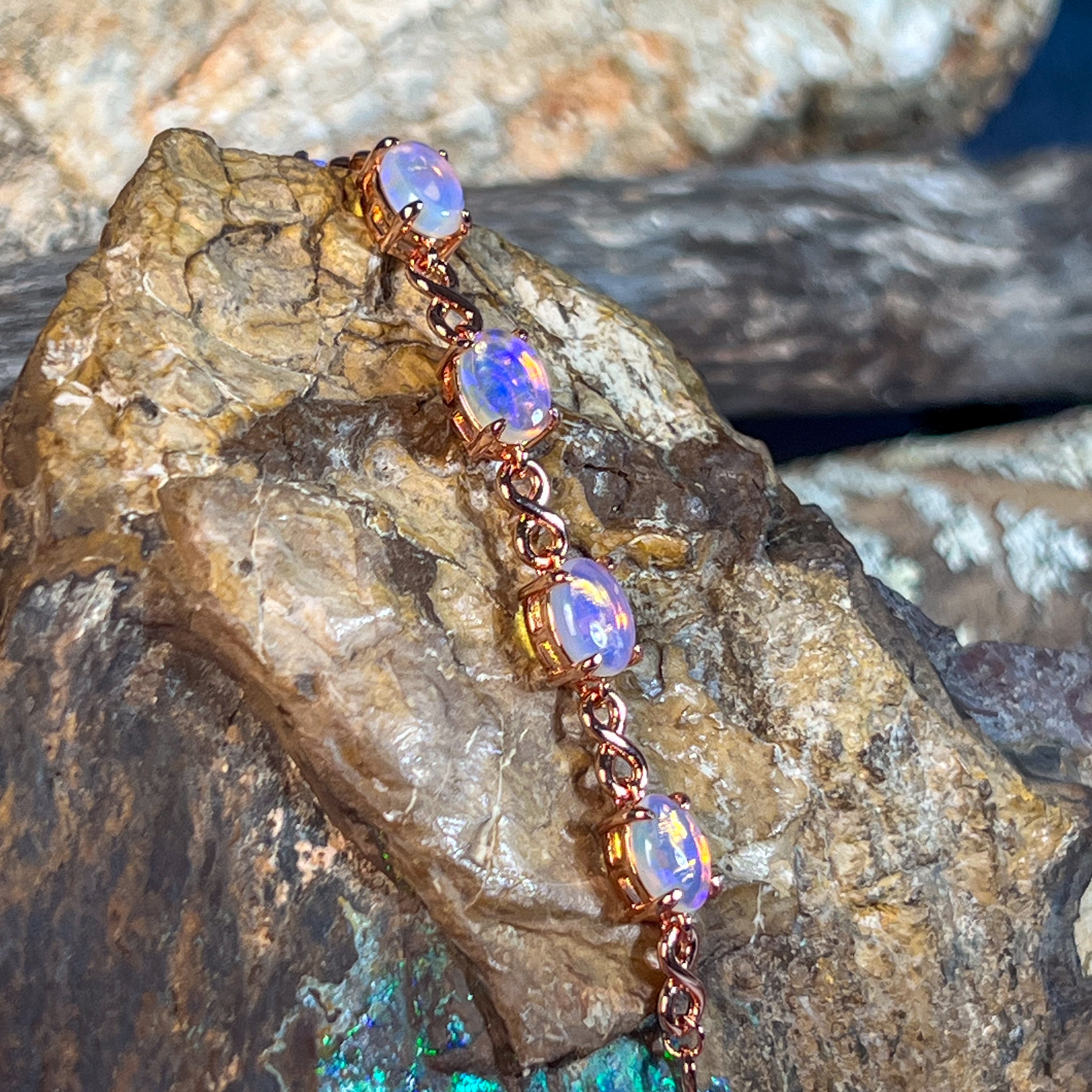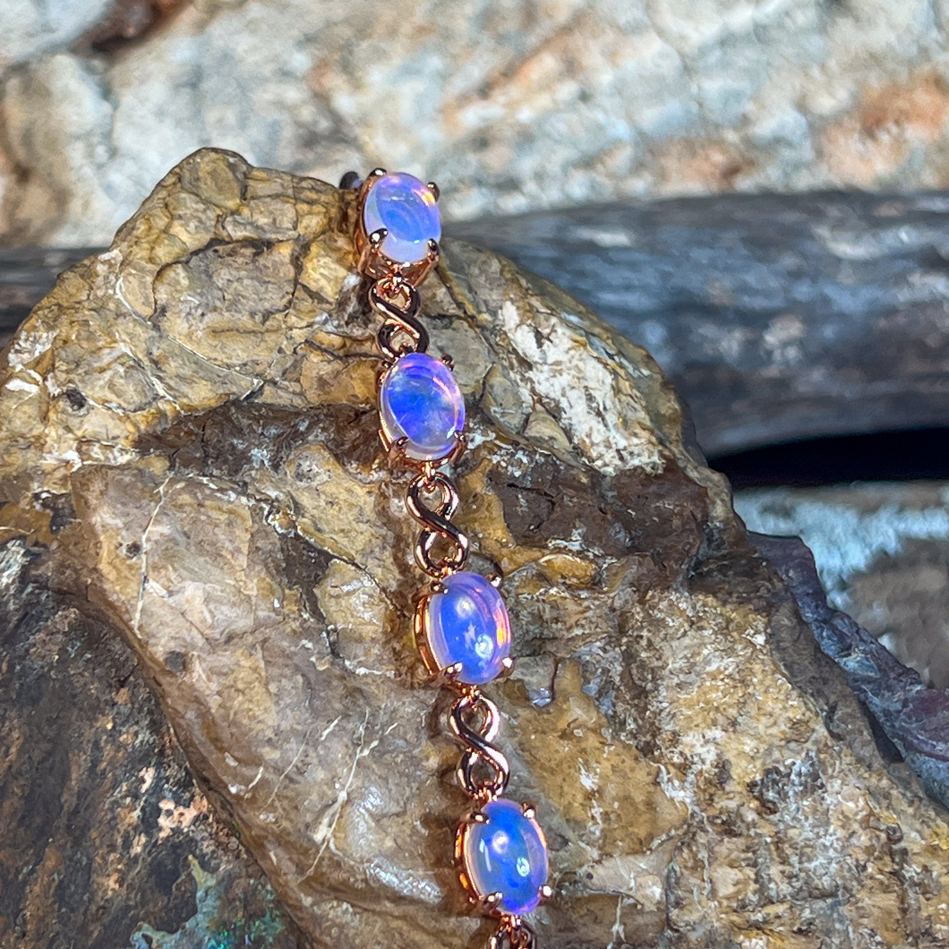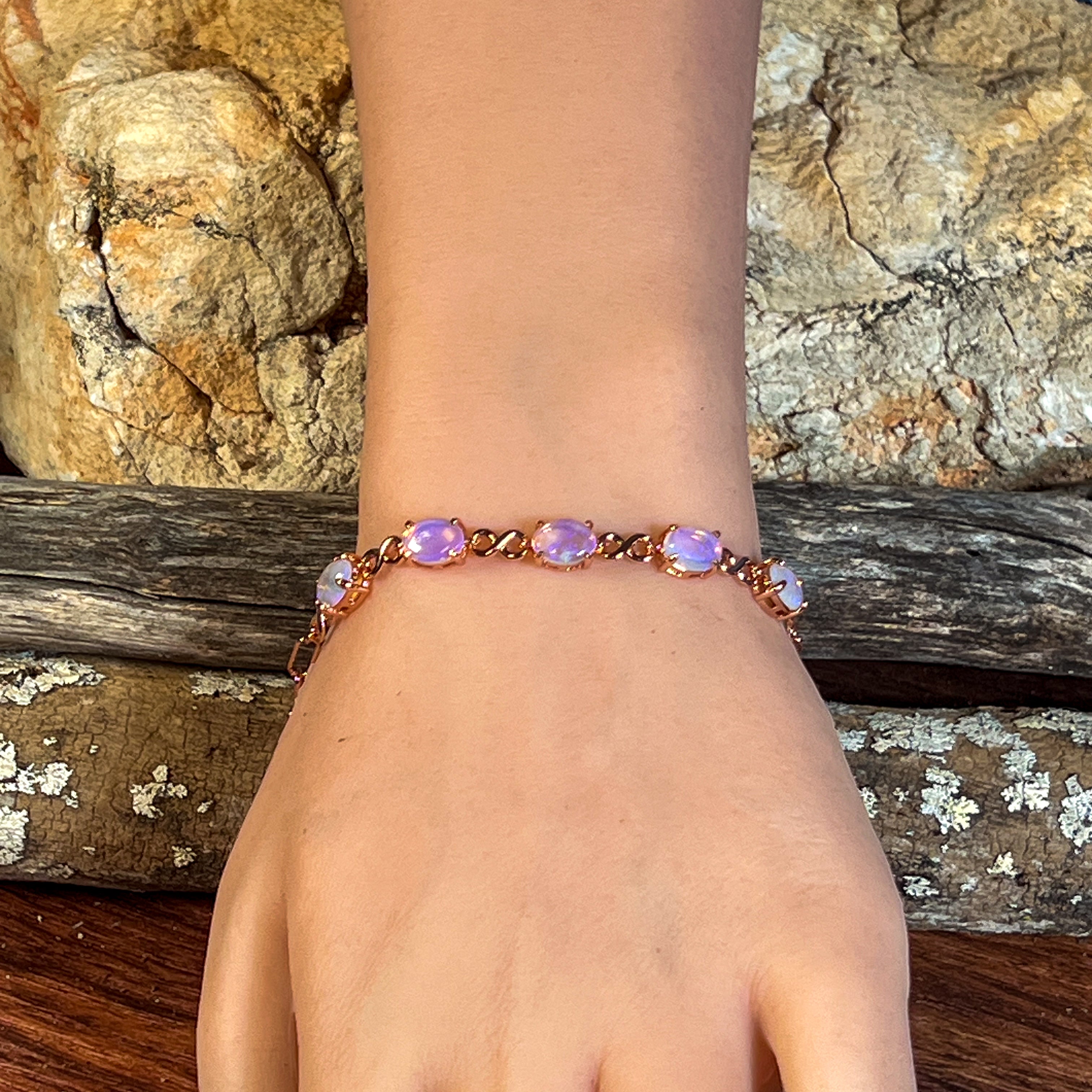 Elevate your style with this Rose Gold Plated Silver bracelet featuring a delicate 8x6mm light opal set in an elegant infinity design. The shimmering opal adds a touch of timeless beauty, while the rose gold plating offers a warm, modern finish. Perfect for everyday wear or special occasions, this bracelet symbolizes endless elegance and grace.
