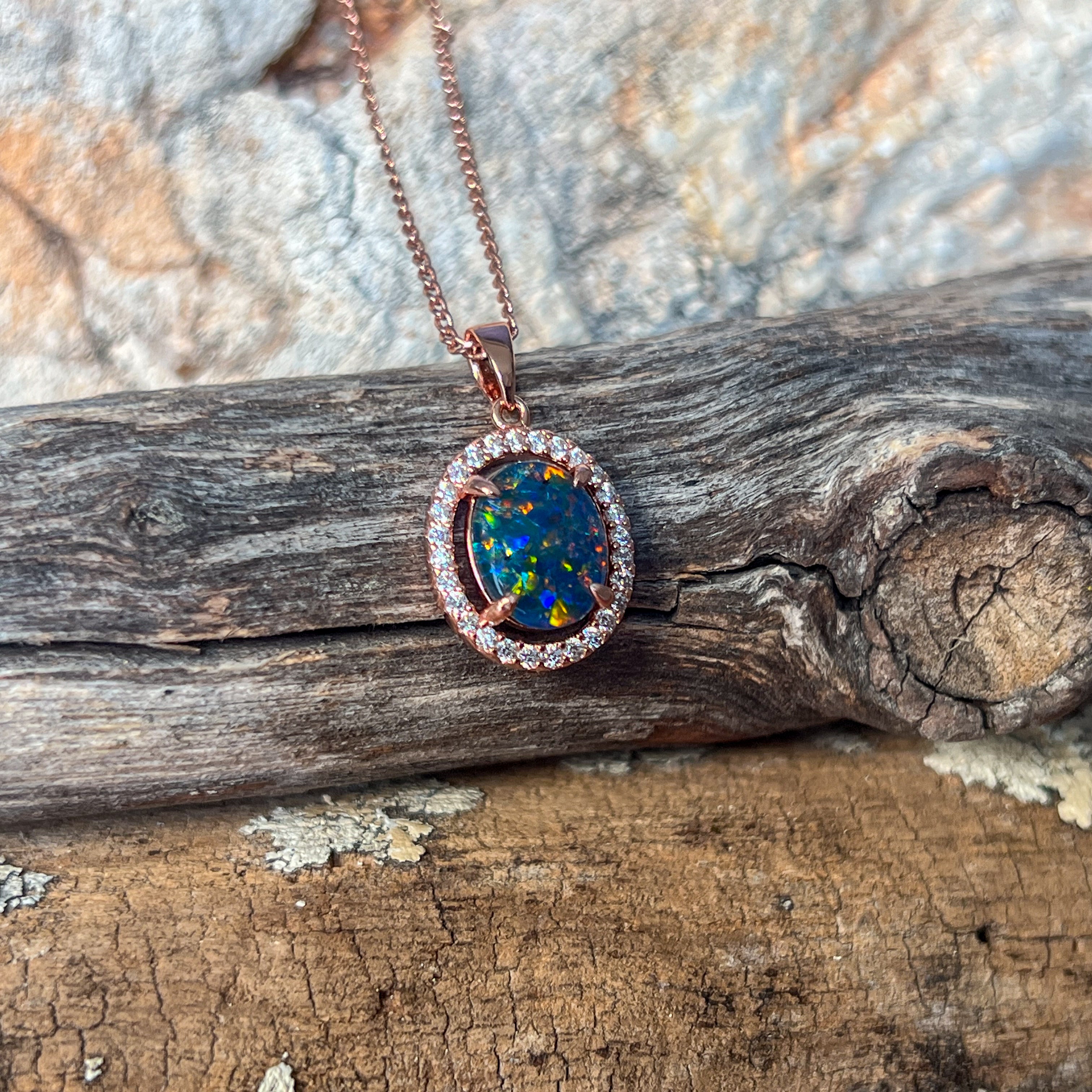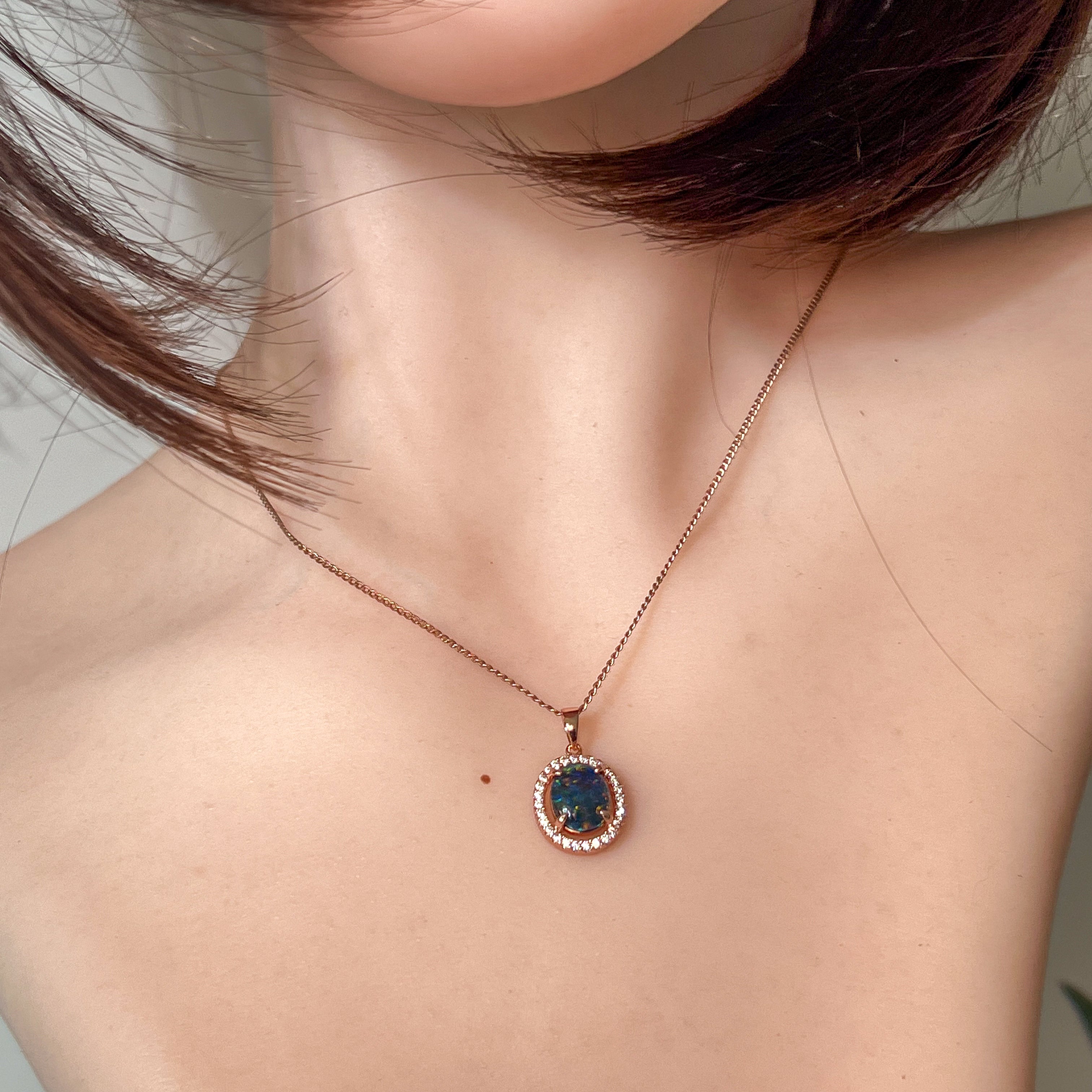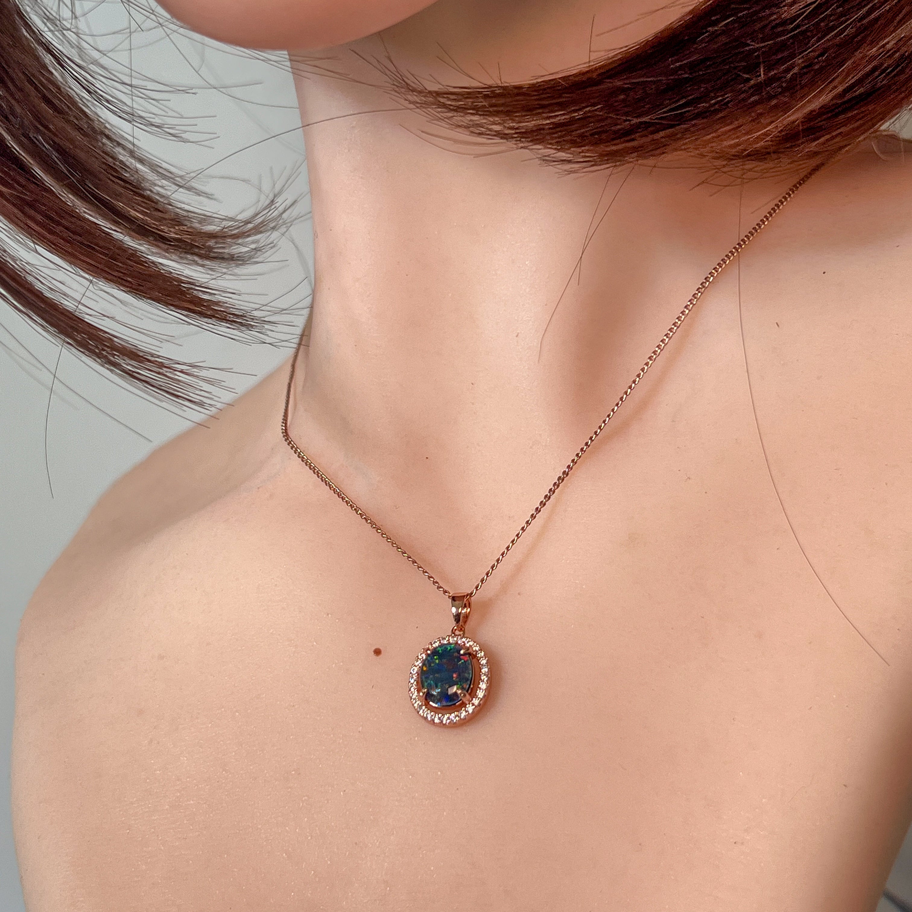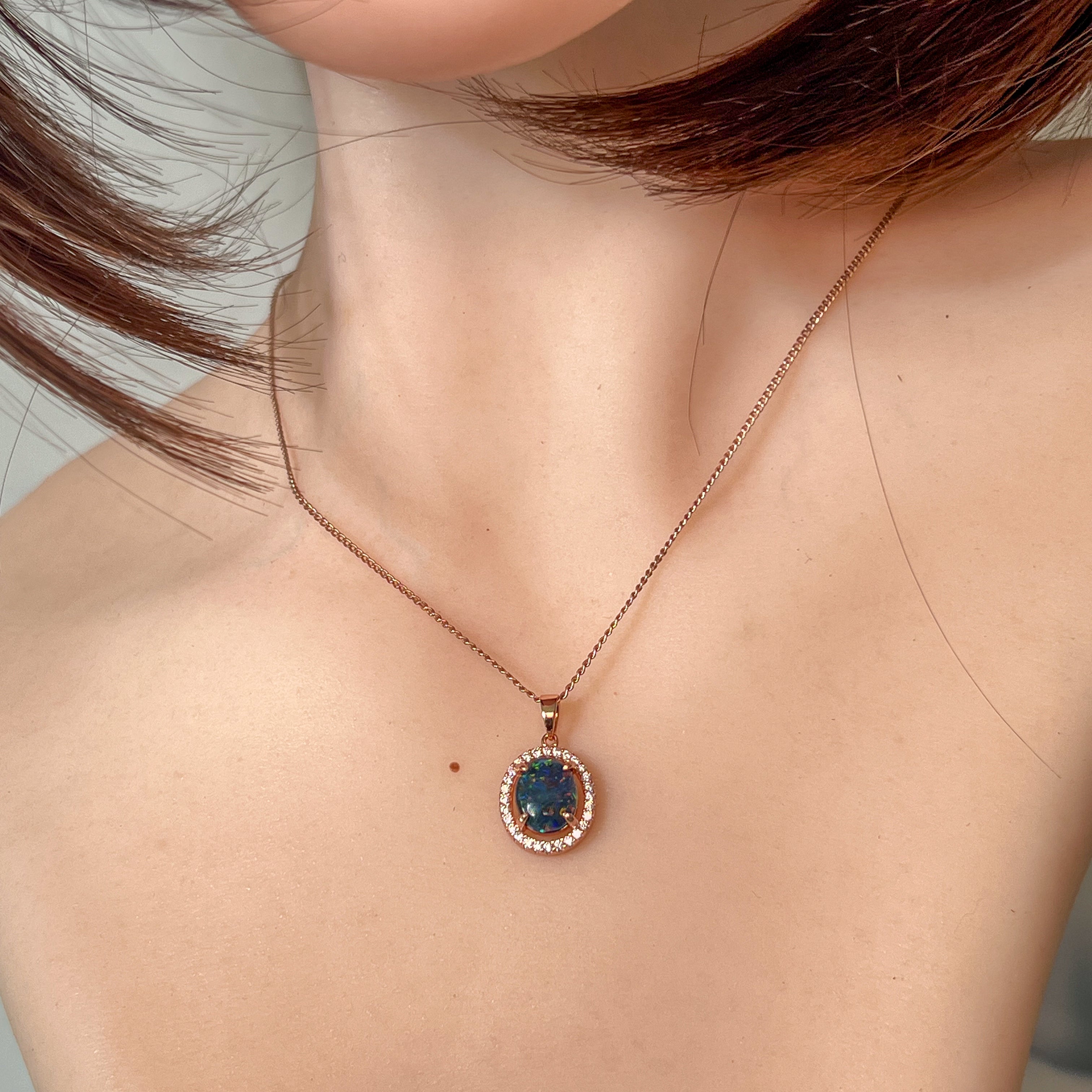 This rose gold plated silver pendant showcases a radiant 10x8mm opal encircled by a delicate halo, making it a thoughtful gift for her. Its elegant design adds a touch of charm and sophistication, perfect for expressing your care and admiration. Whether for daily wear or special moments, this necklace is a beautiful way to celebrate someone special in your life.
