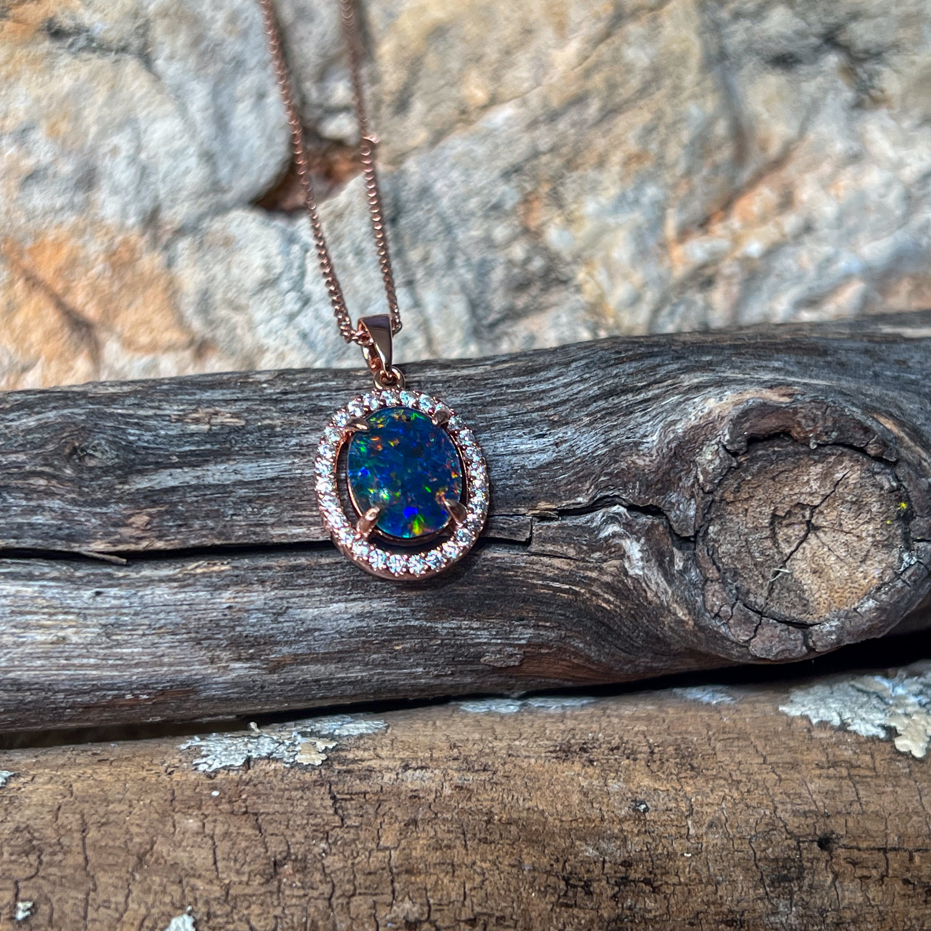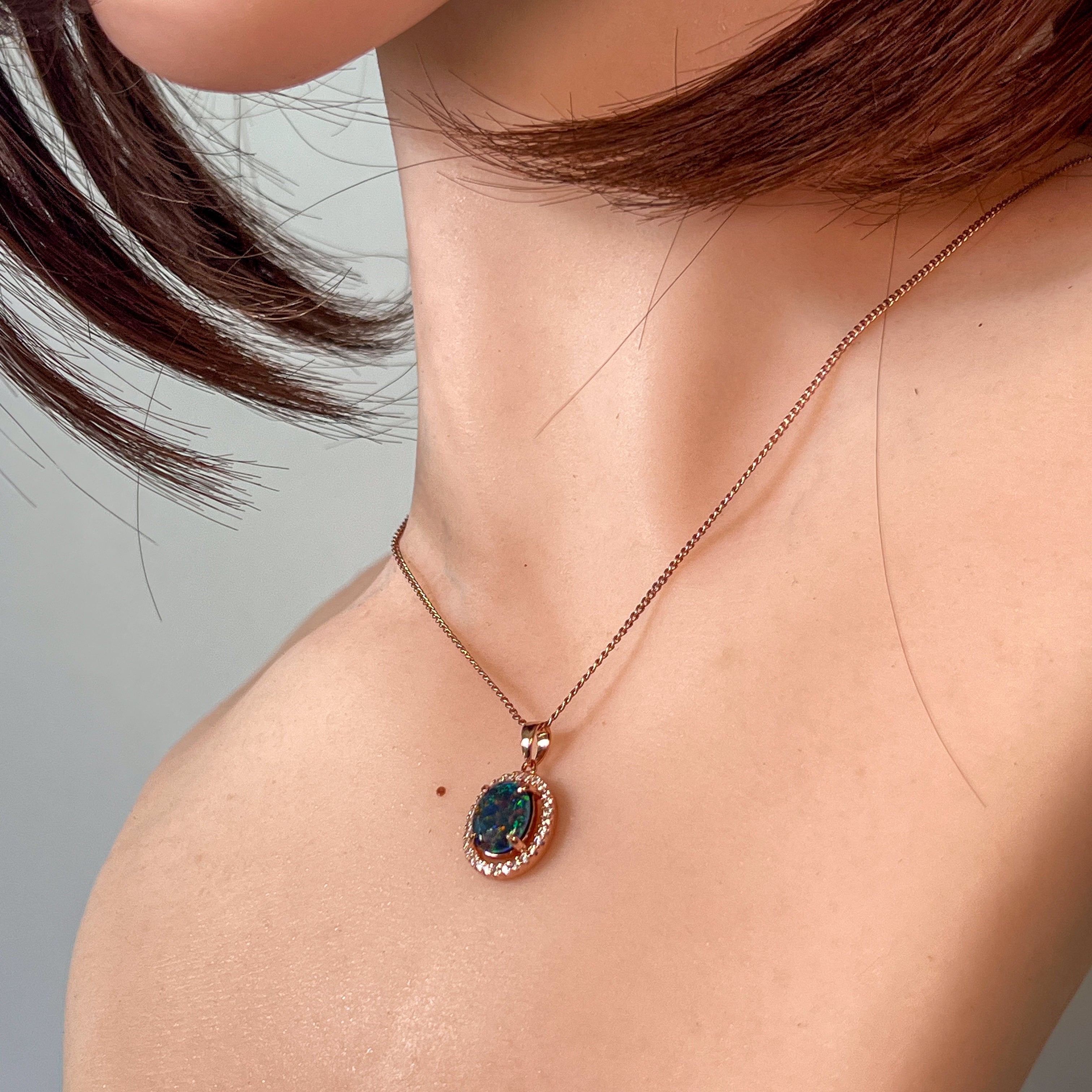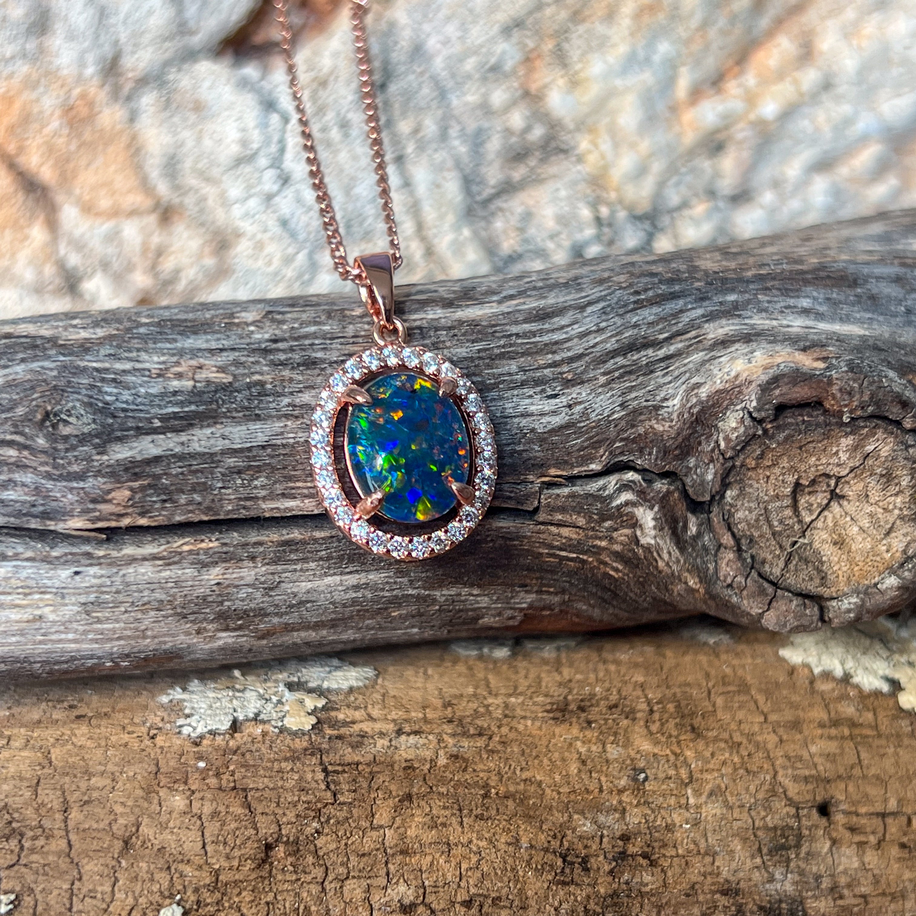 This rose gold plated silver pendant showcases a radiant 10x8mm opal encircled by a delicate halo, making it a thoughtful gift for her. Its elegant design adds a touch of charm and sophistication, perfect for expressing your care and admiration. Whether for daily wear or special moments, this necklace is a beautiful way to celebrate someone special in your life.