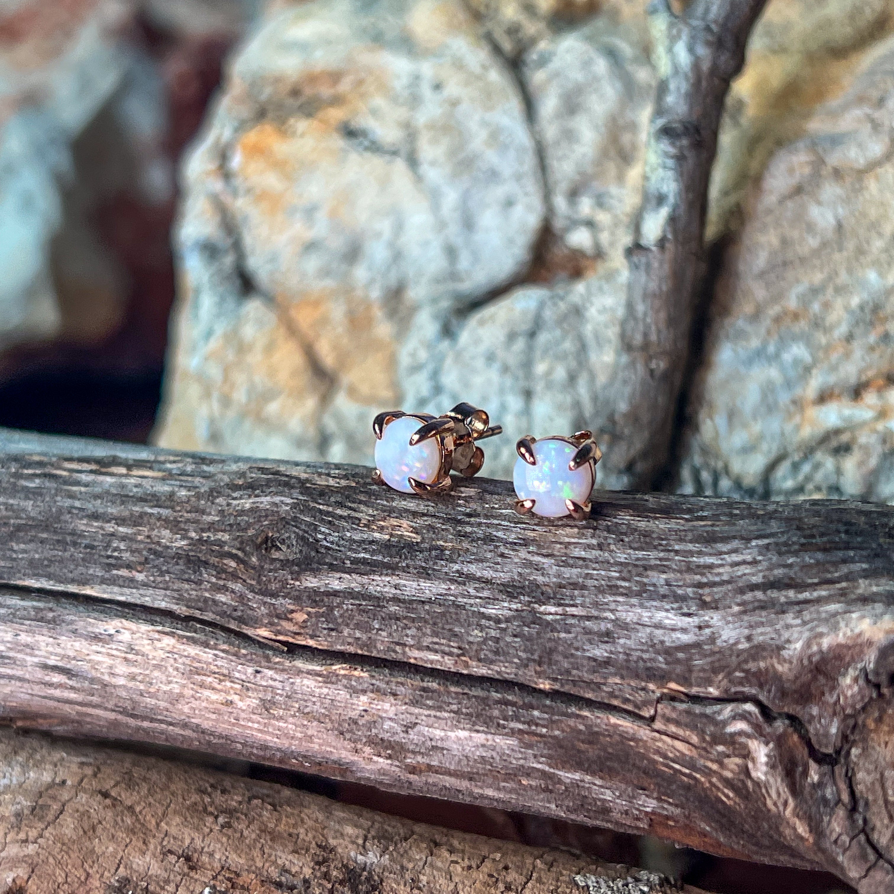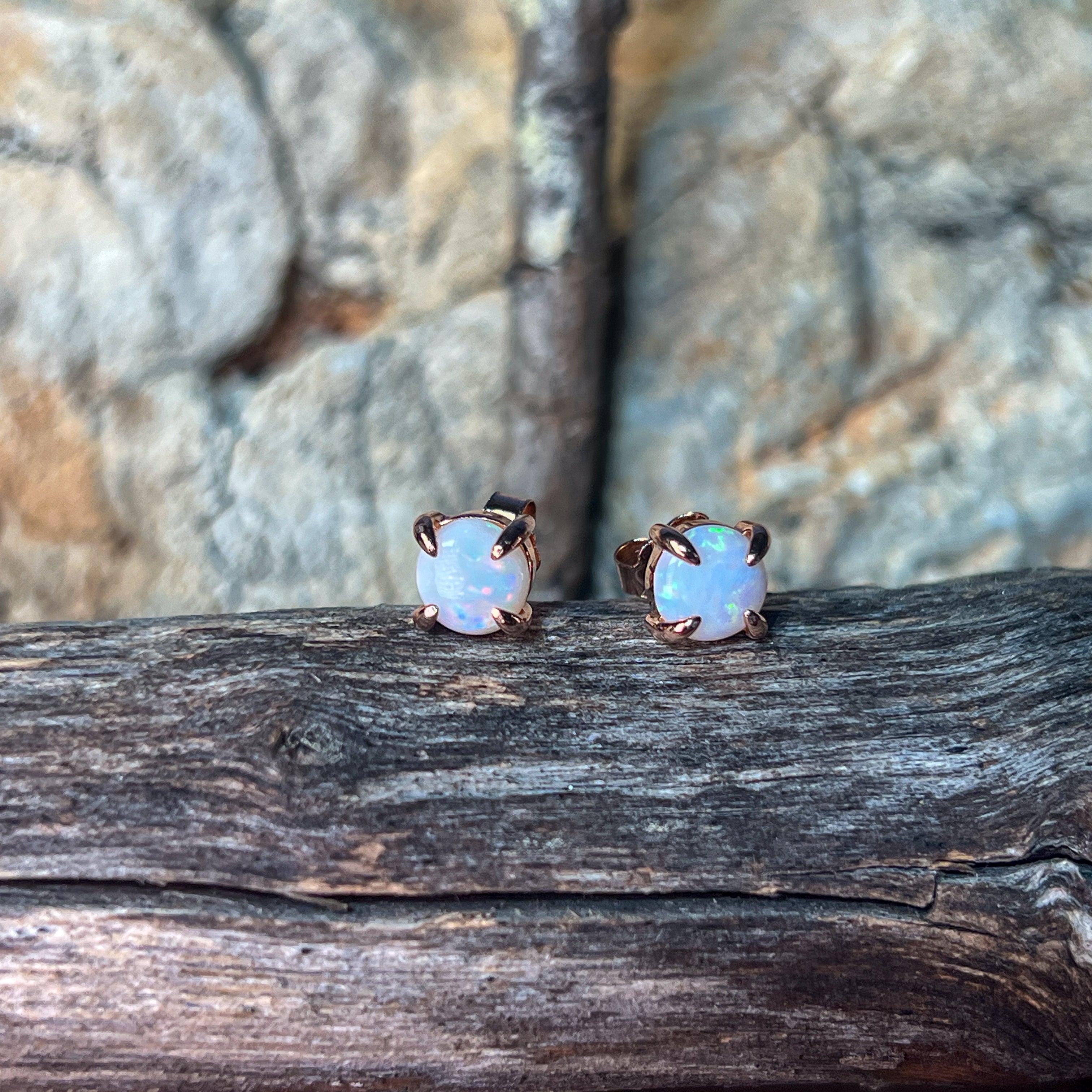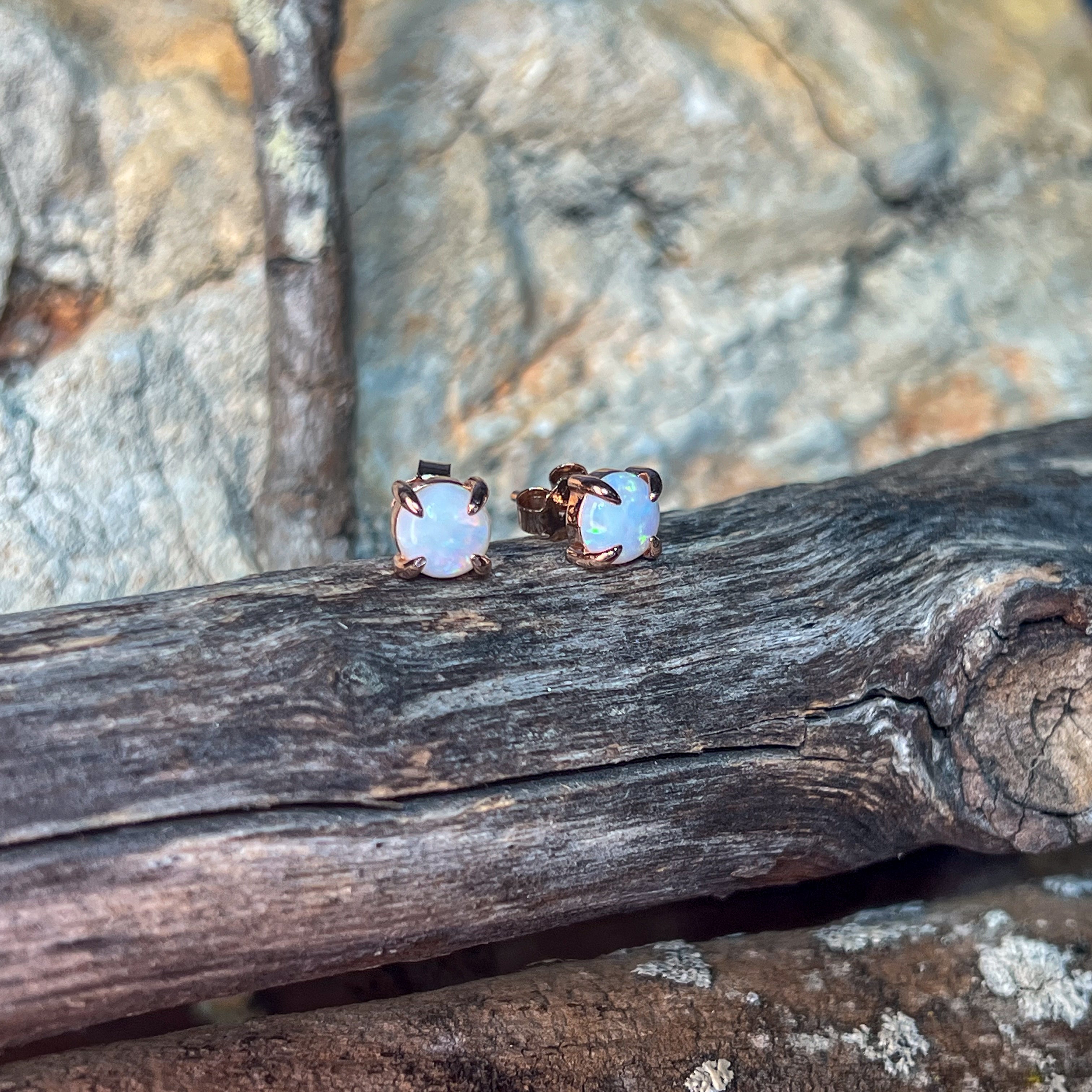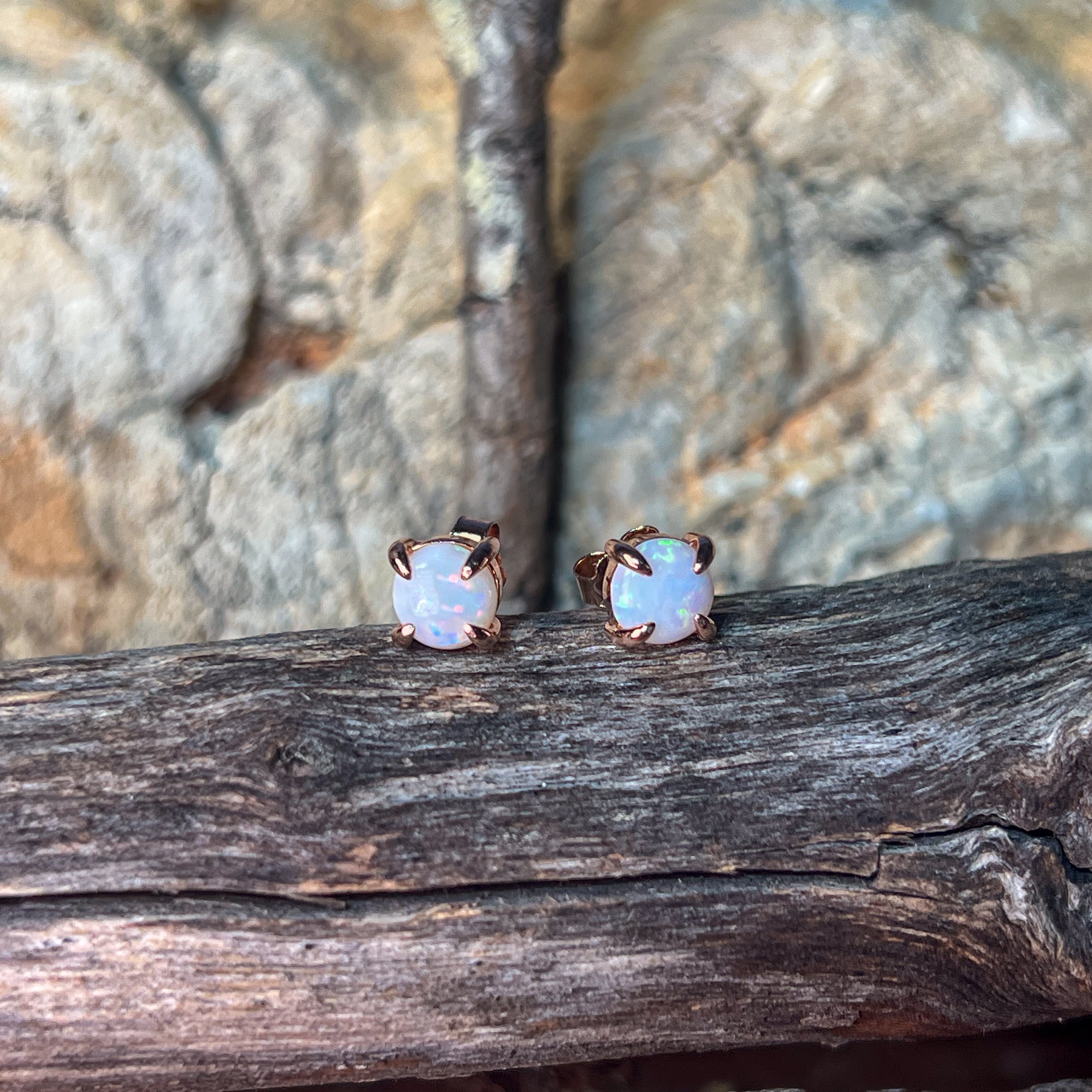 Rose Gold plated Sterling Silver Round 6mm White Opal claw studs