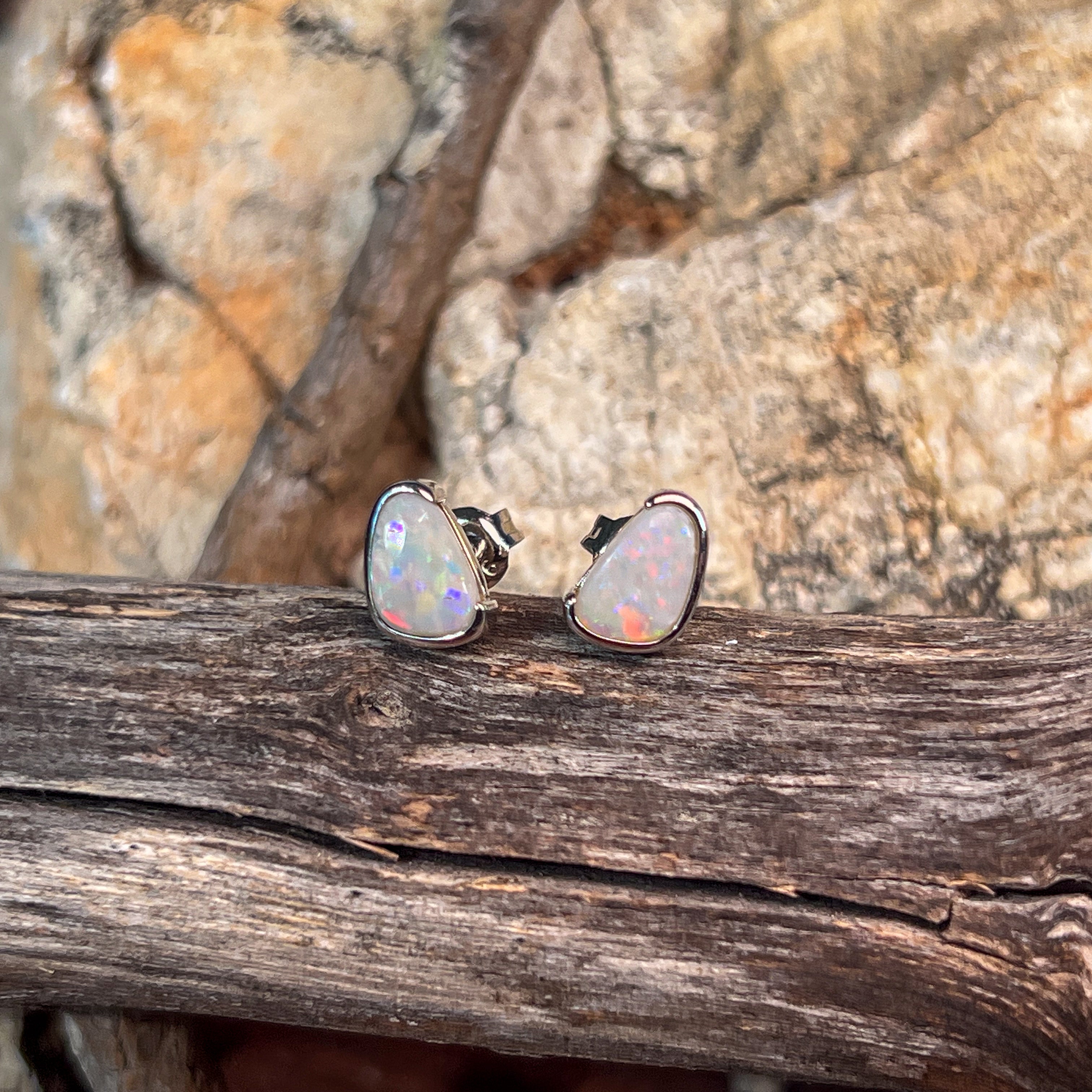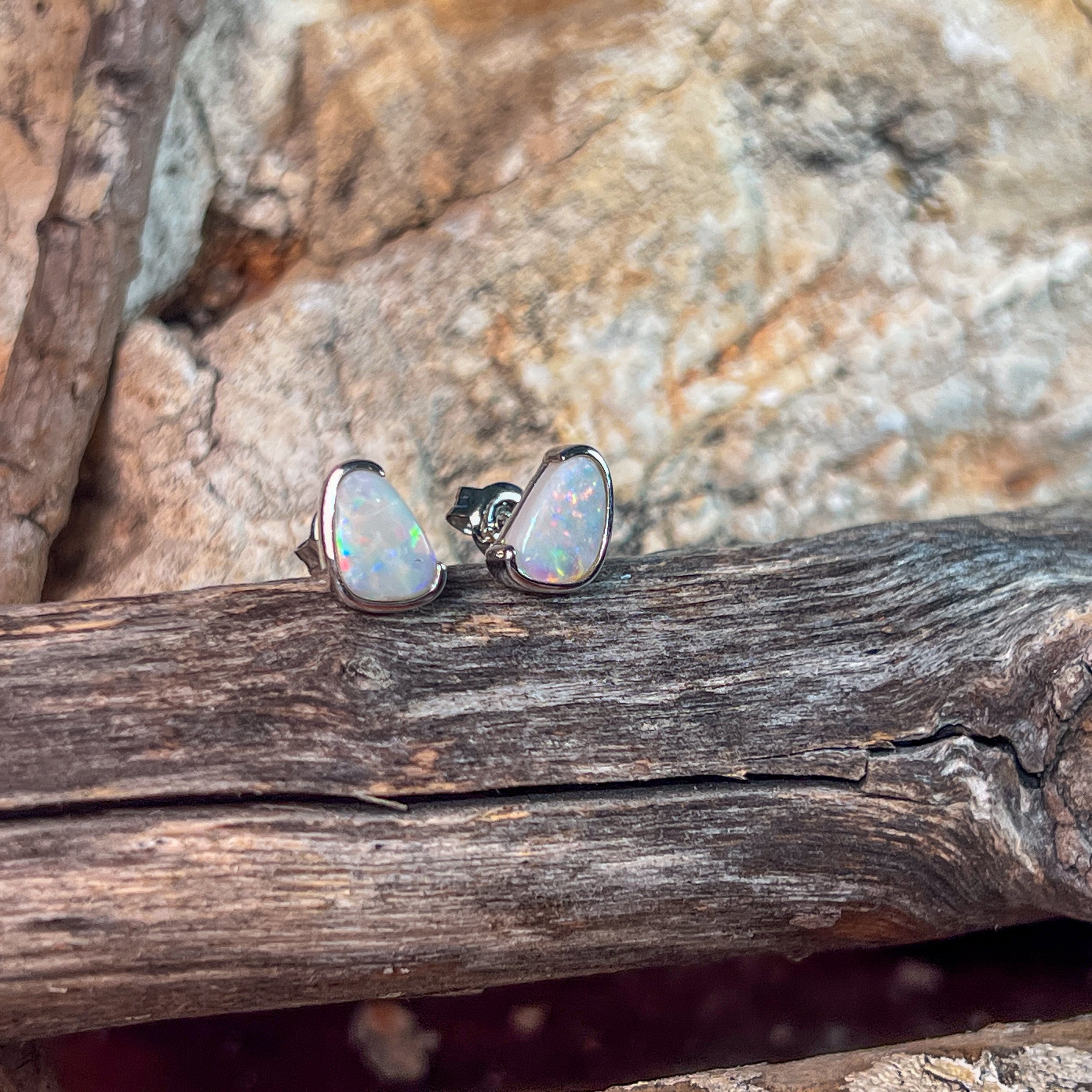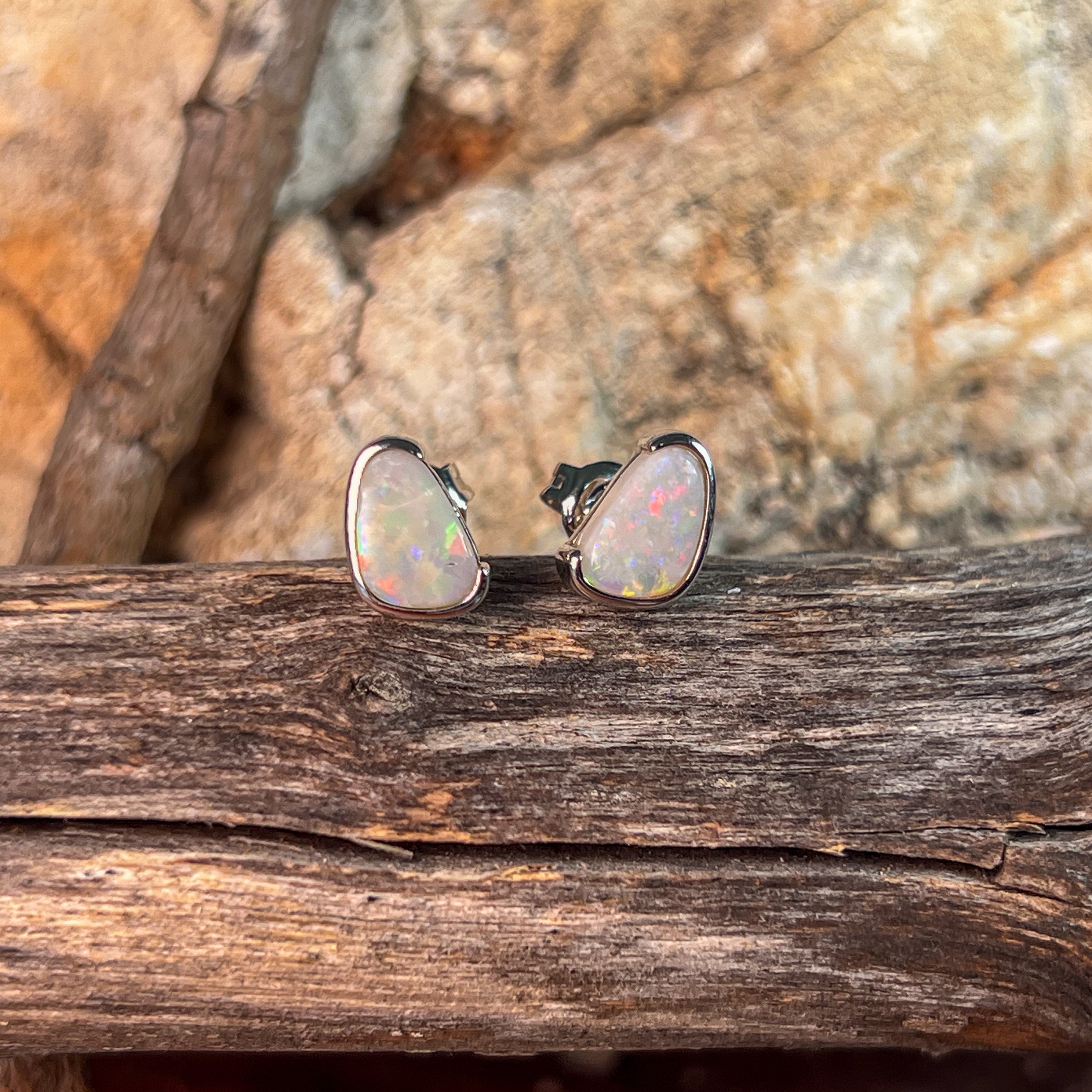 Embrace your unique style with these Silver White Opal half bezel studs. Featuring 1.62 carats of freeform opals, each earring showcases its own distinct shape and shimmering colors. Perfect for those who love to dare and stand out, these playful studs add an unexpected touch of elegance to any look.