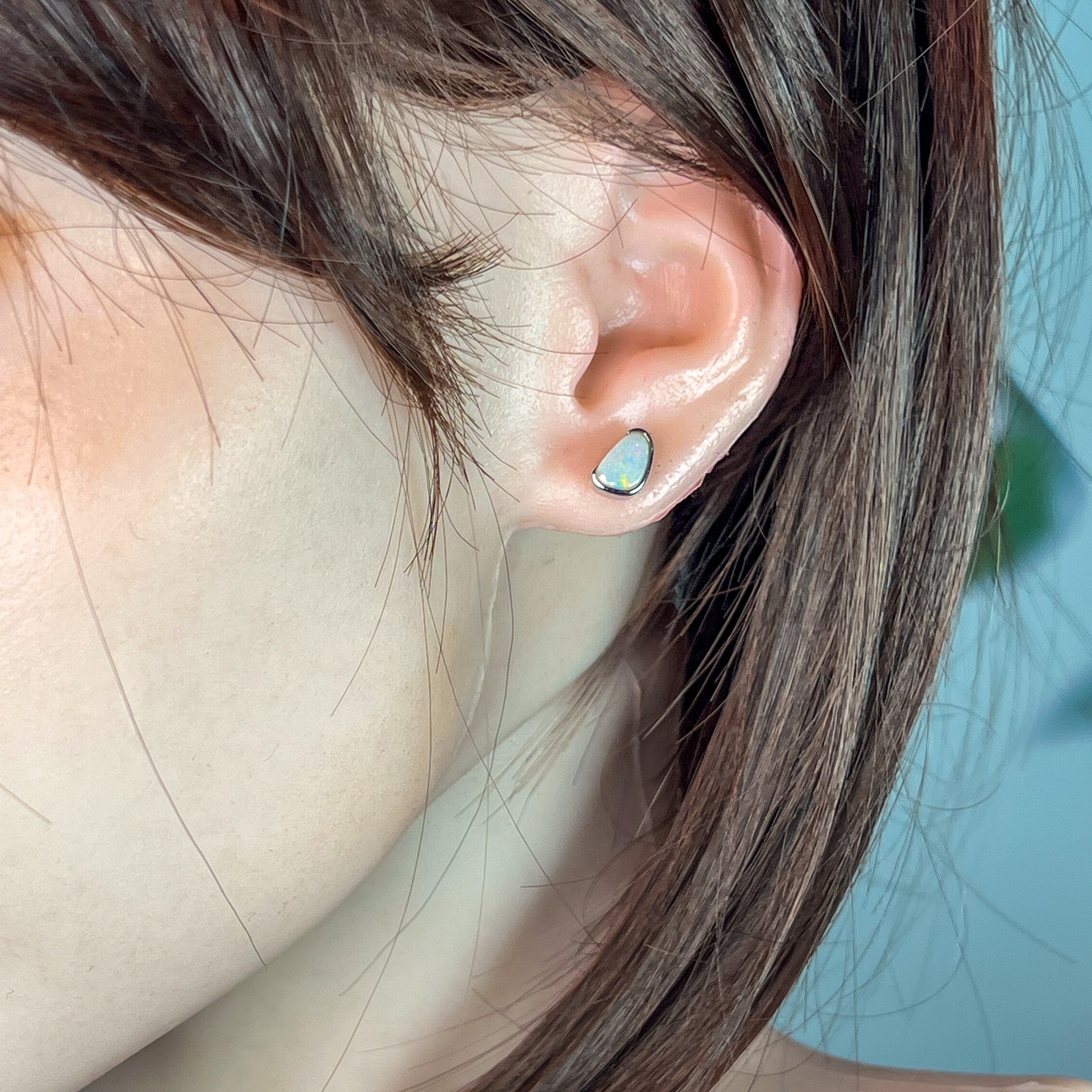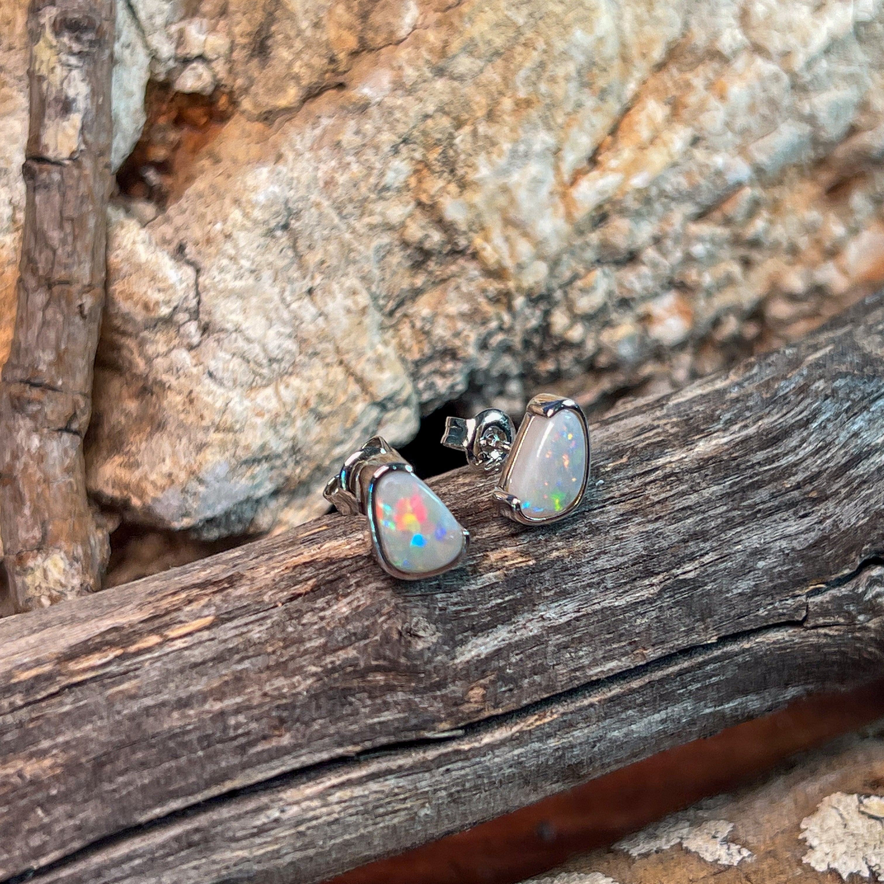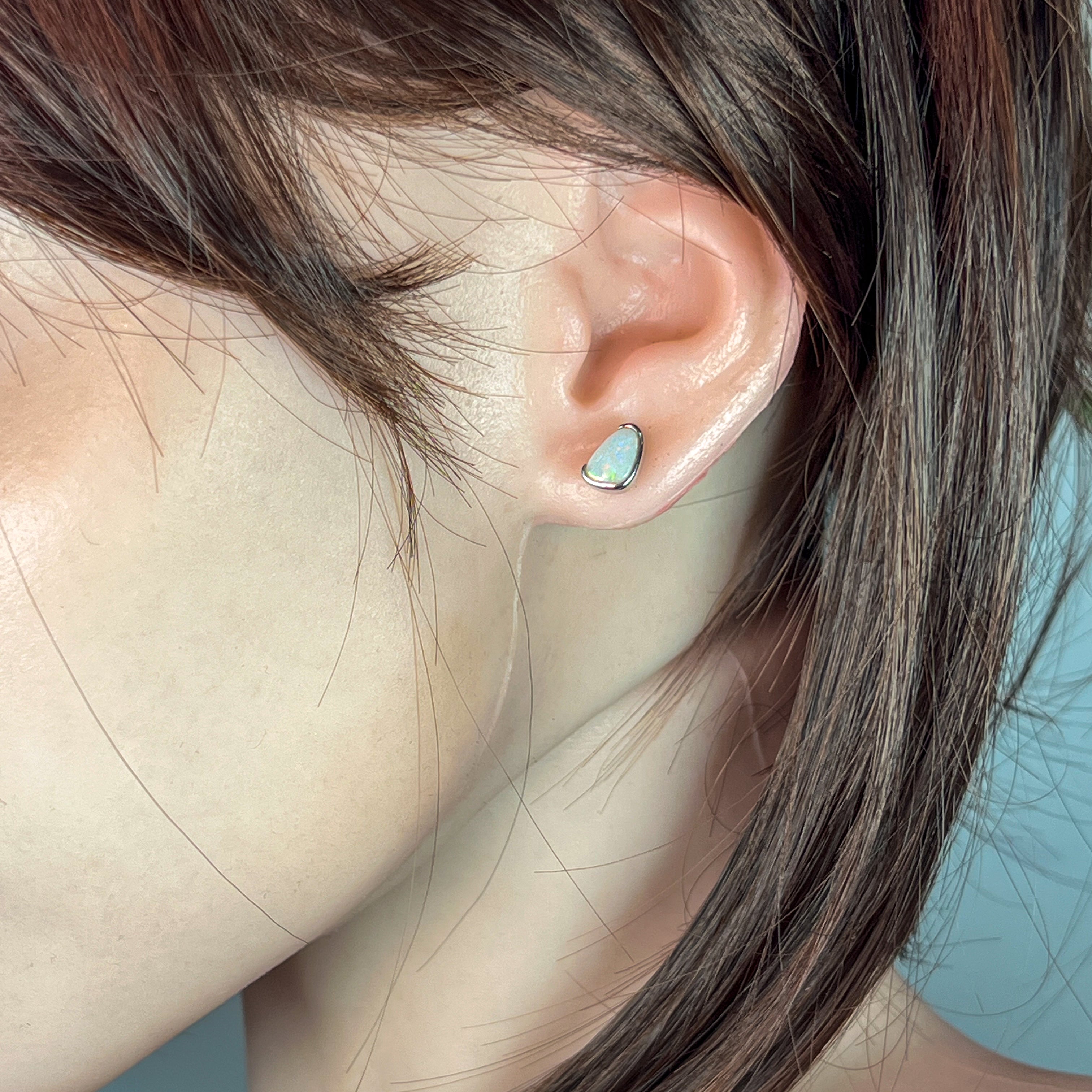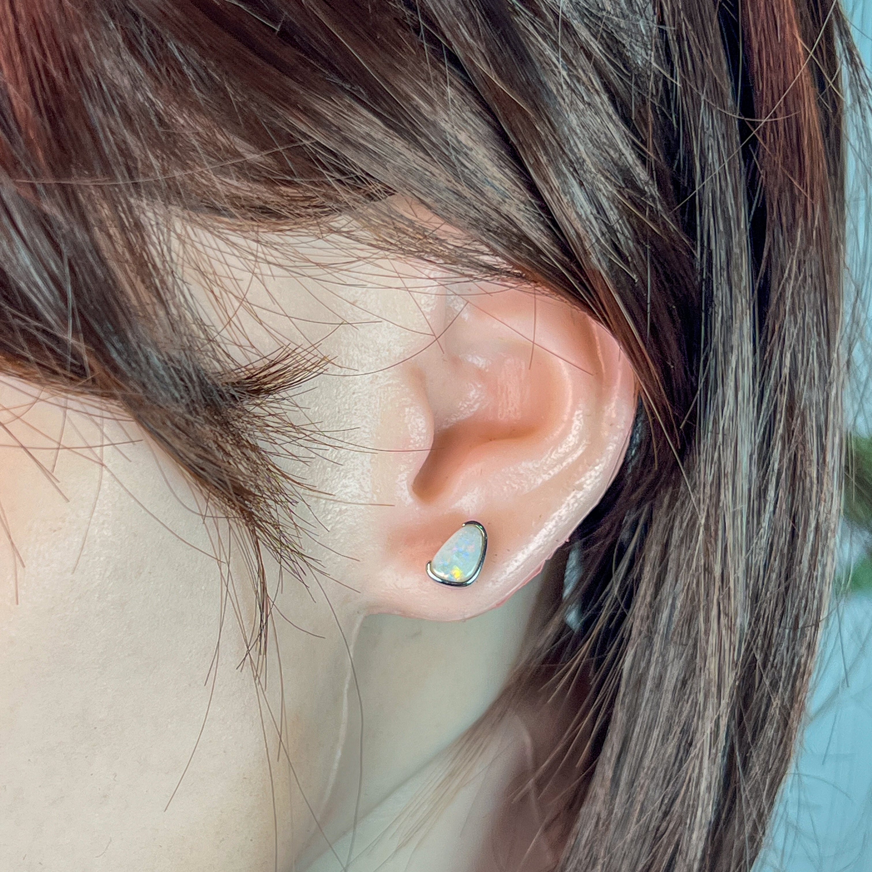 Embrace your unique style with these Silver White Opal half bezel studs. Featuring 1.62 carats of freeform opals, each earring showcases its own distinct shape and shimmering colors. Perfect for those who love to dare and stand out, these playful studs add an unexpected touch of elegance to any look.