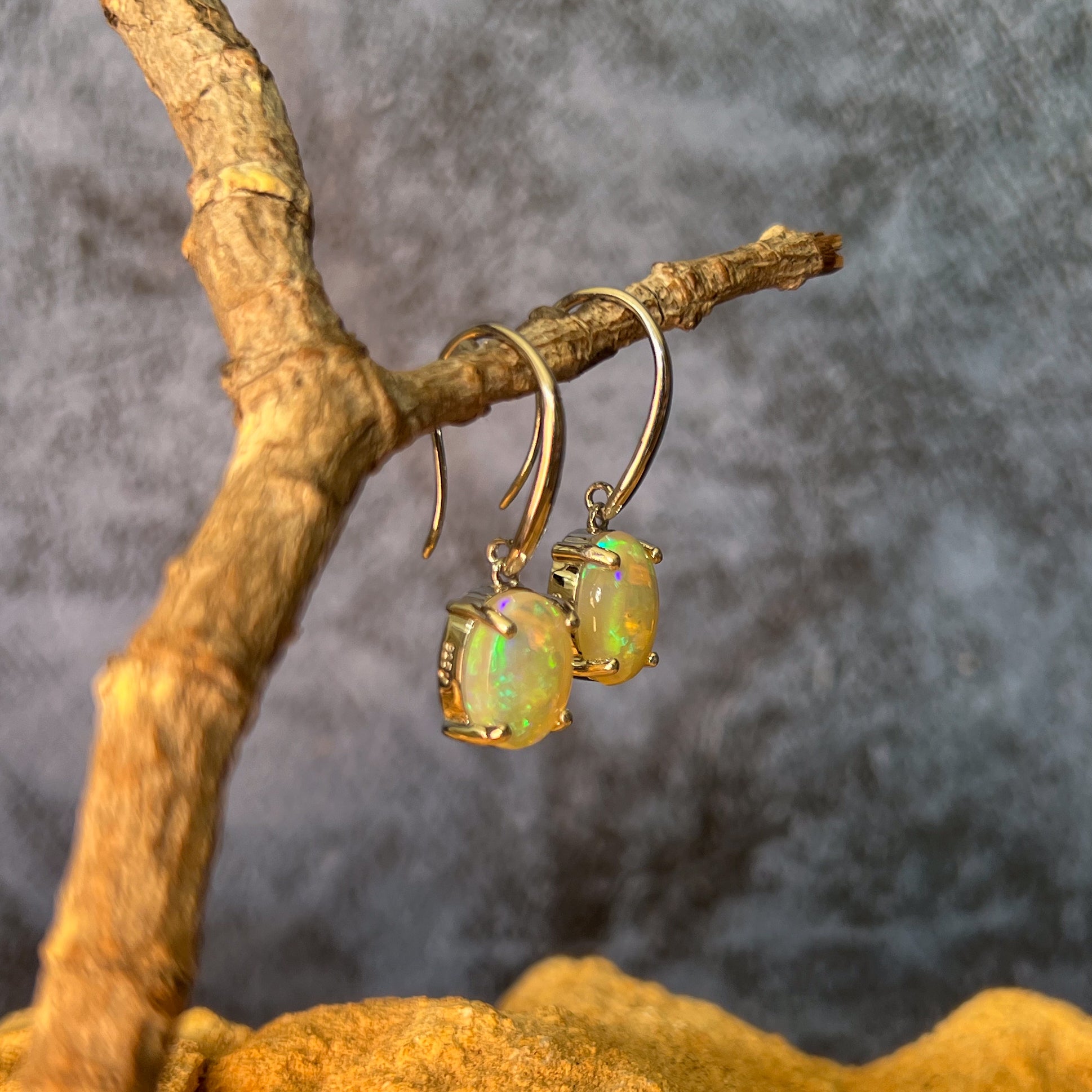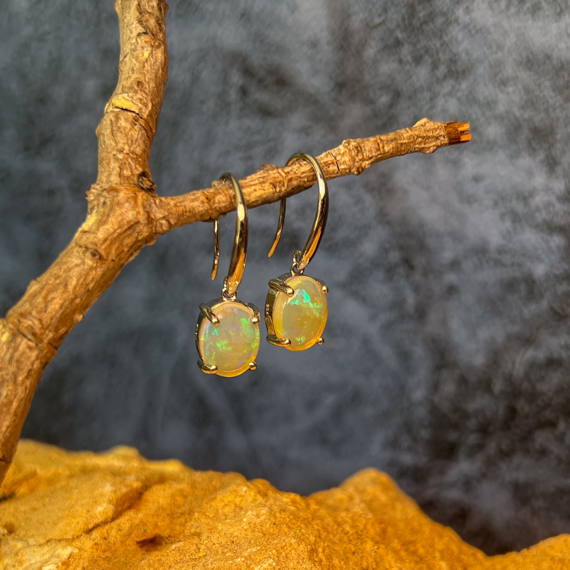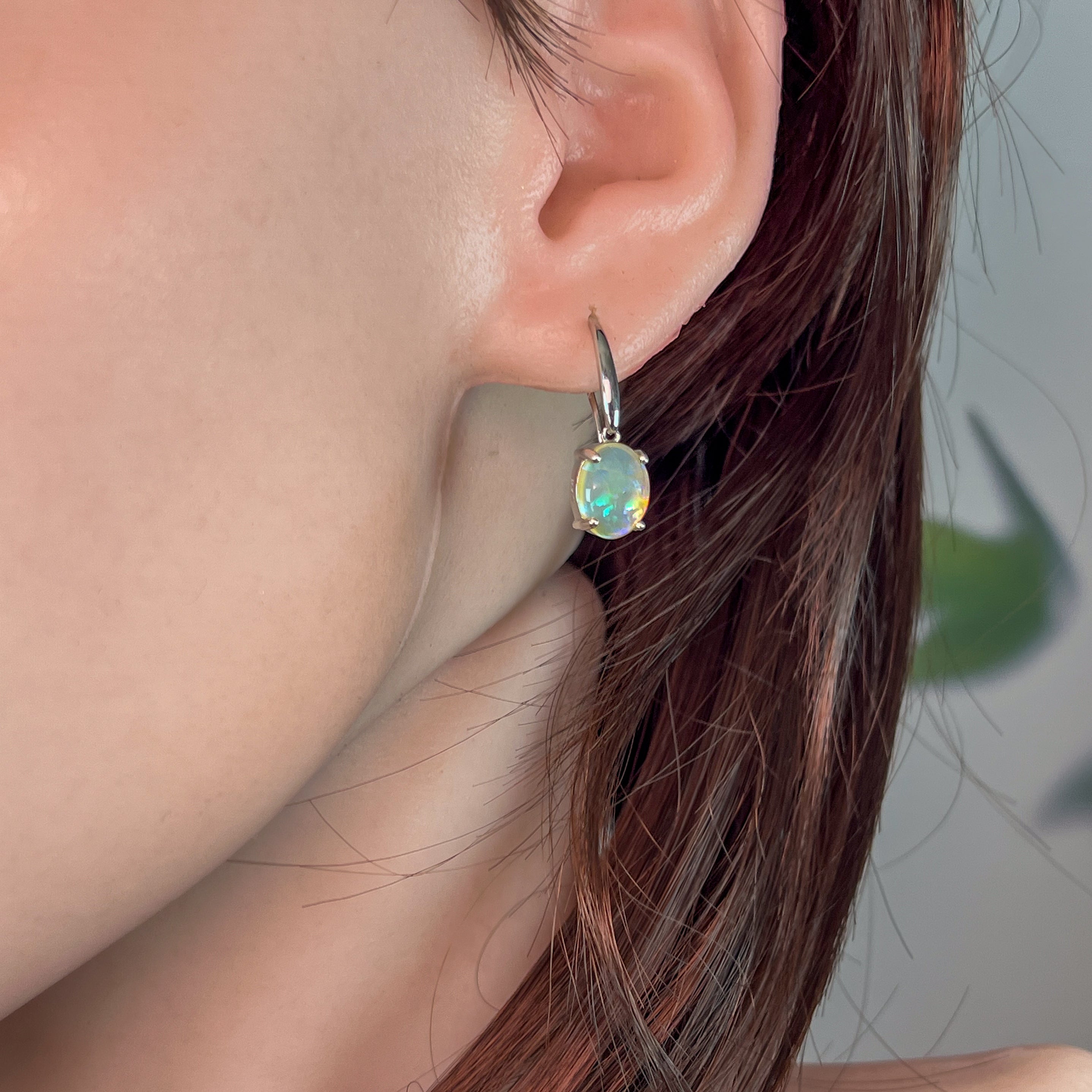 Elevate your style with these sterling silver earrings featuring 10x8mm light opals in captivating green and blue hues. Expertly claw set and designed with elegant dangling hooks, they catch the light beautifully, adding a touch of sophisticated charm to any outfit. Perfect for enhancing your everyday look or making a statement on special occasions.