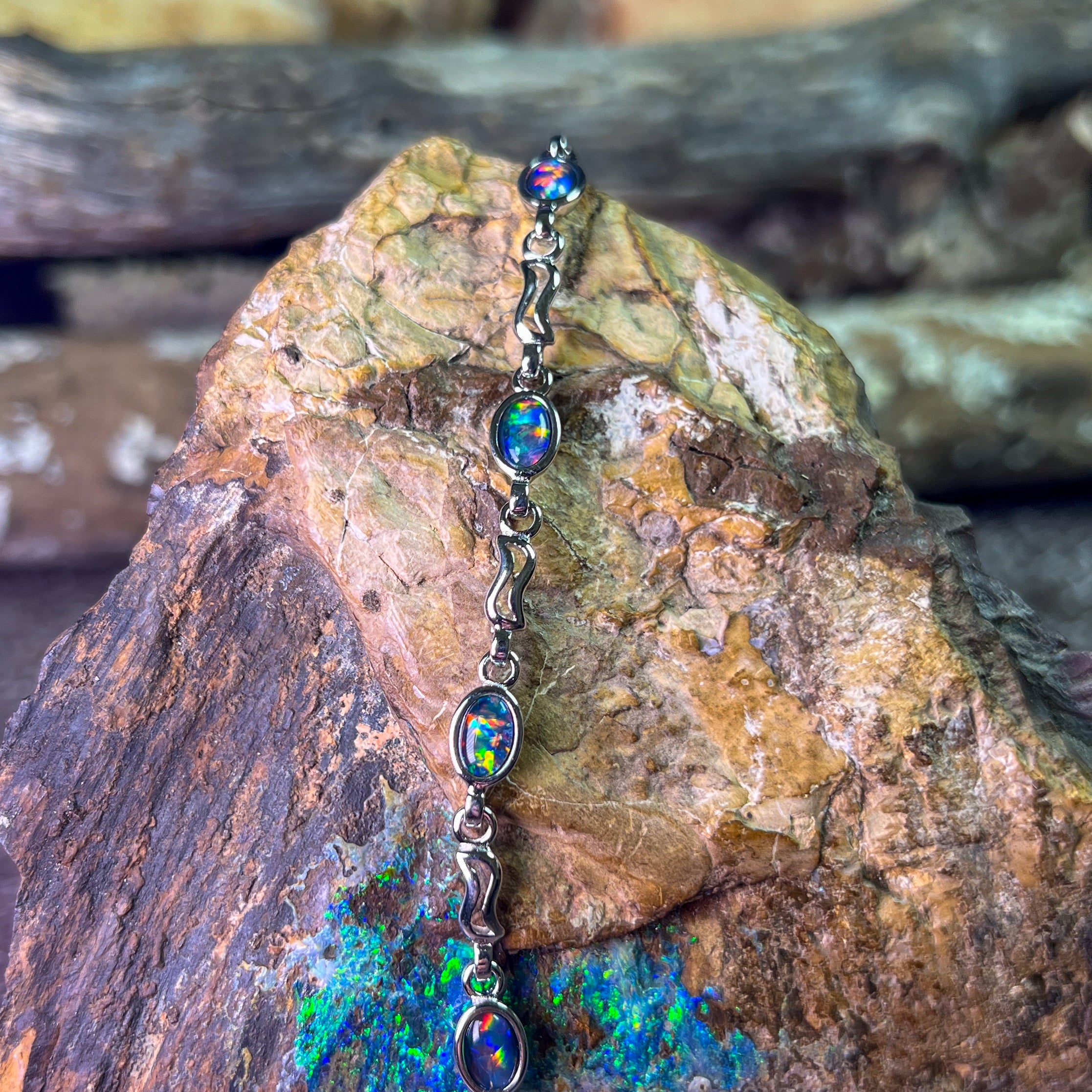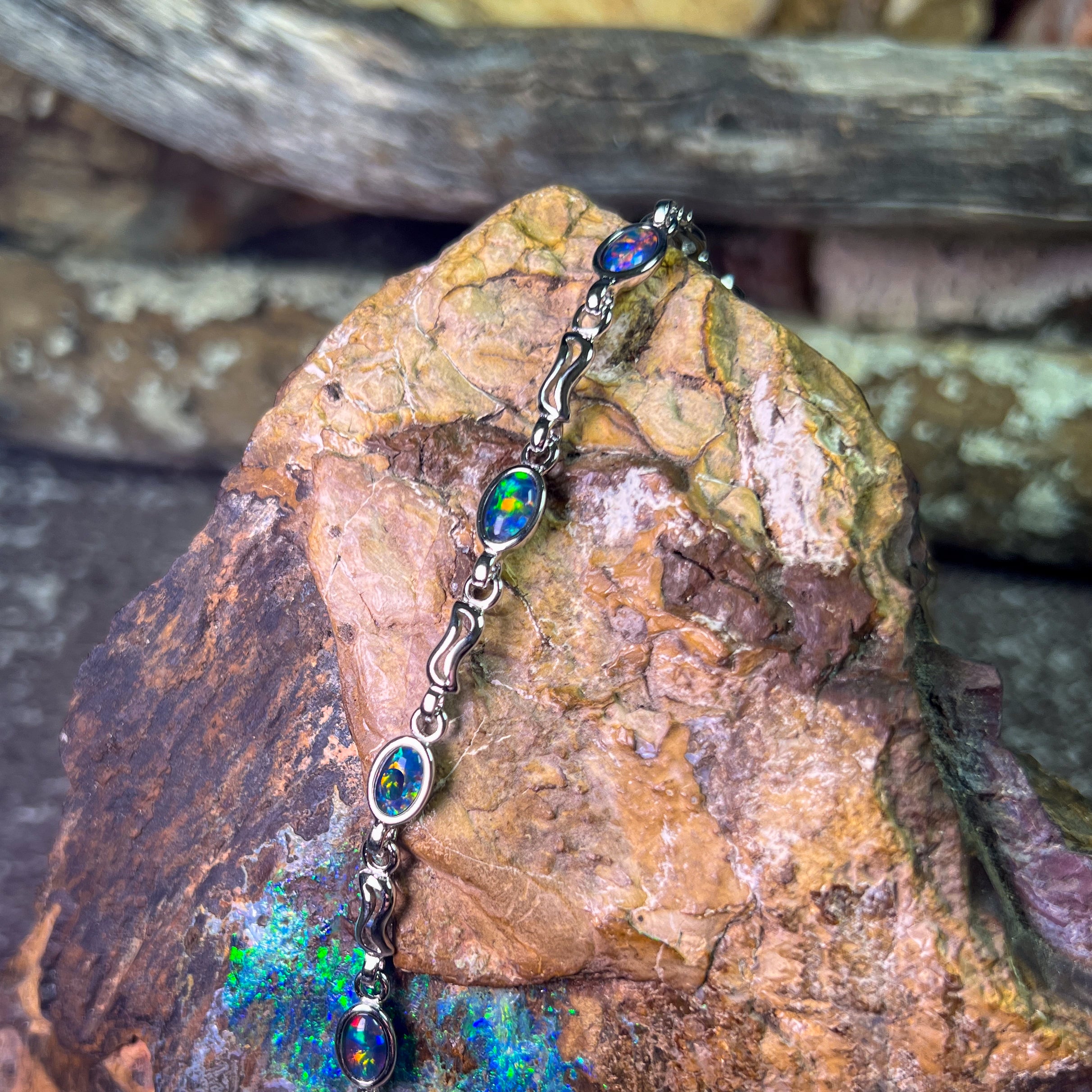 Sparkle and shine with our Sterling Silver Opal triplet bracelet. Featuring a stunning 6x4mm Opal triplet in a range of mesmerizing hues, this bracelet is a must-have for any jewelry collection. Elevate any look with the multi-color rainbow effect of this beautiful gemstone. Let its beauty and iridescence captivate you and those around you!