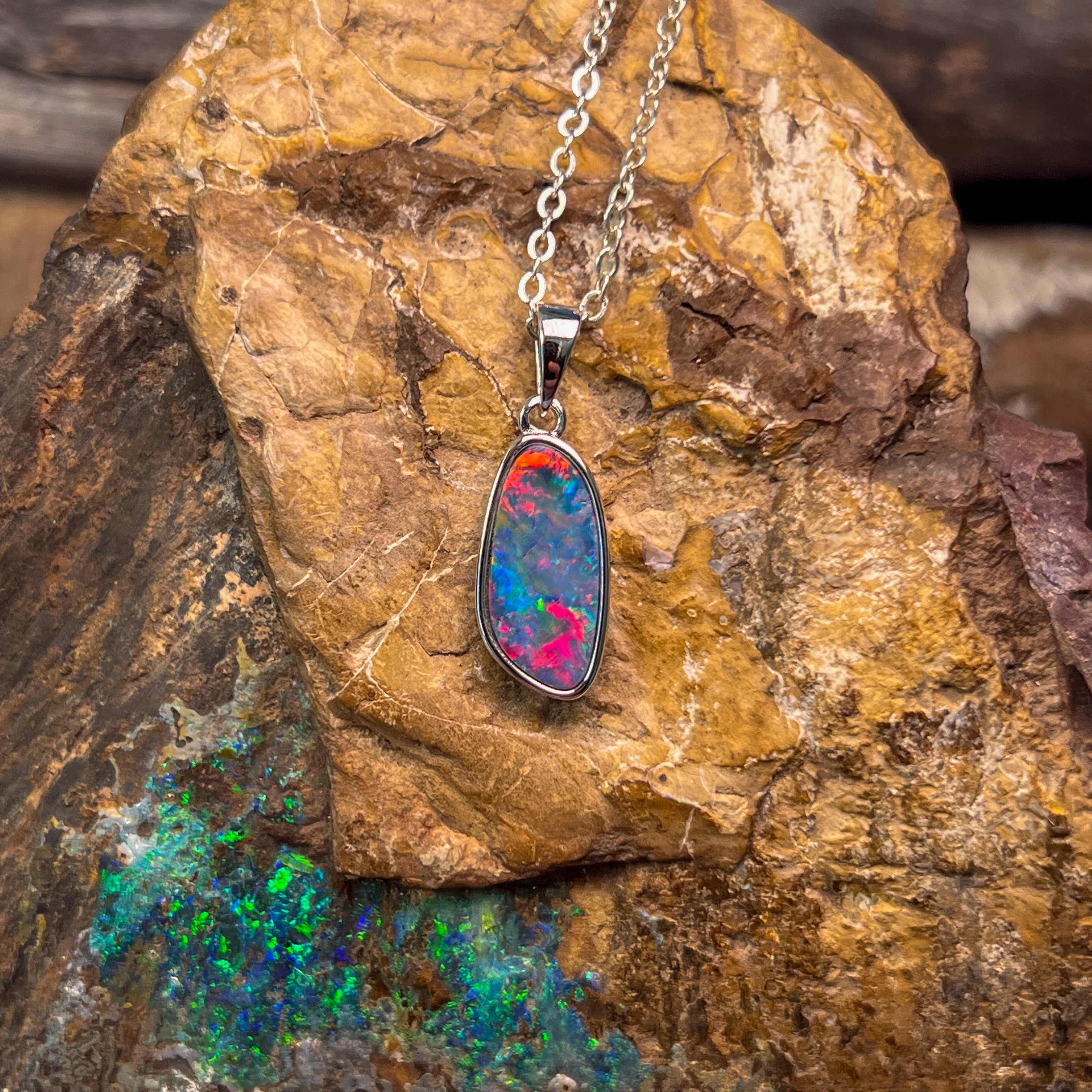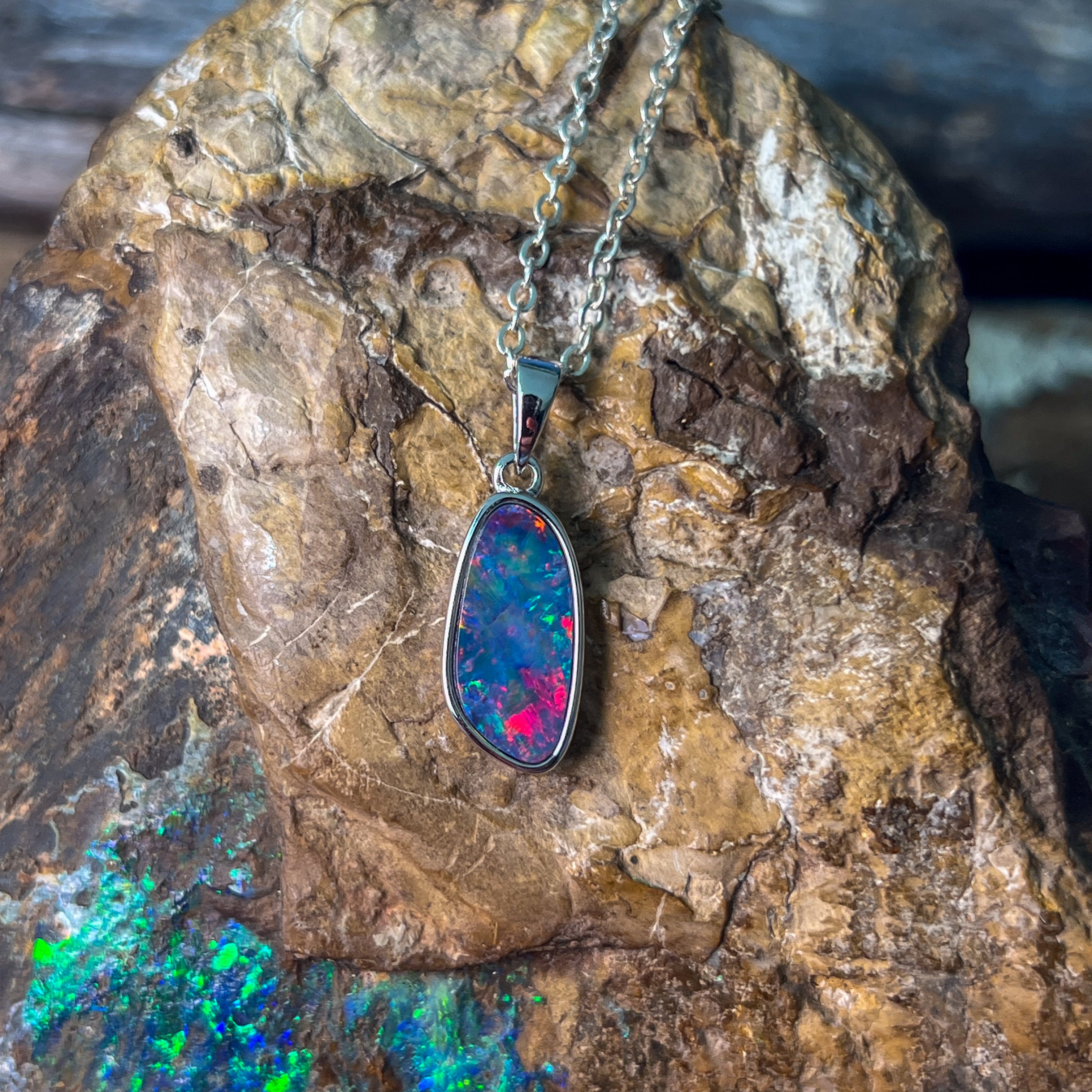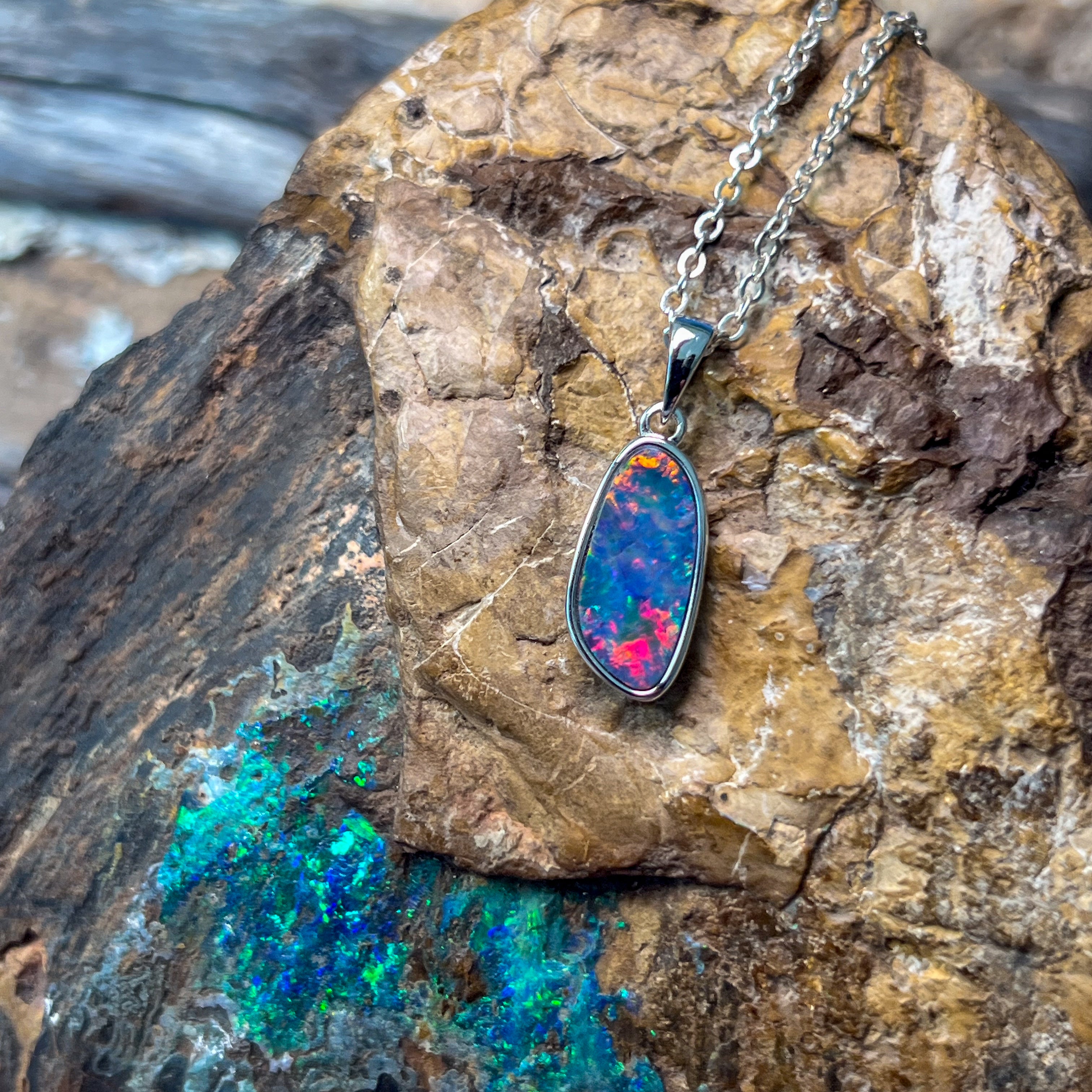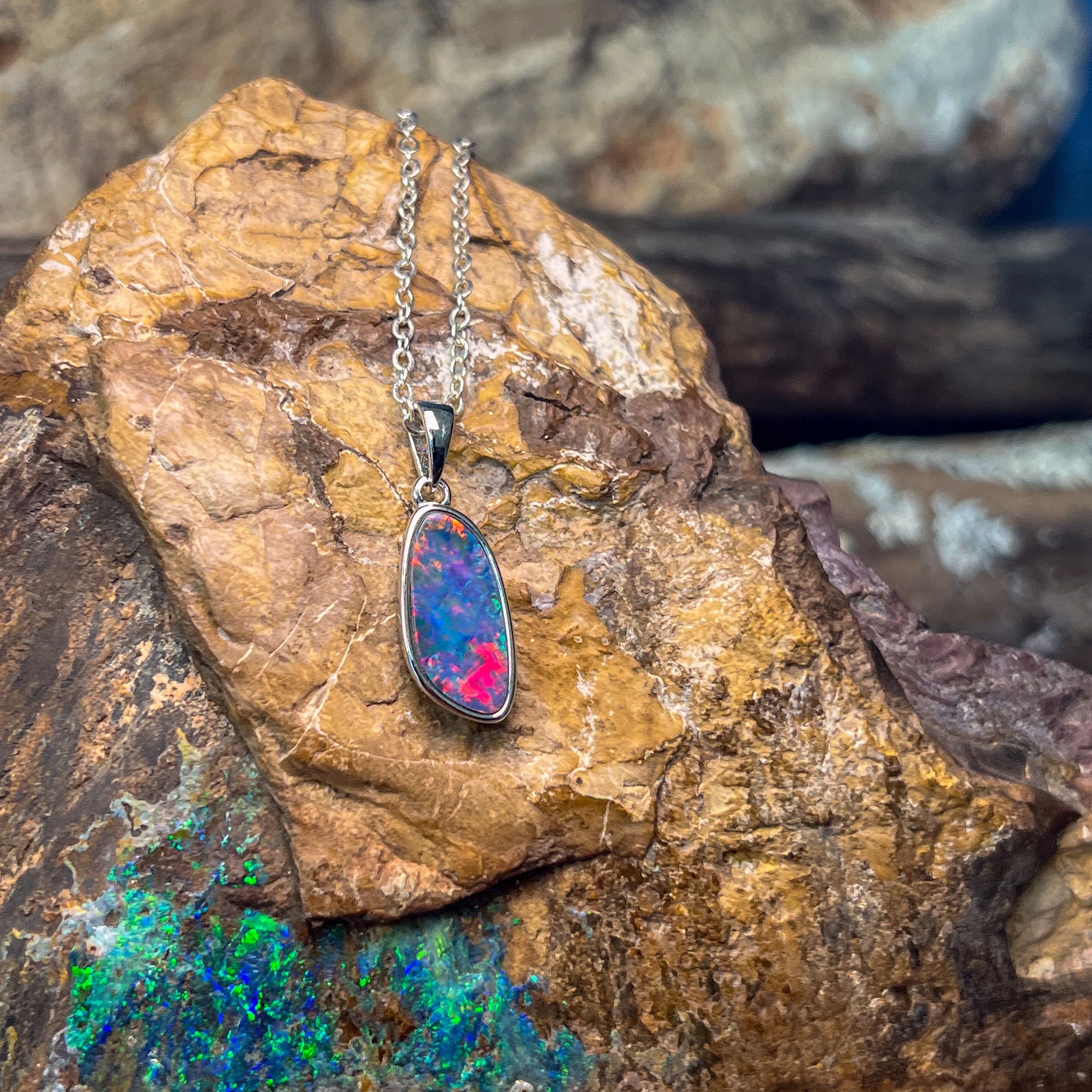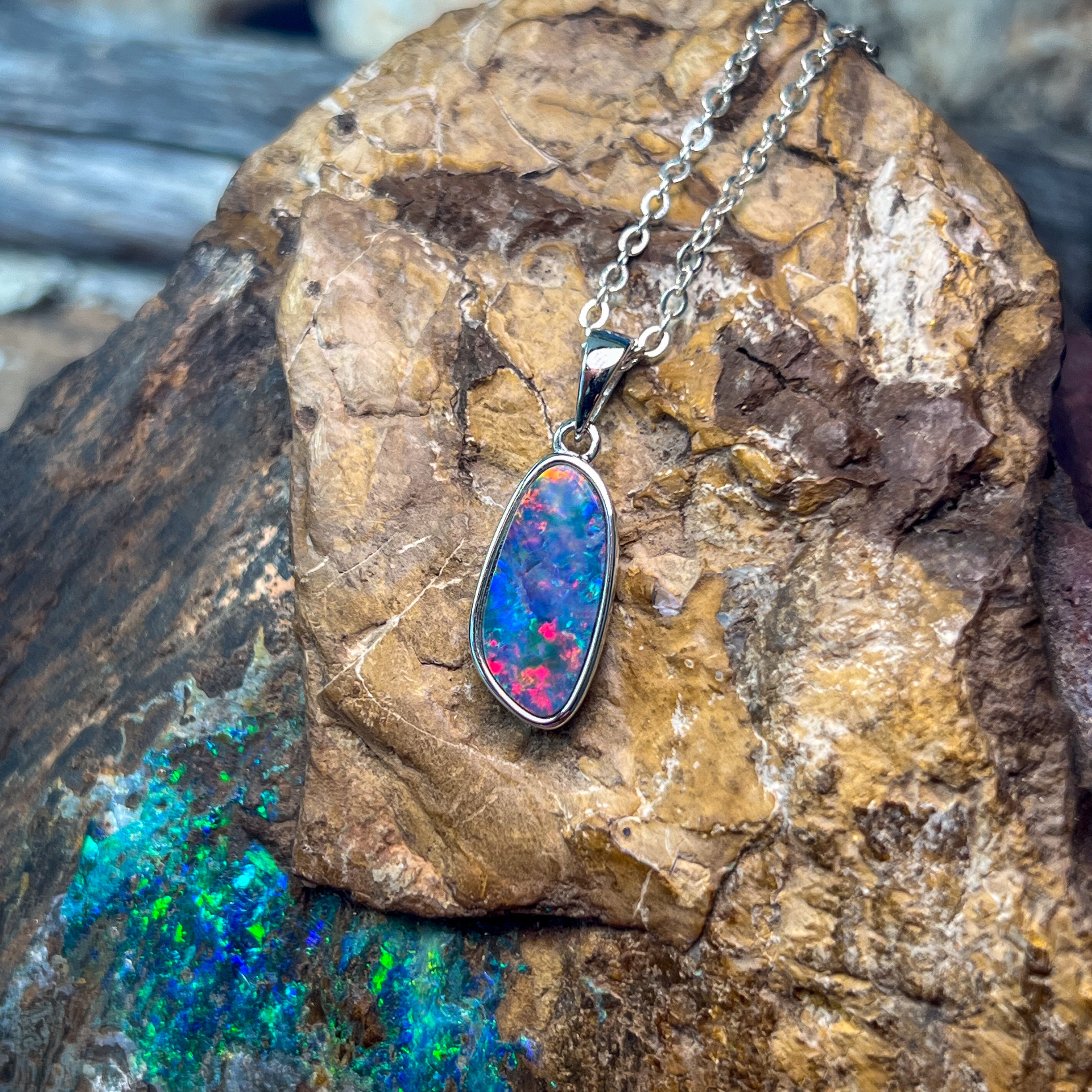 Elevate your collection with this sterling silver pendant featuring a bezel-set red and blue opal doublet. The vibrant play of colour in the opal creates a striking contrast, showcasing fiery reds and deep blues that catch the light beautifully. Expertly crafted, this pendant offers both durability and elegance, making it a refined choice for those who appreciate the unique allure of opal jewellery. Perfect for adding a sophisticated splash of colour to any outfit.