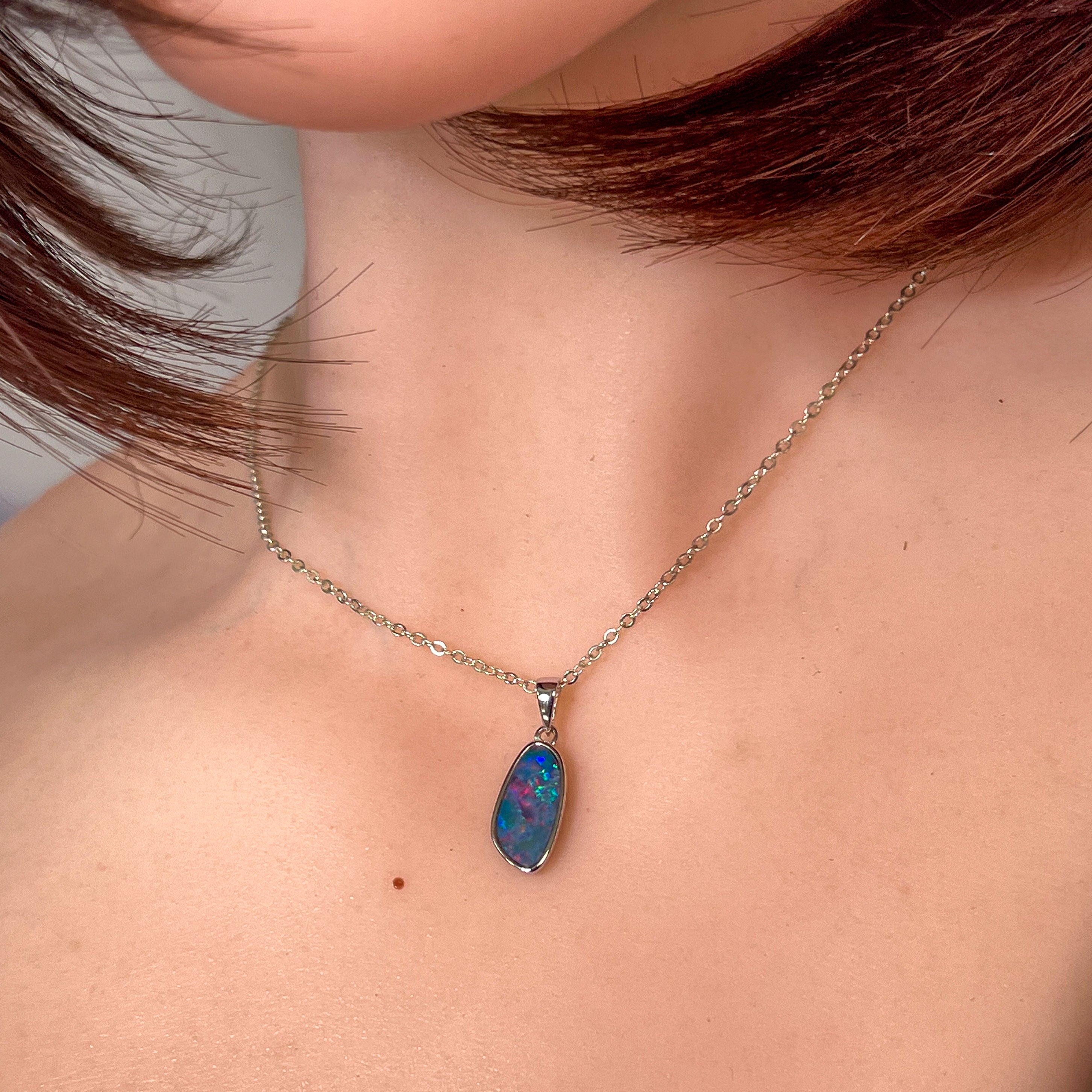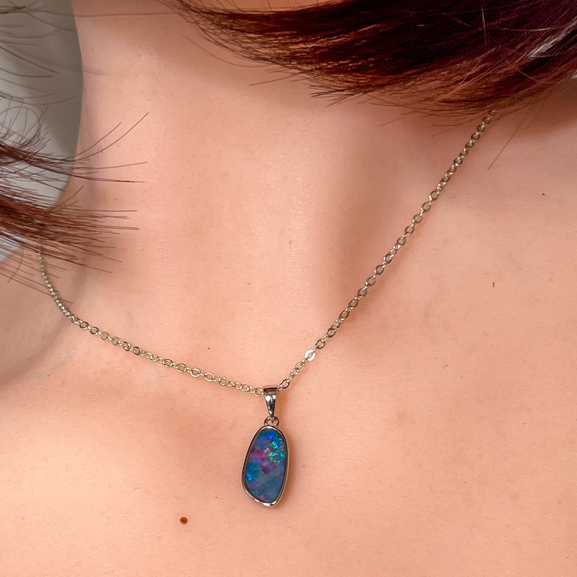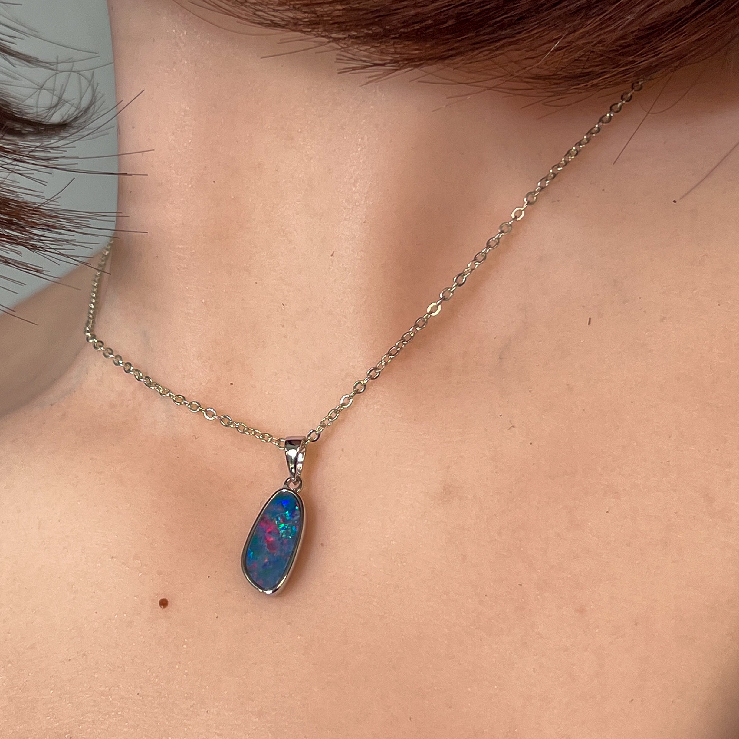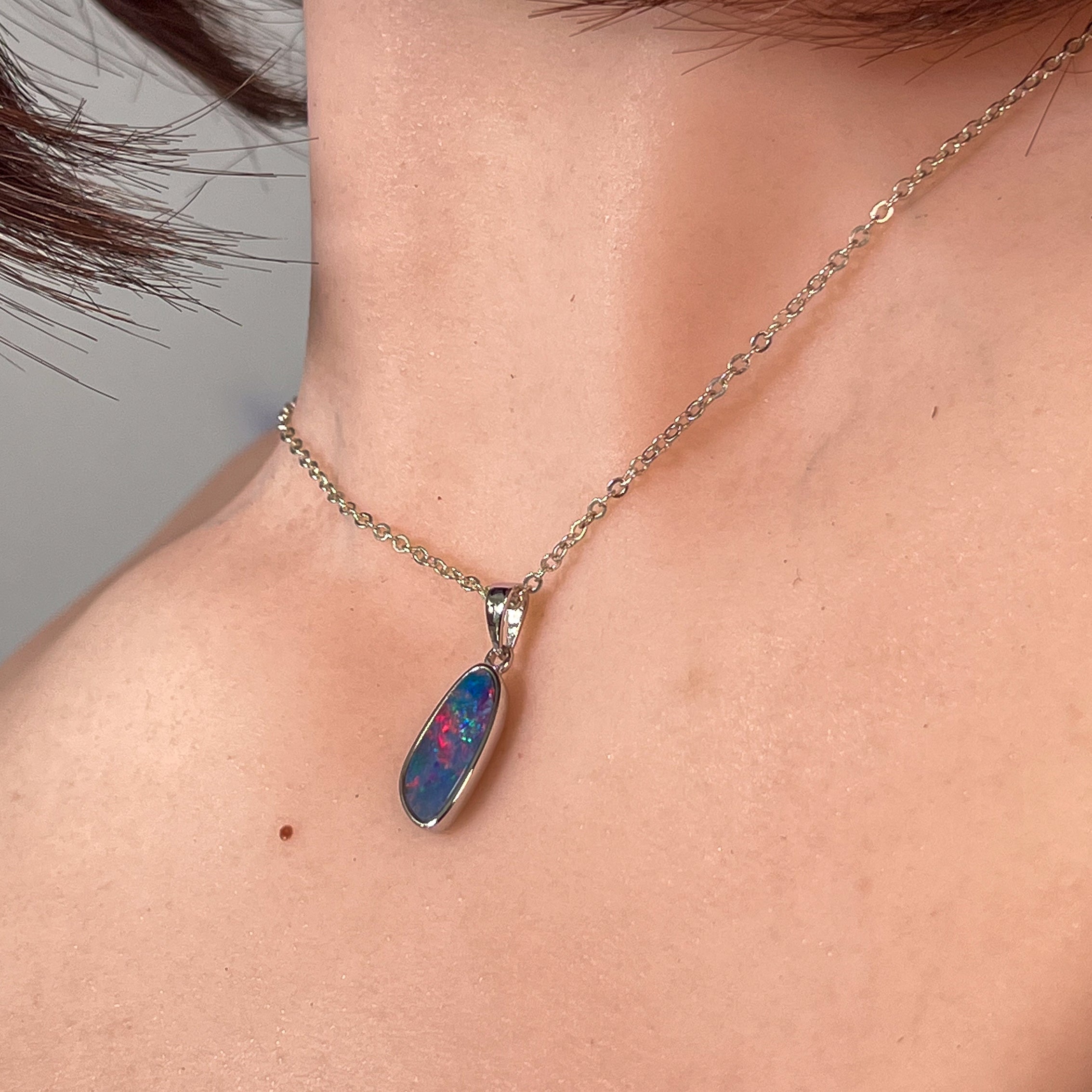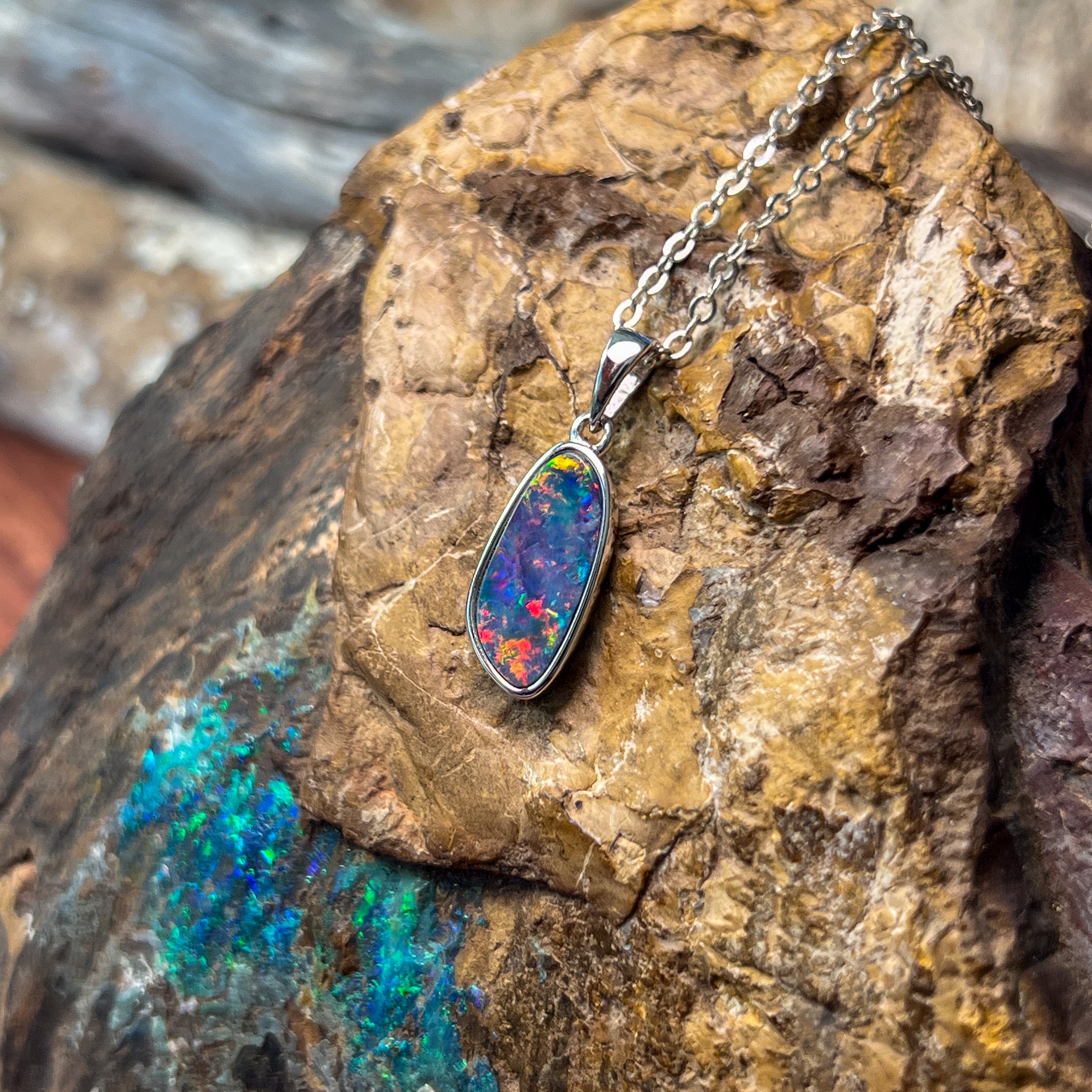 Elevate your collection with this sterling silver pendant featuring a bezel-set red and blue opal doublet. The vibrant play of colour in the opal creates a striking contrast, showcasing fiery reds and deep blues that catch the light beautifully. Expertly crafted, this pendant offers both durability and elegance, making it a refined choice for those who appreciate the unique allure of opal jewellery. Perfect for adding a sophisticated splash of colour to any outfit.